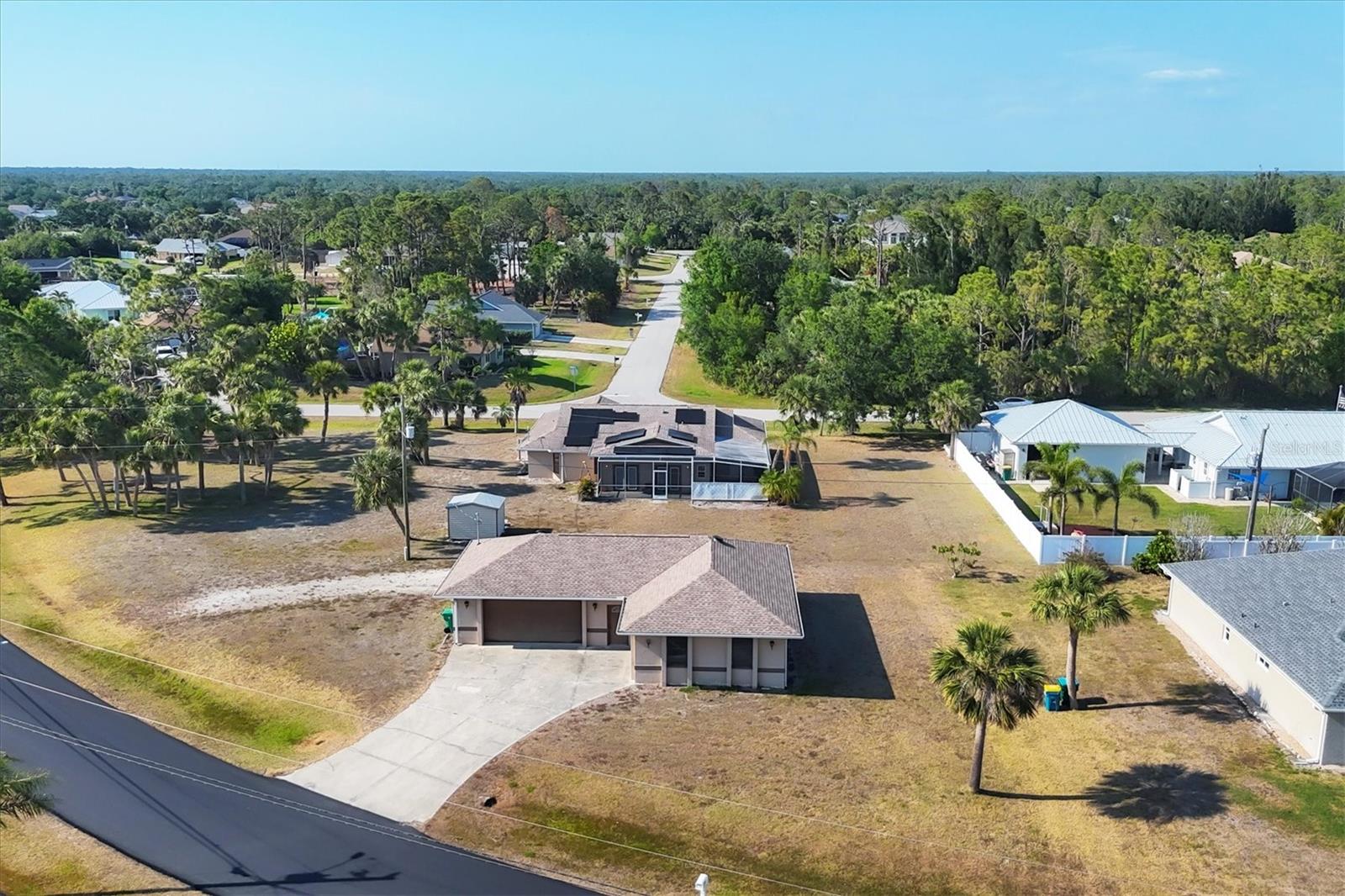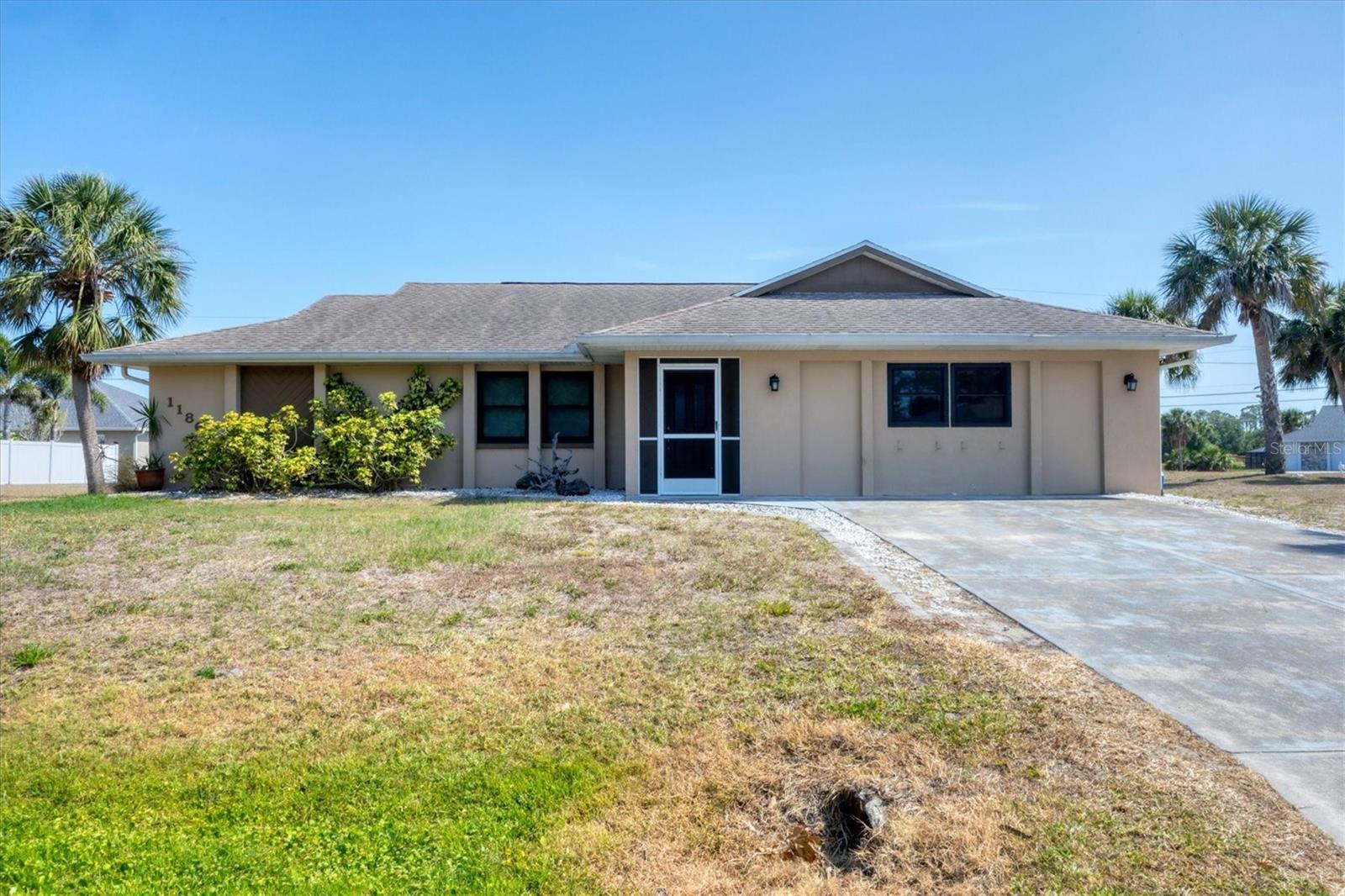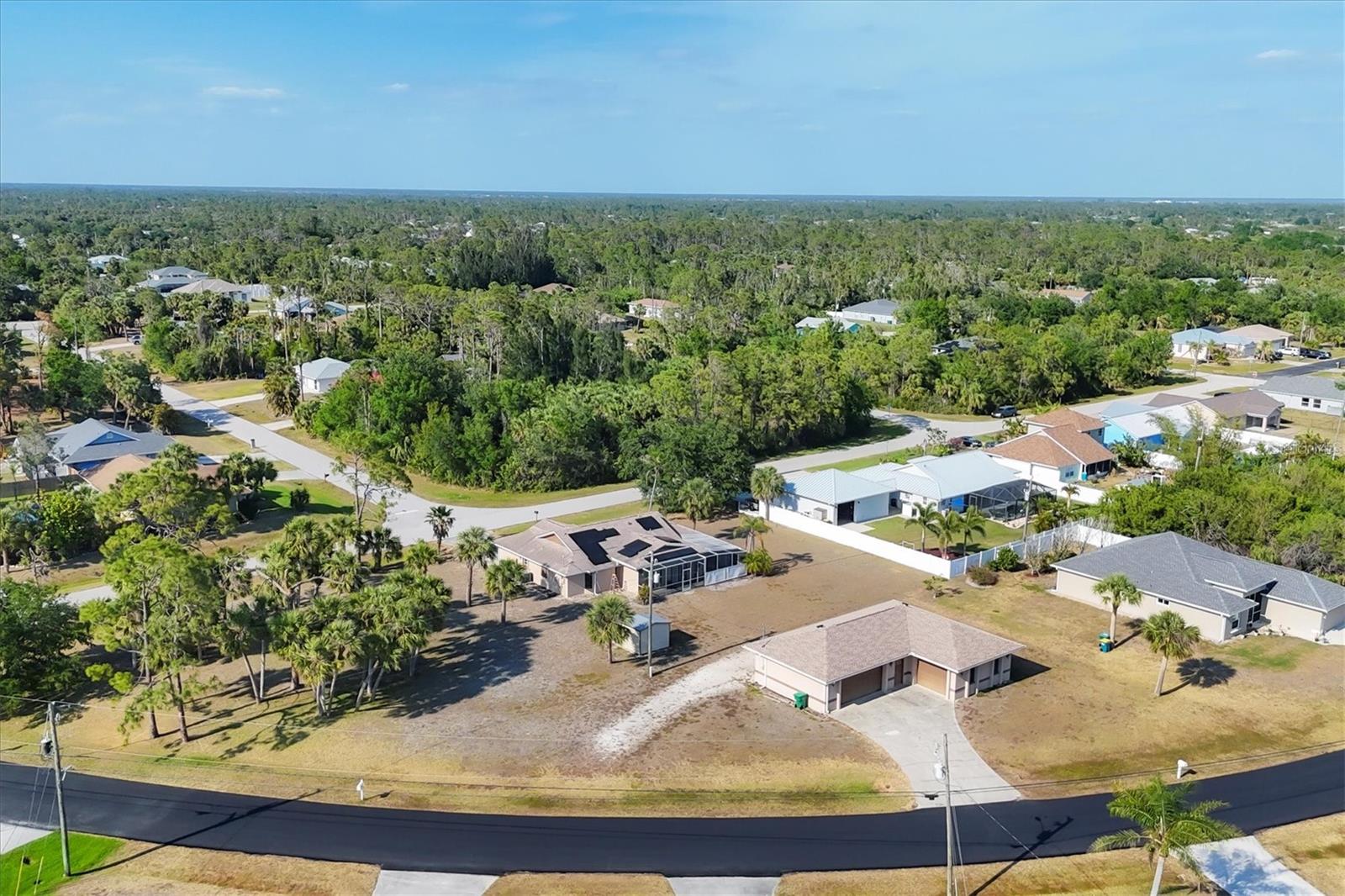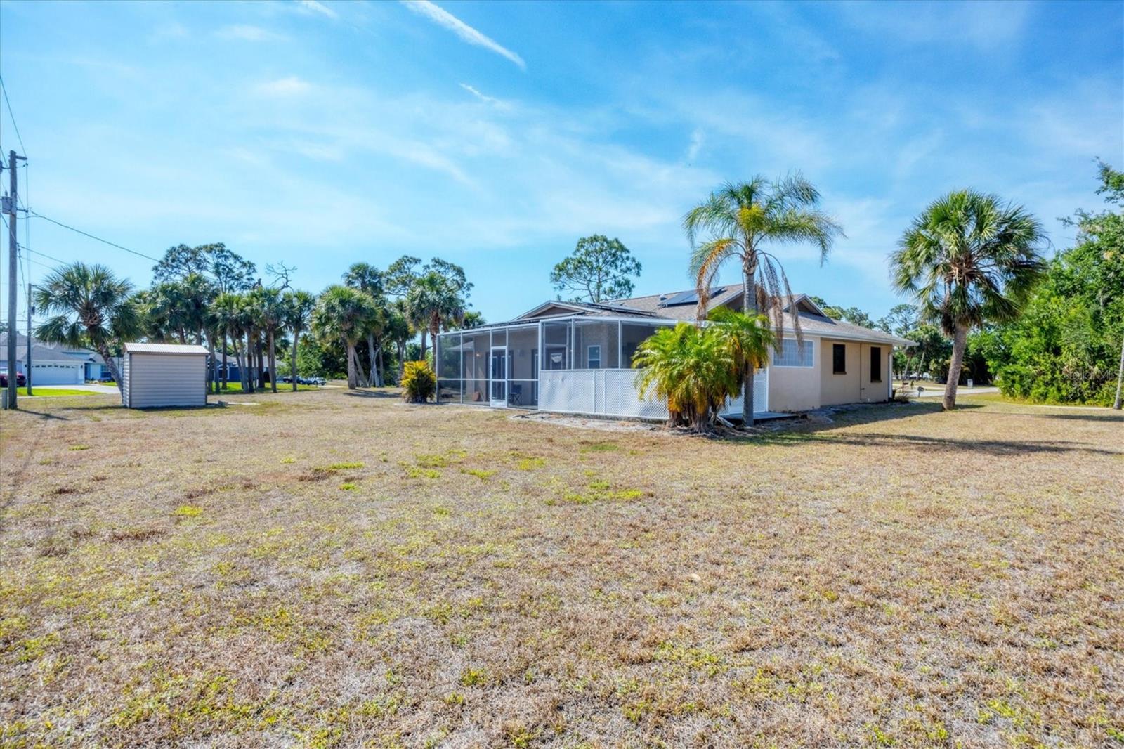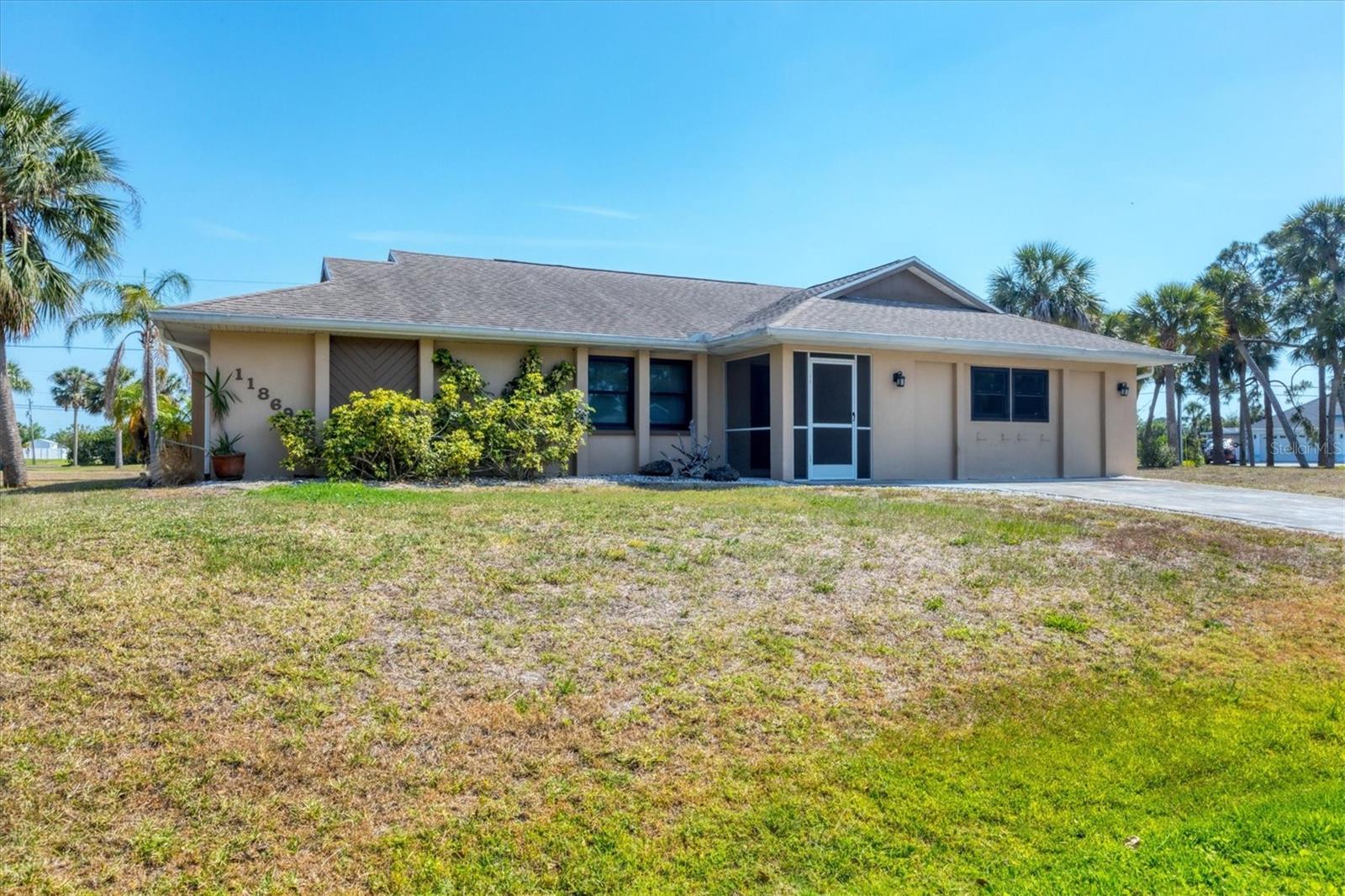 This spacious property offers a truly unique opportunity to create your own personal haven on nearly an acre of X-Flood Zone land. With a large primary residence and plans available to complete the renovation of the detached garage into a second residence, this property is an ideal opportunity for car lovers and collectors; multigenerational living, with an option of a guest house or in-law suite; or an on-site income property while living in spacious comfort! Encompassing three combined lots, one of which is undeveloped and features mature shade trees, privacy can be paramount in this blank canvas of a home! Upon entry the home expands around you and welcomes you into the generous family room; filled with natural light. To the right is the primary suite, outfitted with a walk-in closet and en suite bathroom. Next to the primary suite is an additional room with an en suite bathroom which is a plus for multiple residents or could serve as a convenient home office space. An additional two bedrooms sit to the left, in a true split floor plan, and are adjacent to a shared bathroom with exterior access. Proceed forward to where the kitchen and dining space allow for easy conversation while meals are being made and enjoyed. A passthrough window from the kitchen looks into the adjoining family room. Wired for surround sound, this space is ideal for the passionate movie buff to kick back and relax after a long day. Two sets of French doors lead out to a screened porch, which wraps around to the covered patio and connects to the family room via an additional side door. Cabinets and a window passthrough make the patio a prime location for al fresco dining and the property’s half-bath is accessed from here as well. From the back of the home a wide expanse of land sits between the main home and the detached garage and workshop building, neighbored by an additional small shed, and invites the addition of a pool or additional construction. For additional comfort and peace of mind, the home is outfitted with rooftop solar panels that are owned outright. The surrounding area is convenient to the Gulf beaches on Manasota Key and Boca Grande, multiple championship golf courses, fishing, boating, and other outdoor activities, shopping, dining and more! The opportunities here for an entertainment-filled Florida lifestyle are endless, and the property is ready for you to take your vision and make it a reality! If Florida sunshine, no HOA, and ample privacy are calling your name, make sure to also call for your private showing and make your dreams a reality today!