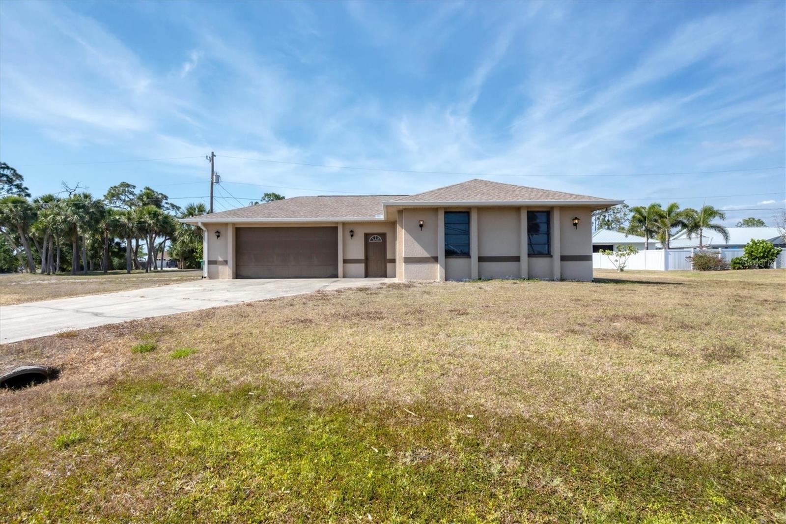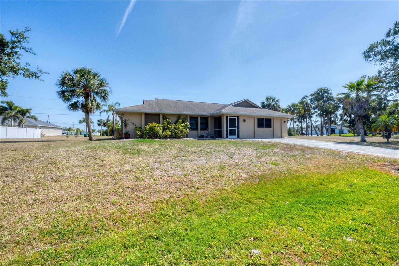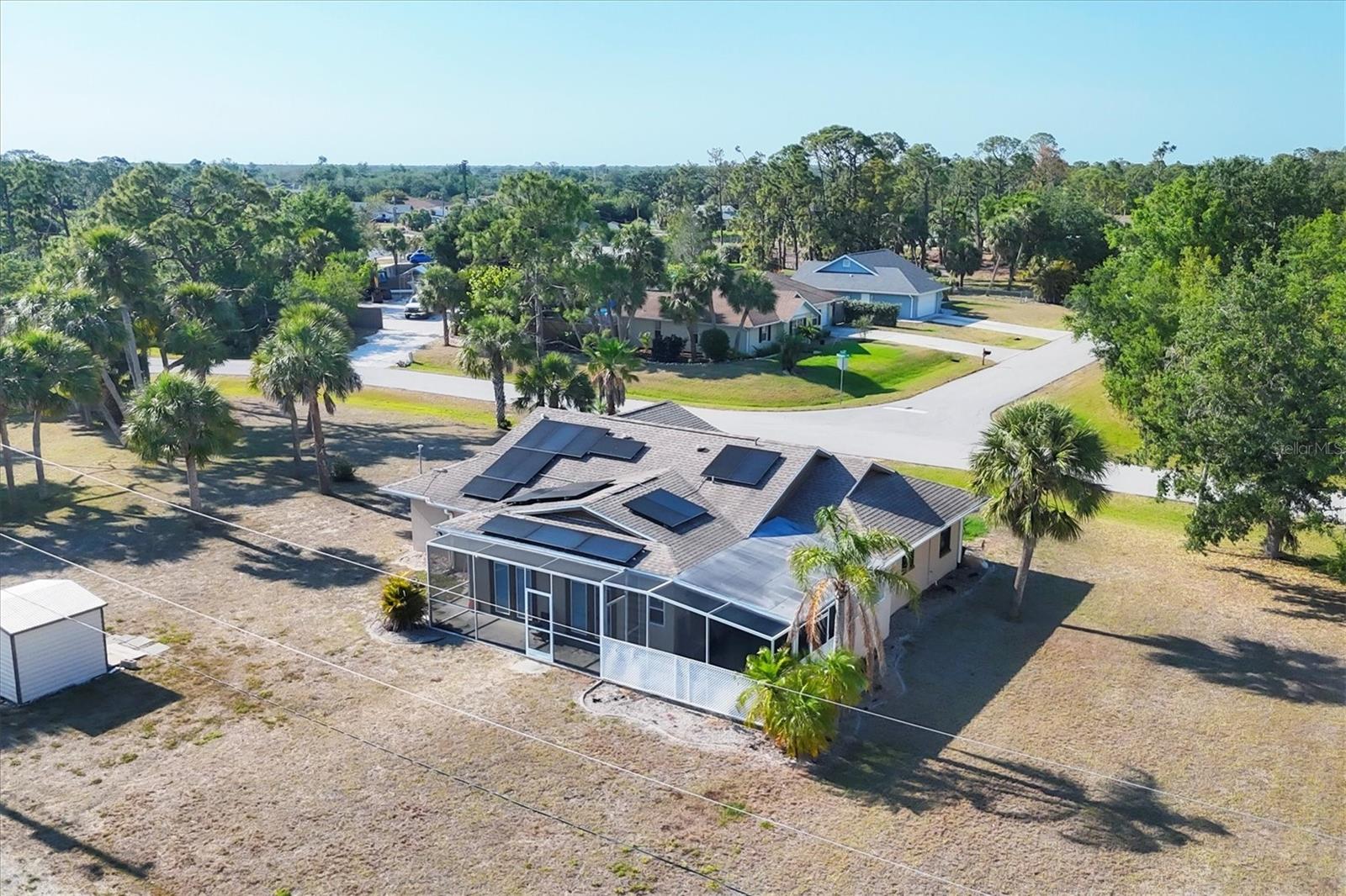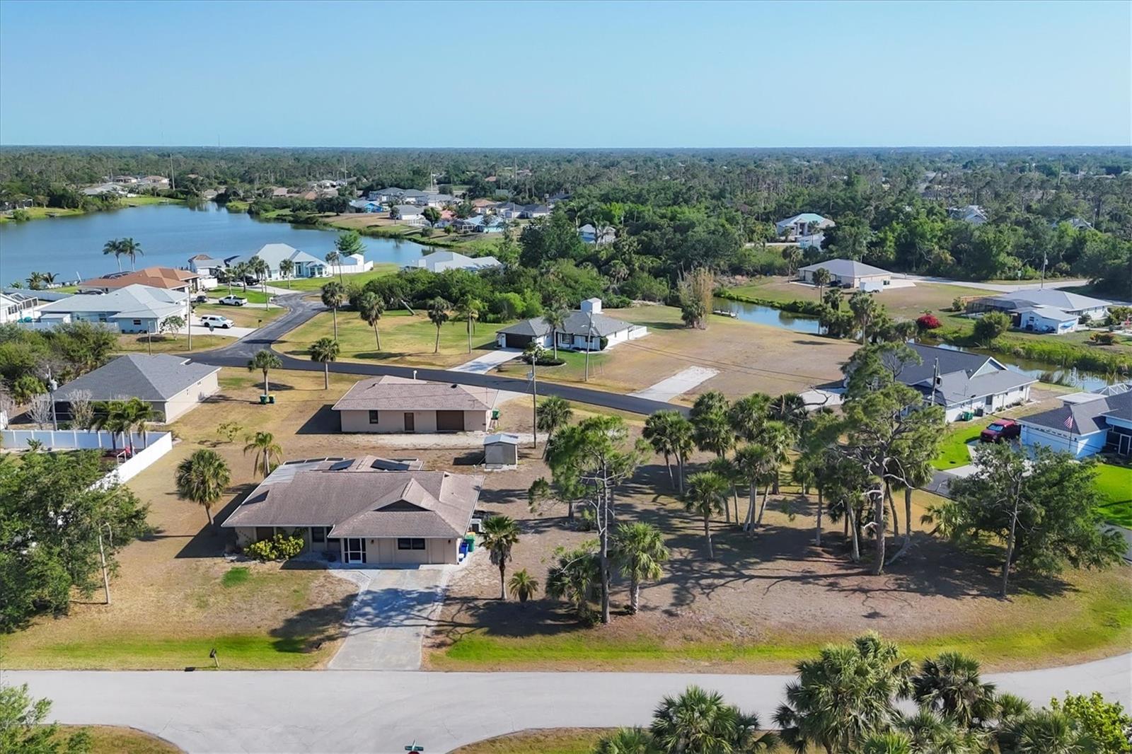 This spacious property offers a truly unique opportunity to create your own personal haven on nearly an acre of X-Flood Zone land. With a large primary residence and plans available to complete the renovation of the detached garage into a second residence, this property is an ideal opportunity for car lovers and collectors; multigenerational living, with an option of a guest house or in-law suite; or an on-site income property while living in spacious comfort! Encompassing three combined lots, one of which is undeveloped and features mature shade trees, privacy can be paramount in this blank canvas of a home! Upon entry the home expands around you and welcomes you into the generous family room; filled with natural light. To the right is the primary suite, outfitted with a walk-in closet and en suite bathroom. Next to the primary suite is an additional room with an en suite bathroom which is a plus for multiple residents or could serve as a convenient home office space. An additional two bedrooms sit to the left, in a true split floor plan, and are adjacent to a shared bathroom with exterior access. Proceed forward to where the kitchen and dining space allow for easy conversation while meals are being made and enjoyed. A passthrough window from the kitchen looks into the adjoining family room. Wired for surround sound, this space is ideal for the passionate movie buff to kick back and relax after a long day. Two sets of French doors lead out to a screened porch, which wraps around to the covered patio and connects to the family room via an additional side door. Cabinets and a window passthrough make the patio a prime location for al fresco dining and the property’s half-bath is accessed from here as well. From the back of the home a wide expanse of land sits between the main home and the detached garage and workshop building, neighbored by an additional small shed, and invites the addition of a pool or additional construction. For additional comfort and peace of mind, the home is outfitted with rooftop solar panels that are owned outright. The surrounding area is convenient to the Gulf beaches on Manasota Key and Boca Grande, multiple championship golf courses, fishing, boating, and other outdoor activities, shopping, dining and more! The opportunities here for an entertainment-filled Florida lifestyle are endless, and the property is ready for you to take your vision and make it a reality! If Florida sunshine, no HOA, and ample privacy are calling your name, make sure to also call for your private showing and make your dreams a reality today!
