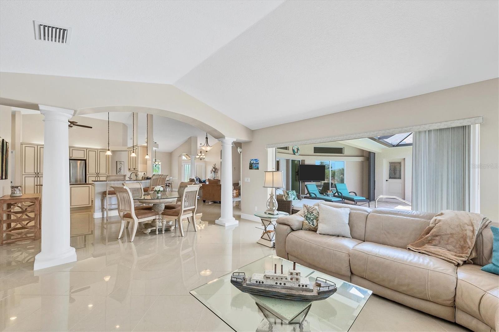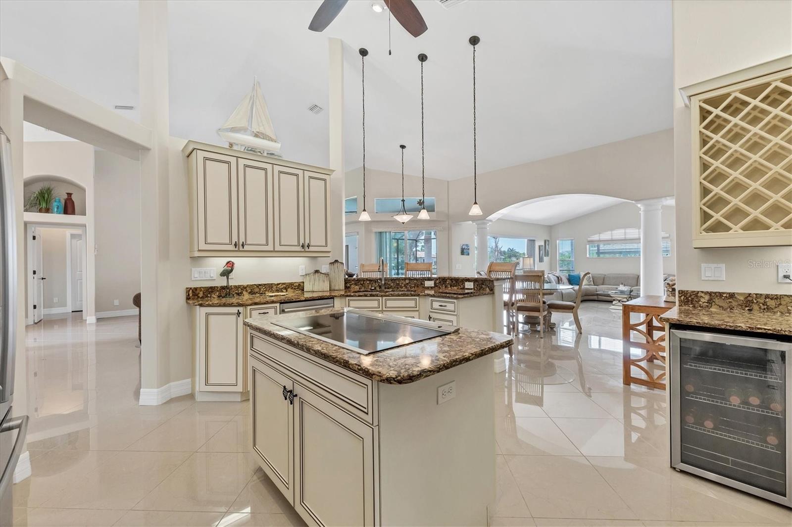 Welcome to your own slice of paradise in the serene and highly sought-after community of South Gulf Cove. This stunning custom-built home offers the ultimate in waterfront living with a full seawall, a concrete dock complete with water, electric, and a fish cleaning station, and a 15,000 lb. covered boat lift — all topped with a custom-matched roof installed in 2022 to seamlessly blend with the home. As you arrive, you'll be immediately impressed by the beautifully manicured landscaping, stamped concrete driveway and walkway, and the elegant curb appeal. Step through the double entry doors and be greeted by an abundance of natural light that pours into the open-concept living space, highlighting the gleaming polished tile floors and sophisticated architectural details throughout. Designed for entertaining, this home features two inviting living areas, a formal dining room, and a charming breakfast nook — all showcasing spectacular waterfront views. The chef’s kitchen is a true showstopper, offering granite countertops, solid wood cabinetry, under-cabinet lighting, a built-in wine rack and wine fridge, double ovens, Bosch cooktop with downdraft on a central island, matching Bosch appliances, and a central vacuum system. The popular Florida split floor plan provides maximum privacy, with the oversized primary suite tucked away from the guest bedrooms. The primary bedroom boasts a tray ceiling, a walk-in and reach-in closet, and sliding doors to the lanai. The en-suite bath features dual granite vanities, a private water closet, a glass-enclosed walk-in shower, and a luxurious soaking tub — perfect for unwinding after a day on the water. The guest bedrooms offer comfortable accommodations with reach-in closets and share a beautifully updated bathroom with a granite-topped vanity and a spacious tiled walk-in shower. The versatile laundry room connects conveniently to both the kitchen and garage and includes custom cabinetry, granite counters, and a sink — ideal for cleanup after outdoor projects. The oversized two-car garage is an enthusiast’s dream, with epoxy flooring, cobalt metal cabinetry, a built-in workbench, and extra space for storing gear or toys. Step outside to your private resort-style lanai, featuring a saltwater heated pool and attached hot tub with upgraded Wi-Fi controls for ultimate comfort. Lounge under the covered area and catch your favorite show, or rinse off in the outdoor shower after a day in the sun. A separate pool bath and storage room complete this exceptional outdoor living space. Located minutes from the pristine beaches of Boca Grande, top-rated golf courses, and world-class fishing in Charlotte Harbor and the Gulf of Mexico, this home offers the Florida lifestyle you've been dreaming of.
