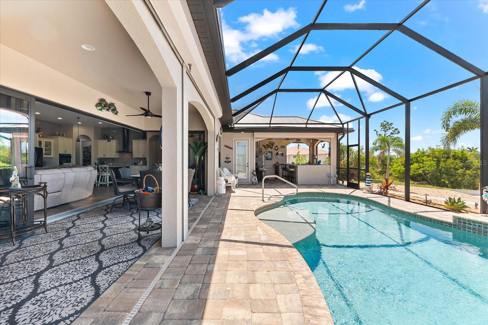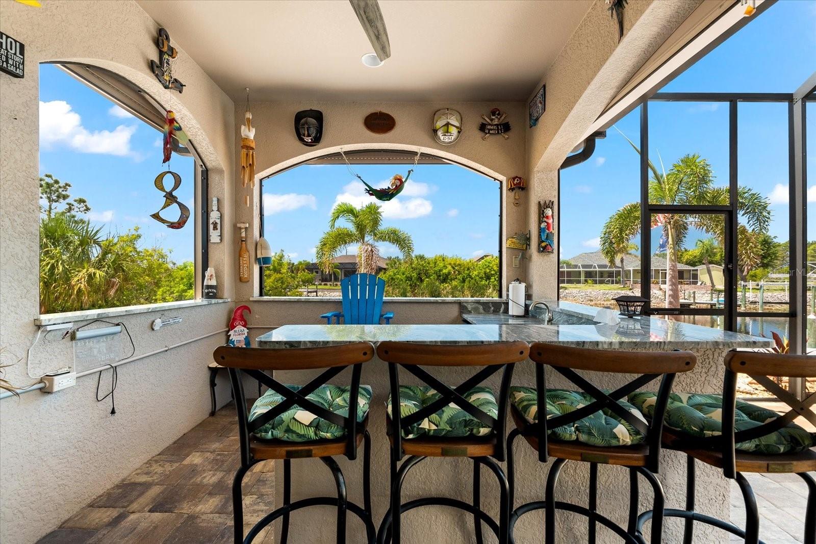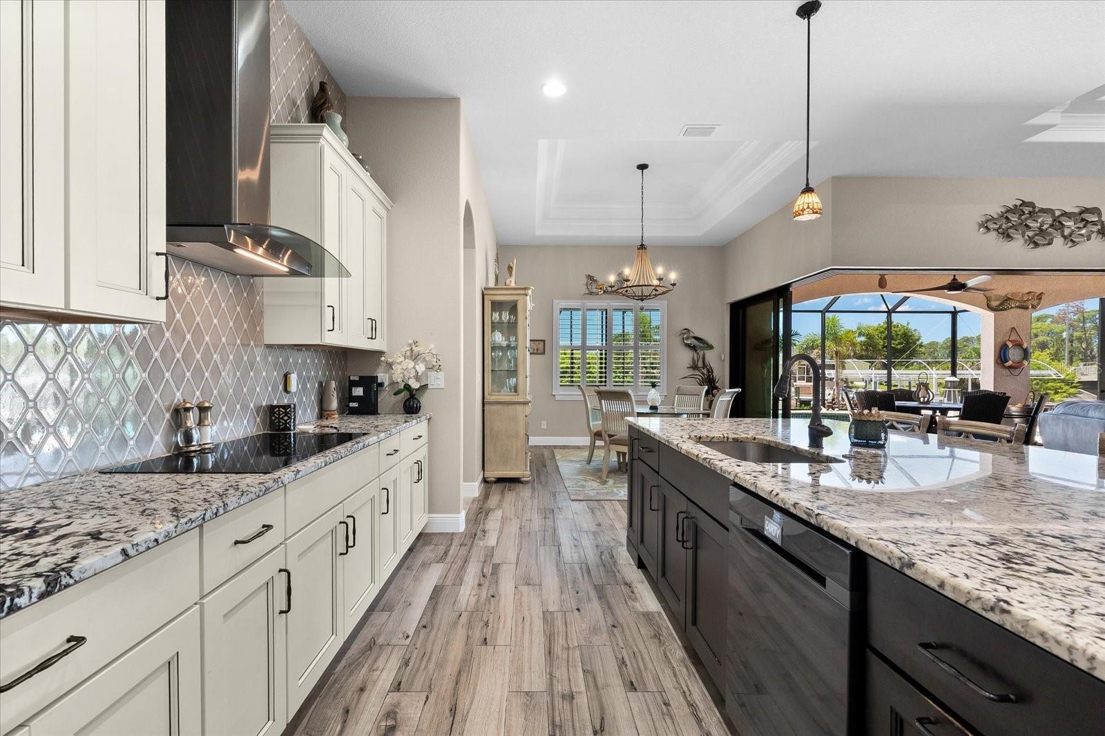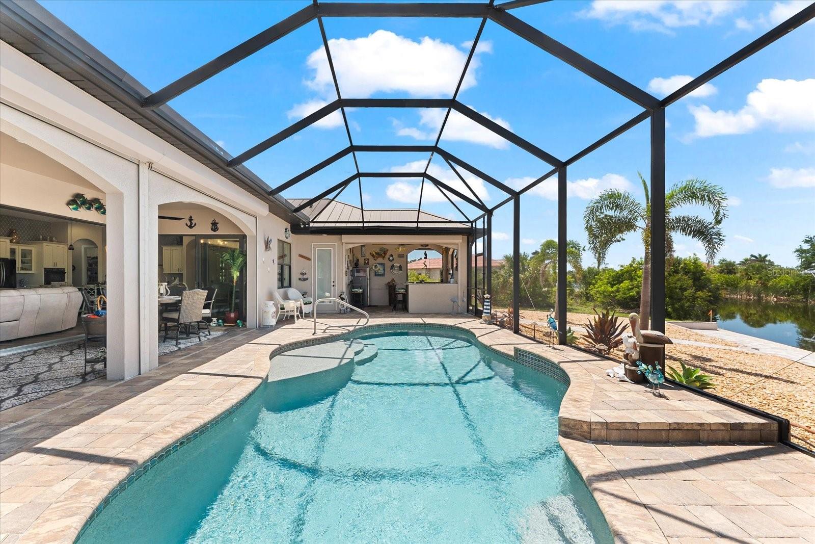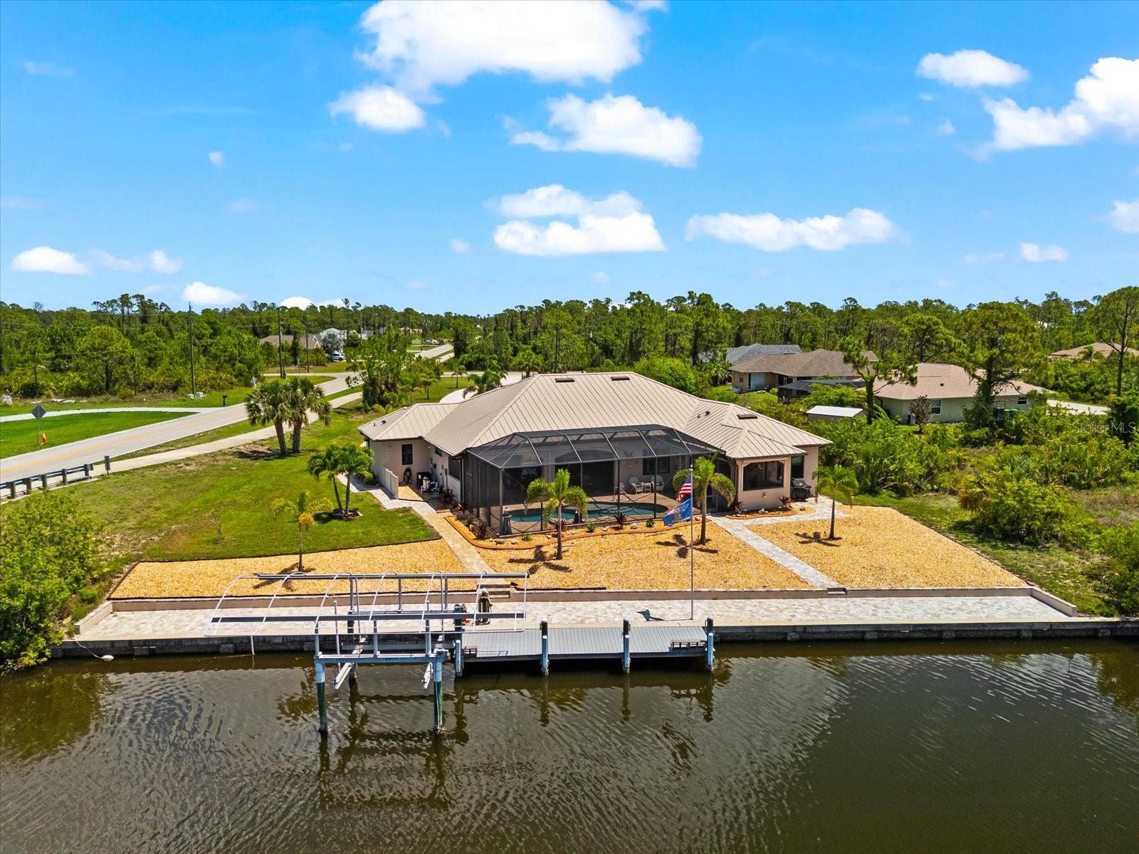 Experience the best of Florida living in this custom-built estate home, featuring 4 bedrooms, 3.5 baths, and a den, beautifully positioned on 1.25 acres along the Zephyr Waterway with 125 feet of sea-walled waterfront and ideal southern exposure. Built in 2018, this 2,681 sq ft estate offers the perfect blend of luxury, privacy, and easy access to both boating and nearby golf courses in the highly desirable South Gulf Cove community. Enjoy stunning views and vibrant boat traffic from your backyard on one of the area’s most sought-after wide canals. Inside, the home boasts a thoughtfully designed open floor plan with a double tray volume ceiling, gorgeous plank flooring throughout, and expansive 0° sliders that flood the main living areas with natural light, offering seamless indoor-outdoor living. A den with French doors provides an ideal space for a home office or cozy retreat. The heart of the home is the gourmet kitchen, designed to impress with upgraded granite countertops, a dramatic 10-foot island, staggered cabinetry, and decorative backsplash tile that extends to the ceiling. A spacious walk-in pantry and a state-of-the-art 2023 induction stove complete this high-end culinary space, perfect for both everyday living and entertaining. The expansive primary suite serves as a serene retreat, featuring a decorative ceiling, ample space for a seating area, and large windows that allow natural light to fill the room. The spa-like ensuite bath offers a luxurious walk-through shower with dual showerheads, double vanities, and a deep soaking tub—creating the perfect blend of comfort, elegance, and functionality. For added privacy, the guest bedrooms are located on the opposite side of the home, each with convenient access to their own bathrooms, making them ideal for family or visitors. Outdoor living is a true highlight of this property. Relax in the heated pool, surrounded by mature landscaping and protected by roll-down shutters on the lanai. A separate bar area with a refrigerator, sink, and icemaker makes entertaining a breeze. The full irrigation system keeps the expansive yard green year-round. Waterfront amenities include a 10,000 lb covered boat lift, water and electric at the dock, and a paver pad running the full 125 feet of sea-walled waterfront, providing a clean, polished look and convenient access along the shoreline. Additional upgrades include a new roof (2023), impact windows and doors, Bahama shutters, electric remote-controlled room-darkening shades, and a whole-house generator plug for added peace of mind. The three-car garage boasts a durable epoxy floor, and two outdoor sheds provide convenient extra storage. Don’t miss this rare opportunity—schedule your private showing today!