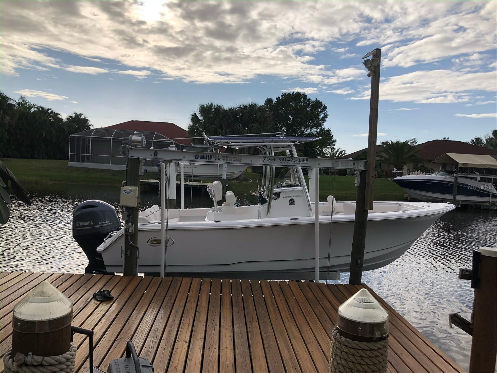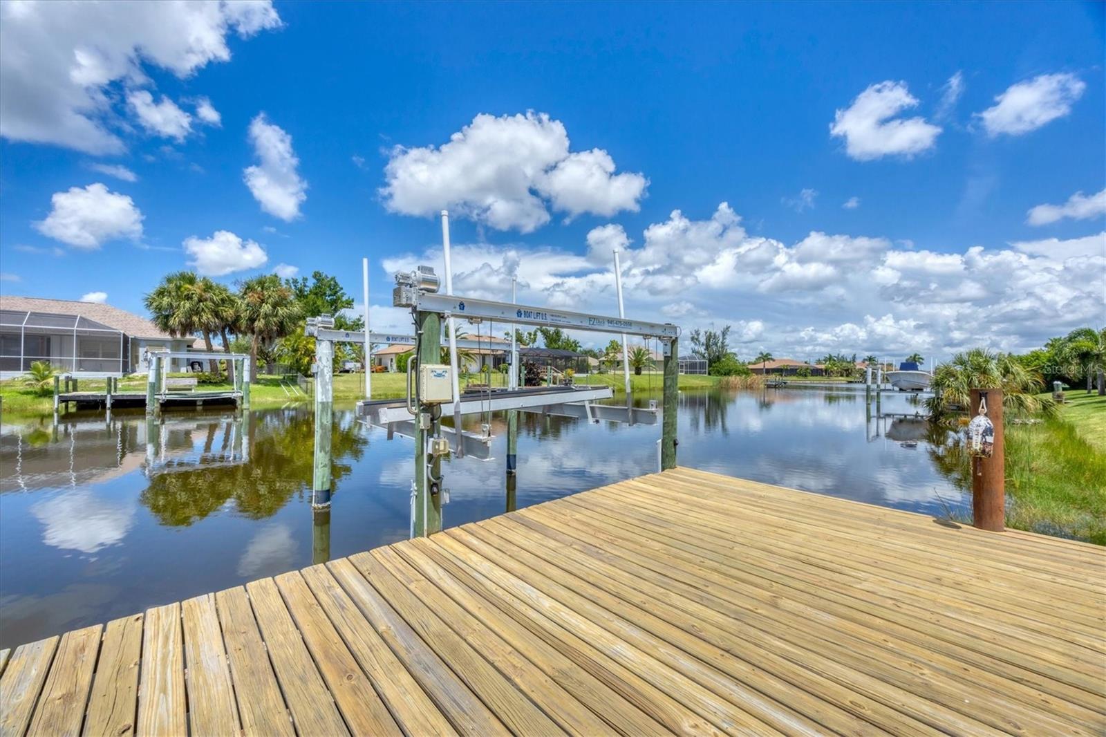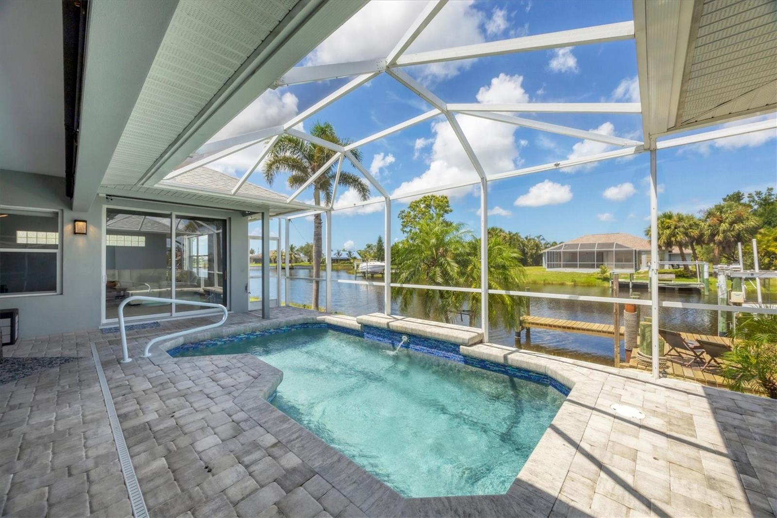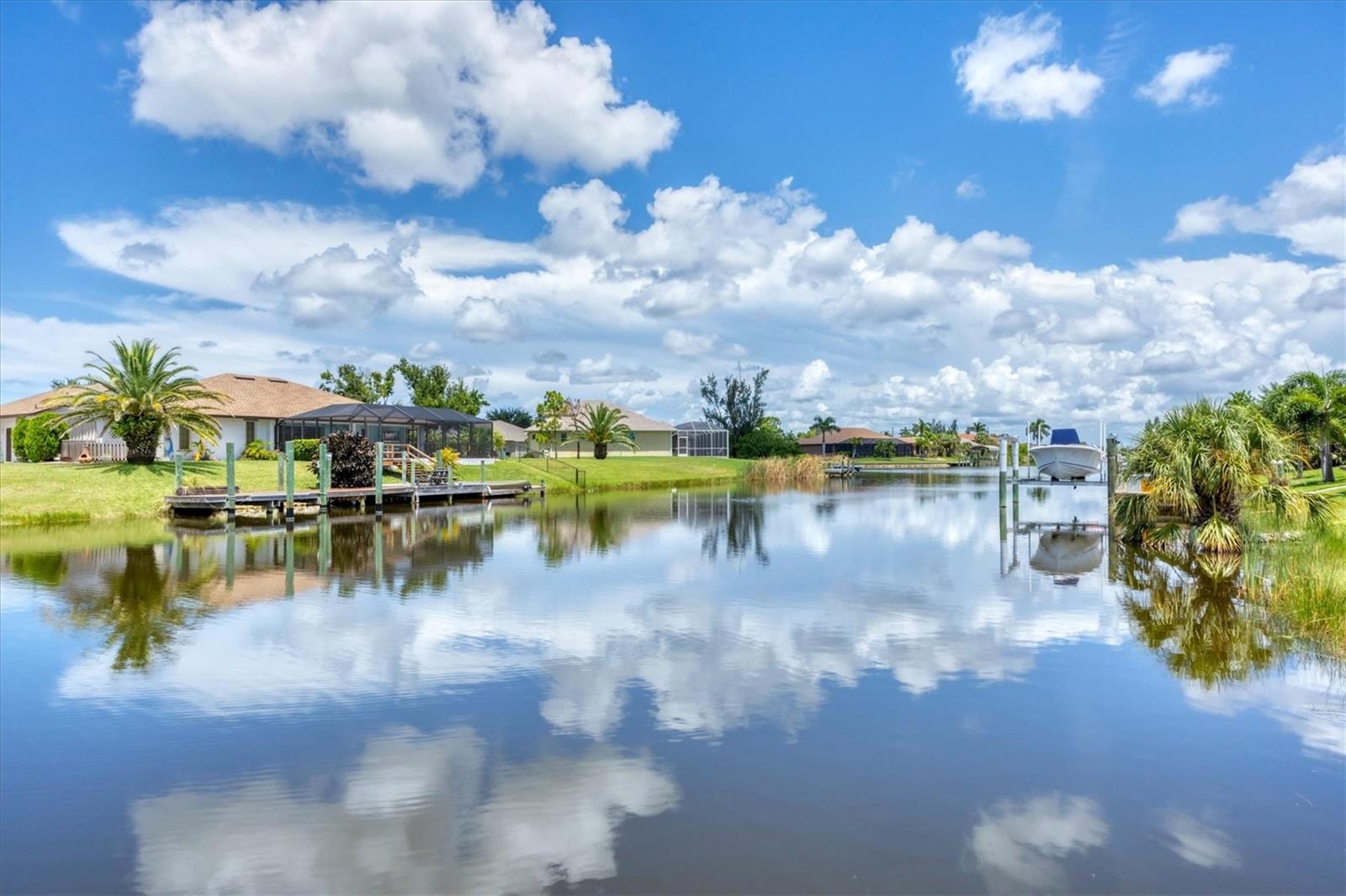 **MAJOR PRICE IMPROVEMENT**Stunning waterfront Oasis with Heated saltwater pool plus a DOCK with LIFT! Welcome to your Florida dream home in the waterfront boating community of South Gulf Cove. Preview with the 3D VIRTUL TOUR (#2 above) to get the true feel of this home. This beautifully appointed 3-bedroom, 3-bath residence sits on an oversized lot and offers 2,483 sq ft of open, light-filled living space with breathtaking views of intersecting canals. Enjoy the luxury of being minutes from the lagoon with open water speed and a quick ride to Charlotte Harbor and the Gulf. Enter through elegant double glass entry doors into a spacious, split floor plan featuring a tray-ceiling Great Room, diagonal tile throughout, and seamless flow between the kitchen, family room, Great room, and dining area — all centered around panoramic views of the saltwater heated pool and canal beyond. Gourmet kitchen with granite counters, stone backsplash, breakfast bar, and abundant storage. Primary suite with tray ceiling, lanai access, walk-in closet, and a spa-like en-suite with dual vanities, whirlpool tub, and walk-in tiled shower with bench. Two guest bedrooms (one with a walk-in closet) and well-appointed guest bath with granite vanity and tiled tub/shower combo. Full pool bath with walk-in tiled shower for rinsing off after a swim or day on the water. Flexible space ideal for a home office or formal dining.Laundry room with utility sink and cabinetry. Ceiling fans, window treatments, and storage throughout 8' interior doors. Saltwater heated pool under a screened lanai with roll-down sun/privacy screens. Private dock with 10,000 lb boat lift, water and electric hookups — ideal for cleaning up after a boat day or relaxing by the water. Side-entry, oversized 2-car garage with epoxy flooring, workbench, and screen enclosure. Extended driveway with RV/boat pad and 50-amp hookup (2024), New roof (2023) and new front door (2023). Hurricane-rated shed for additional storage This sought after community, South Gulf Cove, is a waterfront community with voluntary HOA, residents on the water enjoy access to the Myakka River, Charlotte Harbor, ICW, and Gulf of Mexico. As well as day trips to Fisherman's Village or Cabbage Key. A nice boat ride out to Boca Grande to enjoy the beaches, sandbars, resturuants and more! A community boat ramp, parks, walking trails, and bike paths Close proximity to the pristine beaches of Boca Grande and a short drive to Manasota Key, with its charming shops, dining, and laid-back beach vibes This home delivers Florida lifestyle at its finest — whether you're a boater, beach lover, entertainer, or simply looking for serenity by the water. Book your appointment now and Live in Paradise!!!