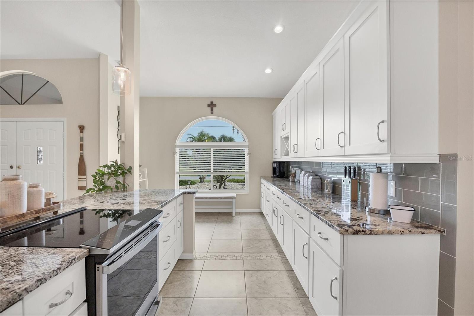 This move in ready 3 bedroom, 2 bath, 2 car garage home is a rare waterfront treasure in Gulf Cove, a sought after boating community with direct Gulf access. Beyond its impressive outdoor amenities, the home showcases a gorgeous designer interior with soaring ceilings, abundant natural light, and refined finishes throughout. The expansive chef’s kitchen is a true showpiece, offering granite countertops that stretch across a massive island, extensive prep space, newer stainless steel appliances, and generous cabinetry—perfect for cooking, gathering, and entertaining in style. Set across two beautifully landscaped waterfront lots totaling nearly half an acre, the property offers exceptional privacy and peaceful views along 160 feet of direct waterfront. Outdoor living shines with two extended screened patios, a luxurious spa, and a fully equipped outdoor kitchen complete with a sink, hood, grill, and striking stone counters with stone trim. The grounds are meticulously maintained with concrete curbing, lush greenery, and a charming pergola ideal for unwinding beneath the stars. Elegant pavers enhance the front driveway and walkway, while the rear patios feature a polished blend of pavers and tile. Boaters will appreciate the tastefully lit composite dock with water and electric and a 10,000 lb covered boat lift ready for your next adventure. A standout feature of the property is the 1,050 sq ft hurricane rated detached steel garage, built to withstand 170 mph winds and outfitted with two 10x10 doors, 6" closed cell spray foam insulation, its own concrete driveway, and a river stone parking pad—ideal for hobbyists, car collectors, or serious storage needs. Additional upgrades include a 2020 roof, brand new 2024 A/C, impact resistant windows and doors, an irrigation system, and a whole home generator powered by a 500 gallon built in propane tank. Inside, the split floor plan offers updates, comfort and functionality, with tile and engineered hardwood flooring, granite surfaces throughout, and a spacious primary suite with walk in closet and ensuite bath. Whether you're hosting lively gatherings or savoring quiet waterfront sunsets, this exceptional property blends elegance, comfort, and true coastal living into one complete package.