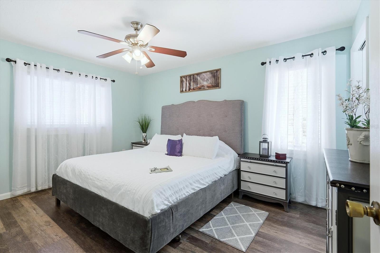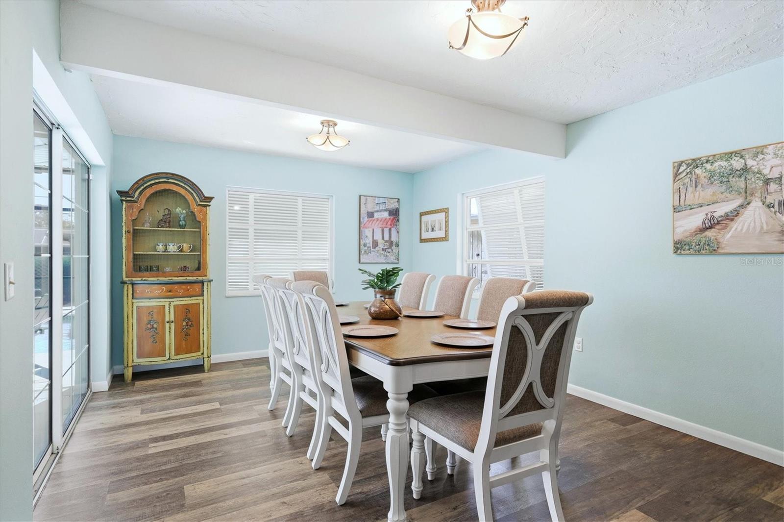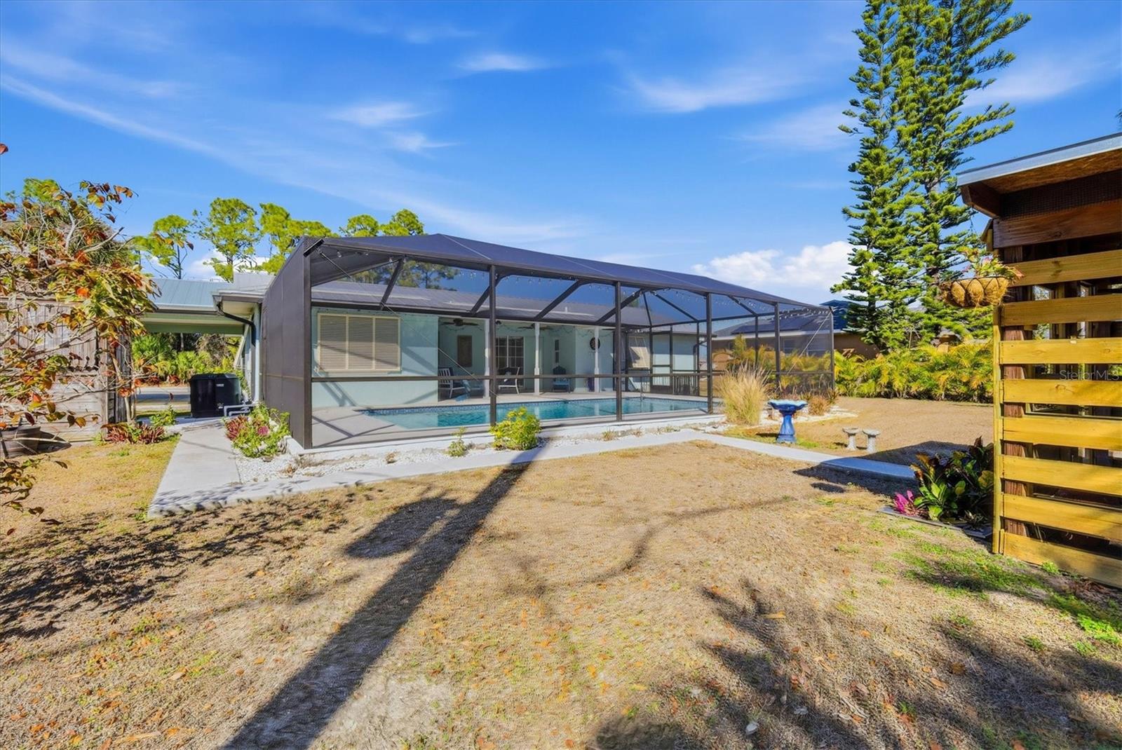 You truly have to see this one to believe it. This charming Florida pool home lives much larger than its footprint suggests. From the moment you arrive, the circular driveway and cheerful coastal colors set the tone—vibrant, welcoming, and full of personality. Decorative Bahama shutters frame the exterior, all protected by a full metal roof replaced in 2022. A major highlight is the newly constructed 780-square-foot oversized garage (2024), offering exceptional space for vehicles, storage, hobbies, or recreational equipment. A covered portico connects the garage to the home, creating additional shaded outdoor space—perfect for a golf cart, lounge seating, or covered entry during summer showers. Inside, the thoughtfully updated interior blends comfort and function. The cozy living room features a built-in electric fireplace, ideal for relaxed evenings. The remodeled eat-in kitchen showcases warm wood cabinetry, quartz countertops, and 2024 appliances. Extended cabinetry provides plenty of storage and flows seamlessly into the spacious dining area—perfect for gatherings and entertaining. The home offers three bedrooms and two well-appointed bathrooms. Indoor laundry adds convenience, and a bonus flex space provides the perfect setting for a relaxation area where you can sip a beverage and catch the game. And ladies… there’s a hidden retreat just for you—but you’ll have to come see that surprise in person. Outdoor living is where this property truly shines. The resurfaced pool (approximately seven years ago) is complemented by a travertine lanai and deck, creating a polished and inviting entertaining space. The double lot offers generous outdoor space for gardening, recreation, future expansion, or simply enjoying added privacy.. A dedicated potting shed supports gardening enthusiasts, while the custom BBQ smoke shack adds a distinctive touch for outdoor cooking and entertaining. This home combines charm, functionality, and thoughtful upgrades including expanded garage capacity combined with double-lot privacy position this home as a standout in its price range. Well-prepared properties with this level of improvement are limited. This is a must-see to fully appreciate the space, upgrades, and lifestyle it offers.