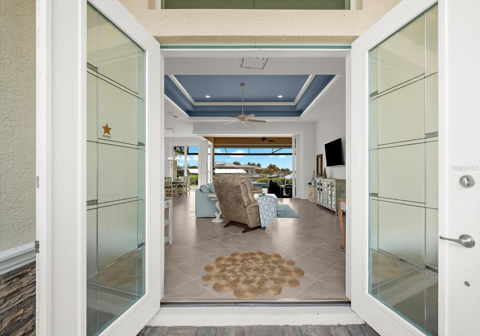 Experience the ULTIMATE IN WATERFRONT LUXURY with this stunning South-facing 2022-built coastal masterpiece offering 2,038 square feet of refined living space, 3 bedrooms, 2 baths, and unforgettable views along the Zephyr Waterway. Perfectly positioned on an OVERSIZED LOT, this home captures sunlight all day long, bathing both the interiors and outdoor living areas in a warm coastal glow. From the moment you arrive, the curb appeal is undeniable. An elegantly landscaped front yard with mature plantings, decorative stone siding, outdoor recessed lighting, an expanded paver driveway, and a 3-car garage set the tone. The inviting screened front patio with Bahama shutters creates a polished, welcoming entrance. Step through the double doors into a bright, breathtaking great room designed to impress. The open-concept layout is enhanced by a coastal color palette, diagonal tile flooring, and soaring double-tray ceilings that elevate the space. Your eye is immediately drawn to the spectacular lanai, heated pool, and canal beyond — beautifully framed by the highly sought-after 10-foot zero-degree pocket slider that seamlessly blends indoor and outdoor living. The chef’s kitchen is a true showpiece, featuring upgraded Samsung appliances, a range hood, quartz countertops, decorative backsplash, breakfast bar seating, abundant cabinetry(a ton of drawers) with under-cabinet lighting, and a spacious pantry. Exceptional counter space and thoughtful design make it as functional as it is stylish. Adjacent to the kitchen, the dining area shines beneath a modern chandelier and offers its own sliding glass door to the lanai, making entertaining effortless. The split-bedroom floor plan provides privacy and comfort. The primary suite is a serene retreat with a tray ceiling and private slider access to the lanai, where you’ll wake each morning to peaceful canal views and coastal breezes. The spa-inspired en-suite bath features a beautifully tiled walk-in shower with built-in bench seating and rain shower head, along with dual split vanities. Guest bedrooms are generously sized with abundant natural light, including one with an impressive tray ceiling and direct lanai access. The shared guest bath offers dual quartz vanities and a stylish roman walk-in tiled shower with direct pool access — perfect for seamless indoor-outdoor living. Step outside to your private waterfront oasis, where the lanai truly sets this home apart. Enormous compared to most homes in the area, this extended screened-in paver lanai offers an exceptional amount of covered entertaining space rarely found in surrounding properties. The custom wood tray ceiling, double designer ceiling fans, and expansive seating areas create the ultimate setting for large gatherings or relaxed evenings by the water. The heated in-ground pool with built-in water feature enhances the resort-style ambiance, while the fully equipped outdoor kitchen — complete with bar fridge and oversized quartz countertop — makes hosting effortless. Beyond the lanai, follow the paver pathway to a dedicated sun deck or continue to the brand-new (2025) custom U-shaped private boating dock with 10,000 lb electric boat lift, designed for boating enthusiasts. This is more than a home — it’s a lifestyle defined by sunshine, sweeping water views, luxury finishes, and extraordinary indoor-outdoor living. Don’t miss the opportunity to own this exceptional slice of waterfront paradise!