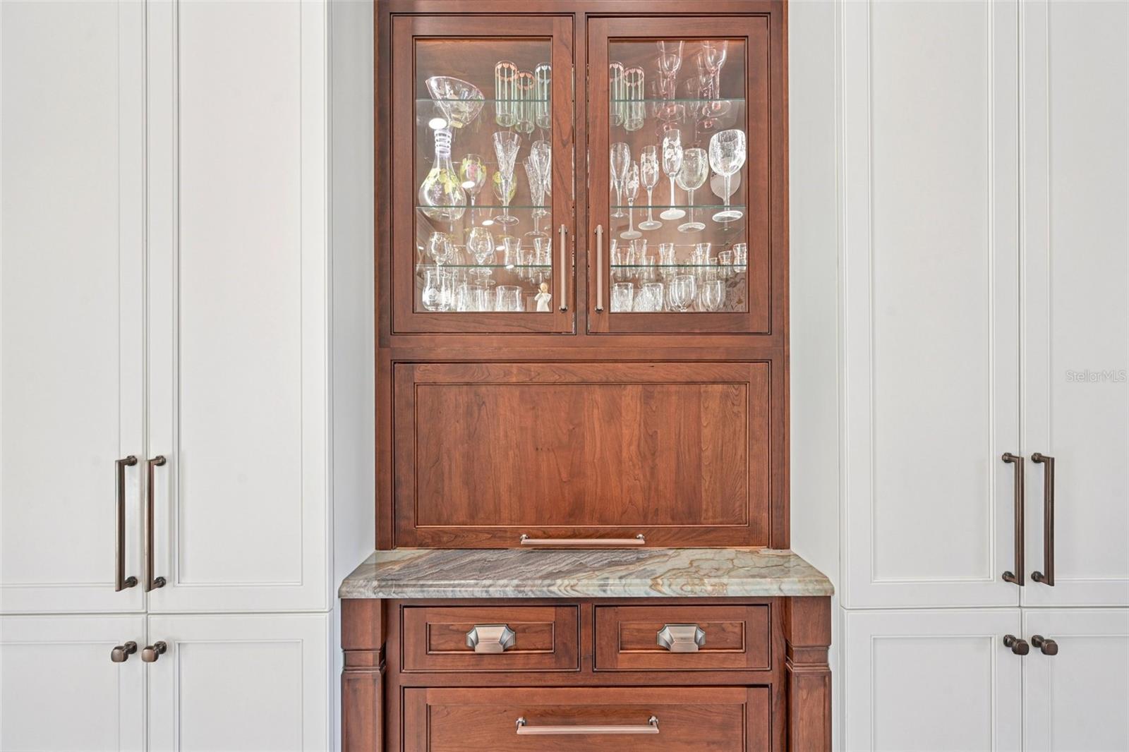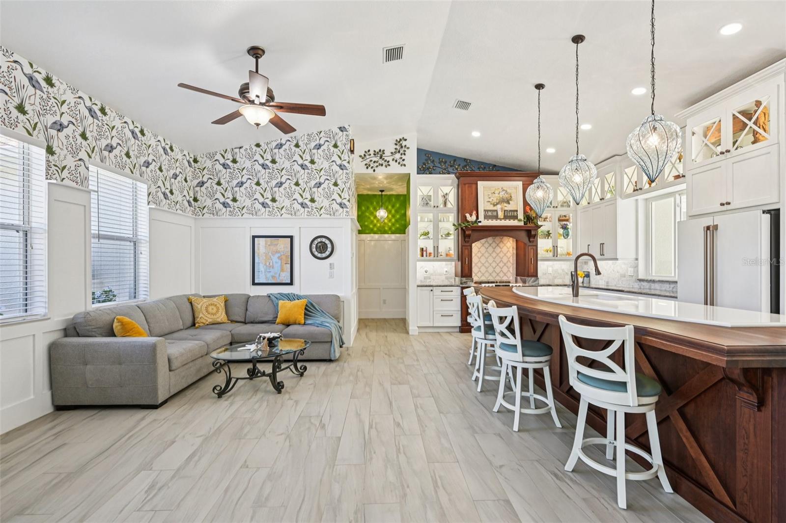 Discover the essence of true Florida waterfront living with this stunning three bedroom, three bath pool home perfectly situated on the Ingersol Waterway with just one bridge to the Myakka River and direct access to Charlotte Harbor, Boca Grande and the Gulf of Mexico. This residence blends timeless design with modern comforts, offering the perfect setting for those who appreciate privacy, craftsmanship, and the coastal lifestyle. From the moment you arrive, the custom handcrafted iron front door makes a statement with its intricate design and vertical deadbolts, that immediately conveys elegance. High vaulted ceilings and custom wainscoting combine with porcelain tile flooring throughout and designer lighting to create a bright and welcoming atmosphere. Expansive windows draw your attention to the beautiful saltwater canal framed by lush tropical landscaping. The chef’s kitchen is a true masterpiece of design and functionality, thoughtfully crafted for both everyday living and elegant entertaining. Beautiful Café brand appliances complement the custom-built cabinetry, which showcases exceptional craftsmanship and convenient design details, including a built-in coffee bar area, soft interior lighting, and subtle under-island illumination that enhances the ambiance. Every cabinet has been carefully designed with purposeful touches that maximize storage and style. The centerpiece of the kitchen is a striking imported Acacia wood island, perfectly paired with exotic Ocean Wave granite countertops. A stunning Mother of Pearl marble backsplash extends behind the custom range hood, transforming the cooking area into a work of art and creating a seamless blend of warmth, sophistication, and visual appeal. The spacious primary suite provides a peaceful retreat with high tray ceilings and an elegant ensuite bath featuring two vanities, a walk-in shower, and a luxurious garden tub. Dual walk-in closets with custom shelving provides generous storage while maintaining a refined appearance. The two additional bedrooms are equally inviting, and the second bathroom conveniently serves as a pool bath. Access the lanai and pool area to experience the very best of Florida outdoor living. The expansive screened lanai features custom lighting, a sparkling pool, and a new electric roll-down storm shutter for added protection. It is the perfect space for entertaining or simply unwinding in the gentle coastal breeze. The property extends to a sturdy IPE wood dock complete with solar lighting and a ladder, ideal for kayaking, fishing, or launching a boat for a day on the water. Extensive updates enhance peace of mind, including a new roof completed in January 2025, a new pool pump in 2024, a whole-home reverse osmosis system, and Generator Inlet to power your home if needed. With no deed restrictions, this property provides the freedom to bring your boat, RV, or other recreational vehicles. Whether you are seeking a peaceful retreat, a home designed for entertaining, or a base for exploring Southwest Florida’s incredible waterways, this property delivers. The adjacent lot is also available for purchase, offering an excellent opportunity to expand your space, add a workshop, garage, or guest suite, or simply enjoy additional privacy and open green space. Every detail of this residence reflects thoughtful design, fine craftsmanship, and pride of ownership. Schedule your private showing and see why this exceptional home stands out as a true Gulf Coast gem.