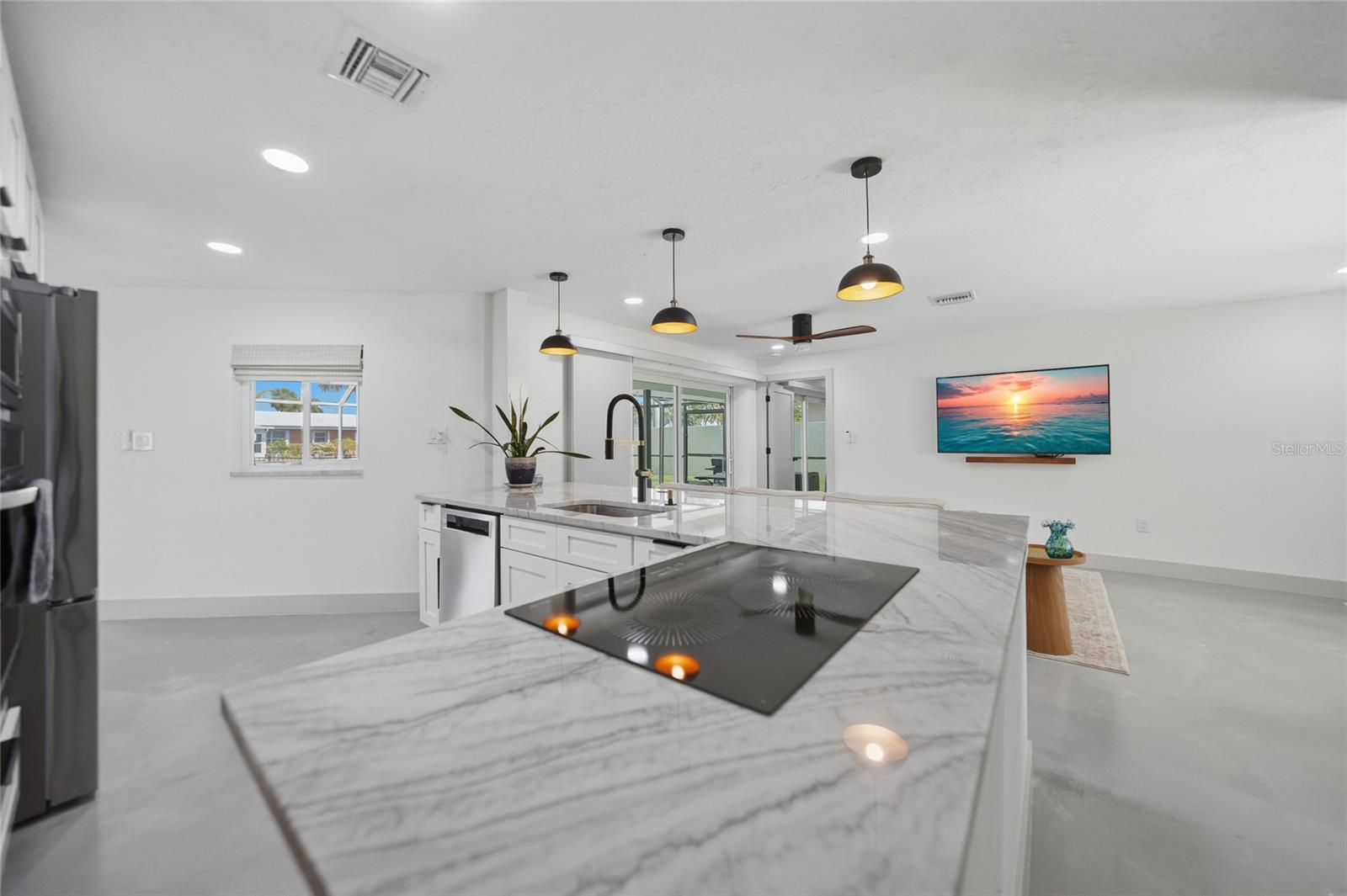 Completely renovated and thoughtfully designed for modern coastal living, this waterfront pool home offers 2 bedrooms plus a versatile flex space that can easily function as a third bedroom, office, or den. The open-concept floor plan creates a seamless flow between the living, dining, and kitchen areas—ideal for both everyday living and entertaining. The kitchen is well-appointed with shaker-style cabinetry, granite countertops, pendant lighting, a wall oven and microwave, and a separate cooktop, offering both style and functionality with ample storage and workspace. The primary suite serves as a private retreat, featuring sliding glass doors that open directly to the lanai and pool area for effortless indoor-outdoor living. The en-suite bathroom offers a calming, spa-inspired atmosphere designed for relaxation. Step outside to enjoy a spacious lanai with both covered and open areas, perfect for soaking up the Florida sunshine or hosting gatherings by the pool. Set along a sailboat-access canal with direct access to Charlotte Harbor and no bridges, this property is ideal for boating enthusiasts. Waterfront features include a seawall, private boat dock, and a wrought iron fenced yard, combining functionality with a clean, polished look. Recent upgrades include all new hurricane-rated windows, sliders, and doors installed in January 2023, along with custom window coverings, adding both style and peace of mind. Conveniently located near shopping, dining, and the Sunseeker Resort, this home offers the perfect blend of comfort, accessibility, and the Florida coastal lifestyle. Furnishings negotiable, offering added flexibility for buyers seeking a move-in-ready or turnkey option.