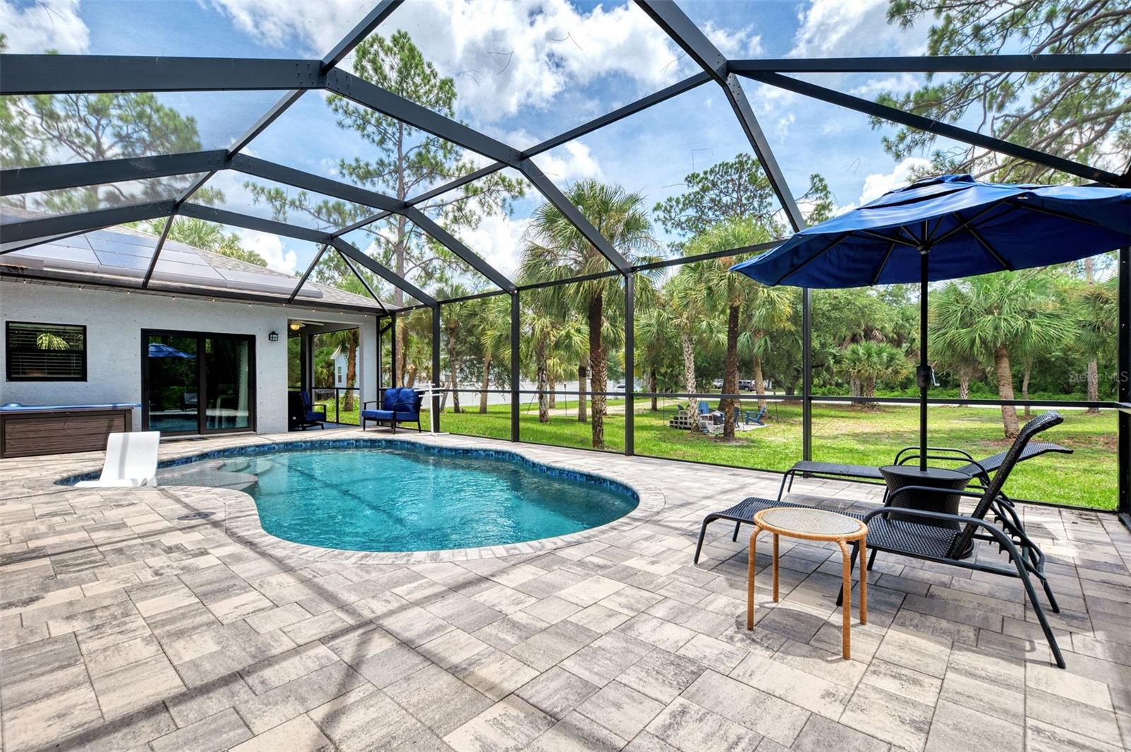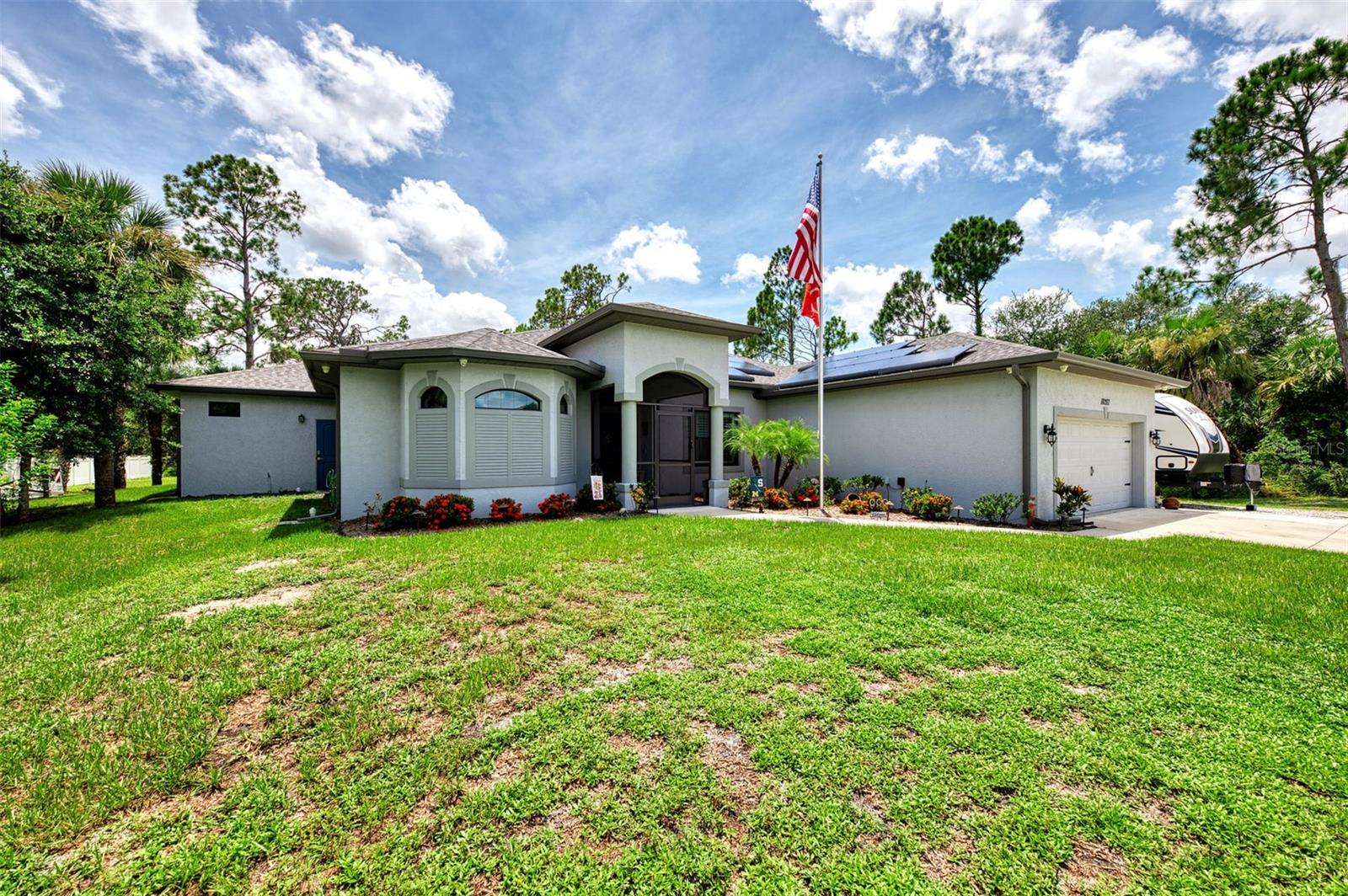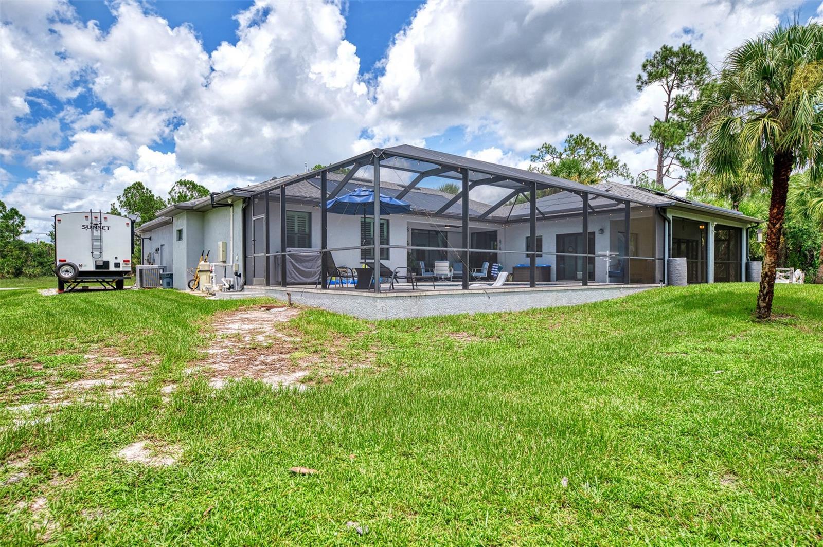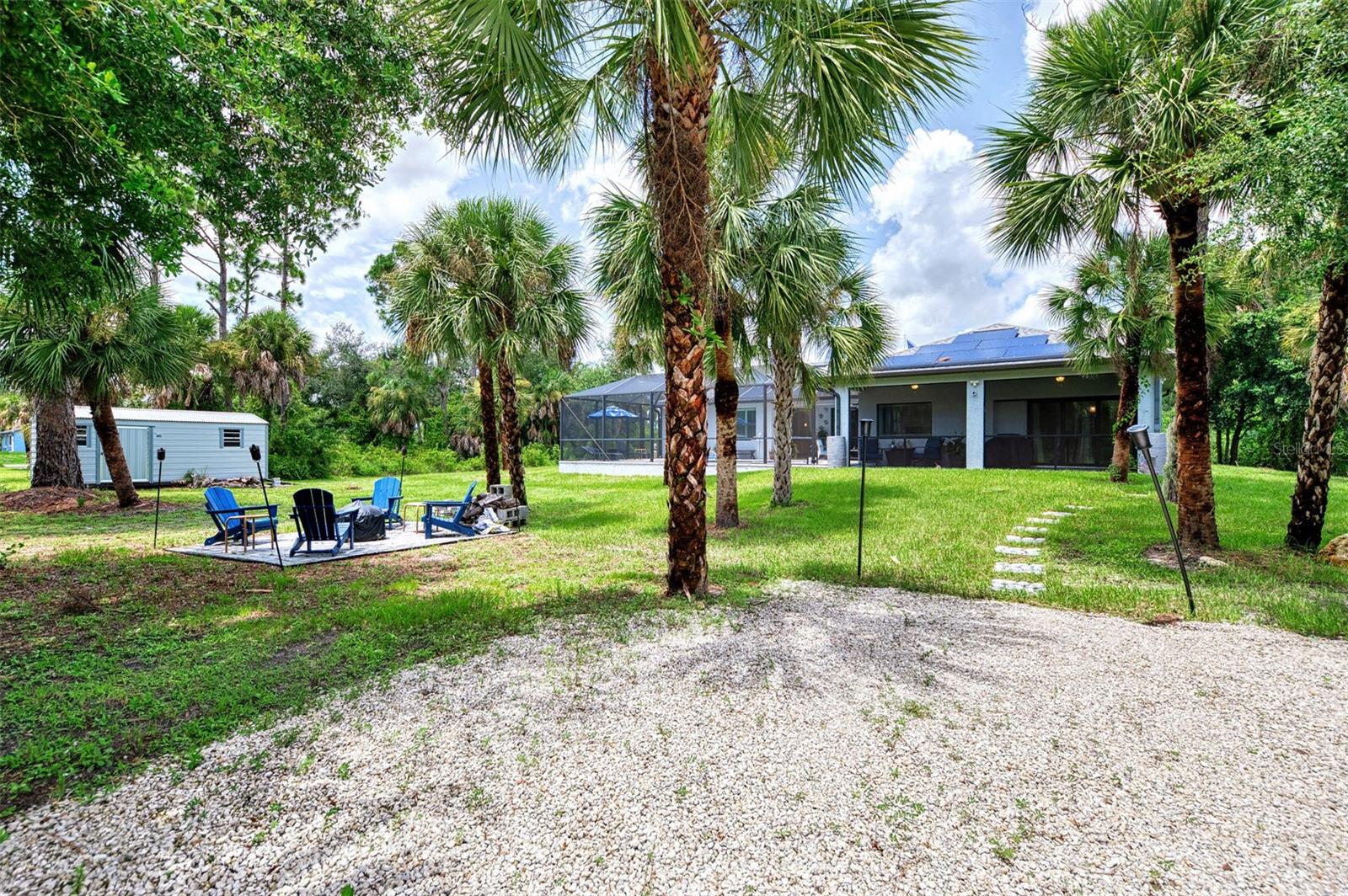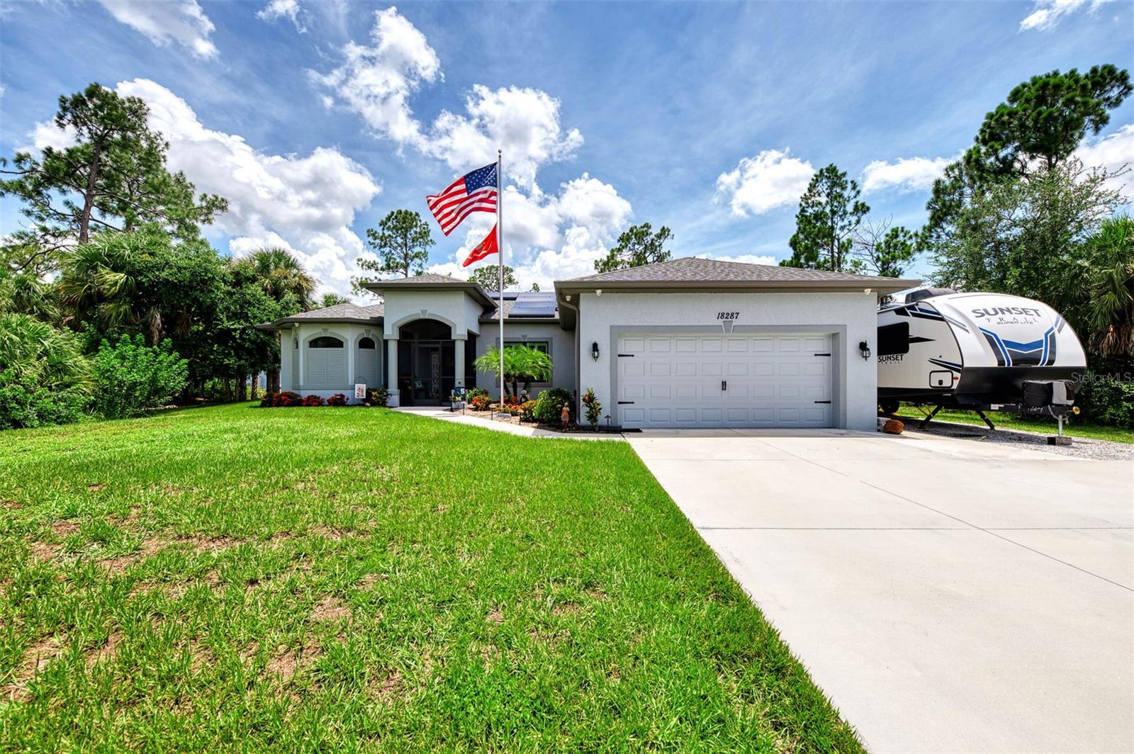 This Exceptional Multi-Generational Home Will Wow You! Welcome to your dream home on four spacious lots. This stunning property features a main house with three bedrooms and two baths, plus a one-bedroom, one-bath mother-in-law suite with a kitchenette, living room, private patio, washer and dryer, and separate entrance—ideal for extended family or as an income-producing unit. Inside, 11 ft high ceilings with tray accents in the living room and primary bedroom create an airy feel. Ceiling fans throughout the home ensure comfort. Plantation shutters adorn all windows. The primary suite offers two walk-in closets (one with storage shelving), a luxurious walk-through shower with multiple shower heads, and a split double vanity. The modern kitchen boasts quartz countertops, solid wood soft-close cabinets, and stainless steel appliances. An indoor laundry room with two closets provides ample storage. Step out through the glass pocket sliders onto the beautiful screened lanai with pavers. Cool off in the refreshing private solar heated swimming pool, or enjoy your hobbies and entertaining in the huge back yard with fire ring. Bring all the toys! The property includes additional car, boat, and RV parking with a 50-amp hookup, an 18x12 shed with power, mature landscaping, outdoor lighting, and an extended three-car driveway. Public water, whole home solar power, and a generator connection to the panel add convenience. Located minutes from shopping, dining, Charlotte harbor, and I-75, this home offers both comfort and convenience. Contact us today to schedule a private showing!
