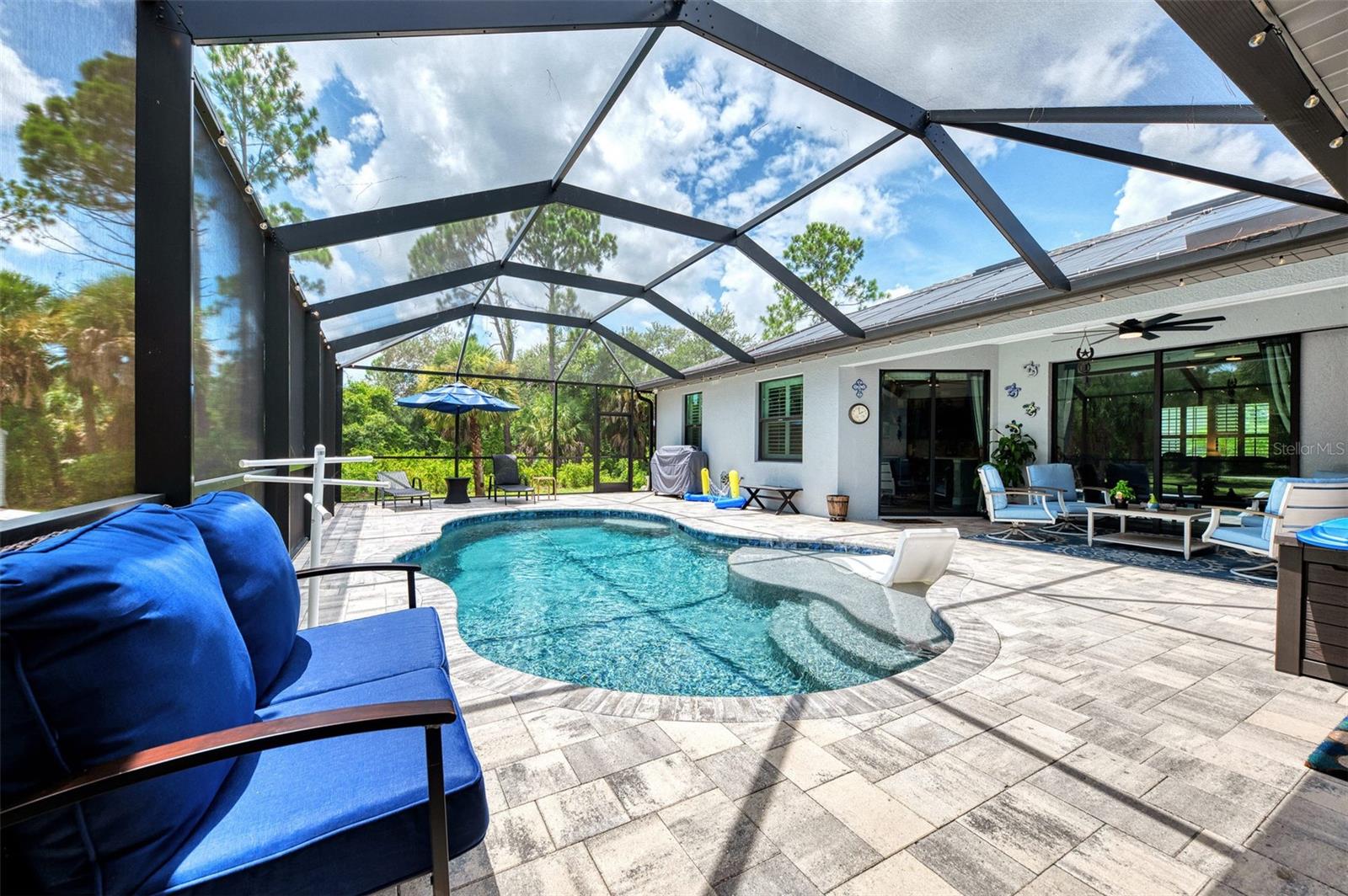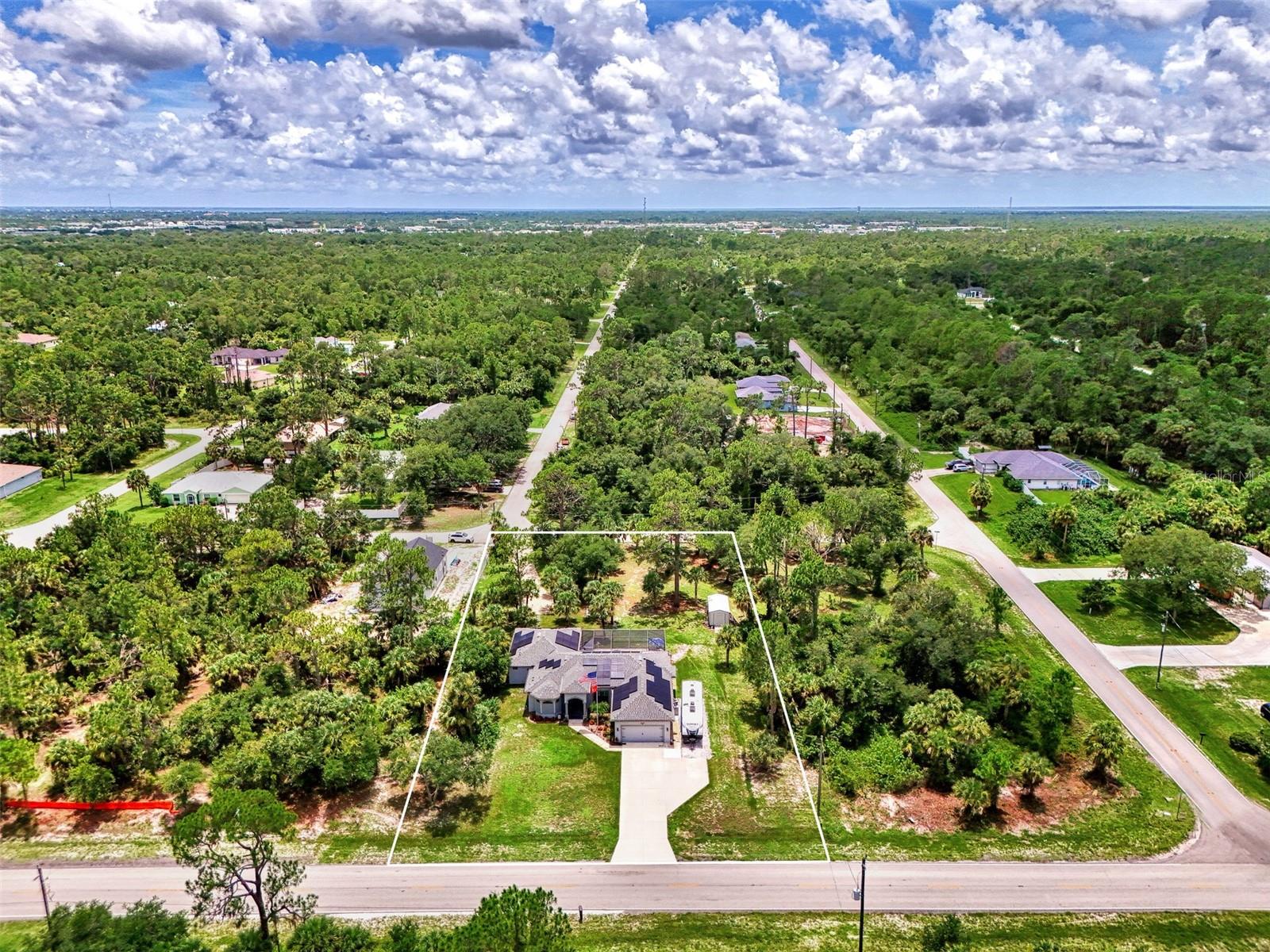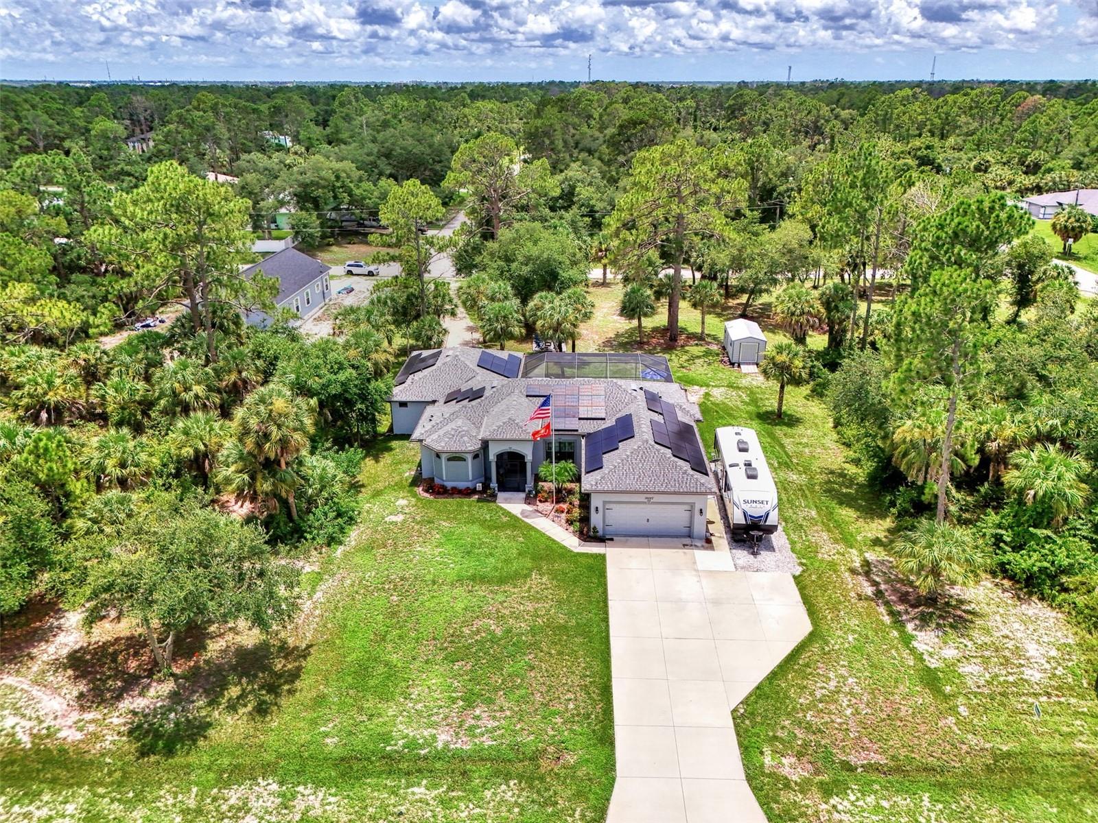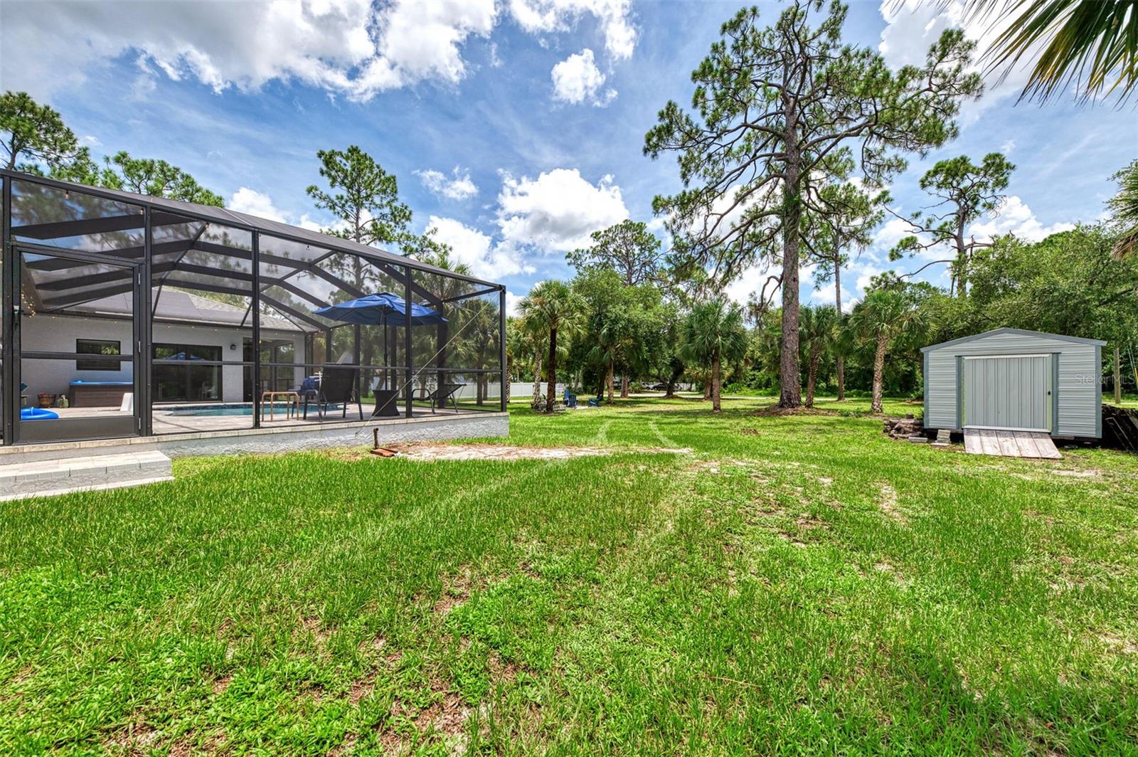 This Exceptional Multi-Generational Home Will Wow You! Welcome to your dream home on four spacious lots. This stunning property features a main house with three bedrooms and two baths, plus a one-bedroom, one-bath mother-in-law suite with a kitchenette, living room, private patio, washer and dryer, and separate entrance—ideal for extended family or as an income-producing unit. Inside, 11 ft high ceilings with tray accents in the living room and primary bedroom create an airy feel. Ceiling fans throughout the home ensure comfort. Plantation shutters adorn all windows. The primary suite offers two walk-in closets (one with storage shelving), a luxurious walk-through shower with multiple shower heads, and a split double vanity. The modern kitchen boasts quartz countertops, solid wood soft-close cabinets, and stainless steel appliances. An indoor laundry room with two closets provides ample storage. Step out through the glass pocket sliders onto the beautiful screened lanai with pavers. Cool off in the refreshing private solar heated swimming pool, or enjoy your hobbies and entertaining in the huge back yard with fire ring. Bring all the toys! The property includes additional car, boat, and RV parking with a 50-amp hookup, an 18x12 shed with power, mature landscaping, outdoor lighting, and an extended three-car driveway. Public water, whole home solar power, and a generator connection to the panel add convenience. Located minutes from shopping, dining, Charlotte harbor, and I-75, this home offers both comfort and convenience. Contact us today to schedule a private showing!