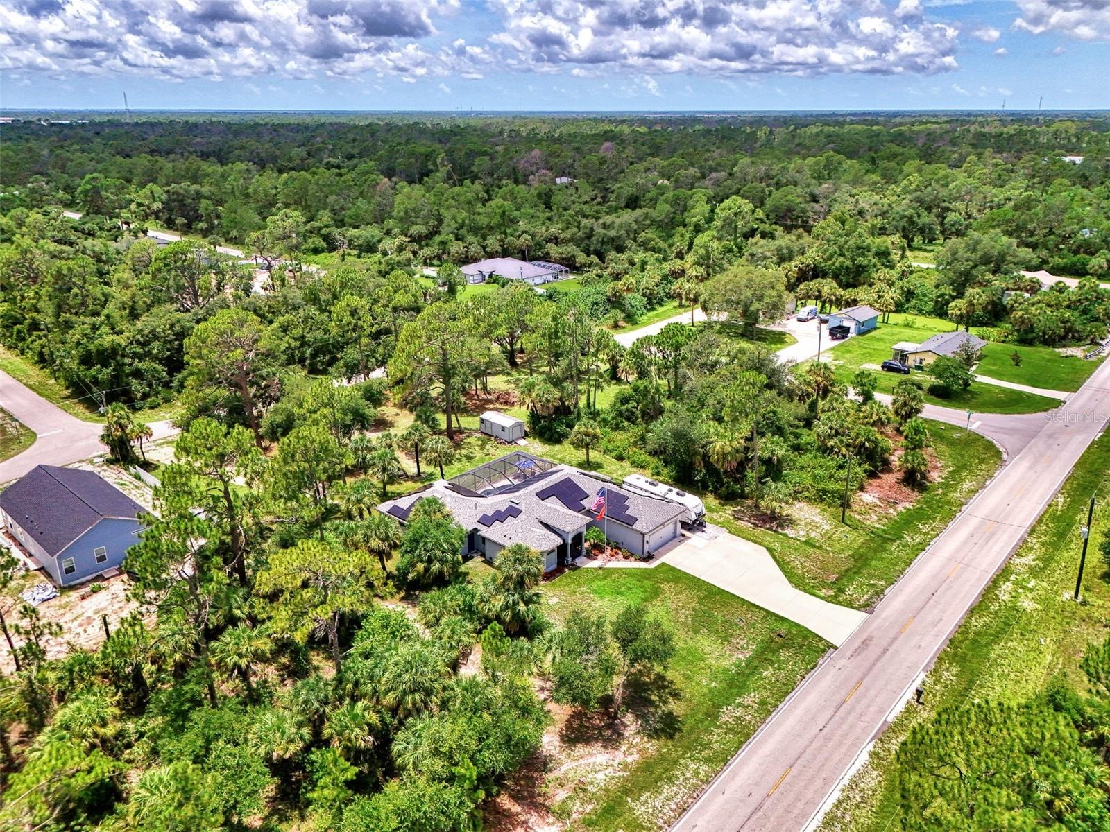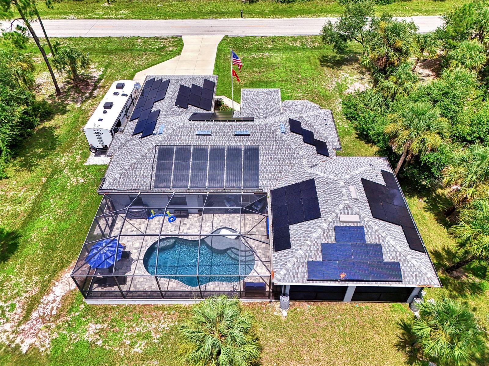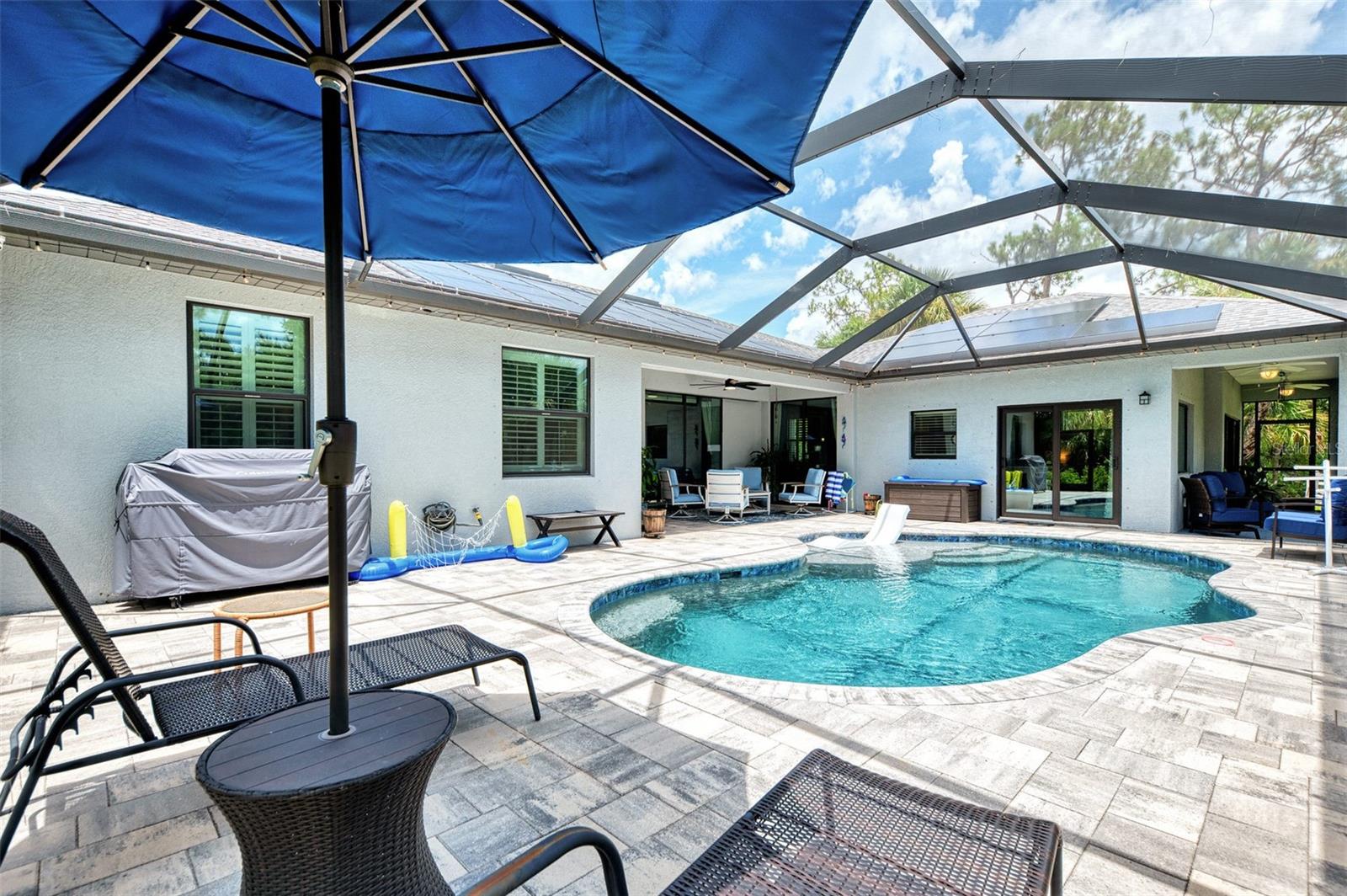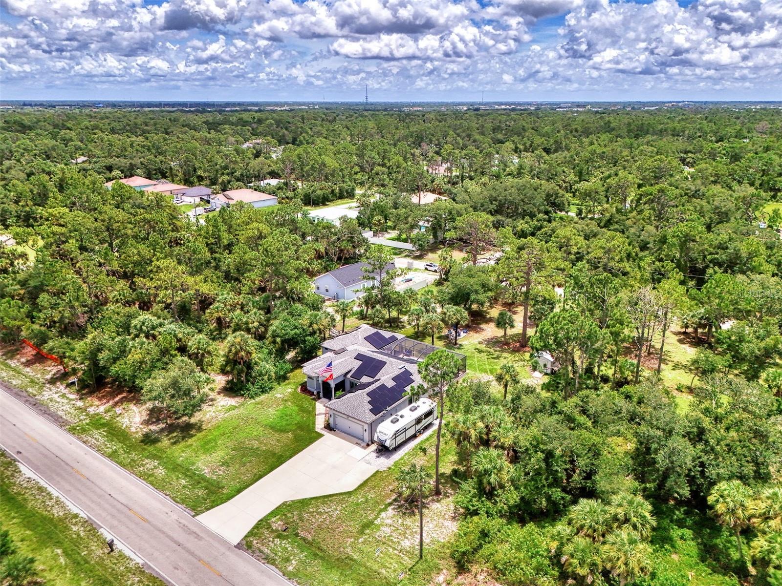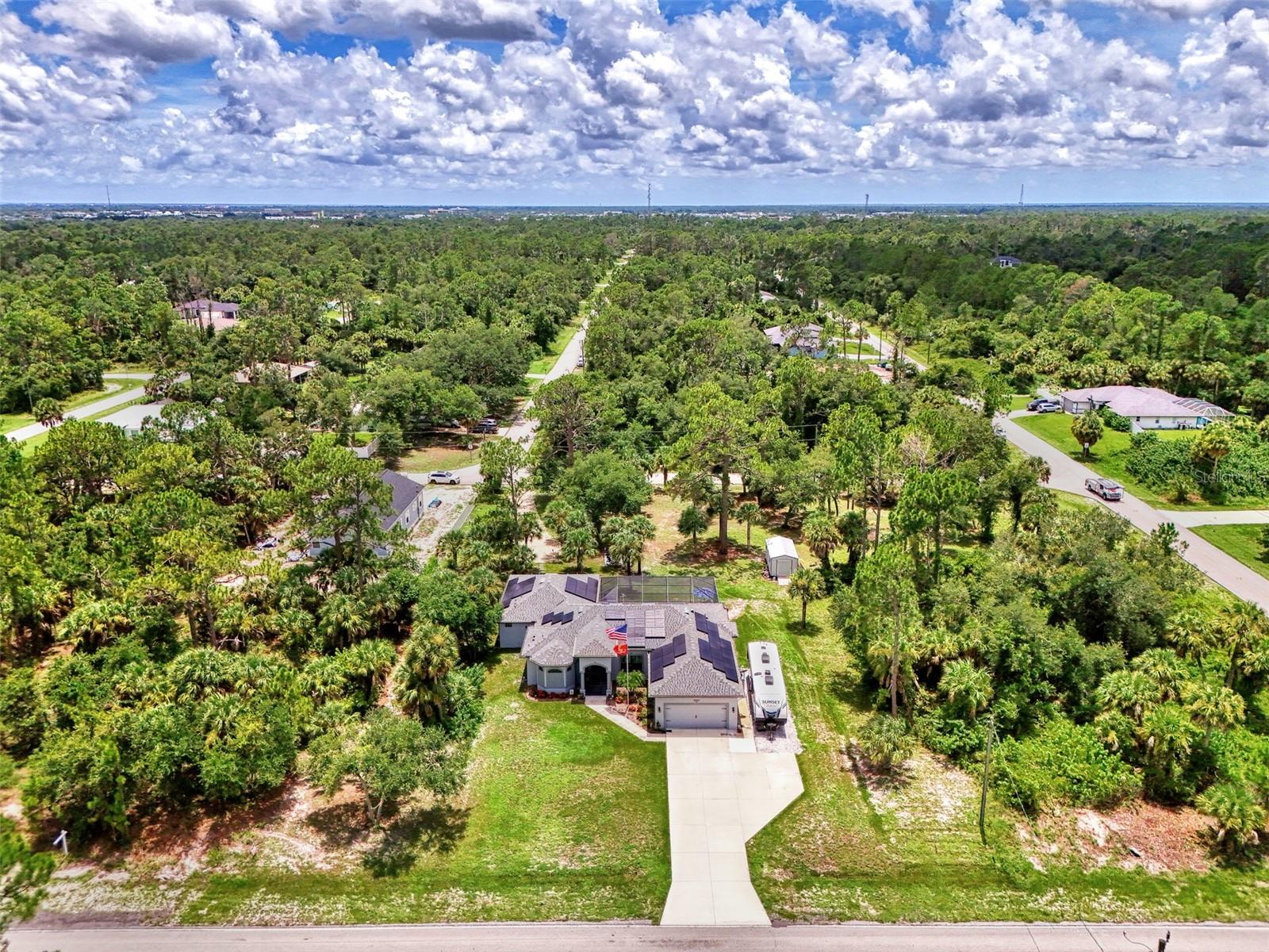 This Exceptional Multi-Generational Home Will Wow You! Welcome to your dream home on four spacious lots. This stunning property features a main house with three bedrooms and two baths, plus a one-bedroom, one-bath mother-in-law suite with a kitchenette, living room, private patio, washer and dryer, and separate entrance—ideal for extended family or as an income-producing unit. Inside, 11 ft high ceilings with tray accents in the living room and primary bedroom create an airy feel. Ceiling fans throughout the home ensure comfort. Plantation shutters adorn all windows. The primary suite offers two walk-in closets (one with storage shelving), a luxurious walk-through shower with multiple shower heads, and a split double vanity. The modern kitchen boasts quartz countertops, solid wood soft-close cabinets, and stainless steel appliances. An indoor laundry room with two closets provides ample storage. Step out through the glass pocket sliders onto the beautiful screened lanai with pavers. Cool off in the refreshing private solar heated swimming pool, or enjoy your hobbies and entertaining in the huge back yard with fire ring. Bring all the toys! The property includes additional car, boat, and RV parking with a 50-amp hookup, an 18x12 shed with power, mature landscaping, outdoor lighting, and an extended three-car driveway. Public water, whole home solar power, and a generator connection to the panel add convenience. Located minutes from shopping, dining, Charlotte harbor, and I-75, this home offers both comfort and convenience. Contact us today to schedule a private showing!