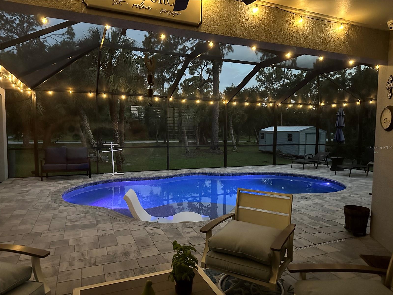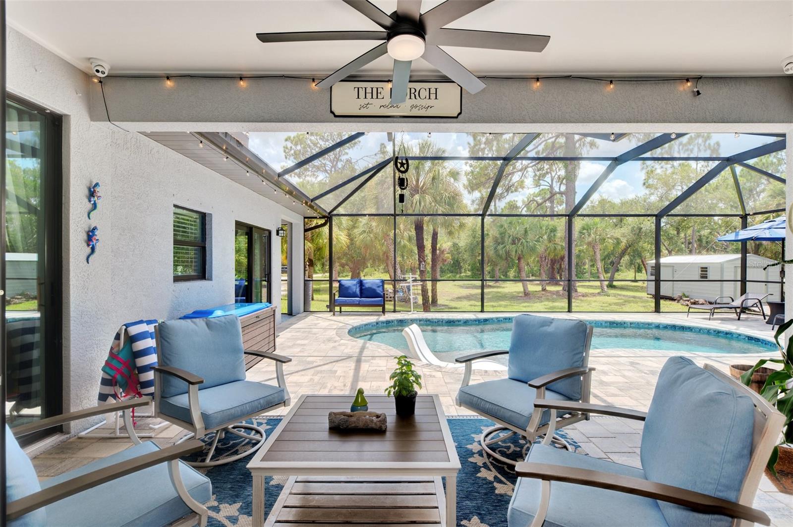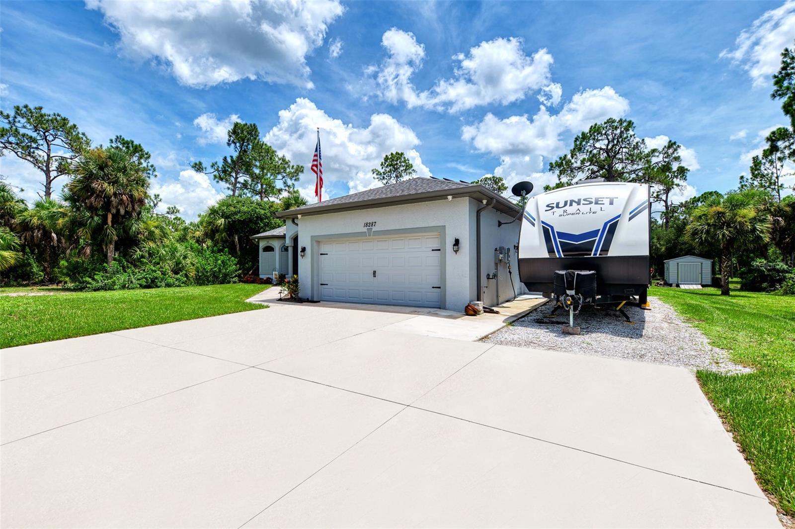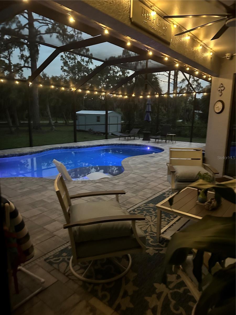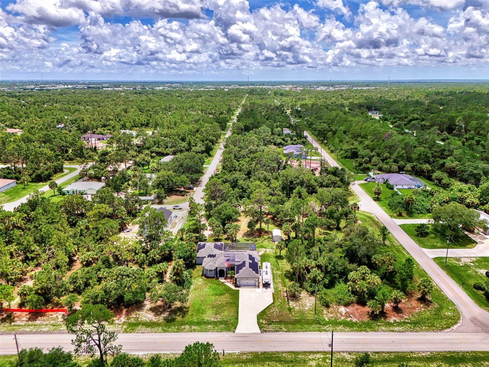 This Exceptional Multi-Generational Home Will Wow You! Welcome to your dream home on four spacious lots. This stunning property features a main house with three bedrooms and two baths, plus a one-bedroom, one-bath mother-in-law suite with a kitchenette, living room, private patio, washer and dryer, and separate entrance—ideal for extended family or as an income-producing unit. Inside, 11 ft high ceilings with tray accents in the living room and primary bedroom create an airy feel. Ceiling fans throughout the home ensure comfort. Plantation shutters adorn all windows. The primary suite offers two walk-in closets (one with storage shelving), a luxurious walk-through shower with multiple shower heads, and a split double vanity. The modern kitchen boasts quartz countertops, solid wood soft-close cabinets, and stainless steel appliances. An indoor laundry room with two closets provides ample storage. Step out through the glass pocket sliders onto the beautiful screened lanai with pavers. Cool off in the refreshing private solar heated swimming pool, or enjoy your hobbies and entertaining in the huge back yard with fire ring. Bring all the toys! The property includes additional car, boat, and RV parking with a 50-amp hookup, an 18x12 shed with power, mature landscaping, outdoor lighting, and an extended three-car driveway. Public water, whole home solar power, and a generator connection to the panel add convenience. Located minutes from shopping, dining, Charlotte harbor, and I-75, this home offers both comfort and convenience. Contact us today to schedule a private showing!