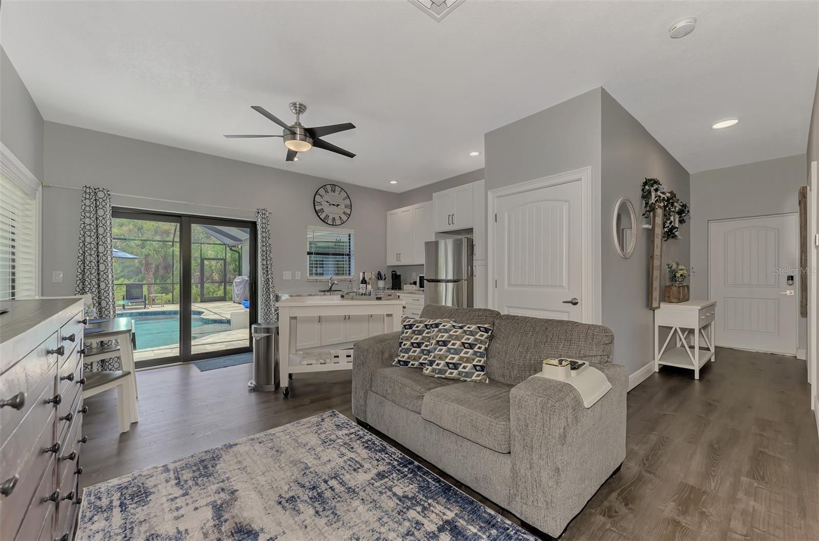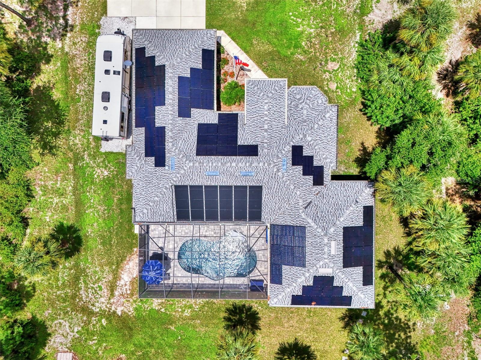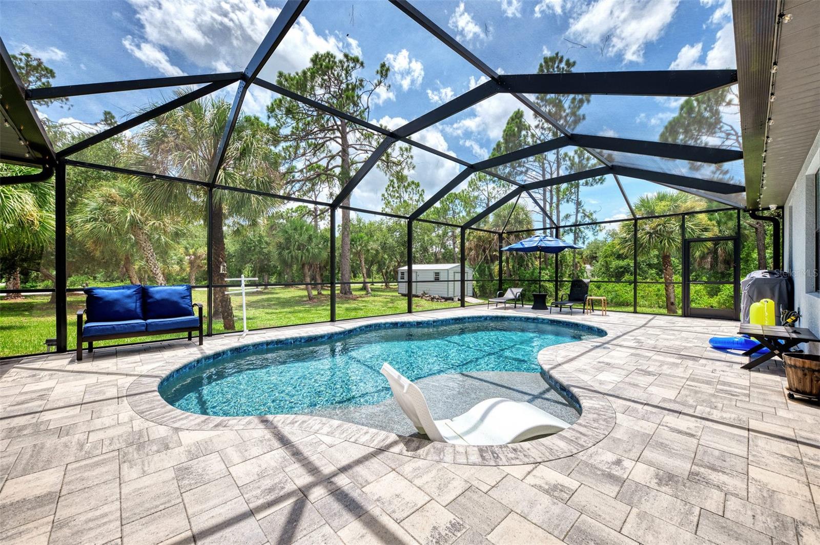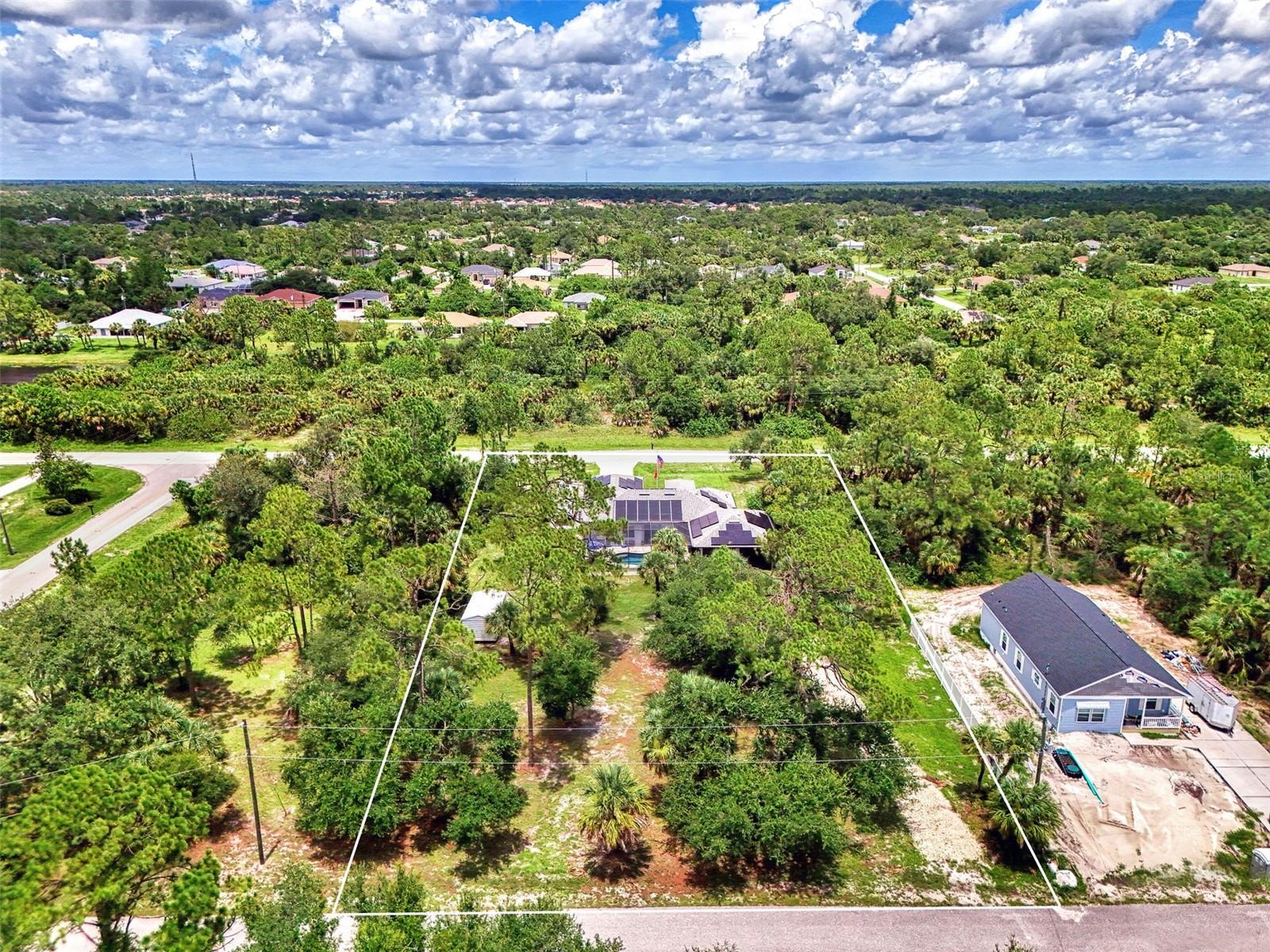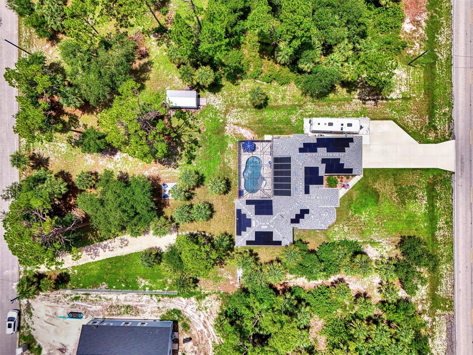 This Exceptional Multi-Generational Home Will Wow You! Welcome to your dream home on four spacious lots. This stunning property features a main house with three bedrooms and two baths, plus a one-bedroom, one-bath mother-in-law suite with a kitchenette, living room, private patio, washer and dryer, and separate entrance—ideal for extended family or as an income-producing unit. Inside, 11 ft high ceilings with tray accents in the living room and primary bedroom create an airy feel. Ceiling fans throughout the home ensure comfort. Plantation shutters adorn all windows. The primary suite offers two walk-in closets (one with storage shelving), a luxurious walk-through shower with multiple shower heads, and a split double vanity. The modern kitchen boasts quartz countertops, solid wood soft-close cabinets, and stainless steel appliances. An indoor laundry room with two closets provides ample storage. Step out through the glass pocket sliders onto the beautiful screened lanai with pavers. Cool off in the refreshing private solar heated swimming pool, or enjoy your hobbies and entertaining in the huge back yard with fire ring. Bring all the toys! The property includes additional car, boat, and RV parking with a 50-amp hookup, an 18x12 shed with power, mature landscaping, outdoor lighting, and an extended three-car driveway. Public water, whole home solar power, and a generator connection to the panel add convenience. Located minutes from shopping, dining, Charlotte harbor, and I-75, this home offers both comfort and convenience. Contact us today to schedule a private showing!