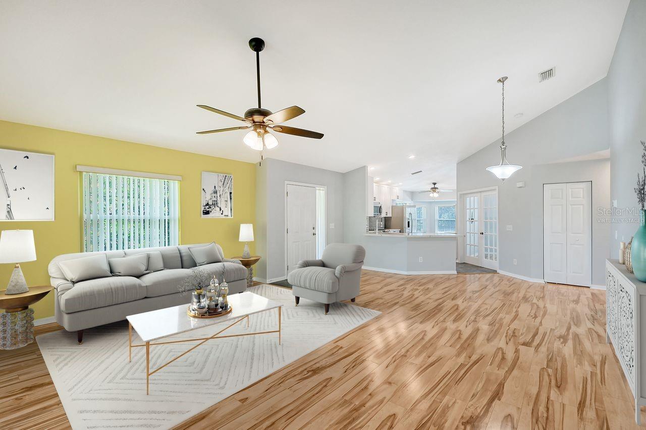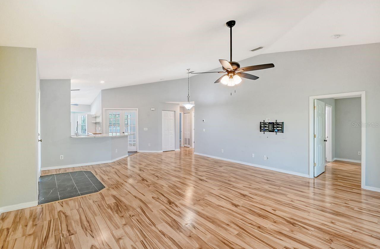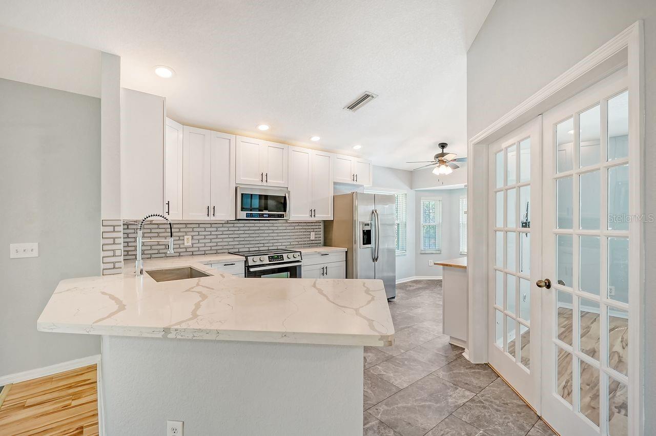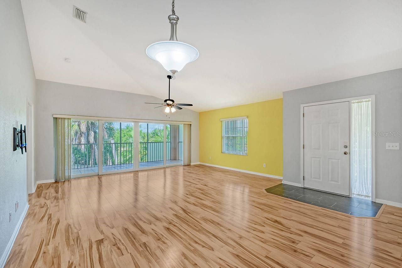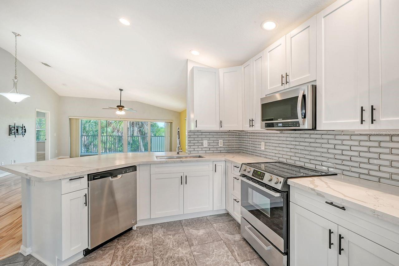 Discover the epitome of comfortable living in this modern, updated condo located in the highly sought-after Heritage Oak Park community. Enjoy peace of mind as this home is NOT IN A FLOOD ZONE. This end unit offers a peaceful retreat within a private, gated enclave, surrounded by lush tropical landscaping and stately Oak trees. Step into an inviting open floor plan with soaring cathedral ceilings, enhanced by laminate flooring installed in late 2020. The spacious great room is perfect for entertaining or simply relaxing, with flat-screen mounts ready for your TV. The adjacent dining area and breakfast bar provide versatile options for casual and formal dining. The kitchen is a chef’s dream, featuring solid wood cabinets with soft-close doors and drawers, two convenient roll-out shelves, and a pantry. The generous quartz countertops, modern glass backsplash, and a charming coffee bar with floating shelves add both style and function. Stainless steel appliances complement the new, never-used dishwasher, offering a blend of quality and reliability. The primary suite offers a tranquil escape with a large walk-in closet and an en-suite bath featuring new vanities, quartz countertops, updated lighting, and a walk-in shower with ceramic tile floors. The additional bedrooms provide ample space for guests or a home office, with one featuring elegant French doors. Enjoy the convenience of an in-unit laundry room and additional storage provided by the outdoor storage unit. The expansive screened lanai, overlooking a private wooded view, offers the perfect setting for your morning coffee or evening relaxation. Heritage Oak Park isn’t just a place to live—it’s a lifestyle. Enjoy a year-round recreational experience with access to a clubhouse, community pool, fitness center, library, billiards room, tennis courts, pickleball, bocce ball, and shuffleboard. The community’s serene setting, complete with a lake and walking paths, invites you to explore the local wildlife and beautiful surroundings. Located in the heart of Port Charlotte, this condo is just minutes from shopping, dining, and golfing, with the pristine Gulf beaches a short drive away. Recent upgrades include hurricane-impact windows installed in 2023, ensuring peace of mind and energy efficiency. This condo perfectly blends comfort, style, and convenience, making it an ideal place to call home.