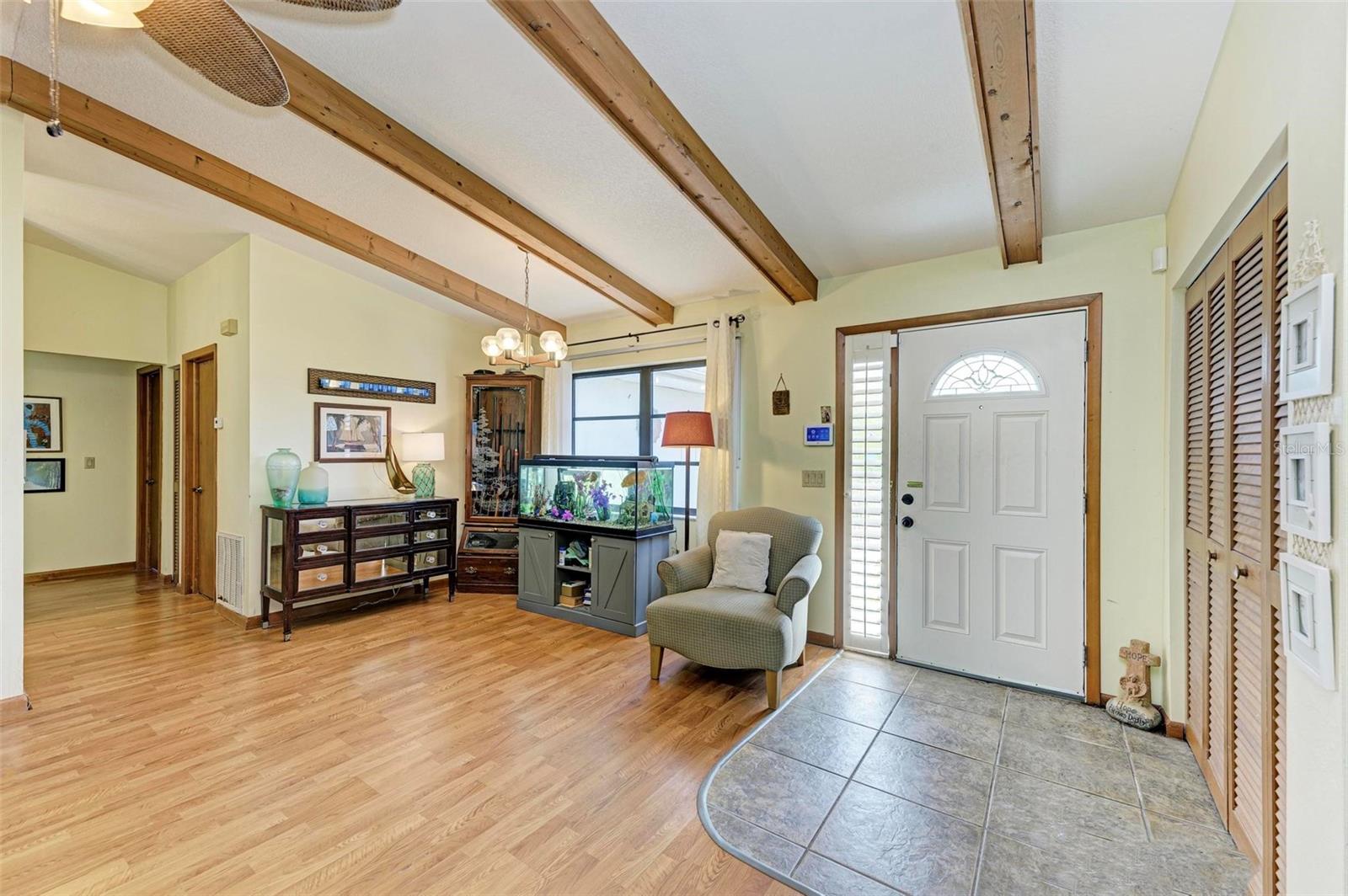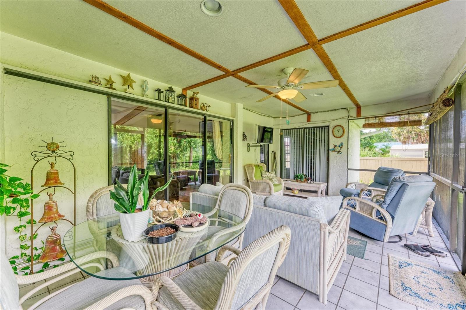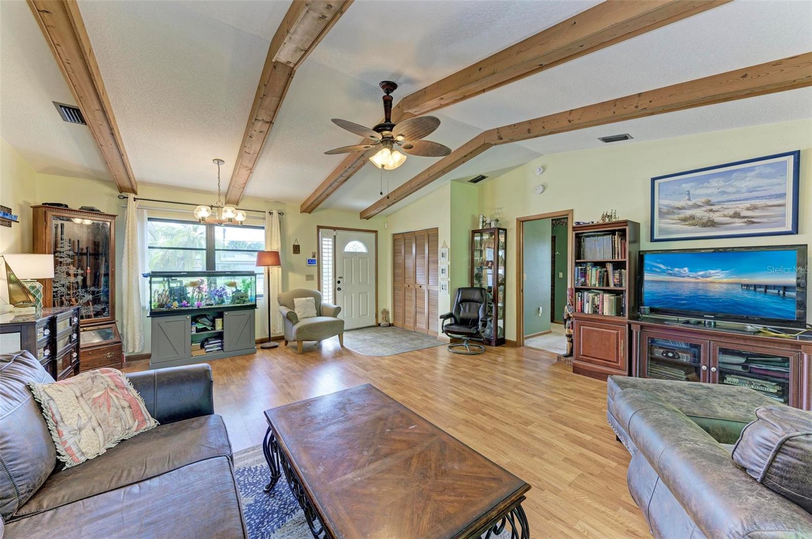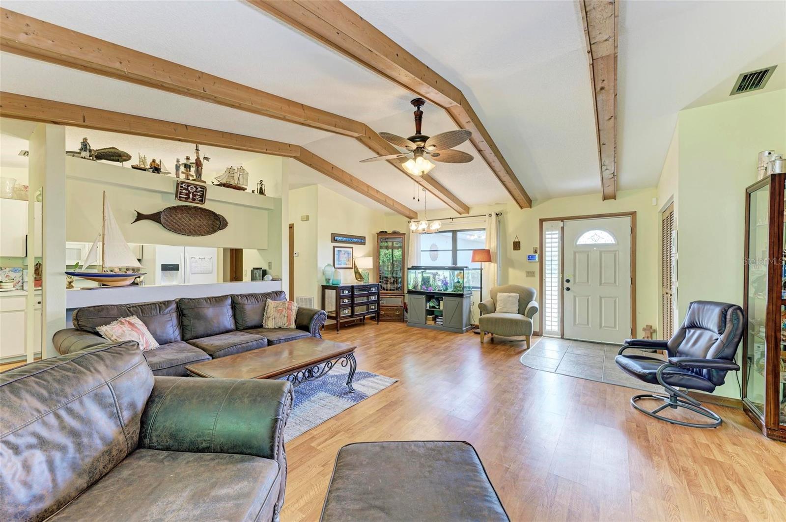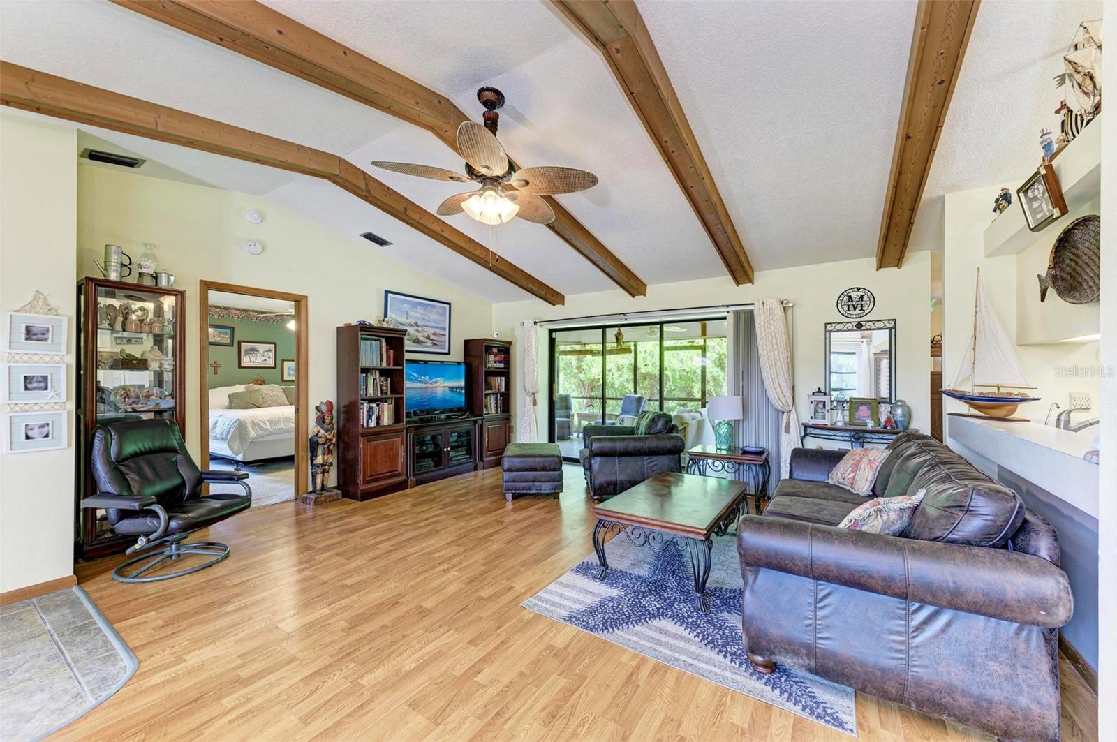 Experience the perfect blend of comfort, convenience, and charm with this delightful 3-bedroom, 2-bathroom home featuring a 2-car garage, ideally situated near everything you need. Located just moments away from a wide array of shops, restaurants, schools, parks, pristine beaches, and medical facilities, this property offers an unparalleled lifestyle with easy access to all of life's necessities. Step inside to be welcomed by a cozy and inviting living room bathed in natural light. Vaulted ceilings add to the sense of space, while sliding doors lead you effortlessly to the expansive lanai, creating a seamless connection between indoor and outdoor living. The kitchen extends to the dining area, offering a peaceful view of the lush surrounding greenery and direct access to the lanai. The primary bedroom is a private sanctuary featuring soft carpeting, an en suite bathroom complete with a tub and shower, and split vanities for added convenience. The two additional bedrooms, also carpeted, provide comfort and ample storage with built-in closets. A second bathroom offers a generous single vanity, walk-in shower, and linen closet, providing functional comfort for family and guests alike. Adding to the home's practicality is a well-appointed laundry room with space for shelving to keep your household essentials organized. The highlight of this home is the expansive lanai, which overlooks a serene backyard filled with lush green grass and trees. This spacious outdoor haven is perfect for enjoying the quintessential Florida lifestyle year-round. One of the standout features of this property is the absence of HOA fees and restrictions, granting you the freedom to explore a multitude of possibilities with your new home. Located less than a mile from Port Charlotte Town Center, you'll have a variety of shops and dining options at your fingertips. Families will appreciate the proximity to local schools, just within 2 miles, while the Sarasota Memorial ER at North Port is approximately 5 miles away, offering peace of mind. Embrace the opportunity to own a home that combines convenience, comfort, and a touch of tranquility in a prime location.