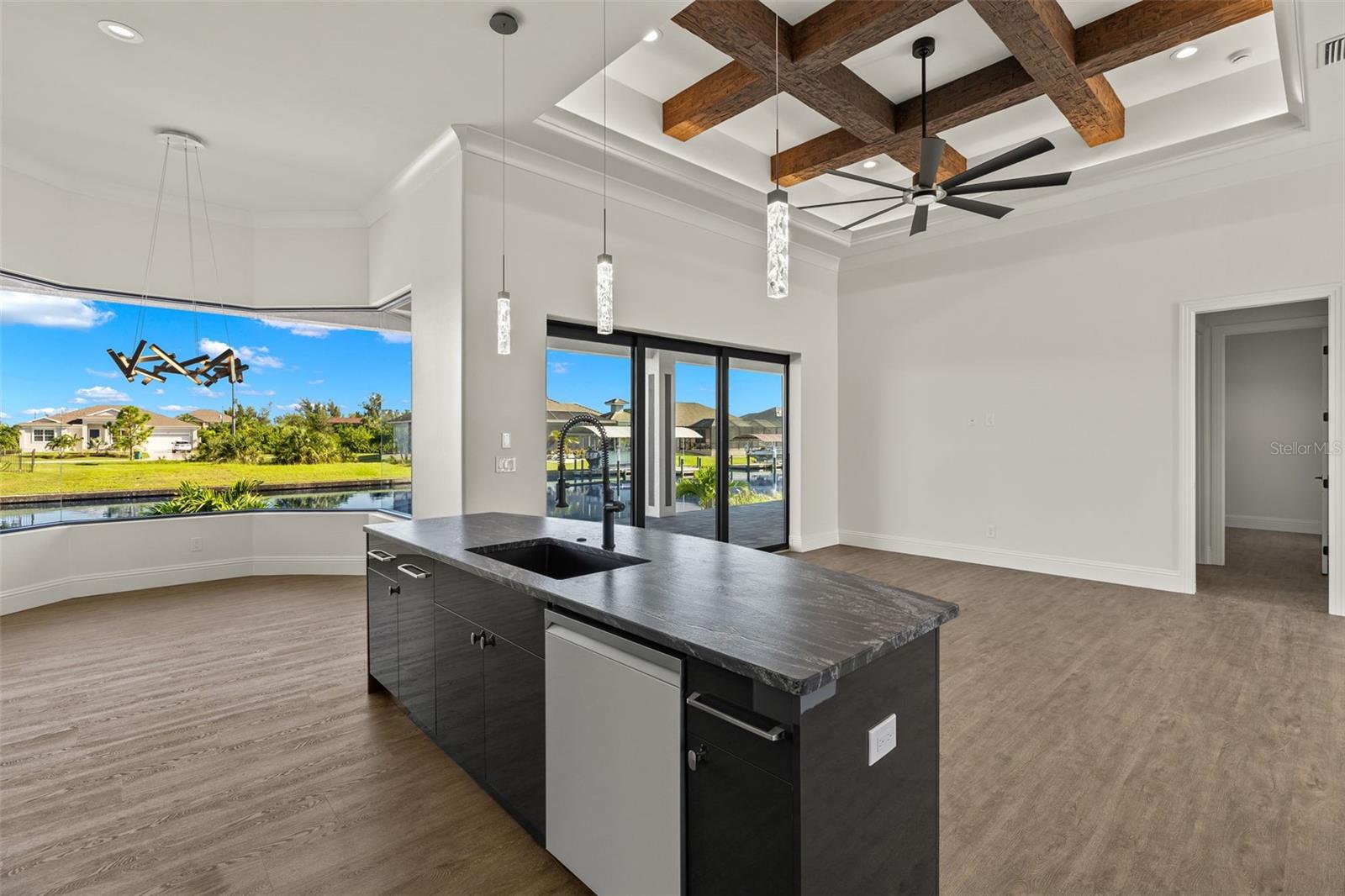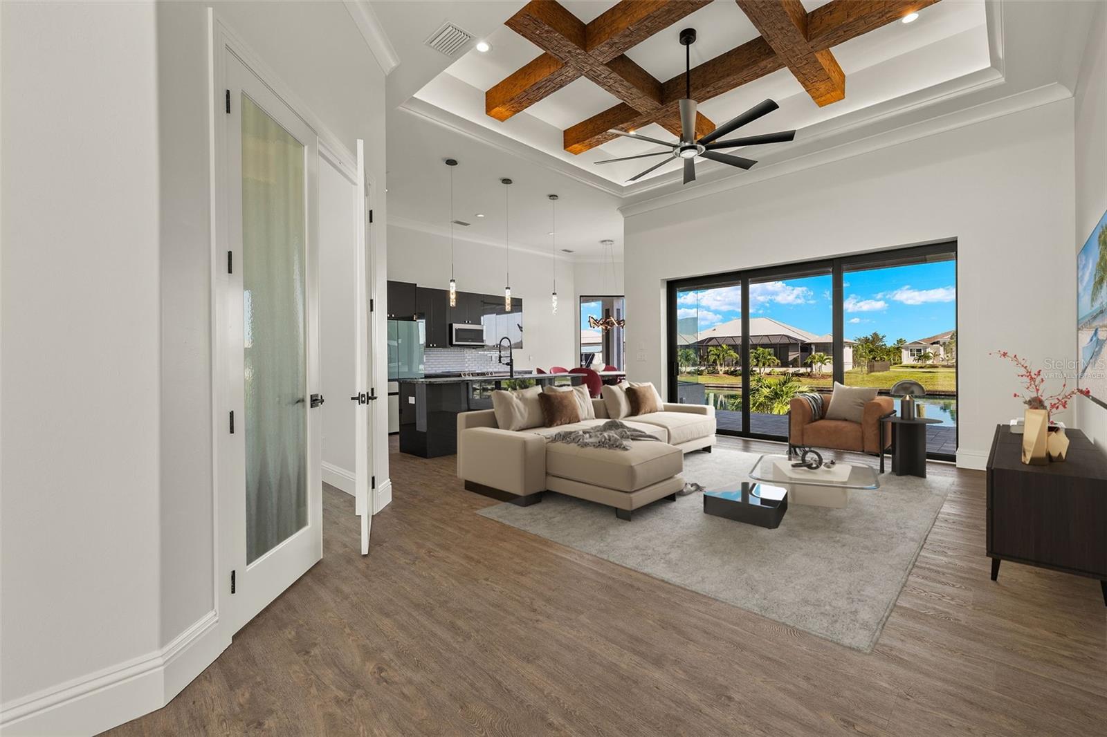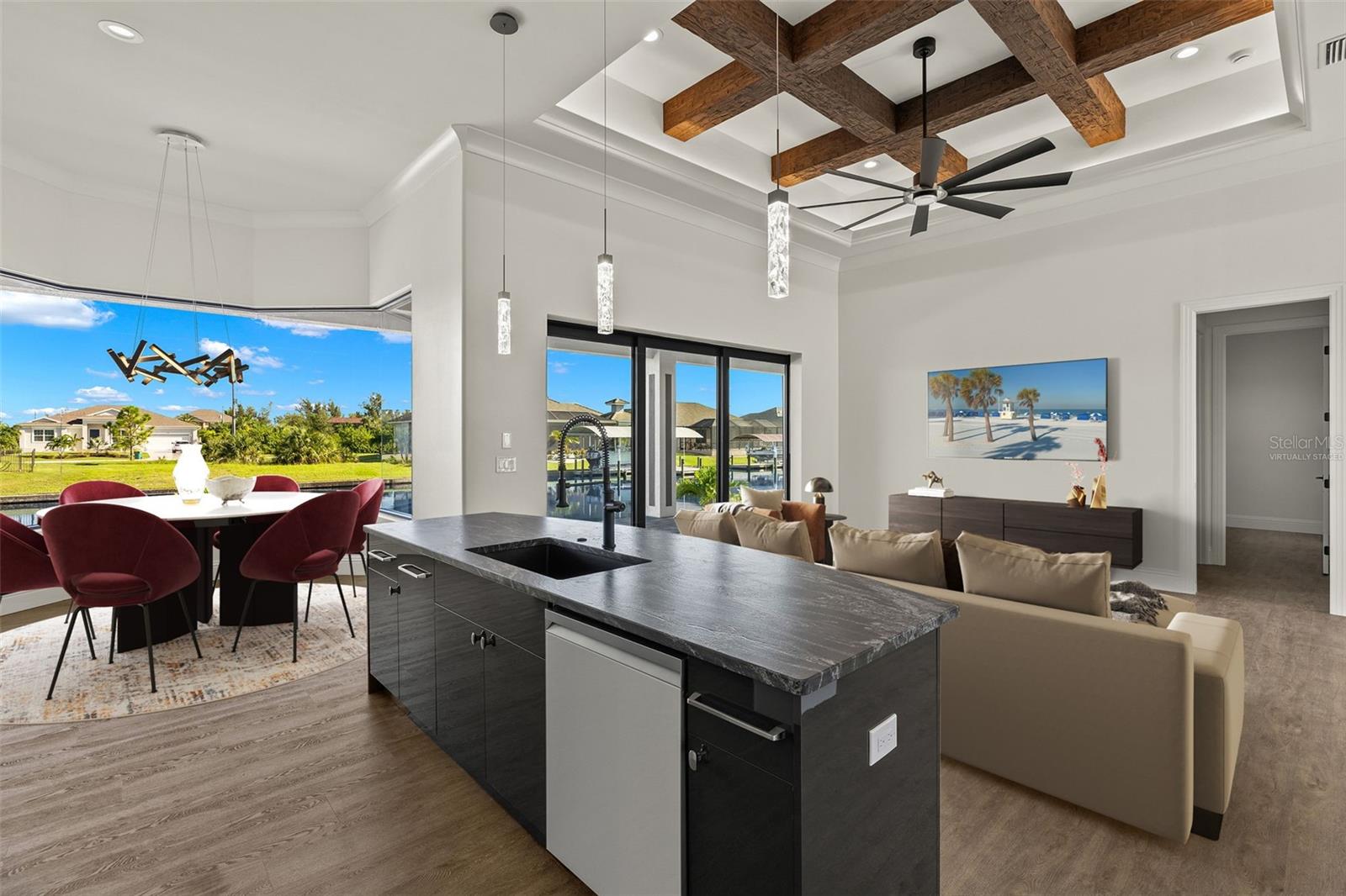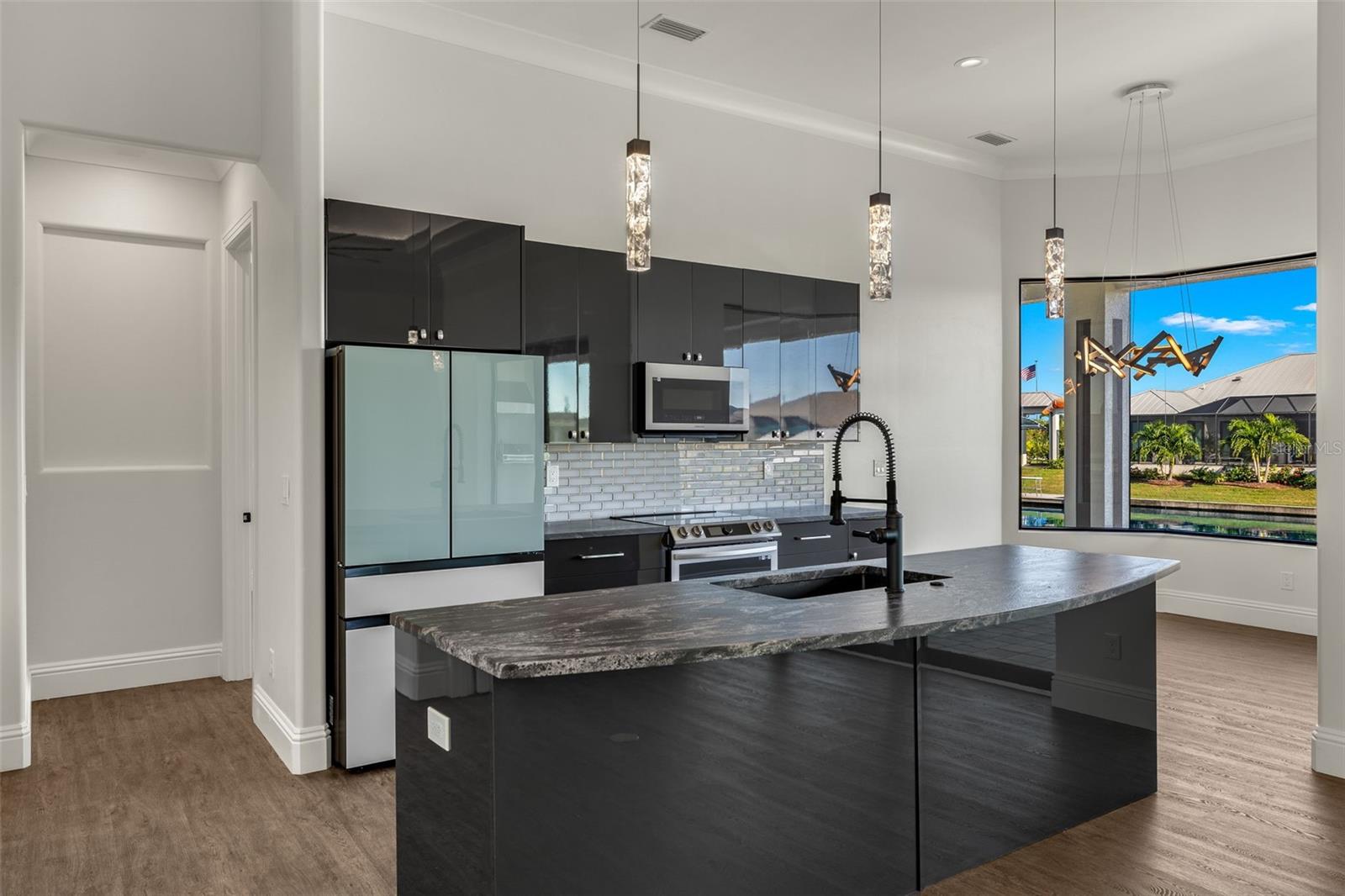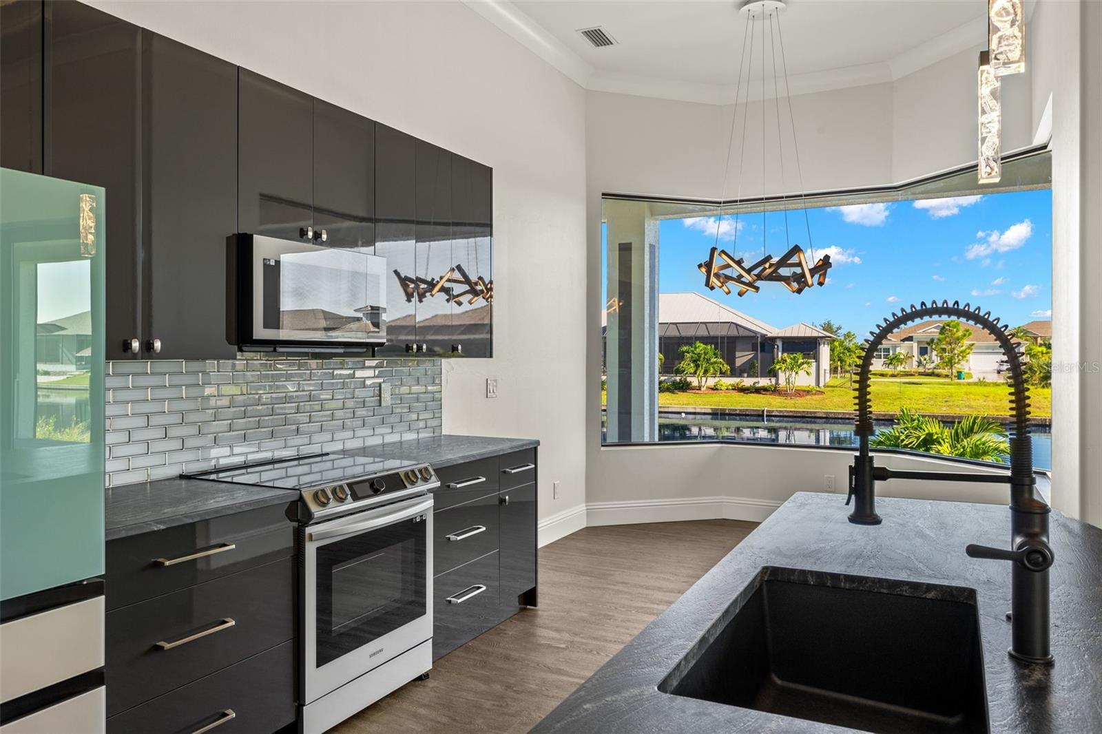 Motivated Seller Bring Offers. Seller Pays Closing Costs. Imagine waking up every day in a stunning coastal retreat that seamlessly blends modern luxury with Florida's natural beauty. This unique custom home, nestled in the peaceful South Gulf Cove community, offers an unparalleled lifestyle with sailboat access to the Myakka River and Gulf of Mexico. A well thought out floorplan comes complete with a private courtyard pool ready for your personal touch to transform it into your own oasis. As you approach the property, you'll be struck by its elegant design and tropical landscaping. Step inside and prepare to be amazed. The expansive living area greets you with soaring ceilings adorned with decorative wood beams and crown molding. Custom light fixtures and indirect lighting create a warm ambiance, while impact-rated, noise-dampening windows flood the space with natural light. The heart of this home is its stunning modern kitchen. Entertaining is a joy with top-of-the-line Samsung appliances, sleek European-style cabinets, and leathered granite countertops. A large pantry provides ample storage, while a massive bay window offers breathtaking waterfront views. Outdoor living is a breeze with the thoughtfully designed lanai. Accessible through main pocket sliders, this space features a full outdoor kitchen complete with a mini-fridge, granite counters, a grill with a full range hood, and an island bar with a sink. It's the perfect spot for al fresco dining or simply relaxing after a day on the water. Retreat to your primary suite, a true oasis of comfort. The primary bedroom boasts decorative crown molding with indirect lighting accents, while the primary bathroom features a built-in wardrobe closet, dual sinks, and a spacious rain shower. This home is not just beautiful; it's built to last. Impact and roll-down hurricane protection on the back lanai, along with other robust features, ensure your peace of mind during storm season. Additional features include a large study, indoor laundry with Samsung washer and dryer, epoxy coated garage floor with impact/insulated garage door, tankless water heater, solid core designer interior doors, multi zone irrigation system, and full gutters. This property offers more than just a home; it's a lifestyle. With its perfect blend of indoor comfort and outdoor living, it's your opportunity to enjoy resort-style luxury every day. Don't miss your chance to make this coastal modern masterpiece your own.