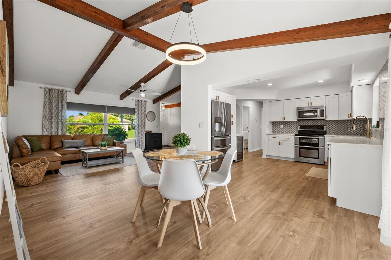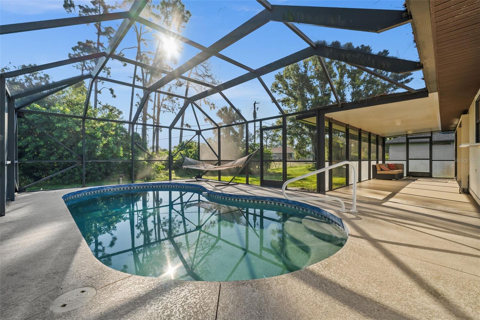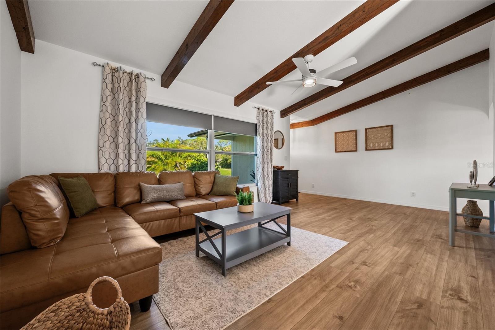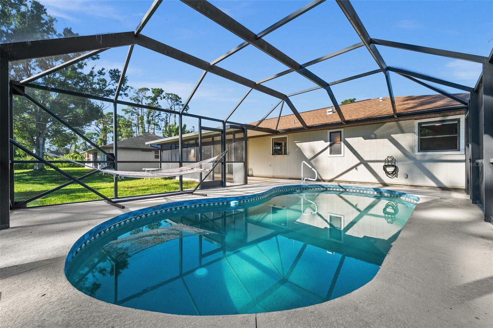 This beautifully updated home is filled with thoughtful upgrades and design features. As you enter, you'll immediately notice the higher ceilings with decorative wood beams, adding a touch of warmth and character. A brand-new roof was installed in September 2023, and the home was fully replumbed with a ManaBloc system in 2018 for added peace of mind. All appliances, including the washer and dryer, are included. The remodeled kitchen boasts a breakfast bar and opens to both the dining area and the lanai/pool, making it an ideal space for entertaining. The primary suite includes two closets—one of which is a walk-in—and an en-suite bath with a double vanity and a walk-in shower. The guest bathroom features a versatile tub/shower combo. Outside, you'll find a large, screened lanai and pool, perfect for enjoying Florida living. The home is surrounded by mature landscaping and a spacious, private backyard, great for family gatherings or gardening. Additional highlights include laminate flooring, a 2-car garage, a water heater replaced in 2018, and an A/C unit that was installed in 2014 and serviced in 2018. This home perfectly combines charm, modern updates, and comfort!