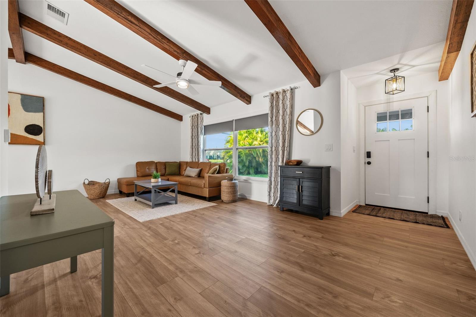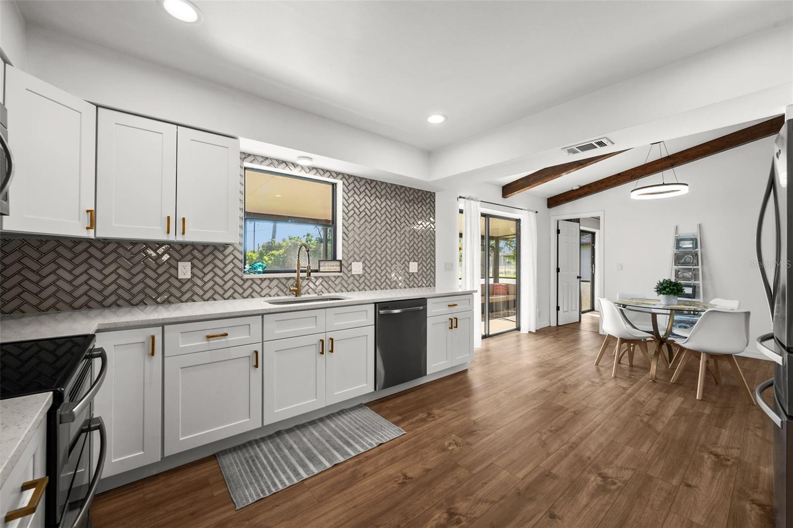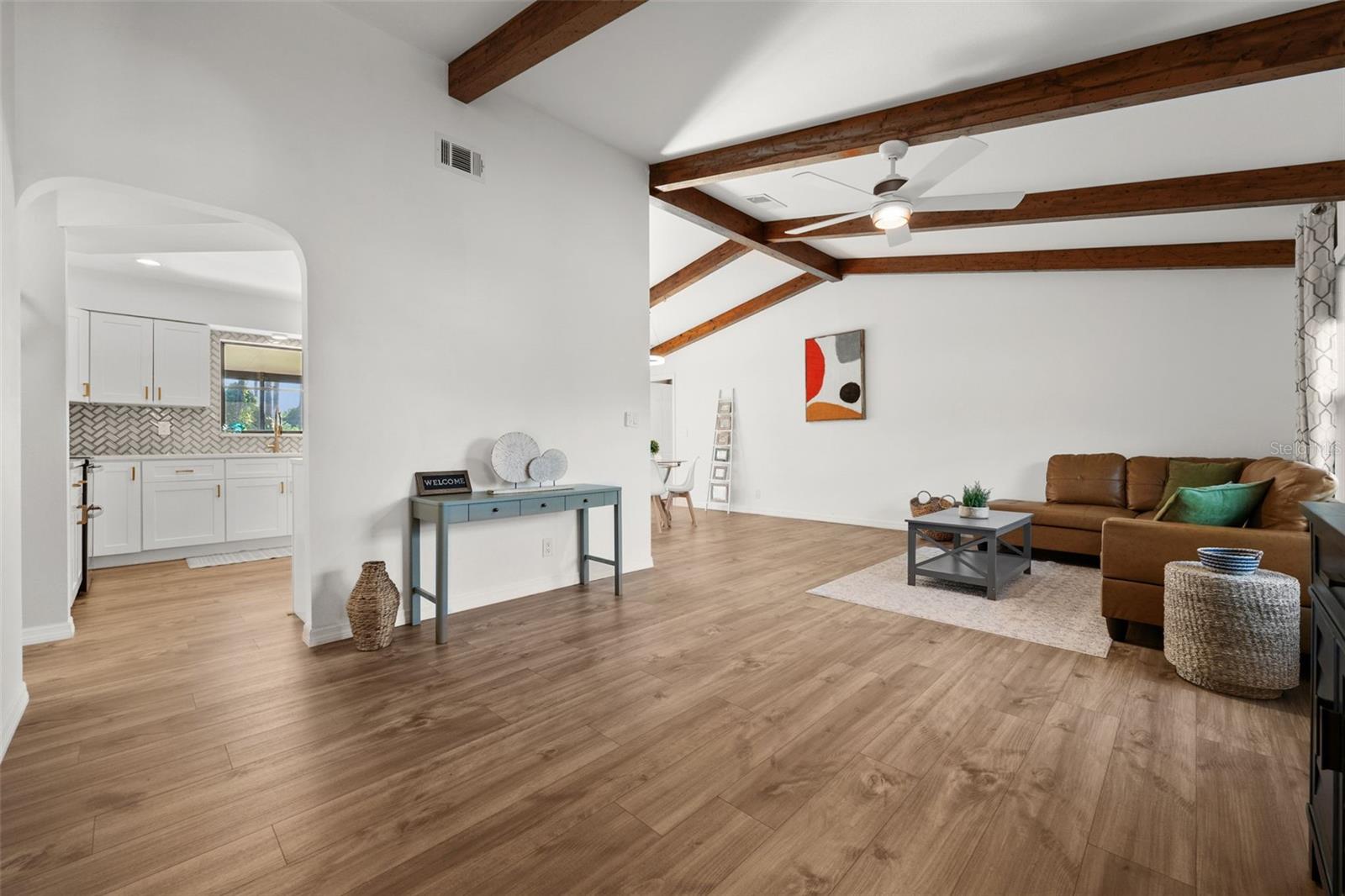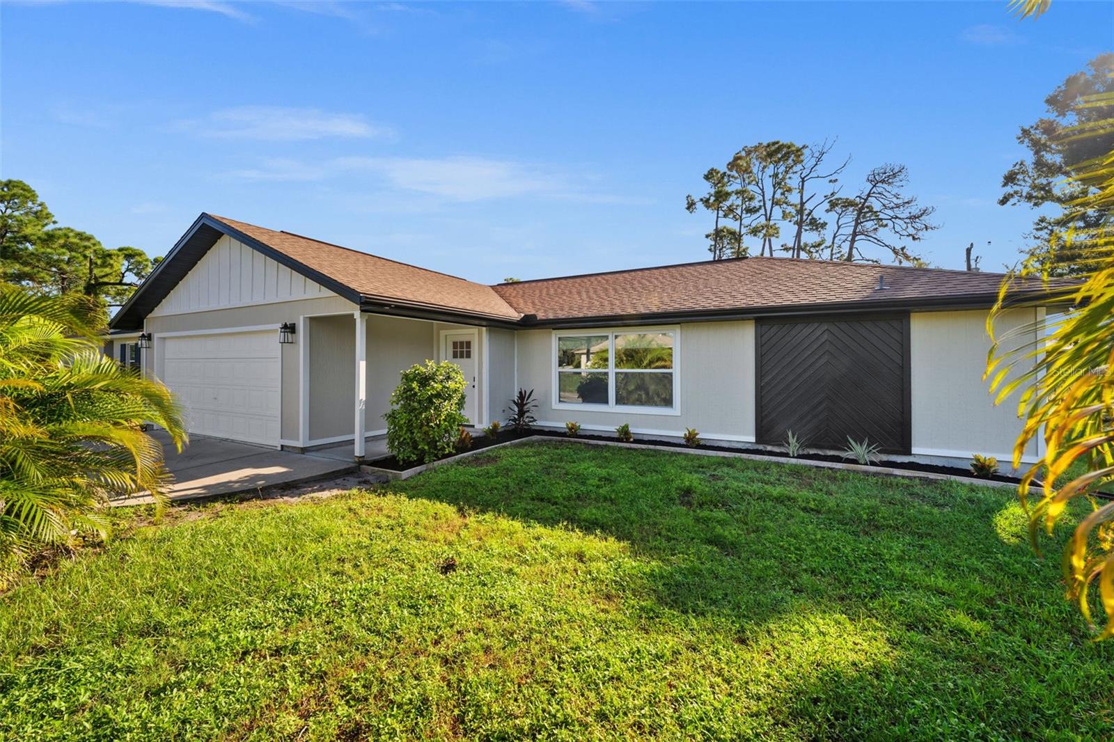 This beautifully updated home is filled with thoughtful upgrades and design features. As you enter, you'll immediately notice the higher ceilings with decorative wood beams, adding a touch of warmth and character. A brand-new roof was installed in September 2023, and the home was fully replumbed with a ManaBloc system in 2018 for added peace of mind. All appliances, including the washer and dryer, are included. The remodeled kitchen boasts a breakfast bar and opens to both the dining area and the lanai/pool, making it an ideal space for entertaining. The primary suite includes two closets—one of which is a walk-in—and an en-suite bath with a double vanity and a walk-in shower. The guest bathroom features a versatile tub/shower combo. Outside, you'll find a large, screened lanai and pool, perfect for enjoying Florida living. The home is surrounded by mature landscaping and a spacious, private backyard, great for family gatherings or gardening. Additional highlights include laminate flooring, a 2-car garage, a water heater replaced in 2018, and an A/C unit that was installed in 2014 and serviced in 2018. This home perfectly combines charm, modern updates, and comfort!