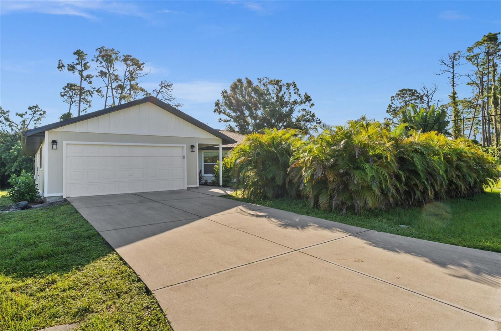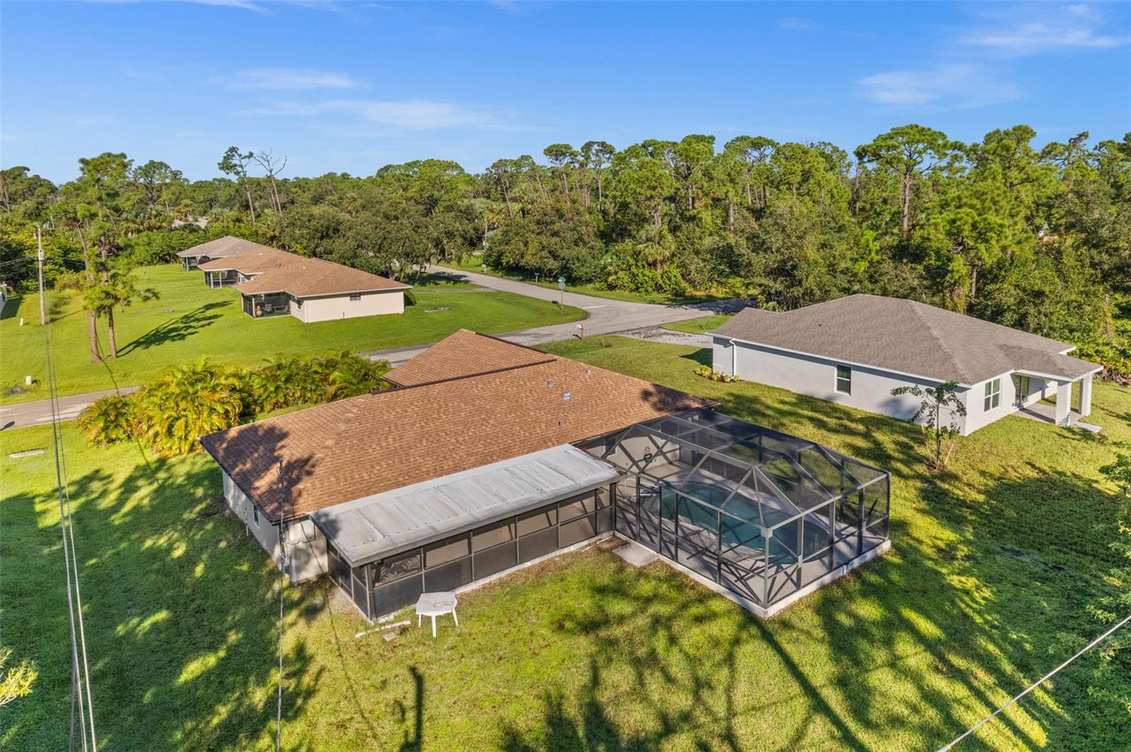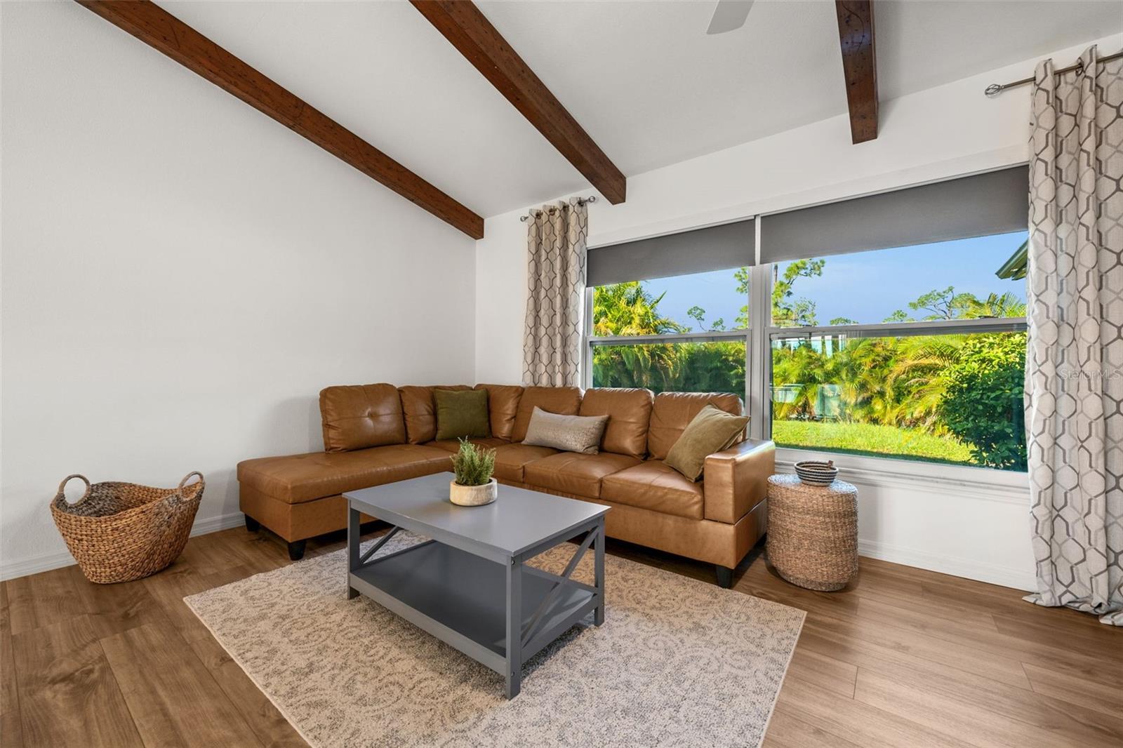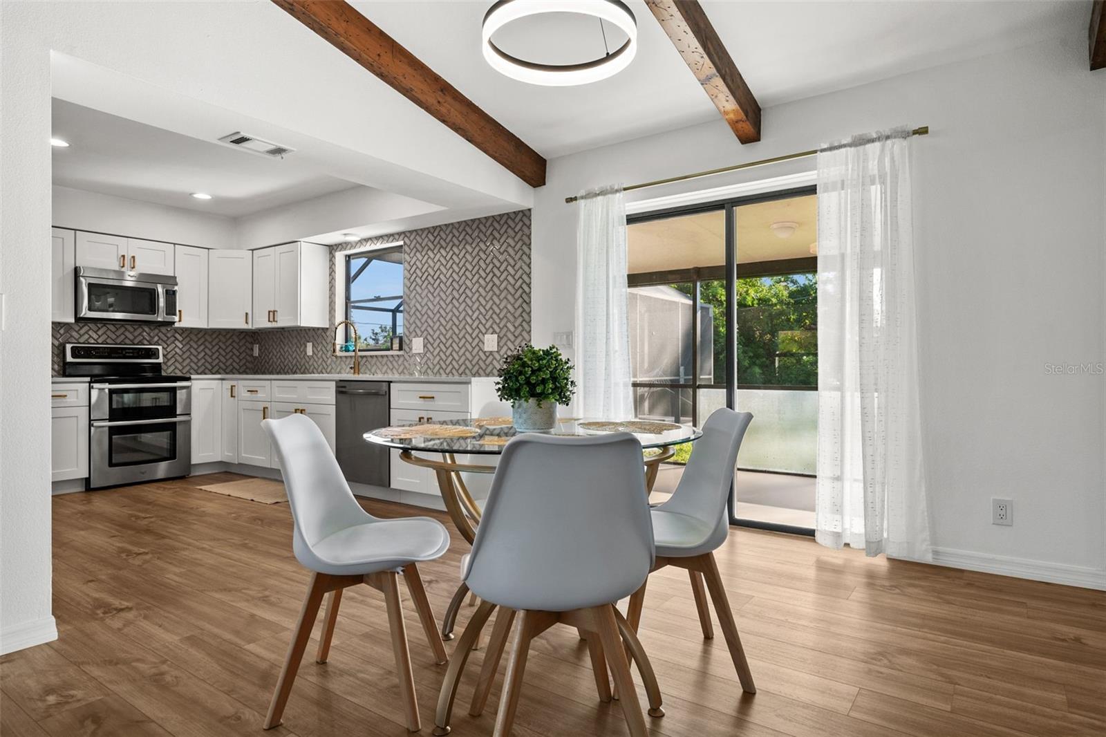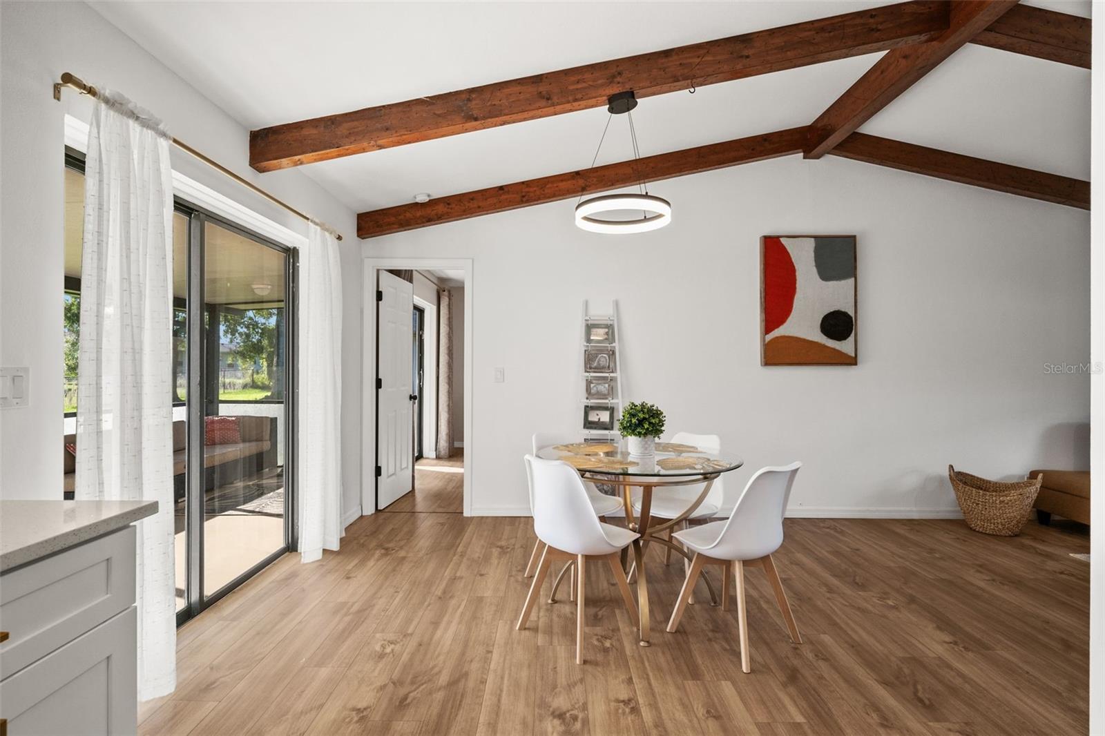 This beautifully updated home is filled with thoughtful upgrades and design features. As you enter, you'll immediately notice the higher ceilings with decorative wood beams, adding a touch of warmth and character. A brand-new roof was installed in September 2023, and the home was fully replumbed with a ManaBloc system in 2018 for added peace of mind. All appliances, including the washer and dryer, are included. The remodeled kitchen boasts a breakfast bar and opens to both the dining area and the lanai/pool, making it an ideal space for entertaining. The primary suite includes two closets—one of which is a walk-in—and an en-suite bath with a double vanity and a walk-in shower. The guest bathroom features a versatile tub/shower combo. Outside, you'll find a large, screened lanai and pool, perfect for enjoying Florida living. The home is surrounded by mature landscaping and a spacious, private backyard, great for family gatherings or gardening. Additional highlights include laminate flooring, a 2-car garage, a water heater replaced in 2018, and an A/C unit that was installed in 2014 and serviced in 2018. This home perfectly combines charm, modern updates, and comfort!