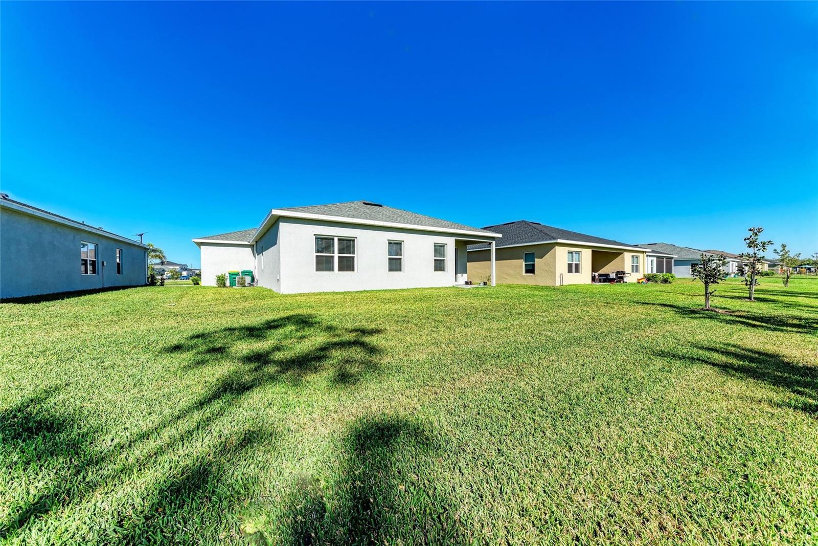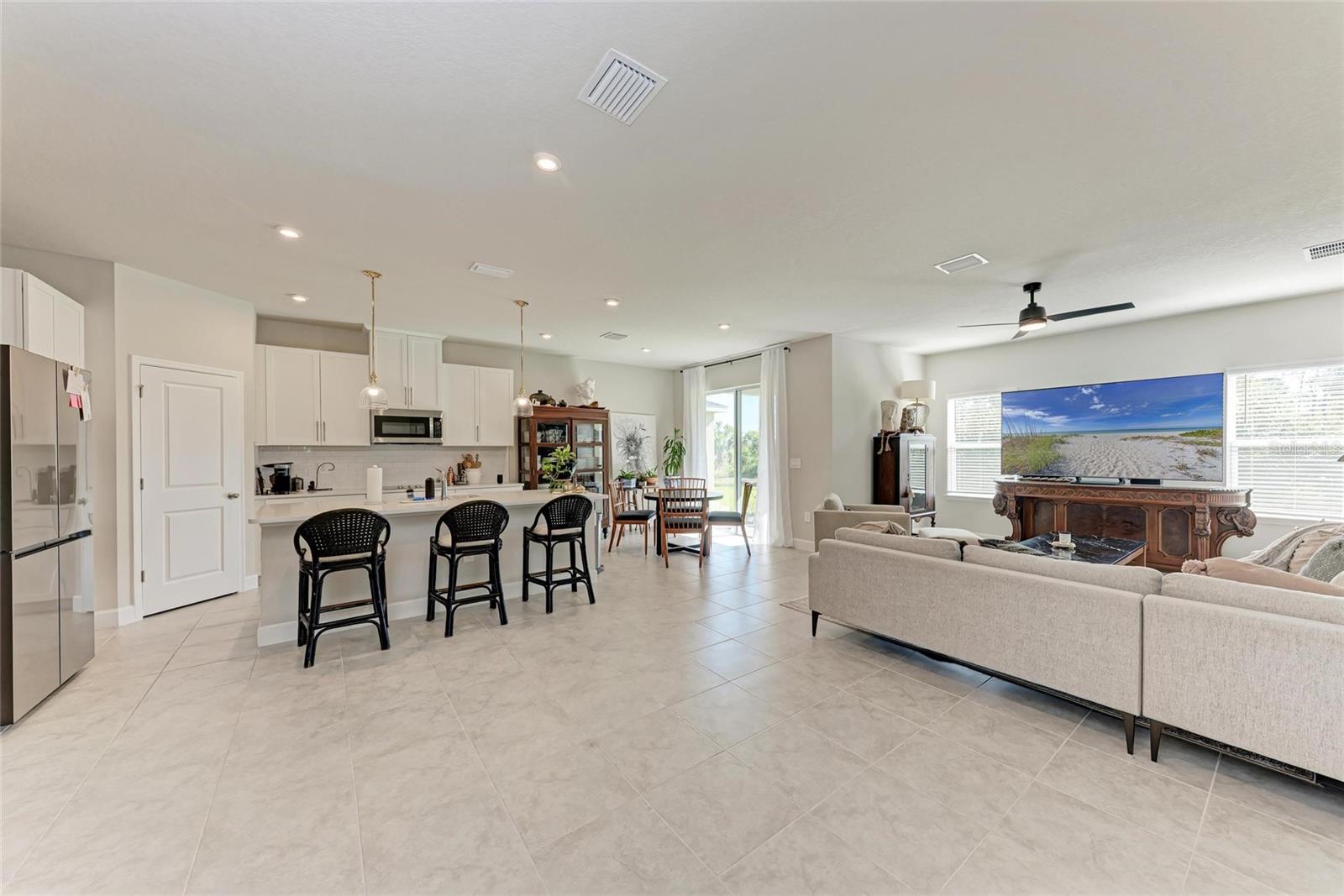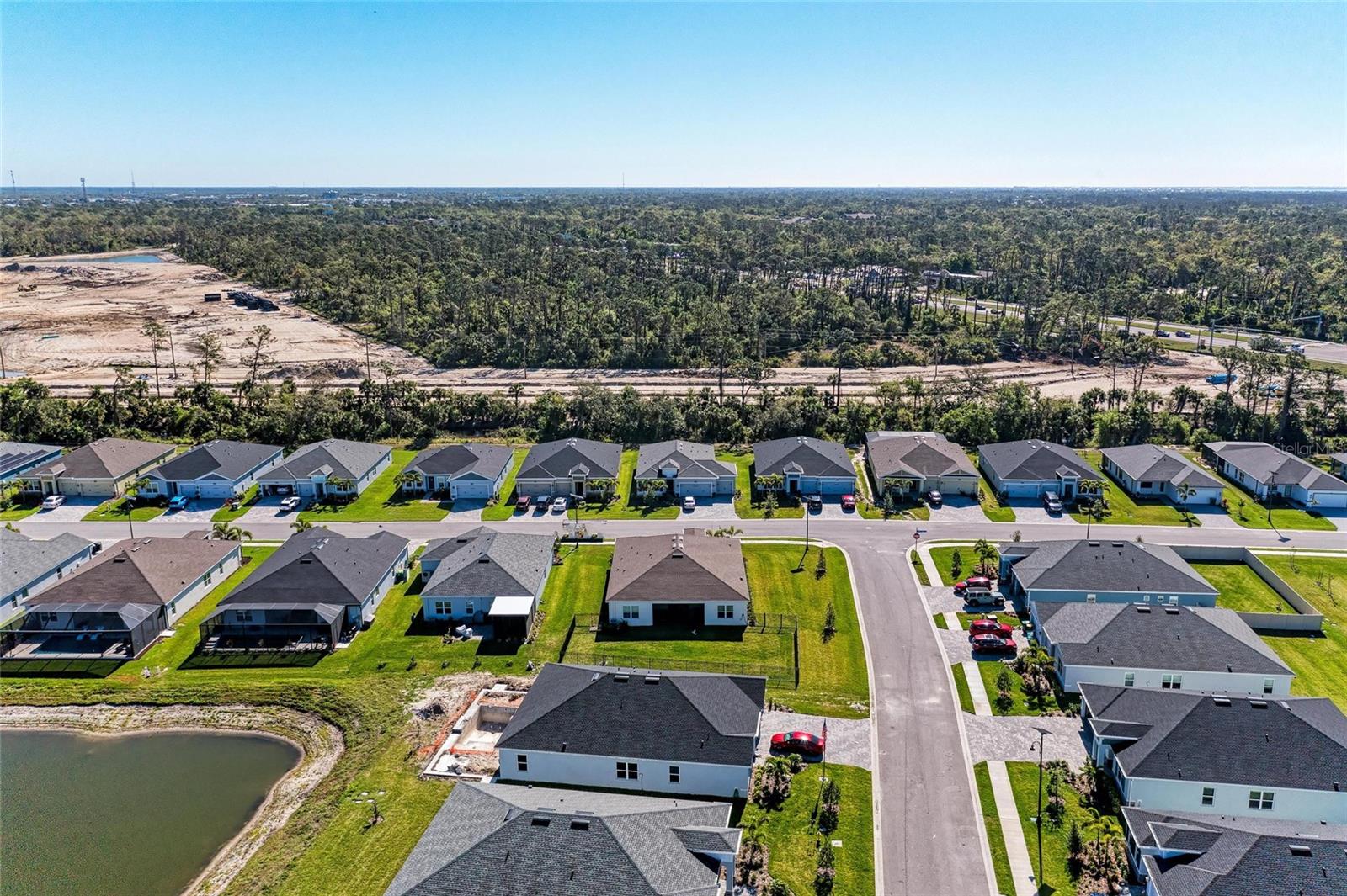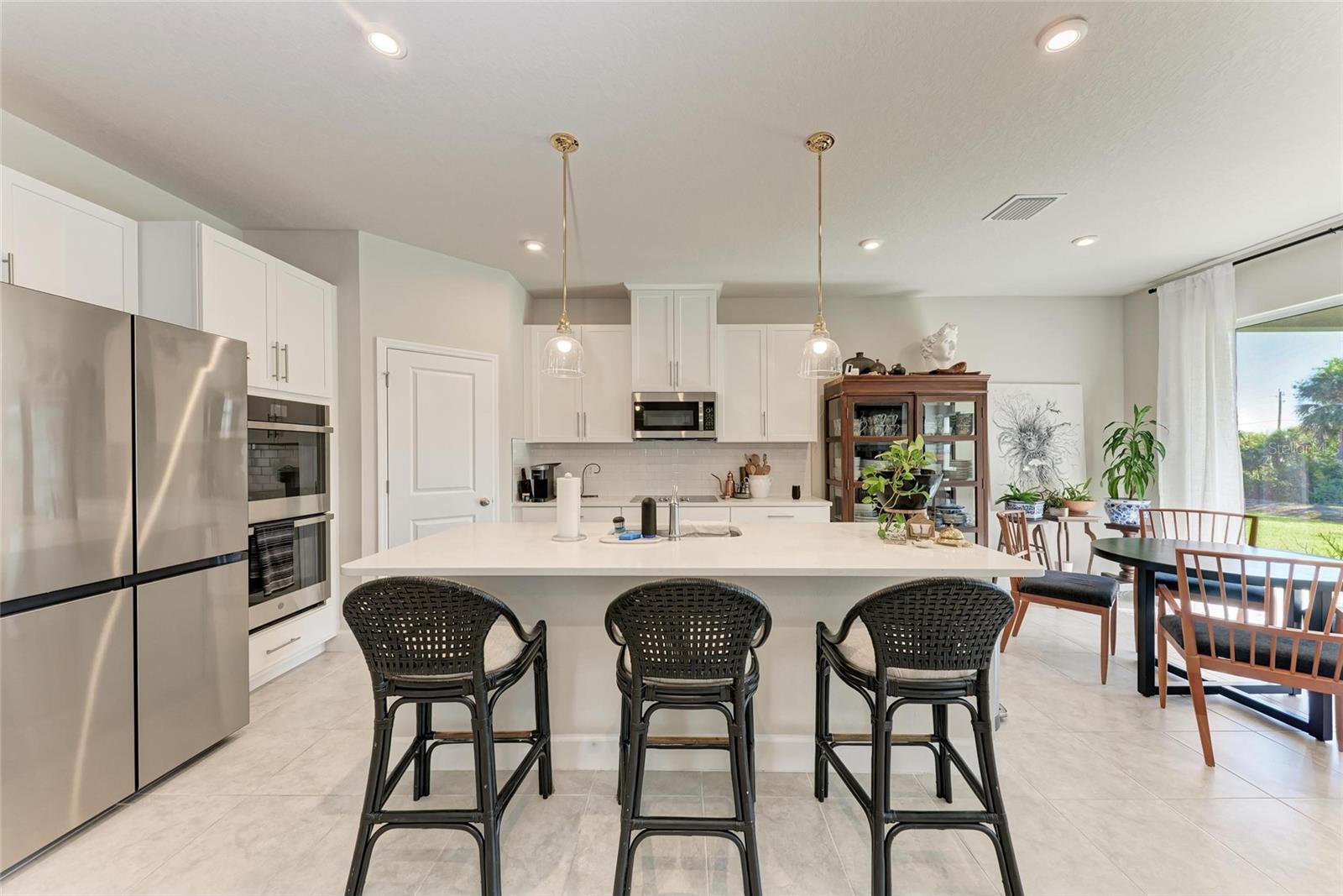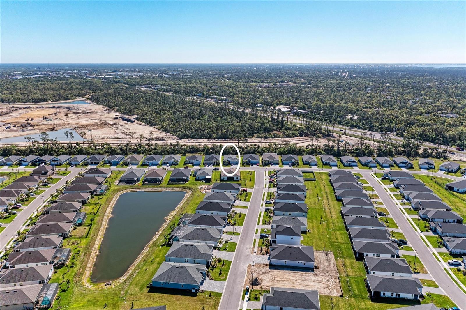 Welcome to this newly built Ryan model home, a perfect blend of modern design and relaxed Florida living in the sought-after West Port community. Constructed in 2024, this meticulously designed 3-bedroom, 2-bathroom residence with a 3-car garage offers all the advantages of new construction, paired with an inviting and functional layout. From the moment you arrive, the home's tasteful design is evident, featuring neutral colors, recessed lighting, and tile flooring throughout. The open-concept living, dining, and kitchen areas provide a seamless flow, all enhanced by recessed lighting for a bright and welcoming ambiance. The kitchen is equipped with modern appliances, including a Samsung refrigerator and a double oven, catering to all culinary needs. A spacious kitchen island adds additional seating and functionality, making it an ideal space for gatherings and everyday convenience. The adjacent dining area offers serene views of the backyard and direct access to the outdoors through sliding glass doors, allowing for effortless indoor-outdoor living. The primary bedroom serves as a tranquil retreat, featuring a generous walk-in closet and an en-suite bathroom with split vanities, ample cabinet space, above-mirror lighting, and a sleek walk-in shower. Two additional bedrooms provide plenty of space for family or guests, complete with upgraded closet storage for added convenience. A second full bathroom, mirroring the refined design of the primary bath, includes a double vanity and a tub with a shower. Additionally, a dedicated office space offers flexibility, easily adaptable to suit personal or professional needs. A separate laundry room, complete with a washer and dryer, enhances daily functionality, while the spacious three-car garage with an epoxy floor adds both modern appeal and practicality. At the back of the home, a covered and paved patio provides a peaceful outdoor space to relax and enjoy the surrounding tranquility. Adding to the appeal, this property is not in a flood zone and features a low HOA fee, offering both peace of mind and affordability. The location places Centennial Park and Recreation Center just minutes away, where residents can enjoy over 100 acres of outdoor and indoor activities, including a 50-meter competition lap pool, multi-purpose gymnasium with basketball and volleyball courts, pickleball, soccer fields, an 18-hole disc golf course, a fishing lake, playgrounds, and scenic nature trails. With Charlotte Harbor just a short drive away, along with nearby parks, shopping at Port Charlotte Town Center just three miles from home, and easy access to beautiful Gulf beaches, this exceptional property offers the perfect balance of convenience and embodies the best of Florida living.