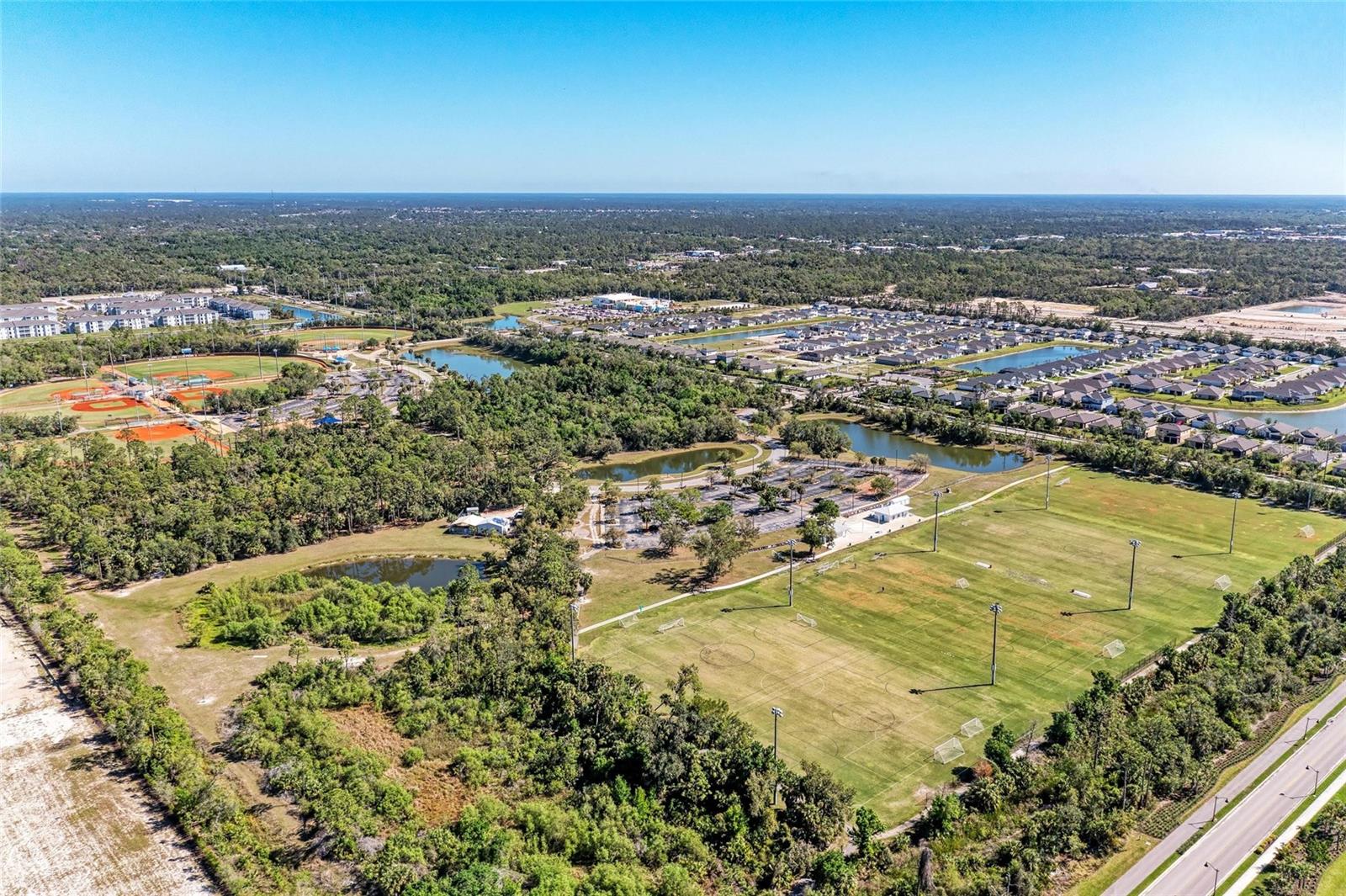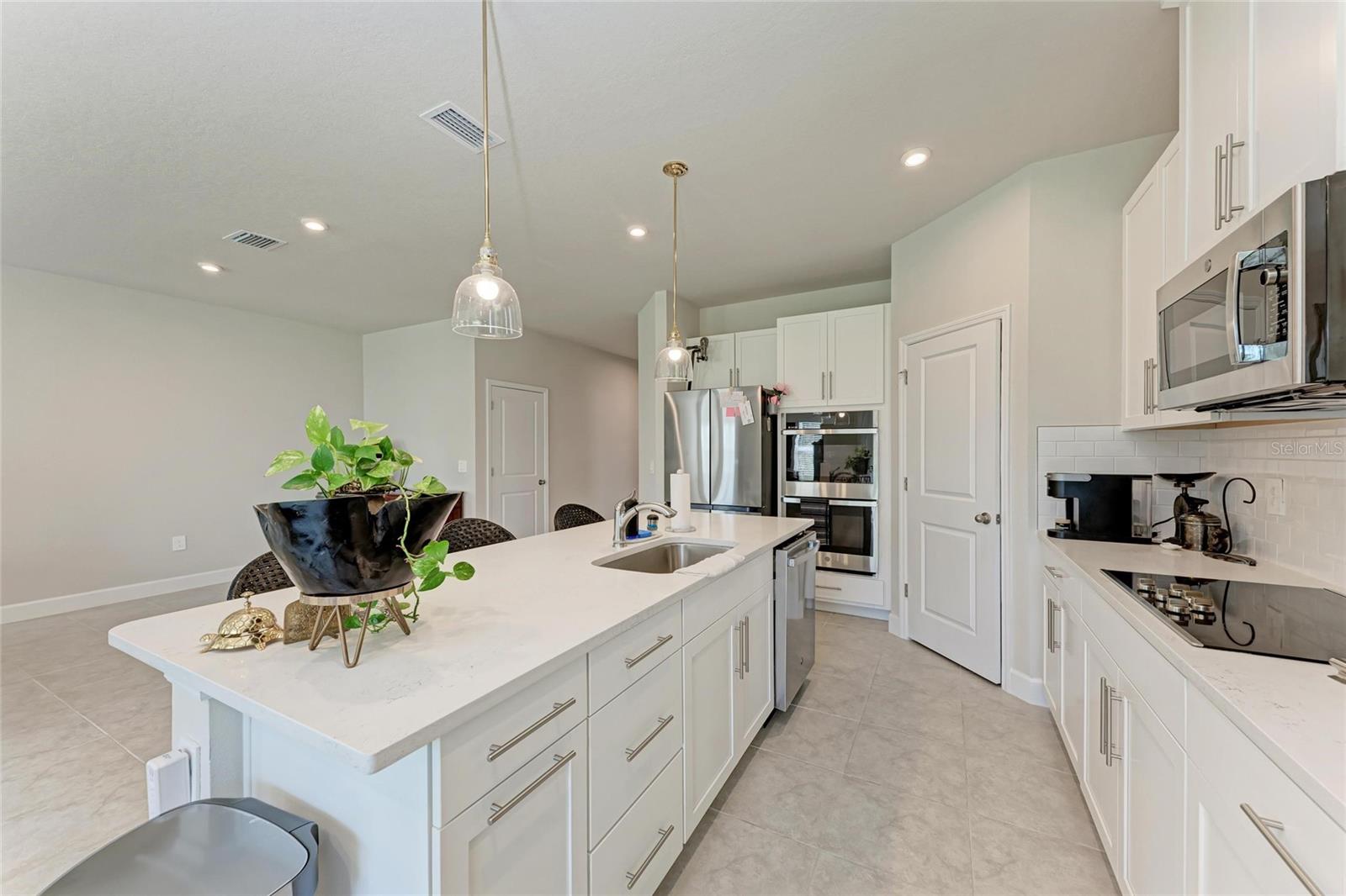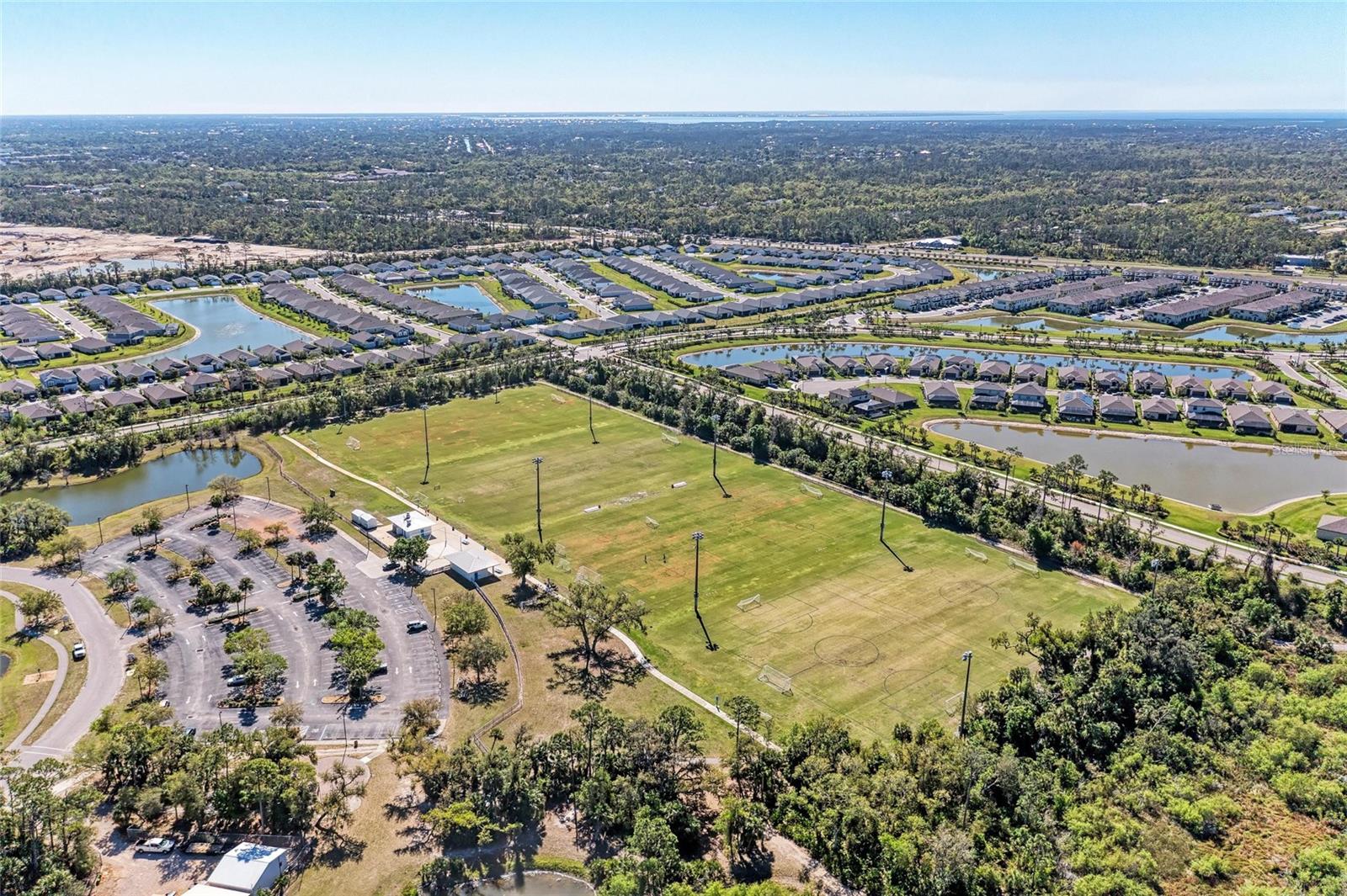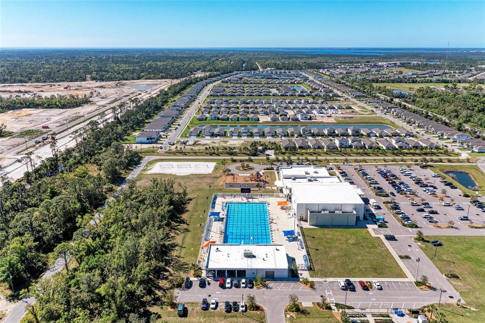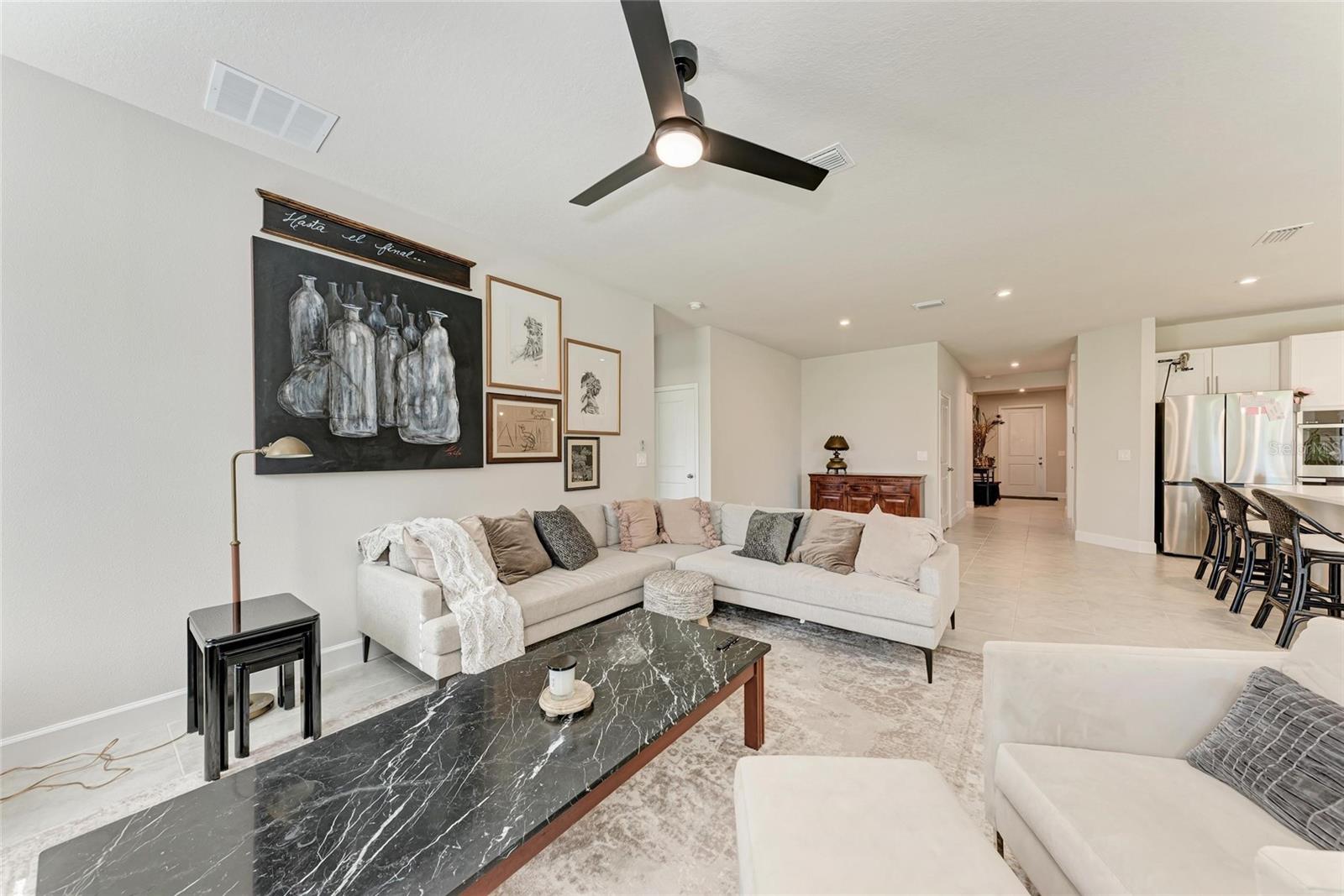 Welcome to this newly built Ryan model home, a perfect blend of modern design and relaxed Florida living in the sought-after West Port community. Constructed in 2024, this meticulously designed 3-bedroom, 2-bathroom residence with a 3-car garage offers all the advantages of new construction, paired with an inviting and functional layout. From the moment you arrive, the home's tasteful design is evident, featuring neutral colors, recessed lighting, and tile flooring throughout. The open-concept living, dining, and kitchen areas provide a seamless flow, all enhanced by recessed lighting for a bright and welcoming ambiance. The kitchen is equipped with modern appliances, including a Samsung refrigerator and a double oven, catering to all culinary needs. A spacious kitchen island adds additional seating and functionality, making it an ideal space for gatherings and everyday convenience. The adjacent dining area offers serene views of the backyard and direct access to the outdoors through sliding glass doors, allowing for effortless indoor-outdoor living. The primary bedroom serves as a tranquil retreat, featuring a generous walk-in closet and an en-suite bathroom with split vanities, ample cabinet space, above-mirror lighting, and a sleek walk-in shower. Two additional bedrooms provide plenty of space for family or guests, complete with upgraded closet storage for added convenience. A second full bathroom, mirroring the refined design of the primary bath, includes a double vanity and a tub with a shower. Additionally, a dedicated office space offers flexibility, easily adaptable to suit personal or professional needs. A separate laundry room, complete with a washer and dryer, enhances daily functionality, while the spacious three-car garage with an epoxy floor adds both modern appeal and practicality. At the back of the home, a covered and paved patio provides a peaceful outdoor space to relax and enjoy the surrounding tranquility. Adding to the appeal, this property is not in a flood zone and features a low HOA fee, offering both peace of mind and affordability. The location places Centennial Park and Recreation Center just minutes away, where residents can enjoy over 100 acres of outdoor and indoor activities, including a 50-meter competition lap pool, multi-purpose gymnasium with basketball and volleyball courts, pickleball, soccer fields, an 18-hole disc golf course, a fishing lake, playgrounds, and scenic nature trails. With Charlotte Harbor just a short drive away, along with nearby parks, shopping at Port Charlotte Town Center just three miles from home, and easy access to beautiful Gulf beaches, this exceptional property offers the perfect balance of convenience and embodies the best of Florida living.