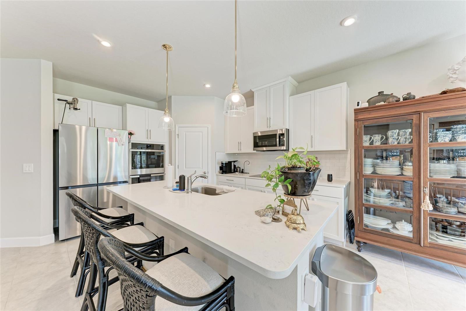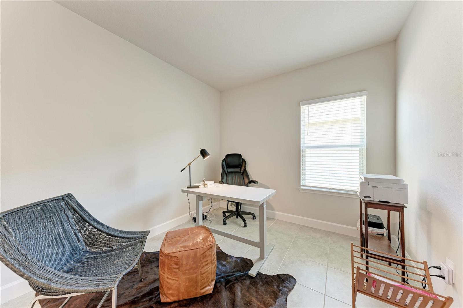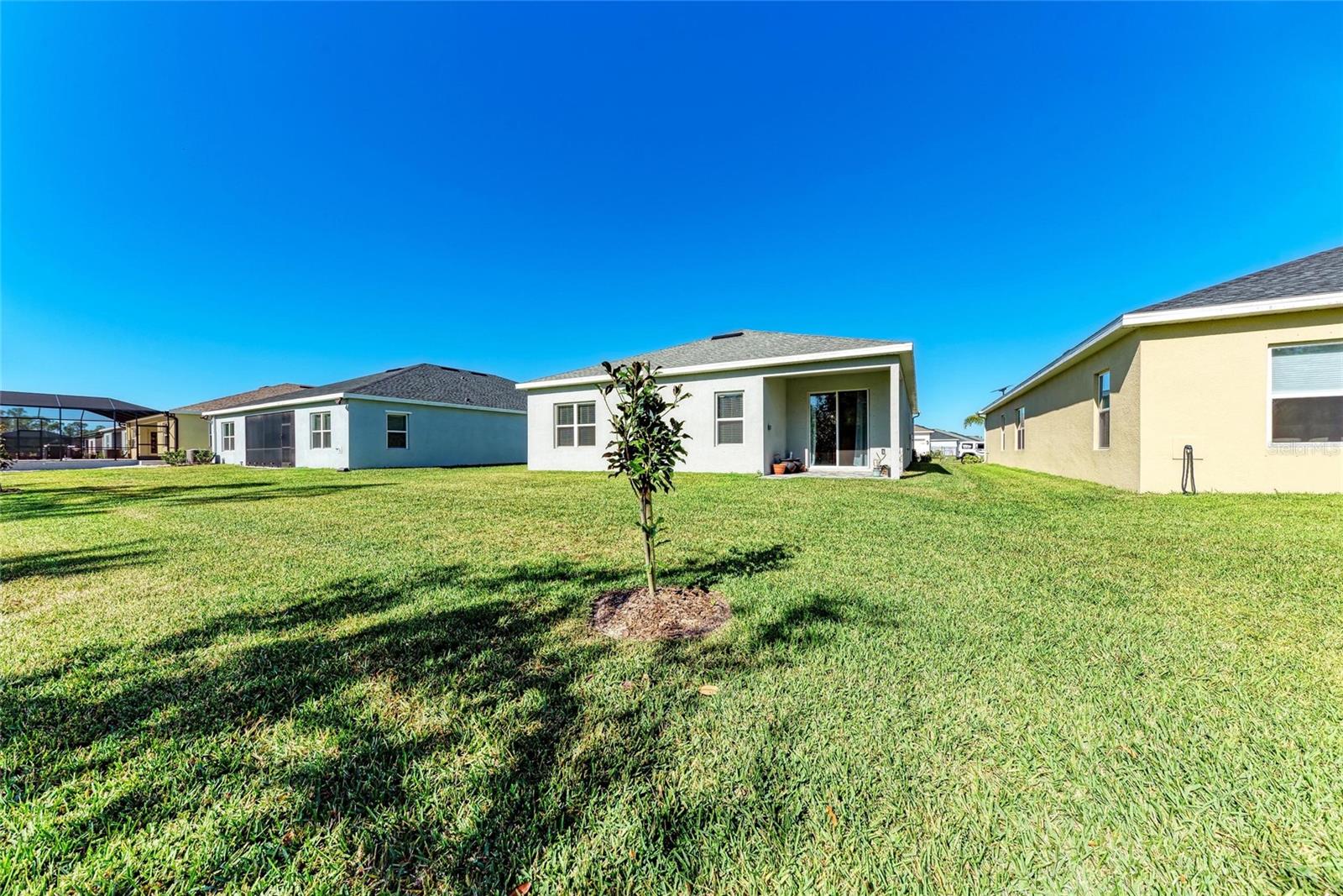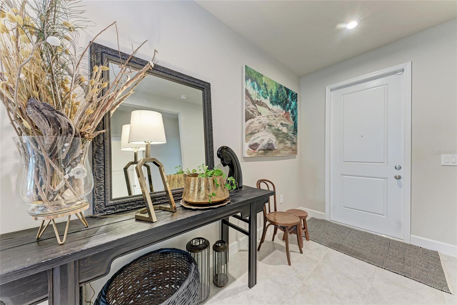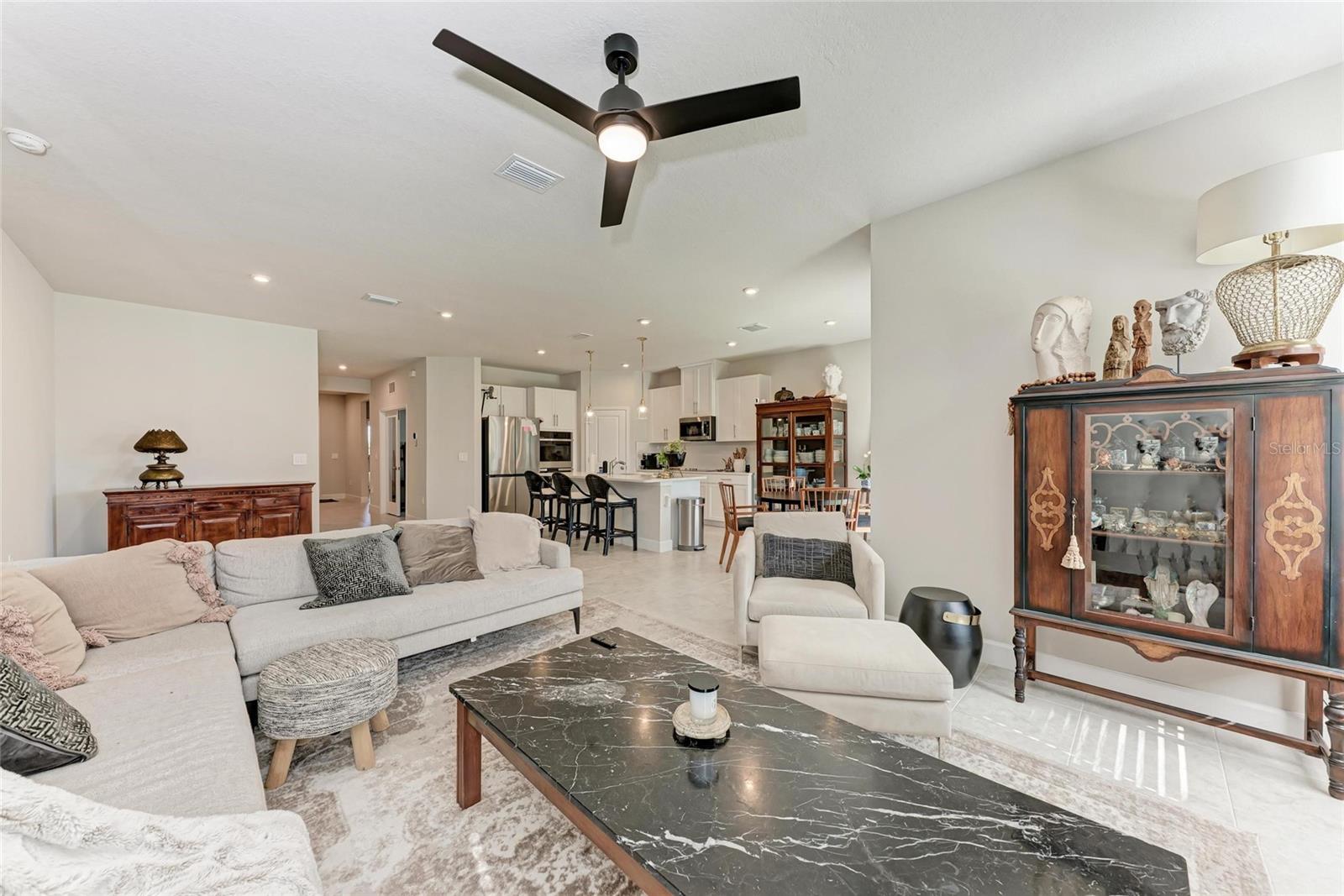 Welcome to this newly built Ryan model home, a perfect blend of modern design and relaxed Florida living in the sought-after West Port community. Constructed in 2024, this meticulously designed 3-bedroom, 2-bathroom residence with a 3-car garage offers all the advantages of new construction, paired with an inviting and functional layout. From the moment you arrive, the home's tasteful design is evident, featuring neutral colors, recessed lighting, and tile flooring throughout. The open-concept living, dining, and kitchen areas provide a seamless flow, all enhanced by recessed lighting for a bright and welcoming ambiance. The kitchen is equipped with modern appliances, including a Samsung refrigerator and a double oven, catering to all culinary needs. A spacious kitchen island adds additional seating and functionality, making it an ideal space for gatherings and everyday convenience. The adjacent dining area offers serene views of the backyard and direct access to the outdoors through sliding glass doors, allowing for effortless indoor-outdoor living. The primary bedroom serves as a tranquil retreat, featuring a generous walk-in closet and an en-suite bathroom with split vanities, ample cabinet space, above-mirror lighting, and a sleek walk-in shower. Two additional bedrooms provide plenty of space for family or guests, complete with upgraded closet storage for added convenience. A second full bathroom, mirroring the refined design of the primary bath, includes a double vanity and a tub with a shower. Additionally, a dedicated office space offers flexibility, easily adaptable to suit personal or professional needs. A separate laundry room, complete with a washer and dryer, enhances daily functionality, while the spacious three-car garage with an epoxy floor adds both modern appeal and practicality. At the back of the home, a covered and paved patio provides a peaceful outdoor space to relax and enjoy the surrounding tranquility. Adding to the appeal, this property is not in a flood zone and features a low HOA fee, offering both peace of mind and affordability. The location places Centennial Park and Recreation Center just minutes away, where residents can enjoy over 100 acres of outdoor and indoor activities, including a 50-meter competition lap pool, multi-purpose gymnasium with basketball and volleyball courts, pickleball, soccer fields, an 18-hole disc golf course, a fishing lake, playgrounds, and scenic nature trails. With Charlotte Harbor just a short drive away, along with nearby parks, shopping at Port Charlotte Town Center just three miles from home, and easy access to beautiful Gulf beaches, this exceptional property offers the perfect balance of convenience and embodies the best of Florida living.