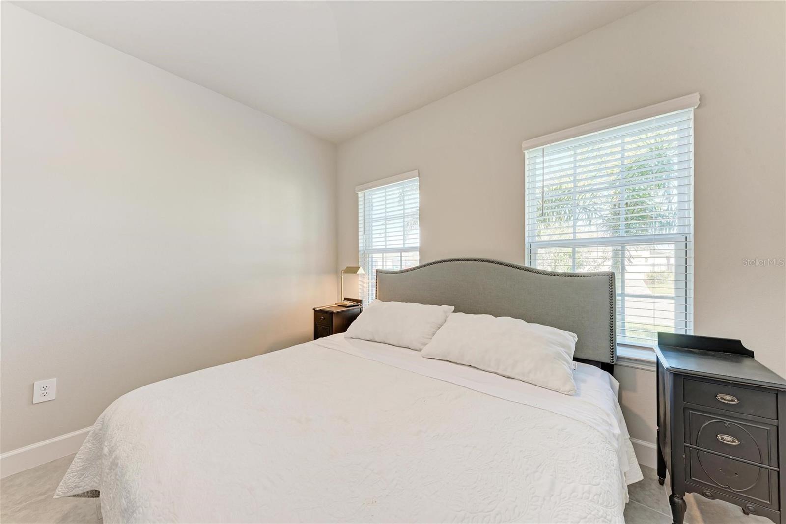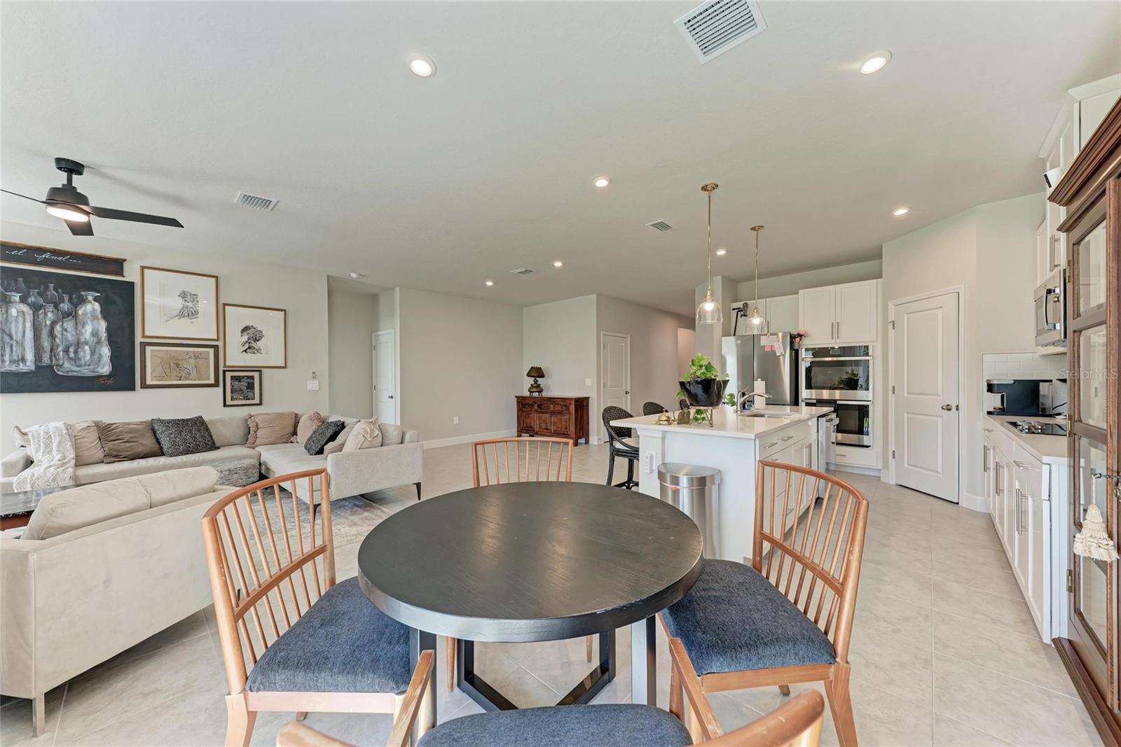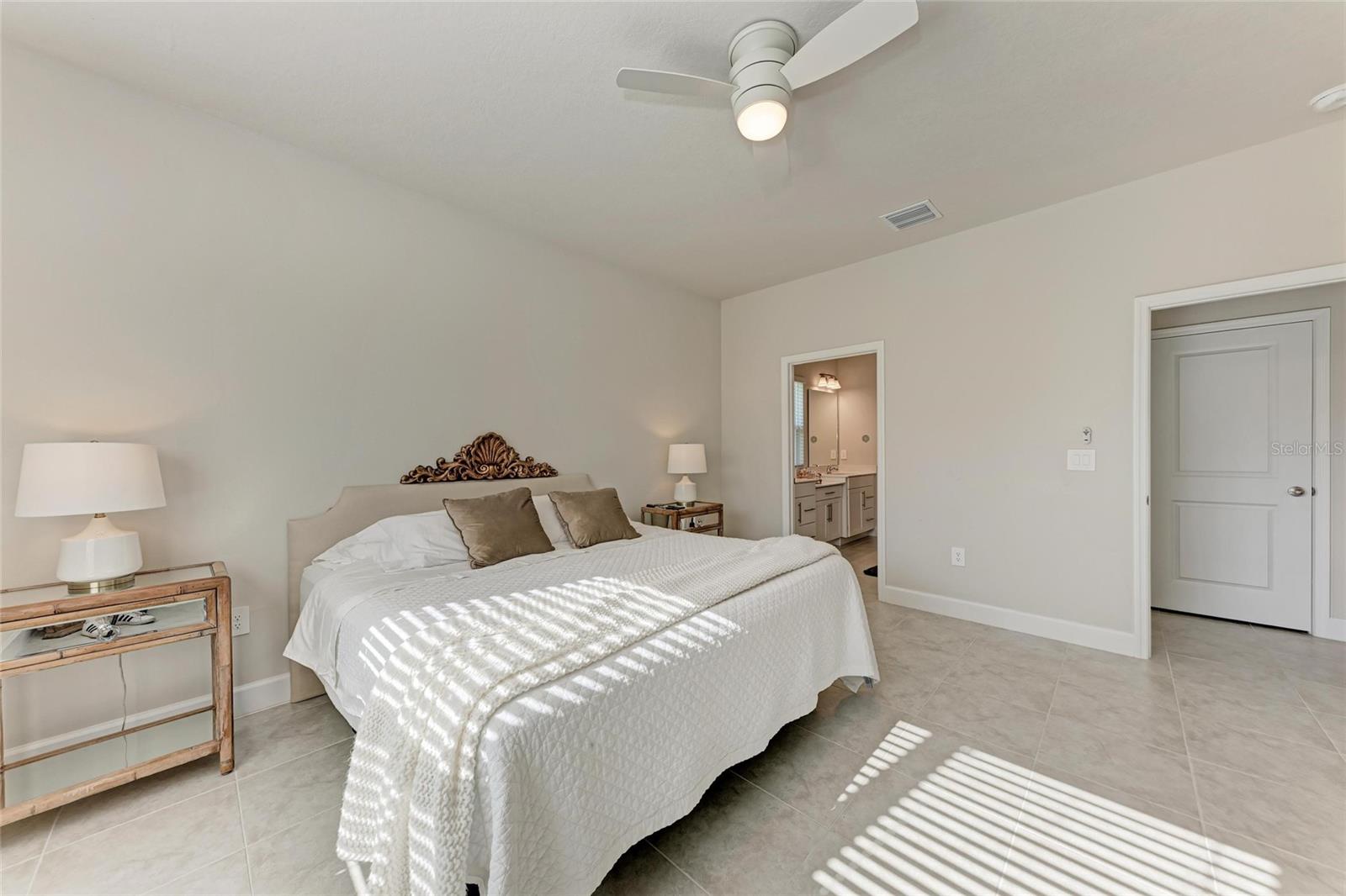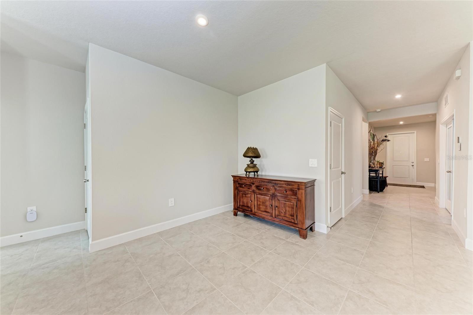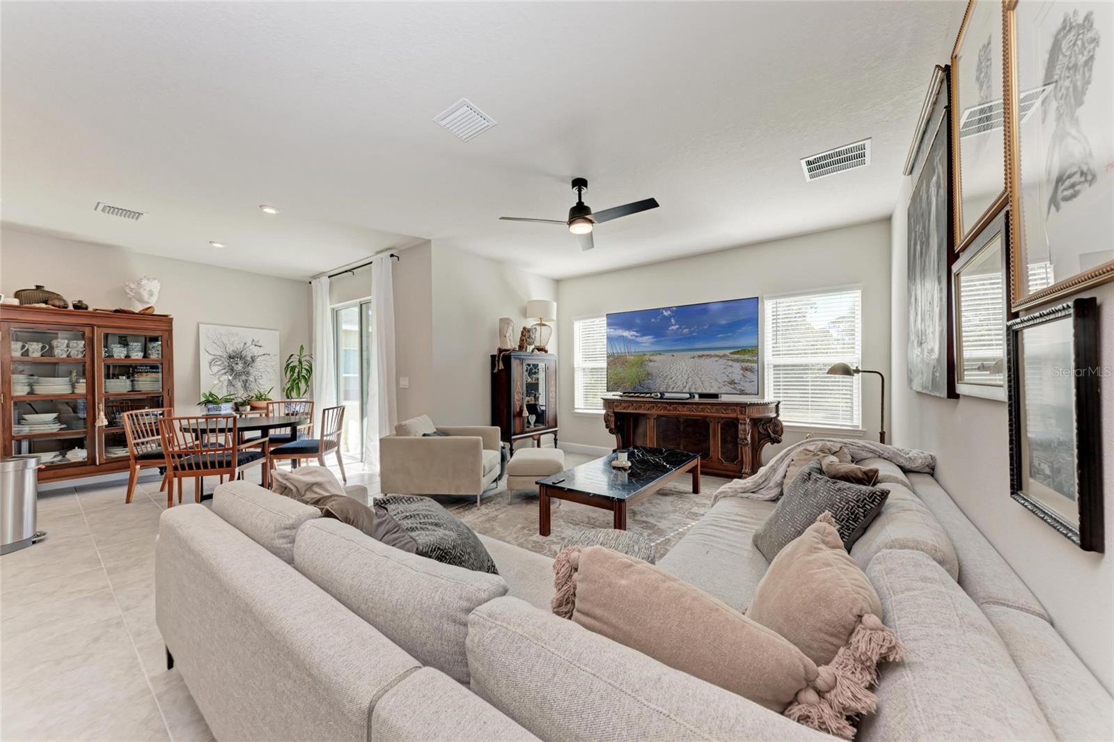 Welcome to this newly built Ryan model home, a perfect blend of modern design and relaxed Florida living in the sought-after West Port community. Constructed in 2024, this meticulously designed 3-bedroom, 2-bathroom residence with a 3-car garage offers all the advantages of new construction, paired with an inviting and functional layout. From the moment you arrive, the home's tasteful design is evident, featuring neutral colors, recessed lighting, and tile flooring throughout. The open-concept living, dining, and kitchen areas provide a seamless flow, all enhanced by recessed lighting for a bright and welcoming ambiance. The kitchen is equipped with modern appliances, including a Samsung refrigerator and a double oven, catering to all culinary needs. A spacious kitchen island adds additional seating and functionality, making it an ideal space for gatherings and everyday convenience. The adjacent dining area offers serene views of the backyard and direct access to the outdoors through sliding glass doors, allowing for effortless indoor-outdoor living. The primary bedroom serves as a tranquil retreat, featuring a generous walk-in closet and an en-suite bathroom with split vanities, ample cabinet space, above-mirror lighting, and a sleek walk-in shower. Two additional bedrooms provide plenty of space for family or guests, complete with upgraded closet storage for added convenience. A second full bathroom, mirroring the refined design of the primary bath, includes a double vanity and a tub with a shower. Additionally, a dedicated office space offers flexibility, easily adaptable to suit personal or professional needs. A separate laundry room, complete with a washer and dryer, enhances daily functionality, while the spacious three-car garage with an epoxy floor adds both modern appeal and practicality. At the back of the home, a covered and paved patio provides a peaceful outdoor space to relax and enjoy the surrounding tranquility. Adding to the appeal, this property is not in a flood zone and features a low HOA fee, offering both peace of mind and affordability. The location places Centennial Park and Recreation Center just minutes away, where residents can enjoy over 100 acres of outdoor and indoor activities, including a 50-meter competition lap pool, multi-purpose gymnasium with basketball and volleyball courts, pickleball, soccer fields, an 18-hole disc golf course, a fishing lake, playgrounds, and scenic nature trails. With Charlotte Harbor just a short drive away, along with nearby parks, shopping at Port Charlotte Town Center just three miles from home, and easy access to beautiful Gulf beaches, this exceptional property offers the perfect balance of convenience and embodies the best of Florida living.