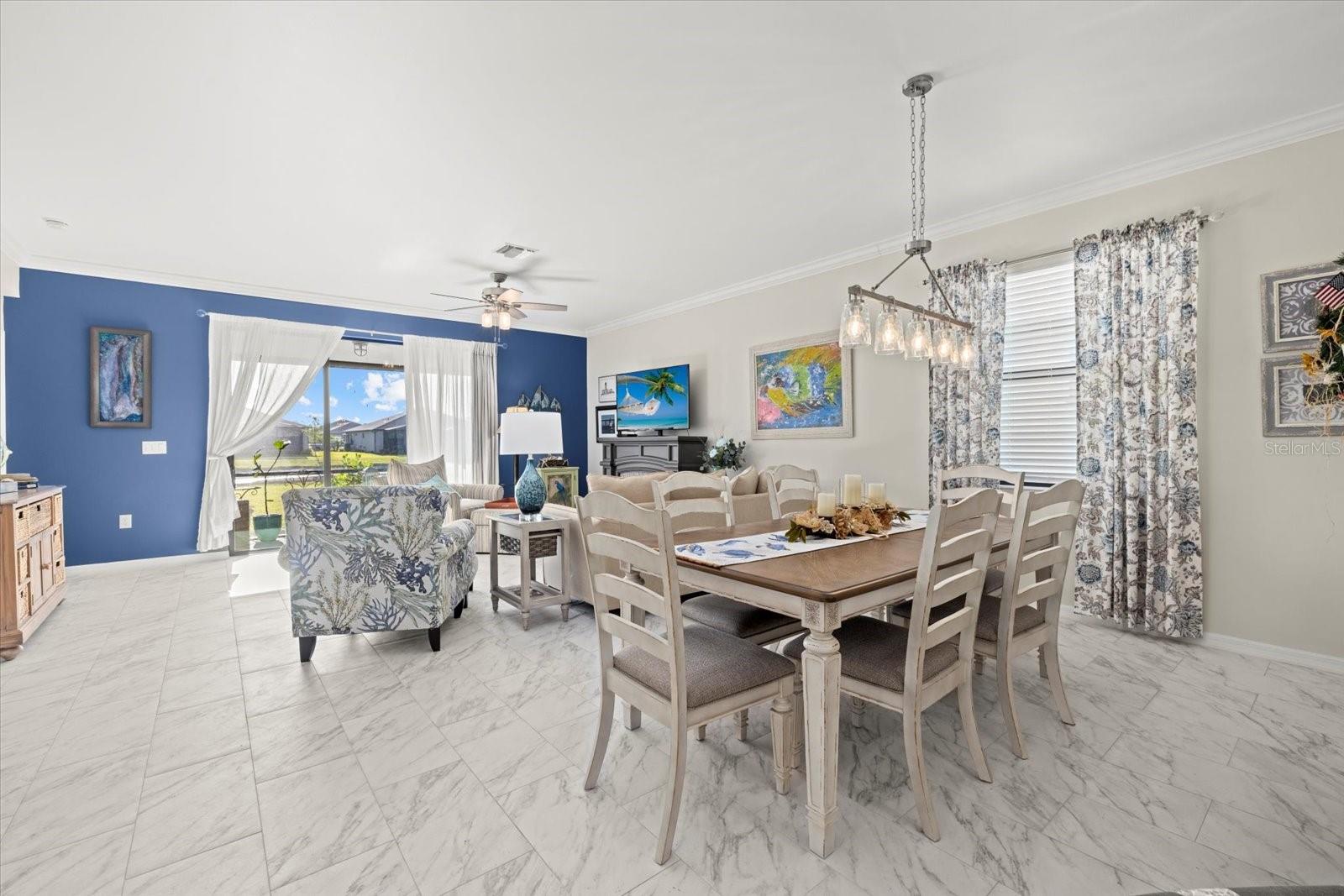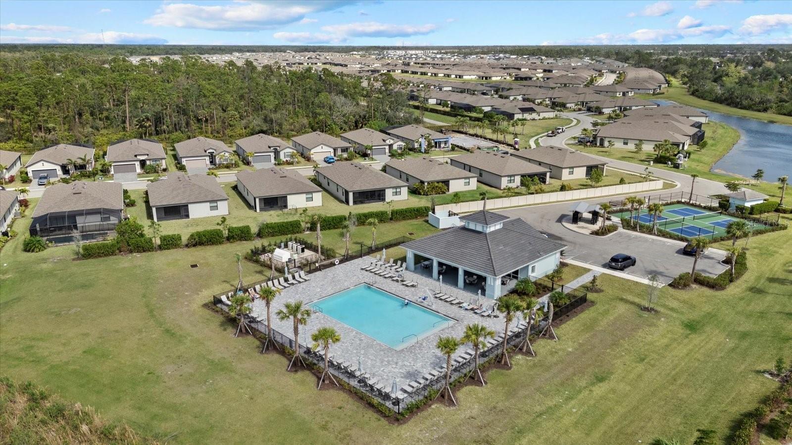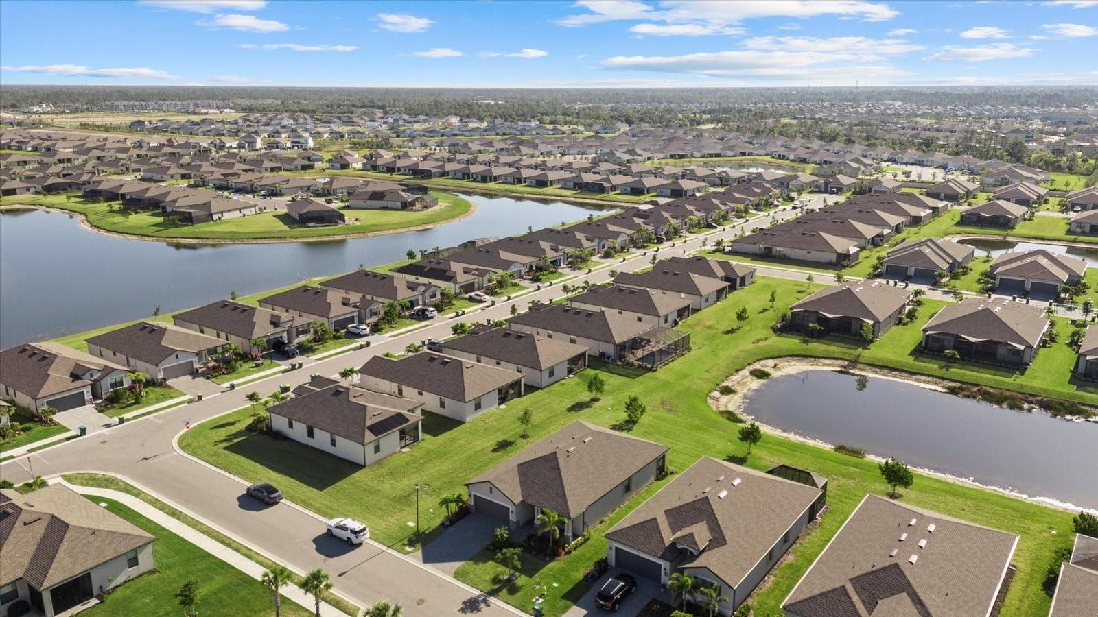 PRICE ADJUSTMENT!!! Beautifully update and upgraded newer 3 bedroom, 3 full baths home located in the desirable gated community of Biscayne Landing. This home is located on a wider, open side yard lot with lake water views behind. Approaching the covered entrance way, upon entering the foyer, you recognize the attention to detail and the light, bright feeling welcome you in. The home has an upgraded porcelain tile throughout the home except for the primary bedroom. The main living area of living, dining and kitchen all have high ceilings, crown molding and custom woodwork. The living area opens on to the screened and covered lanai by way of sliders that provide warm light and water views. The kitchen has an island dividing the area that offers a great sitting space for breakfast or a quick meal. The countertops are all granite and has an upgraded backsplash. The kitchen has a corner pantry, accent high cabinet lighting, ample prep and cooking space, custom lighting over the island, and to top it all off, an under counter (built-in) wine cooler. Perfect for the family chef. The home has a large primary bedroom and an ensuite bathroom. The bedroom has two walk-in closets, luxury carpet, crown molding and custom woodwork. The ensuite bath has a large double sink vanity with granite countertop and a spacious walk-in tiled shower, a commode closet and a linen closet. The split floor plan has two bedrooms and two full baths. The second bedroom has an ensuite bath with a single sink vanity and a tub/shower combination. The third bedroom has a full bath with single sink vanity and a tub/shower combination right outside of the room. The home has a laundry room with full size washer and dryer and overhead cabinets. The laundry room exits to the two-car garage with a deep well sink for those messy projects. The home has installed hurricane protection with accordion shutters on the windows and remote operated roll down shutters on the front door and the lanai. The front door has pull slide screen door for allowing those FL breezes to flow through. The community has a clubhouse with a fitness room, a heated swimming pool with sun deck, tennis and pickleball courts. The HOA does lawn care and basic cable and internet are provided. No CDD. No Flood Zone. The community is located close to shopping, restaurants, golf courses, local beaches and world class fishing, baseball spring training facilities, and entertainment venues. And convenient to multiple airports for travel. You need to see this home to appreciate all its beauty.