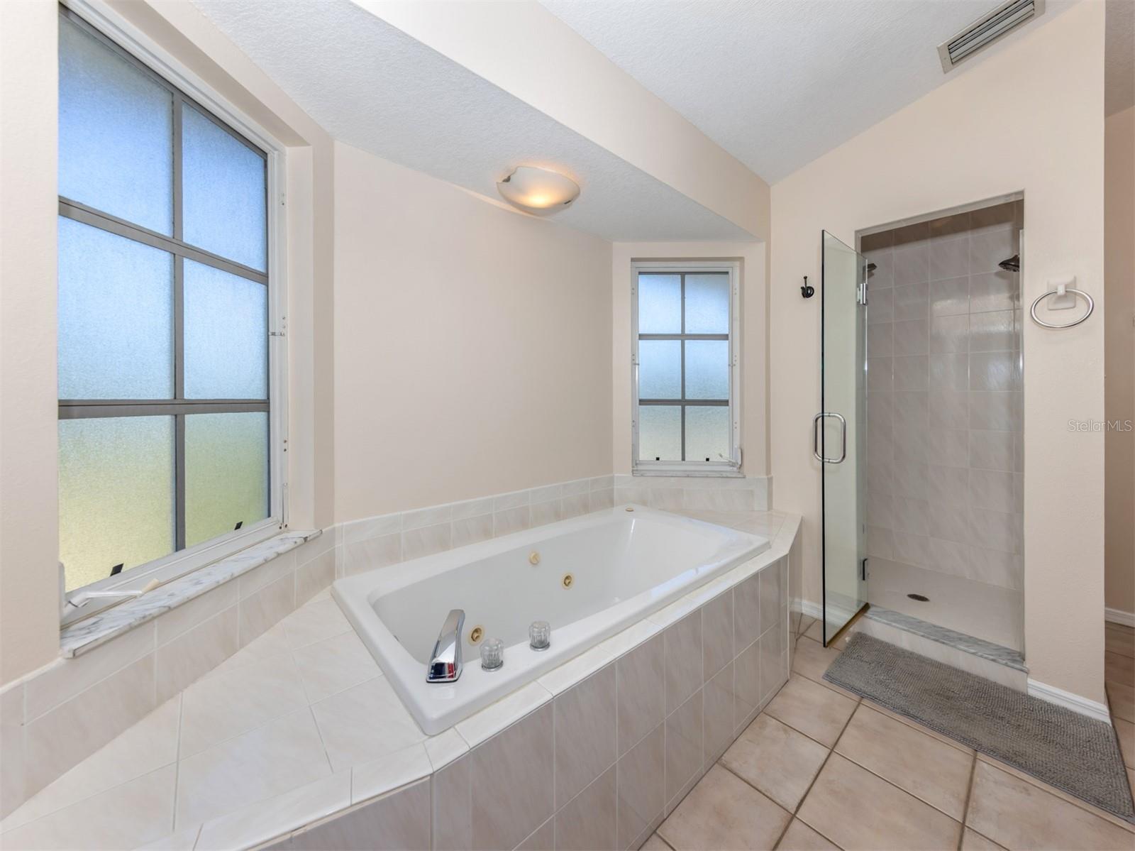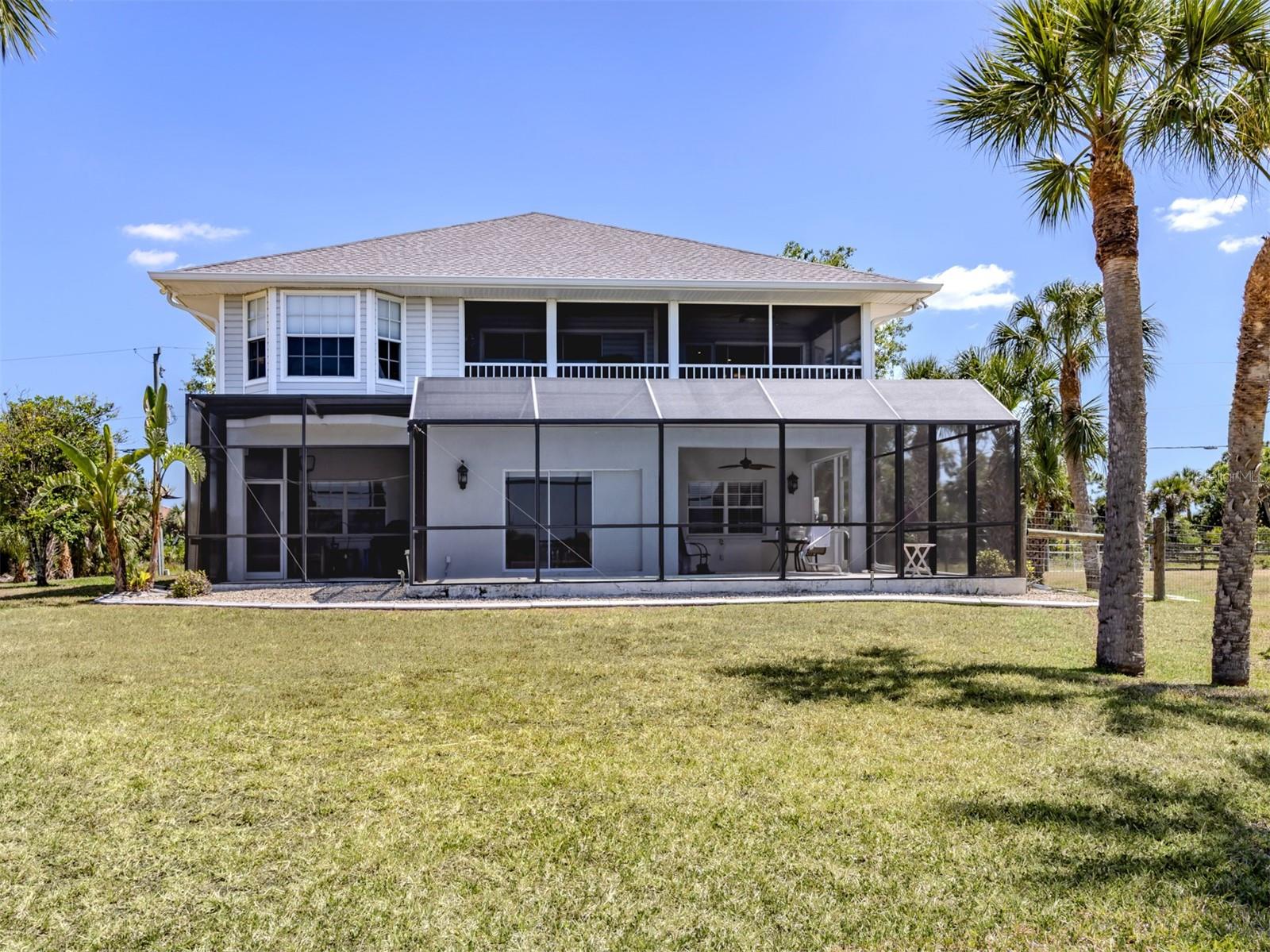 This stunning and extremely private 3-bedroom, 3-bathroom Key West-style home is a true gem, nestled on a beautifully landscaped triple lot with breathtaking, expansive water views. Located on a saltwater canal with 5-6 feet of water depth, the home features a private dock and a 10,000 lb boat lift installed in 2022, perfect for boating enthusiasts. A large 936 sq ft RV garage sits to the left, offering ample storage and a built-in workshop for any project. Step inside and be captivated by the panoramic water views from the living room, dining room, and primary bedroom. High cathedral ceilings, plantation shutters accentuate the airy and open feel, while transom windows allow for even more natural light. The spacious eat-in kitchen boasts solid surface countertops and solid wood cabinets, ideal for cooking and entertaining. The large screened-in deck overlooks your private pool and the 240 feet of waterfront, offering the perfect setting for relaxation and outdoor living. The primary bedroom suite is a retreat in itself, featuring an en suite bath with a luxurious jacuzzi tub, a separate shower with dual shower heads, and a walk-in closet with a stacked washer and dryer. On the lower level, you'll find a potential in-law suite with a third bedroom and bathroom, plus a sizable bonus room that opens directly to the pool area—perfect for guests or multi-generational living. Updates include a new roof in 2022, septic system in 2019, a whole-house R.O. system in 2021, a new pool cage in 2022, new tile floors on the first floor, and an updated AC unit from 2018. With its exceptional features and prime location, this home is truly one of a kind—a private oasis that promises luxurious living on the water.