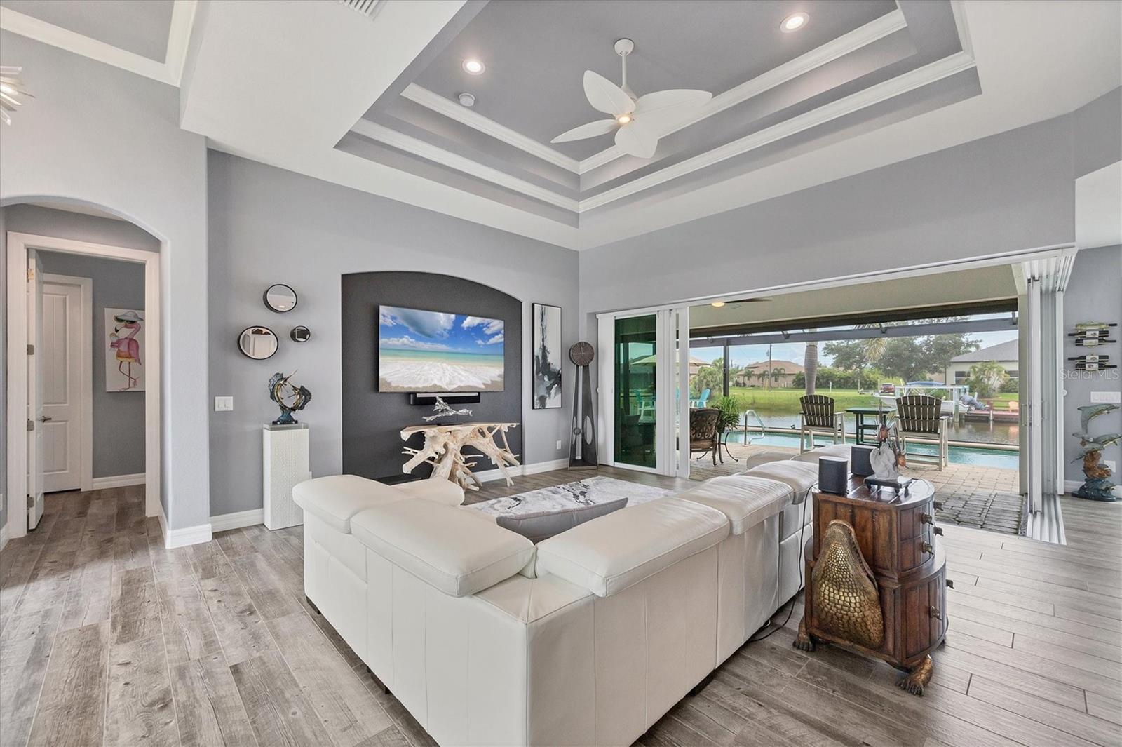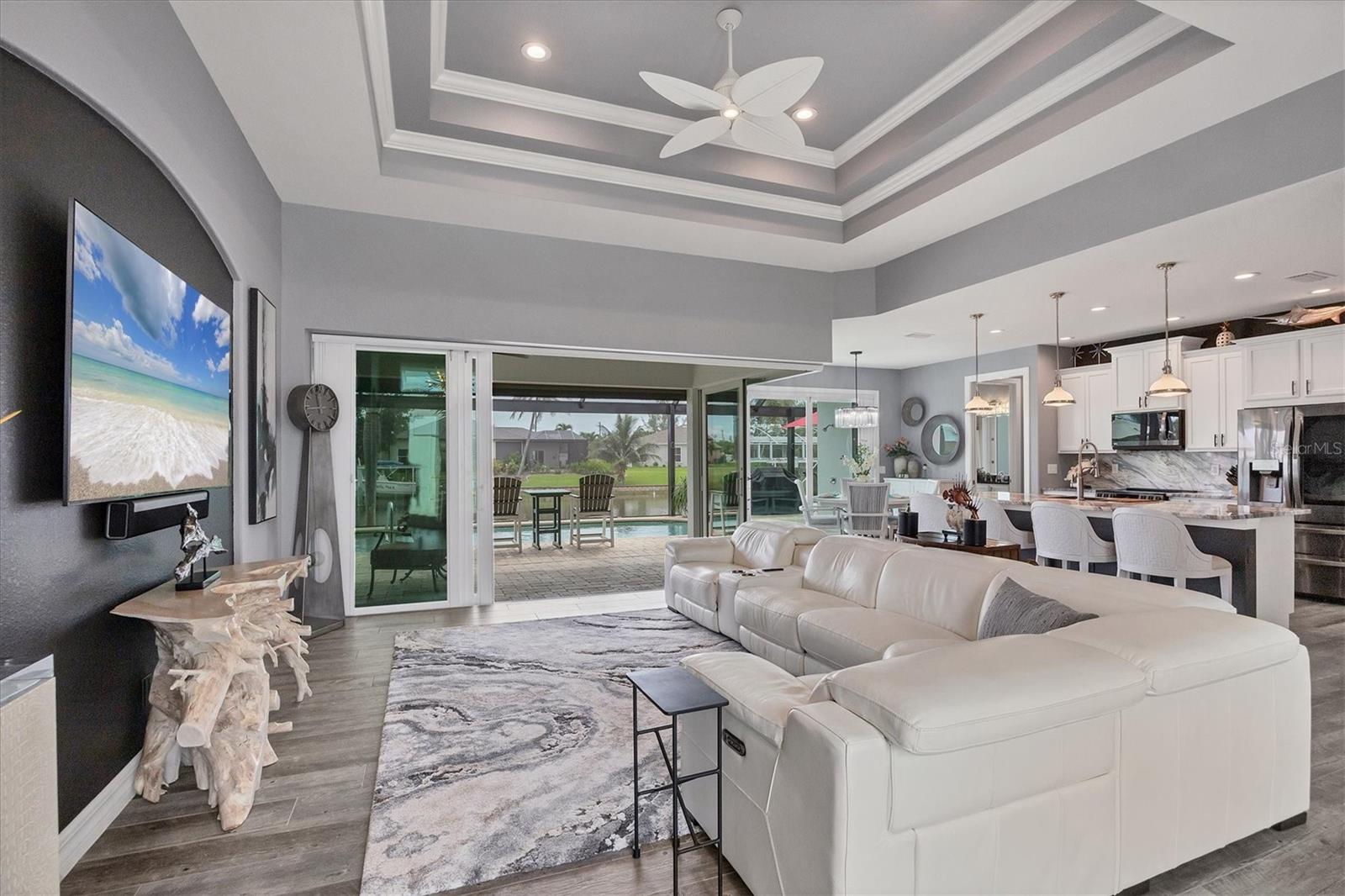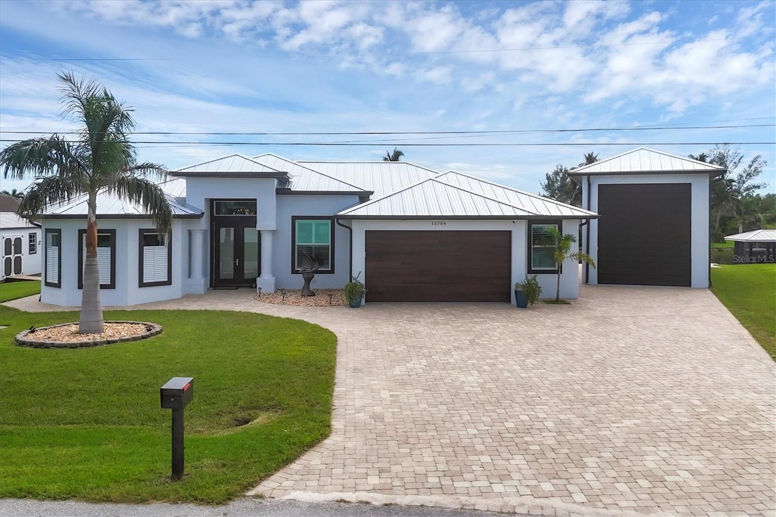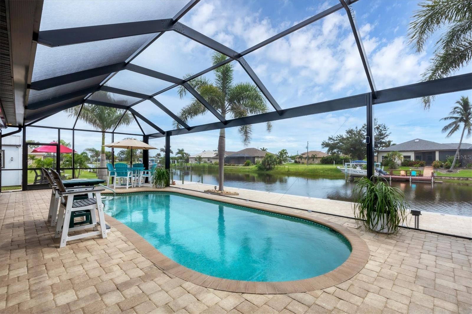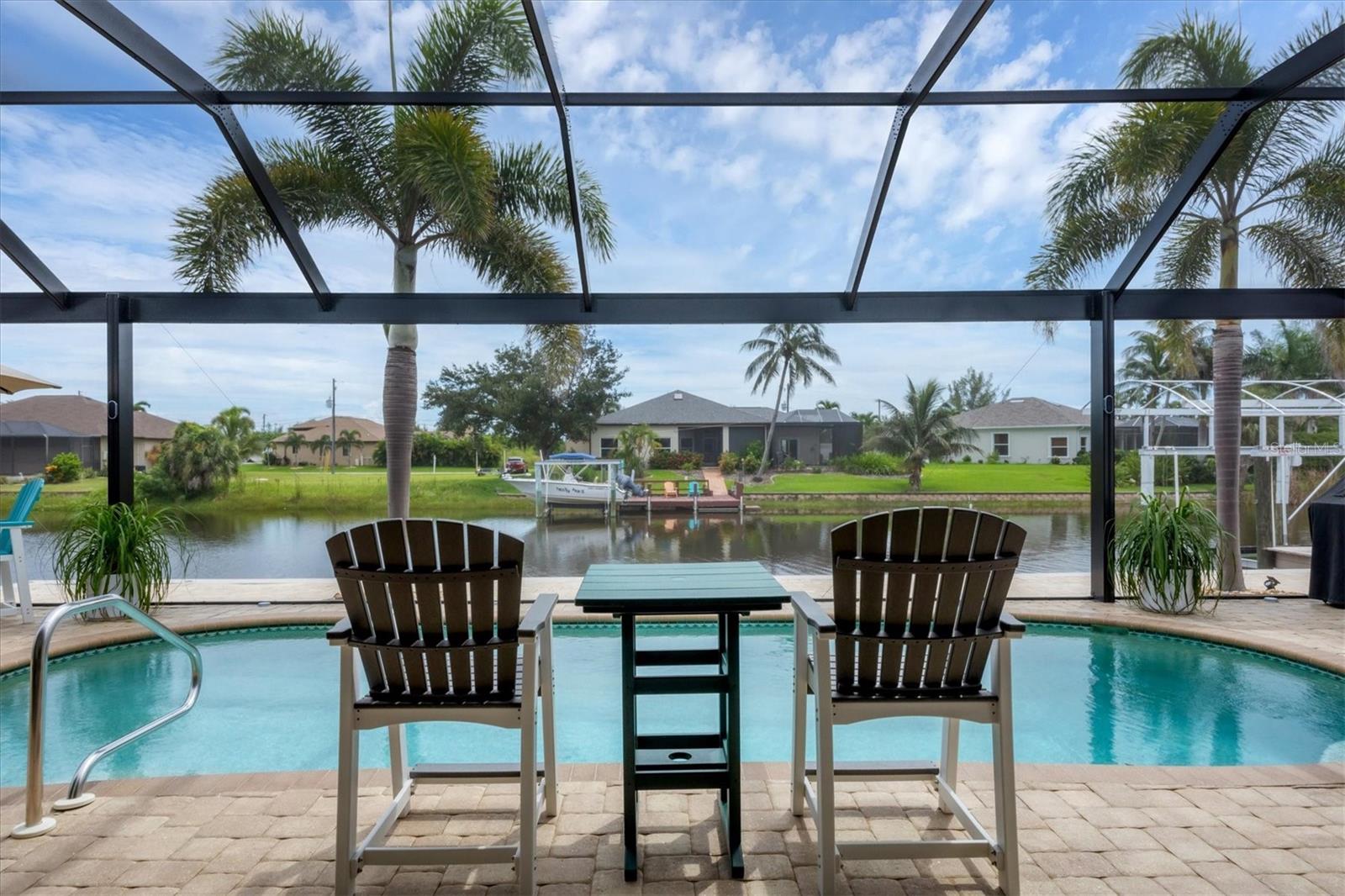 Welcome to coastal perfection in this exceptional custom-built waterfront home, nestled in the coveted South Gulf Cove community. This magnificent residence sits gracefully on a rare double lot, boasting an impressive 213 feet of waterfront, complete with two private docks, a 10,000 lb boat lift, and easy access to open water — your gateway to Boca Grande, Gulf beaches, and world-class fishing. Step into elegance through custom hurricane-rated double doors, where a grand open floor plan unfolds before you. Designed for both everyday living and sophisticated entertaining, this home is filled with natural light, highlighted by zero-degree corner sliders that completely disappear — seamlessly blending indoor and outdoor living. Imagine sunset cocktails on the expansive lanai, dips in the heated saltwater pool, and gatherings under the stars. The pavered driveway wraps gracefully around the home all the way to the docks, creating a stunning entrance and effortless functionality. For the culinary enthusiast, the gourmet kitchen is a dream: a center island, upscale stainless steel appliances, rich granite countertops, and cabinetry that’s as beautiful as it is functional. The great room features soaring 14-foot tray ceilings — adding to the drama and spaciousness of this thoughtfully designed floor plan. The master suite is your private retreat, with hurricane-rated sliders that open to the pool and water views. Indulge in a spa-like en suite bathroom with dual vanities and generous walk-in closets. Two additional guest bedrooms, positioned on the opposite wing of the home, offer peaceful privacy for family or visitors. Need space for the toys? You'll love the 15x48 RV garage, built to accommodate your biggest adventures — boats, campers, or collector vehicles — with plenty of room to spare. Top it all off with peace-of-mind upgrades: hurricane-impact windows and doors, reinforced garage doors, and a brand new roof (2025). Every detail of this home has been meticulously crafted for luxury, safety, and comfort. Paradise is calling. Schedule your private tour of this one-of-a-kind waterfront estate and experience what it feels like to live the Florida dream — in true million-dollar style.