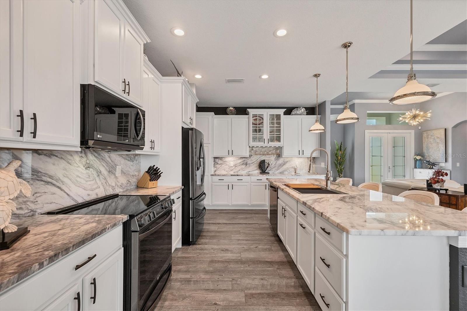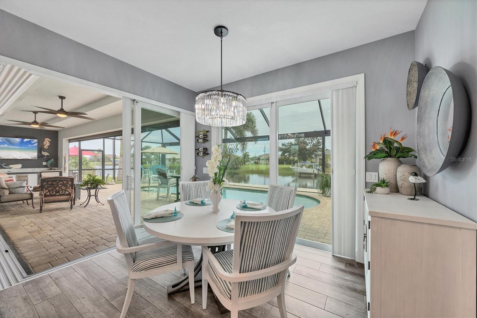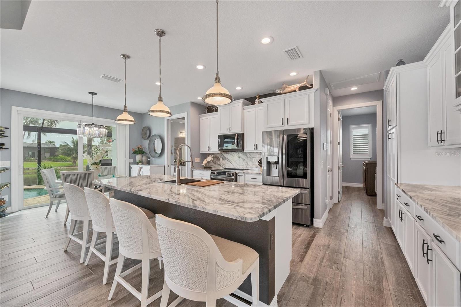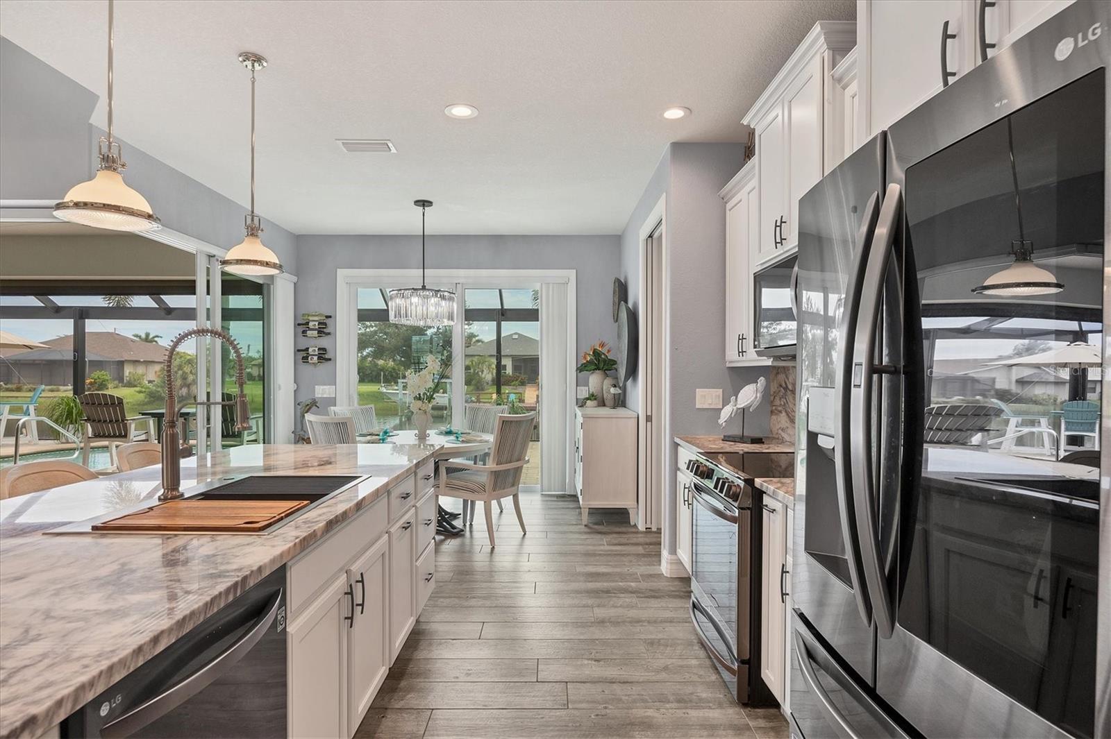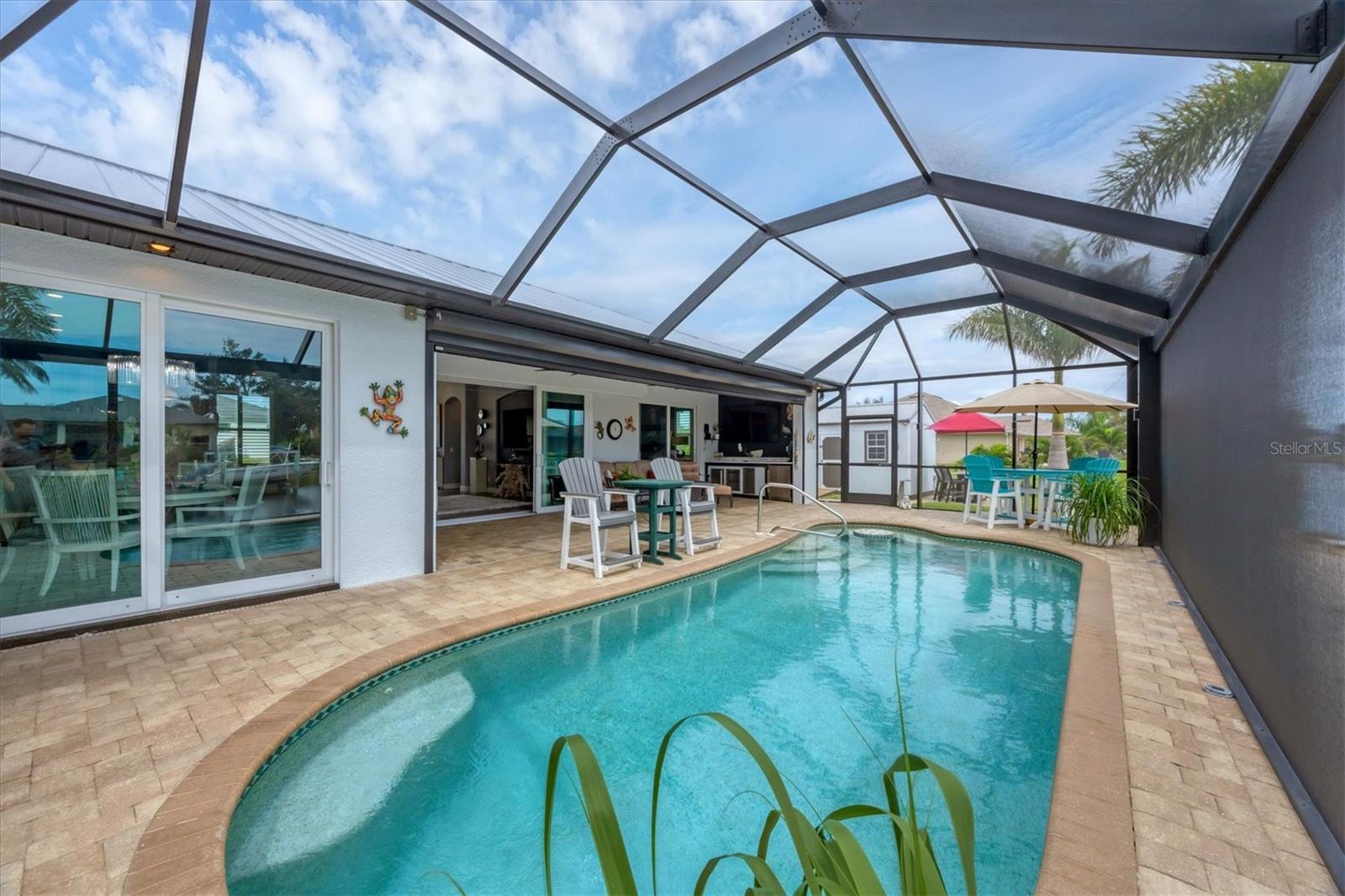 Welcome to coastal perfection in this exceptional custom-built waterfront home, nestled in the coveted South Gulf Cove community. This magnificent residence sits gracefully on a rare double lot, boasting an impressive 213 feet of waterfront, complete with two private docks, a 10,000 lb boat lift, and easy access to open water — your gateway to Boca Grande, Gulf beaches, and world-class fishing. Step into elegance through custom hurricane-rated double doors, where a grand open floor plan unfolds before you. Designed for both everyday living and sophisticated entertaining, this home is filled with natural light, highlighted by zero-degree corner sliders that completely disappear — seamlessly blending indoor and outdoor living. Imagine sunset cocktails on the expansive lanai, dips in the heated saltwater pool, and gatherings under the stars. The pavered driveway wraps gracefully around the home all the way to the docks, creating a stunning entrance and effortless functionality. For the culinary enthusiast, the gourmet kitchen is a dream: a center island, upscale stainless steel appliances, rich granite countertops, and cabinetry that’s as beautiful as it is functional. The great room features soaring 14-foot tray ceilings — adding to the drama and spaciousness of this thoughtfully designed floor plan. The master suite is your private retreat, with hurricane-rated sliders that open to the pool and water views. Indulge in a spa-like en suite bathroom with dual vanities and generous walk-in closets. Two additional guest bedrooms, positioned on the opposite wing of the home, offer peaceful privacy for family or visitors. Need space for the toys? You'll love the 15x48 RV garage, built to accommodate your biggest adventures — boats, campers, or collector vehicles — with plenty of room to spare. Top it all off with peace-of-mind upgrades: hurricane-impact windows and doors, reinforced garage doors, and a brand new roof (2025). Every detail of this home has been meticulously crafted for luxury, safety, and comfort. Paradise is calling. Schedule your private tour of this one-of-a-kind waterfront estate and experience what it feels like to live the Florida dream — in true million-dollar style.