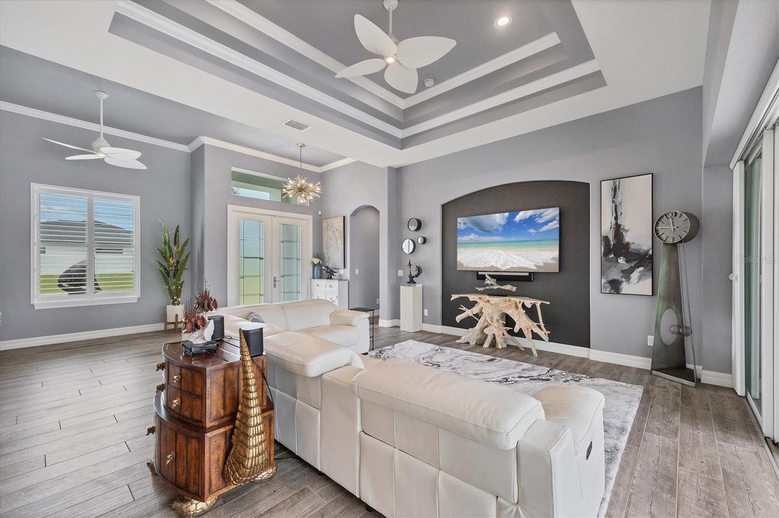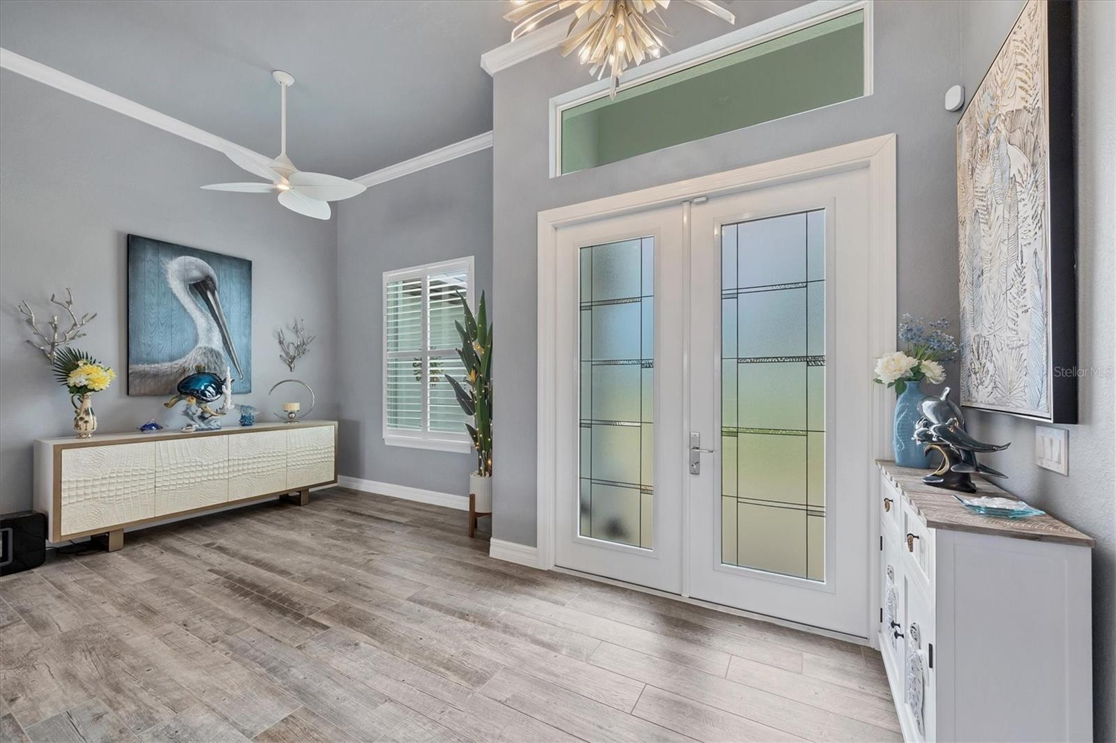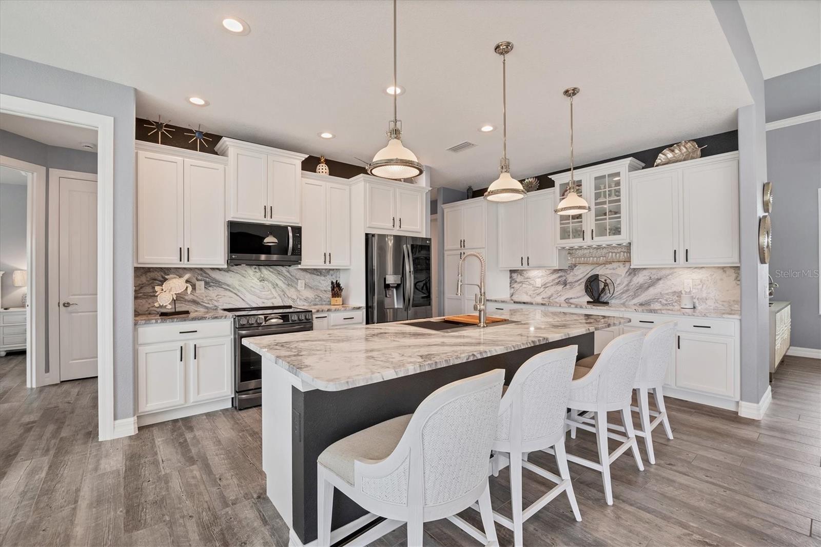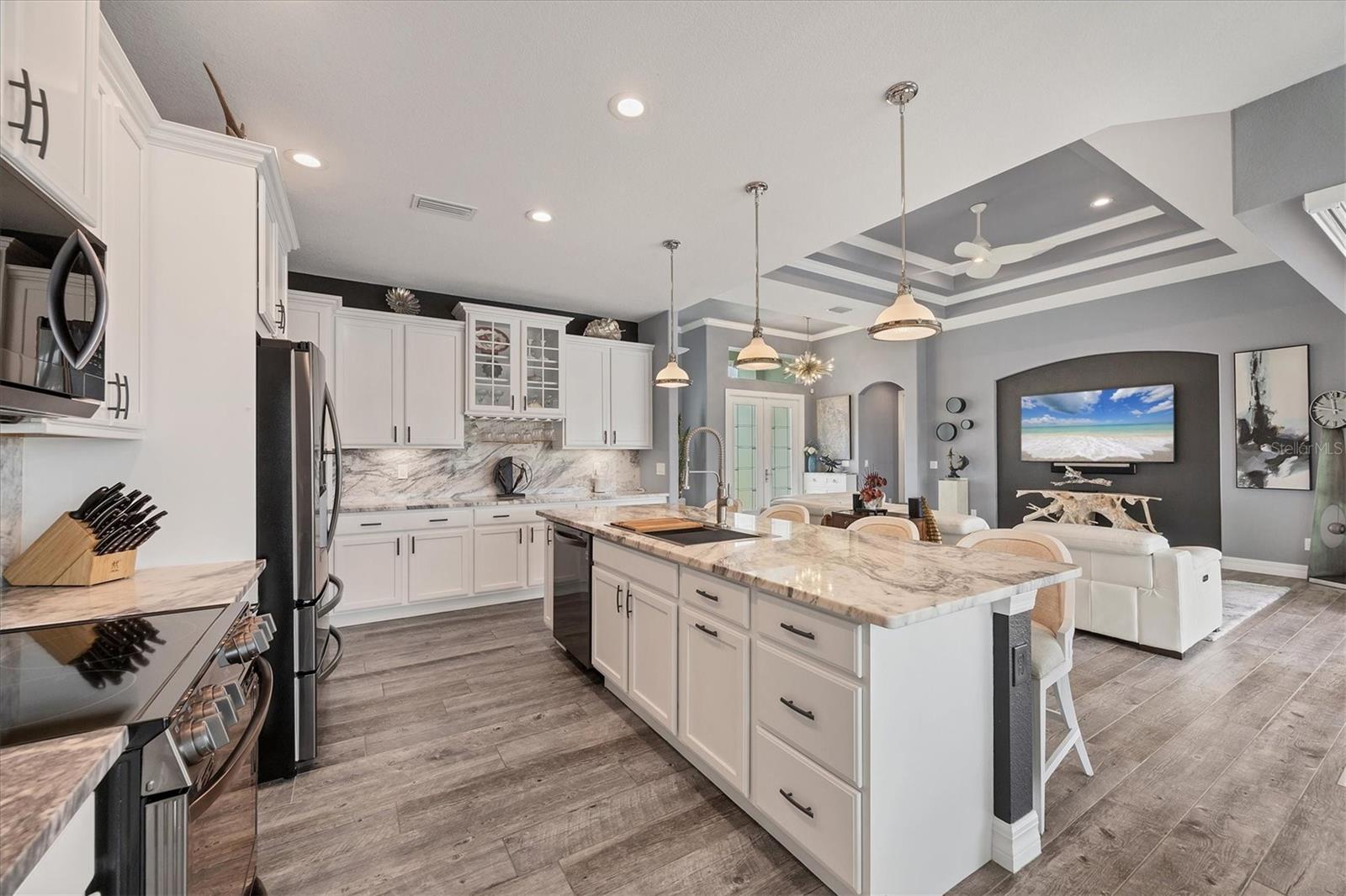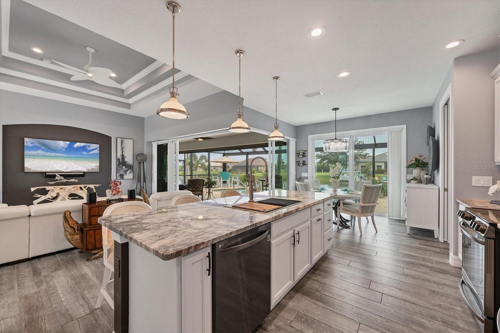 Welcome to coastal perfection in this exceptional custom-built waterfront home, nestled in the coveted South Gulf Cove community. This magnificent residence sits gracefully on a rare double lot, boasting an impressive 213 feet of waterfront, complete with two private docks, a 10,000 lb boat lift, and easy access to open water — your gateway to Boca Grande, Gulf beaches, and world-class fishing. Step into elegance through custom hurricane-rated double doors, where a grand open floor plan unfolds before you. Designed for both everyday living and sophisticated entertaining, this home is filled with natural light, highlighted by zero-degree corner sliders that completely disappear — seamlessly blending indoor and outdoor living. Imagine sunset cocktails on the expansive lanai, dips in the heated saltwater pool, and gatherings under the stars. The pavered driveway wraps gracefully around the home all the way to the docks, creating a stunning entrance and effortless functionality. For the culinary enthusiast, the gourmet kitchen is a dream: a center island, upscale stainless steel appliances, rich granite countertops, and cabinetry that’s as beautiful as it is functional. The great room features soaring 14-foot tray ceilings — adding to the drama and spaciousness of this thoughtfully designed floor plan. The master suite is your private retreat, with hurricane-rated sliders that open to the pool and water views. Indulge in a spa-like en suite bathroom with dual vanities and generous walk-in closets. Two additional guest bedrooms, positioned on the opposite wing of the home, offer peaceful privacy for family or visitors. Need space for the toys? You'll love the 15x48 RV garage, built to accommodate your biggest adventures — boats, campers, or collector vehicles — with plenty of room to spare. Top it all off with peace-of-mind upgrades: hurricane-impact windows and doors, reinforced garage doors, and a brand new roof (2025). Every detail of this home has been meticulously crafted for luxury, safety, and comfort. Paradise is calling. Schedule your private tour of this one-of-a-kind waterfront estate and experience what it feels like to live the Florida dream — in true million-dollar style.