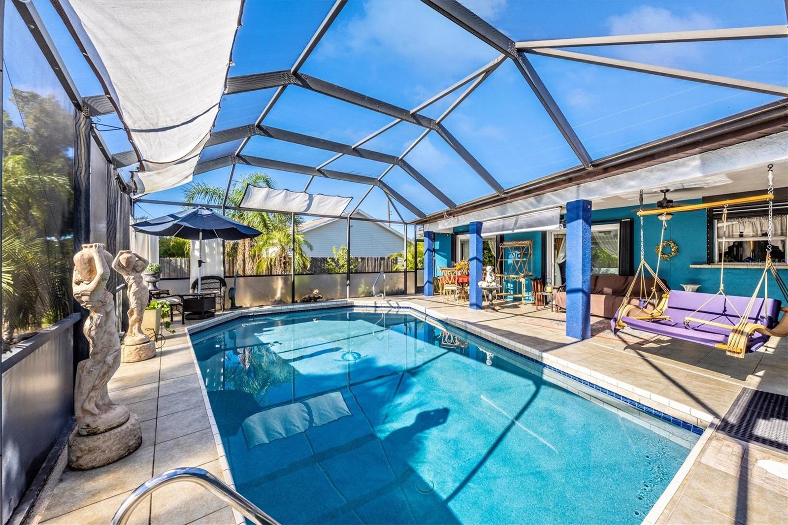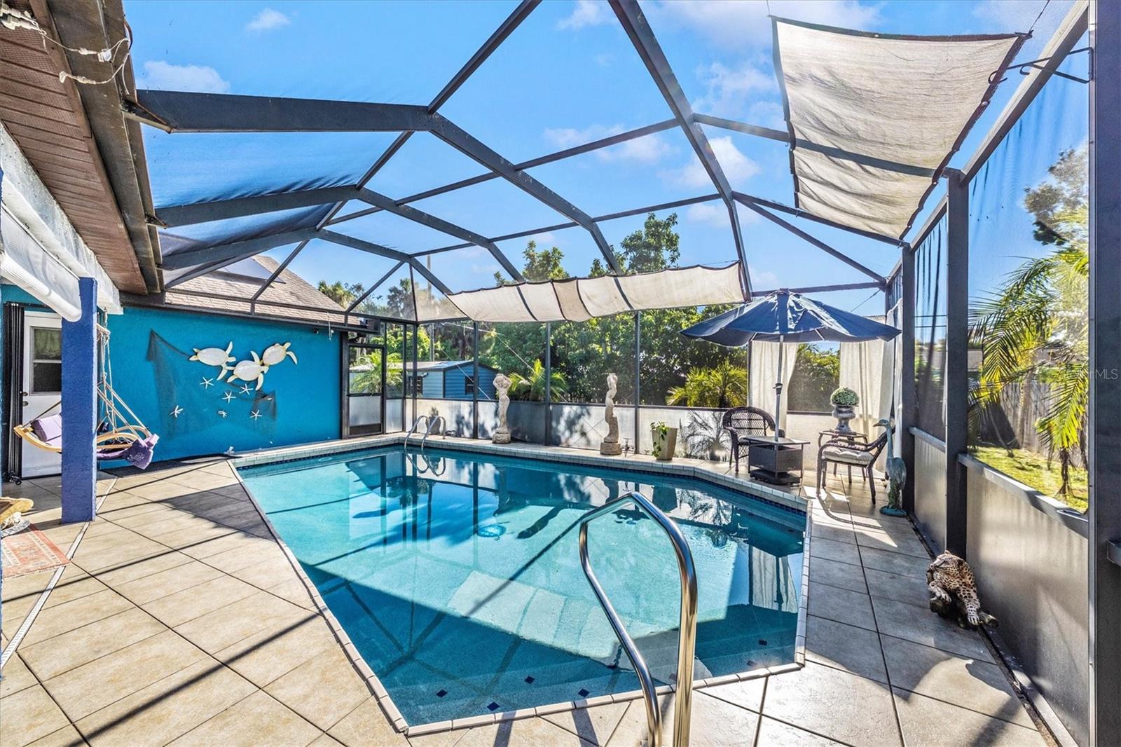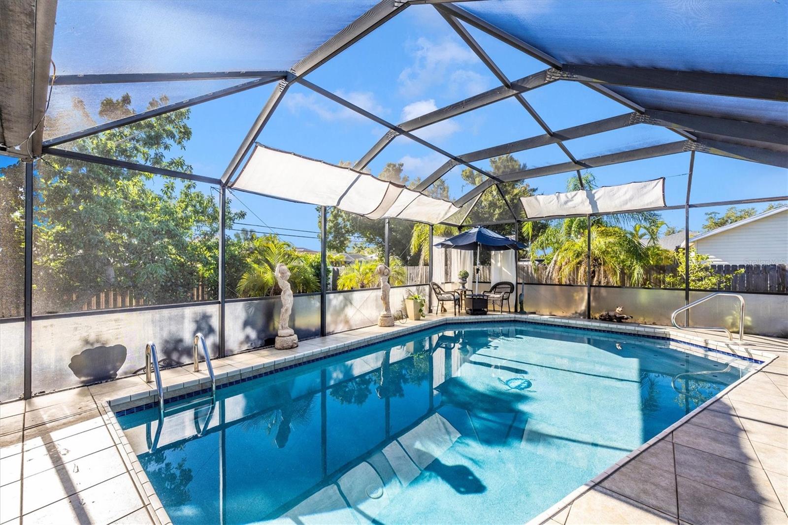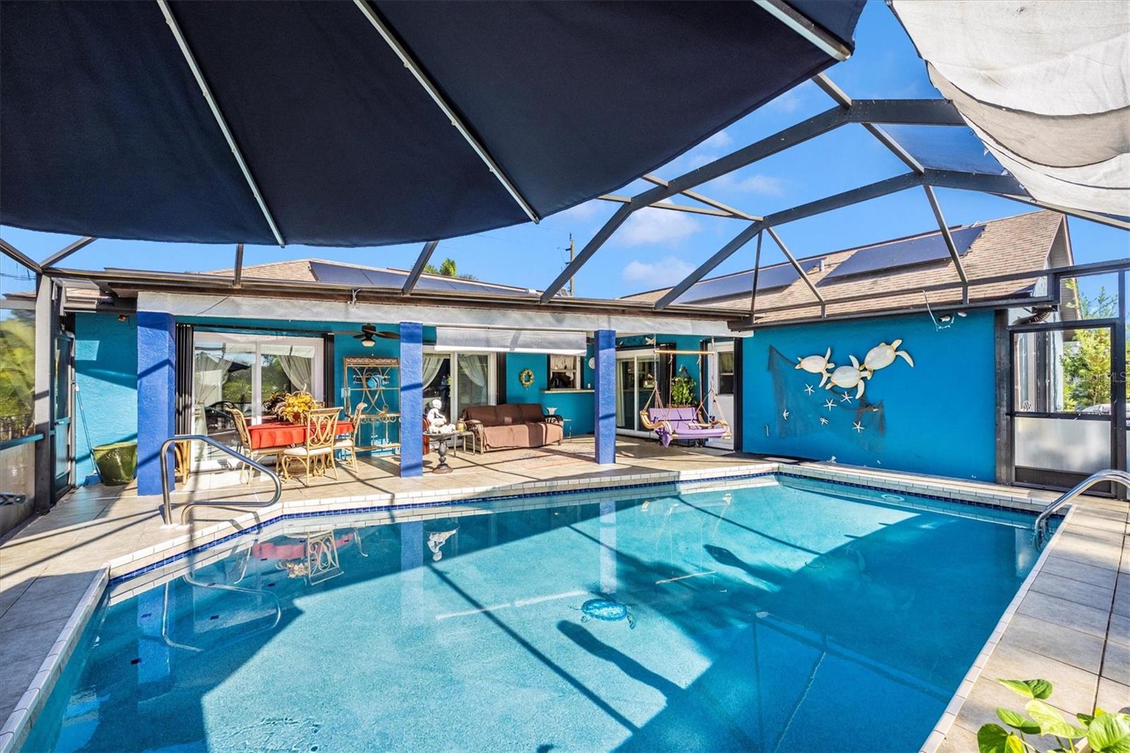Step into this beautifully remodeled 3-bedroom, 2-bath, pool home that truly has it all! Major upgrades include: 50-Year Roof (installed June 2019), 3-Ton AC Unit, Double-Pane Windows & Sliding Glass Doors (2018), Fully Resurfaced Pool (2023), Hurricane Shutters (2023), Hurricane Rated Garage Door (2023), Surround Sound System (inside and in lanai), Fresh Exterior Paint (2025), and Solar Panels (2021). Inside, you'll find 18" tile flooring throughout, separate living spaces (east & west wing) with large owner's suite, kitchen has stainless steel appliances (dishwasher 2025) & granite counter tops. Access from pool area directly to primary suite, great room and hallway bathroom. Outside, enjoy your own private oasis a 20x15 Shed (equipped with electricity), sprinkler irrigation system, security cameras, and professional landscaping, epoxy garage floor. Convenient Location, close to schools and shopping! Don’t miss this move-in ready home—designed for comfort, style, and true Florida living!