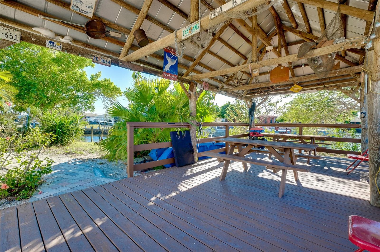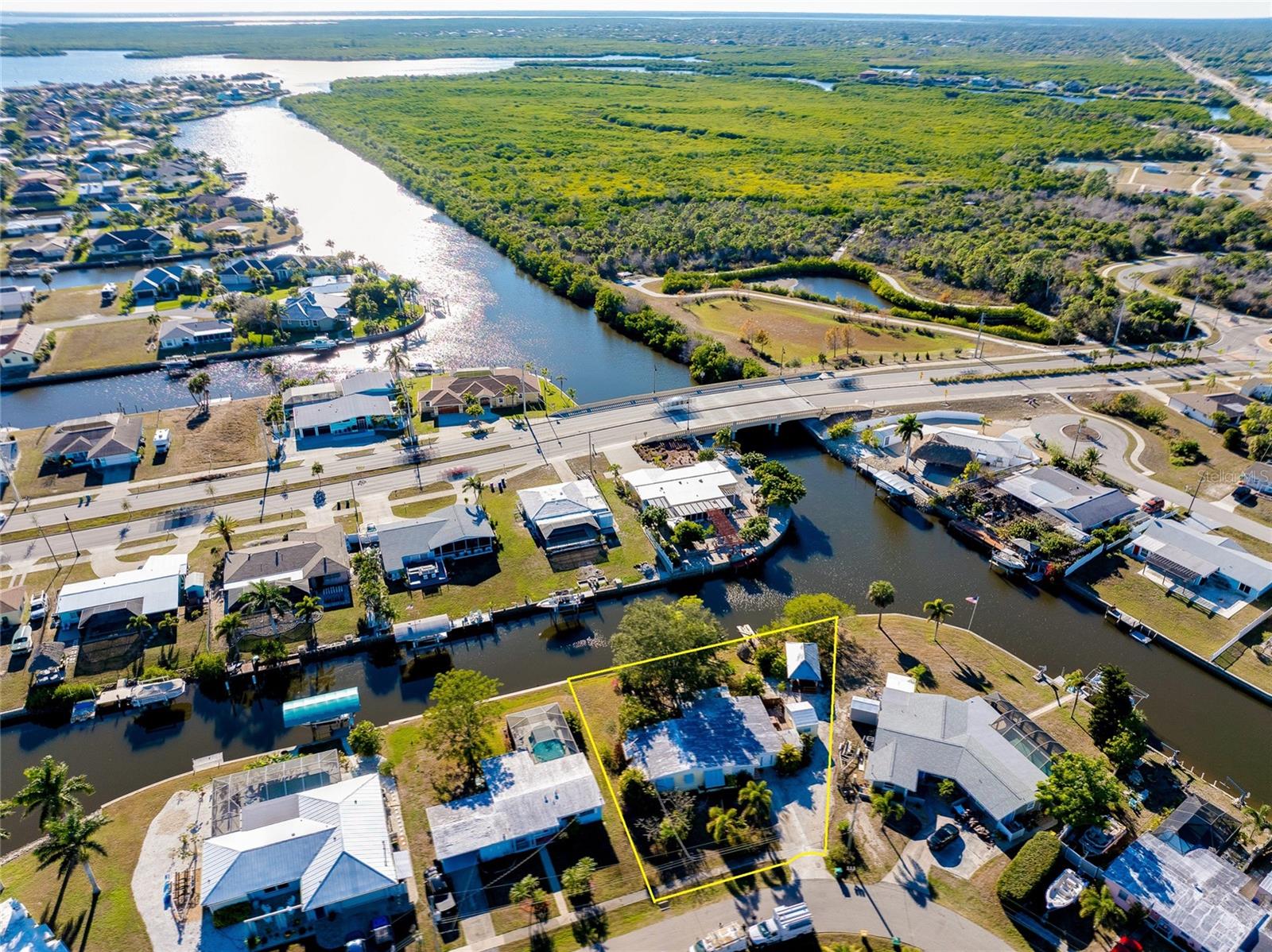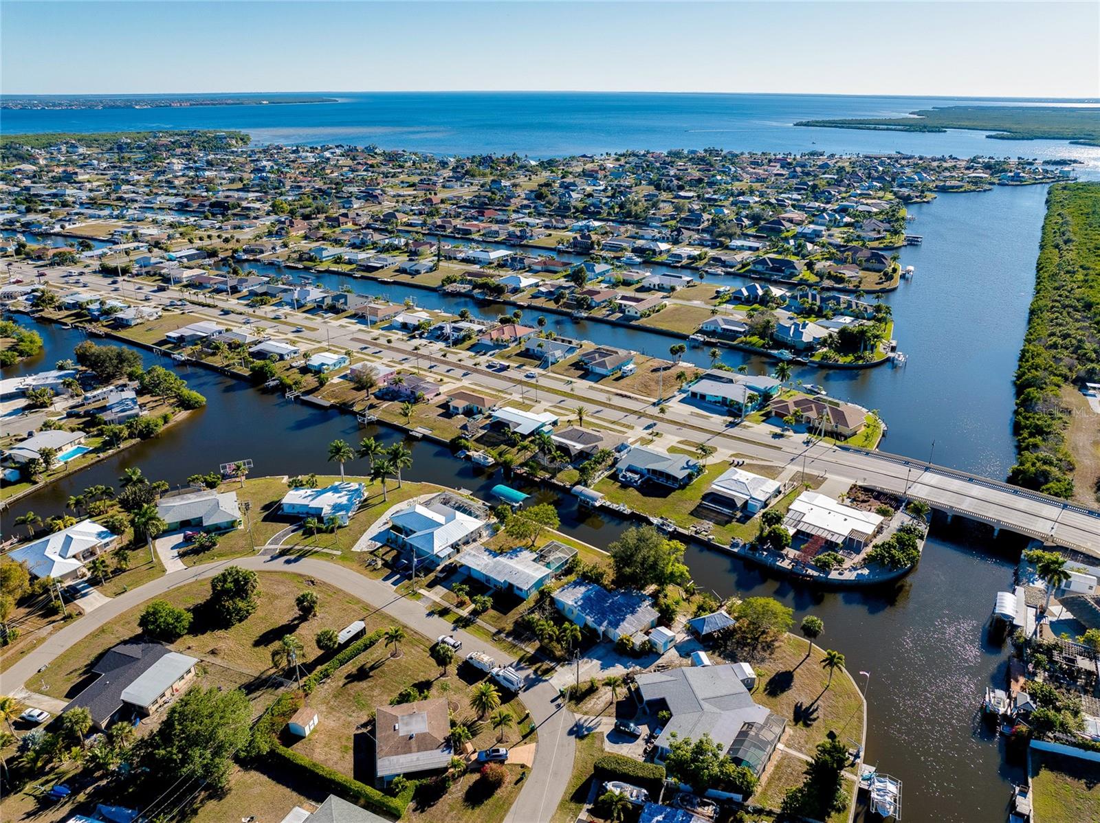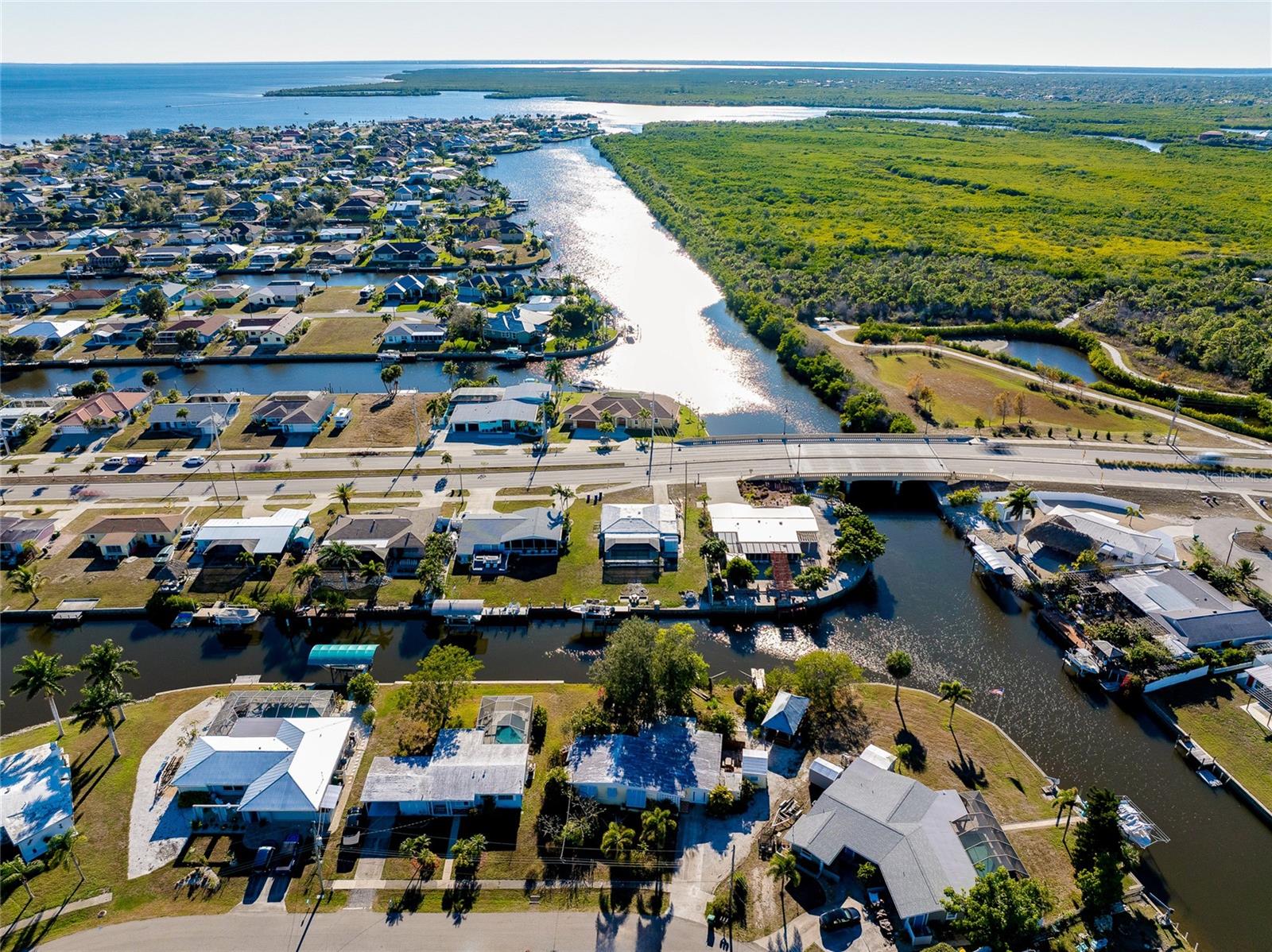 TURNKEY WATERFRONT HOME WITH BONUS MOTHER-IN-LAW SUITE AND QUICK HARBOR ACCESS: Perfectly situated on an oversized, nearly 14,000 square foot pie-shaped waterfront lot with approximately 148 feet of canal frontage and intersecting canal views, this move-in ready residence offers a rare blend of boating access, exceptional outdoor space, privacy, and flexible living options. Whether enjoyed as a single-family home, a multi-generational living setup, or an income-producing opportunity, this waterfront property delivers a unique lifestyle. Located just 0.9 miles from Charlotte Harbor with only one high-clearance bridge, this home provides easy access to open water while maintaining a peaceful and private setting. Showcasing flexibility and opportunity, the property is divided into two living spaces. The main residence features three bedrooms, one bathroom, a large living room, open kitchen, interior laundry room and a bonus Florida room currently configured as a game room, creating additional living and entertaining space. This area is fully equipped with a foosball table, two stand-up arcade systems, a dartboard, and board games, making it ideal for gatherings or relaxed evenings at home. The additional separate mother-in-law suite with its own private entrance affords a studio-style space including a bedroom, full-size bathroom, kitchenette, dining area, living space, and its own laundry closet. The kitchenette is equipped with a range, refrigerator, and microwave. This setup is perfect for visiting guests, extended family, or as a separate rental opportunity. The suite also offers future potential to be reconnected to the main dwelling if desired and features a brand-new split unit air conditioning system. The outdoor living space is truly exceptional, offering a tranquil backyard designed to maximize the waterfront setting and privacy. Features include a large covered outdoor 12x27 tiki style gazebo with metal roof, outdoor grilling stations, a kayak launch, and two hot tubs—one located off the main residence and another on the mother-in-law suite porch. Mature trees enhance the natural setting, and a separate storage shed adds additional functionality. Offered fully furnished and turnkey, the home is ready for immediate use as a primary residence, second home, or rental investment. Recent updates include new washer/dryers (with 3 year warranties), flooring, interior paint, fixtures, 2025 water heater, and a fully updated electrical system with a new 200-amp service panel. This coveted location puts you minutes from boating, fishing, and water sports on Charlotte Harbor, with marinas nearby including Charlotte Harbor Yacht Club, Fishermen’s Village Marina, and Safe Harbor Burnt Store offering slip access and services. Explore local waterfront dining, shopping, and entertainment at Fishermen’s Village in Punta Gorda. For beach days, world-class sands like Englewood Beach, Stump Pass Beach State Park, Manasota Key, and Gasparilla Island State Park are a short scenic drive west, offering swimming, shelling, boating, and sunshine along the Gulf Coast. The area is also known for outstanding golf, premier fishing waters, and easy access to restaurants, shopping, and community amenities throughout Port Charlotte, Punta Gorda, and nearby coastal towns.