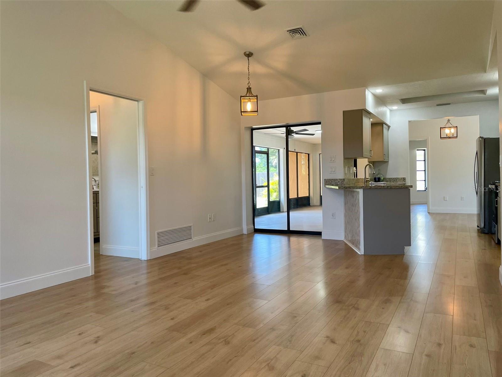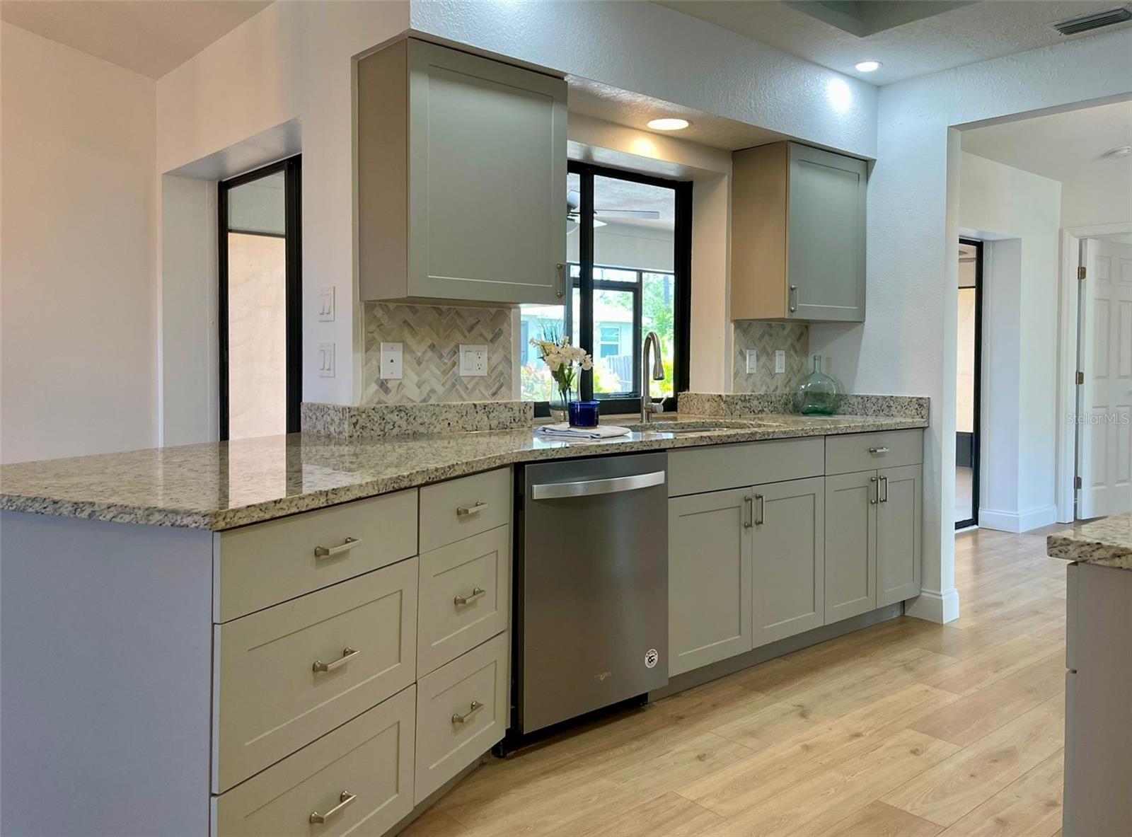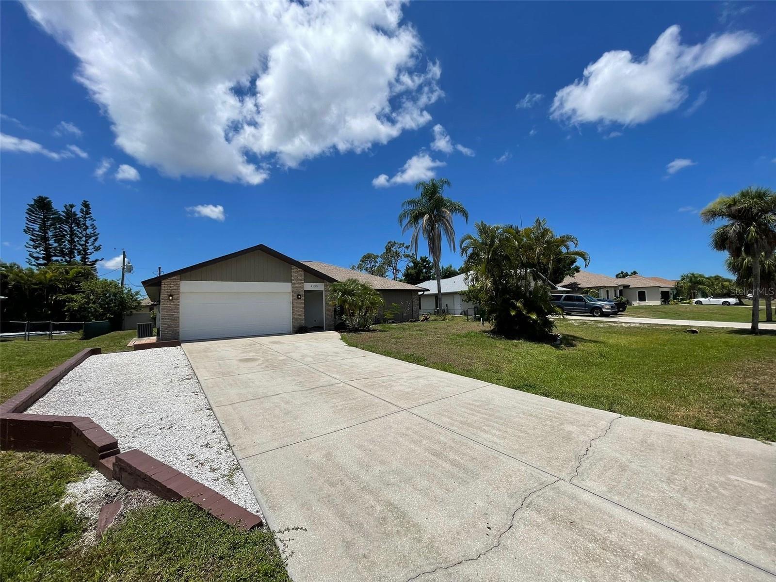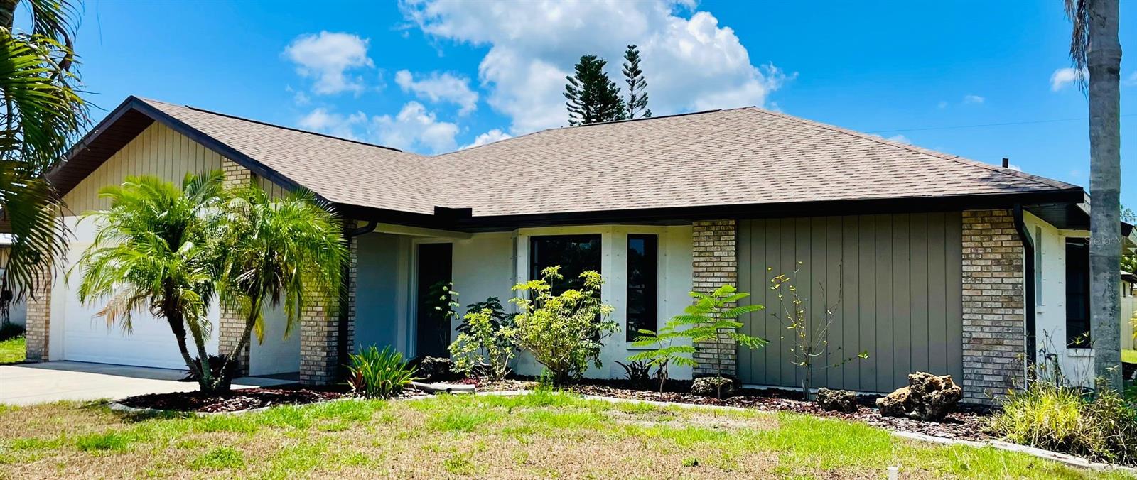 GORGEOUS RENOVATED HOME BY THE WATER!! This is the perfect House you have been Looking for! Your eyes will love the Sexy updates on the inside. And your pocket will love the updates on the outside including Newer Roof, AC and Garage Door. Just 15mins away is the Beautiful Gulf Beach and Just 1 mile to the Gulf Cove Boat Ramp Access into the Myakka River, which leads to the Gulf. The Updated Kitchen and Bathroom Vanities are Luxurious and Beautiful! Laminate Floors have been installed throughout the entire house and every room has been given a fresh coat of paint. Outside You will find Florida's beautiful Palm trees surrounding the property. An extended shell driveway provides extra parking. The open-concept Kitchen has Gorgeous Cabinets with a Granite Countertop, Plenty of Self-Closing Drawer Space, A Stackable Sliding Pass Through Window to the Lanai, a Skylight for extra lighting, Herringbone Backsplash that extends on the Breakfast Bar AND Newer Stainless Steel Appliances. The spacious Living Areas have vaulted ceilings and an abundance of natural light. The Master in this split floor plan home provides His and Her walk-in Closets, access to the Lanai and a beautifully Updated Bathroom with double sinks, Custom Lighting, a linen closet and a walk-in shower with seat and towel bar. The guest Bedrooms off of the Family Room have Spacious Walk in Closets. The Guest Bathroom compliments the Master with a Gorgeous Vanity, Custom Lighting, Storage Closet, Bath/Shower combo and Door access to the Lanai. The Large 30ft Lanai features 3 Very Valuable Stackable Sliding Glass Doors in addition to the pass-through window from the kitchen and Door to the Guest Bathroom. The Lanai is also equipped with 2 fans with lighting. Outdoor Living will be wonderful on the wood grilling deck and paver and crushed shell Patio. The Large Shed contains the Weather Shades for the House and Lanai. Indoor Laundry Room is Just off the kitchen with a Utility Sink, Cabinets, Linen closet and built in Ironing Board. A 2-Car Garage Provides even more space for your Cars and Storage. Roof was done in 2023 permit number 20230211998 AC was done in 2020 permit number 20200823602 And the garage door was done in 2020 permit number 20200616743