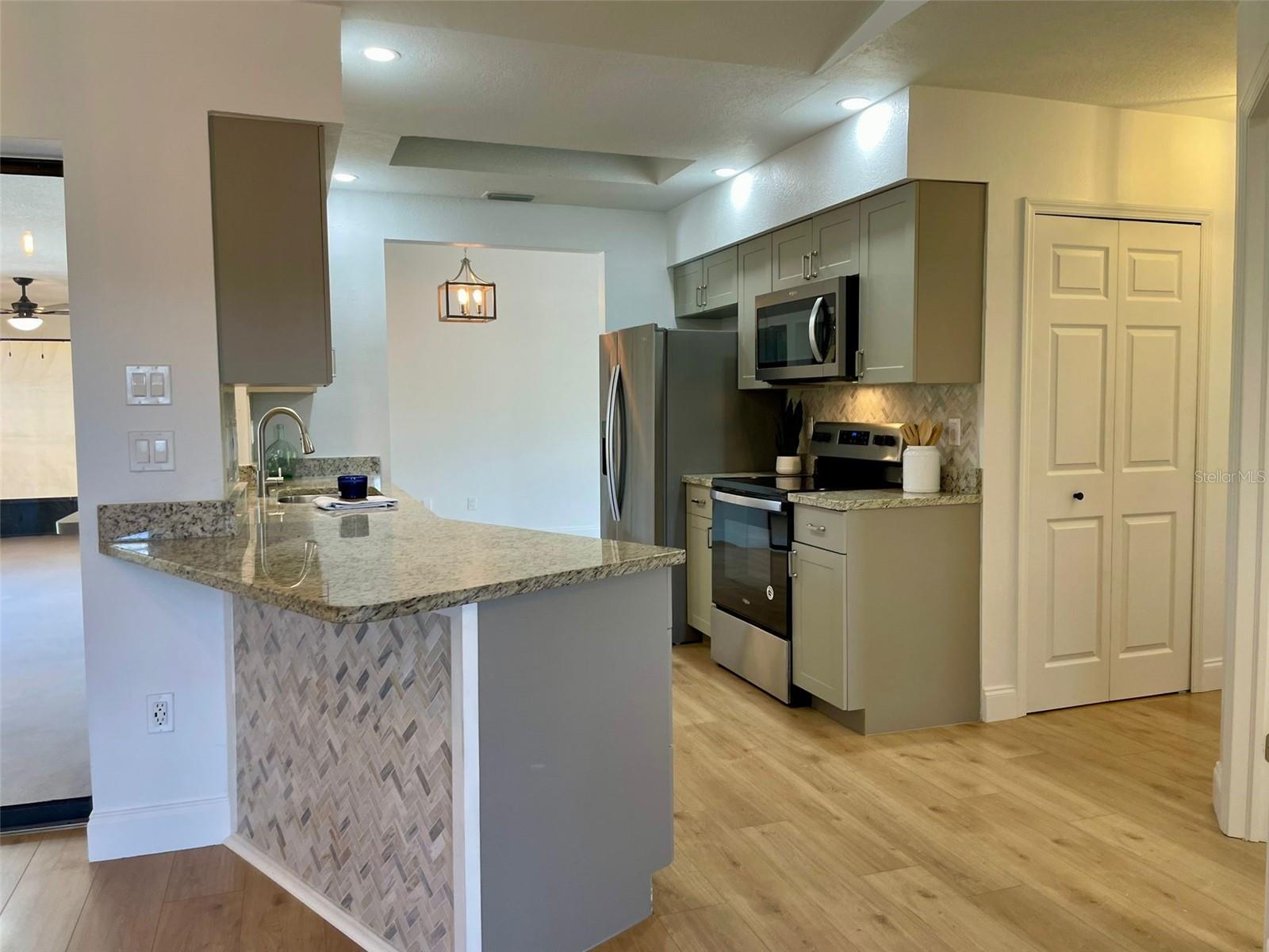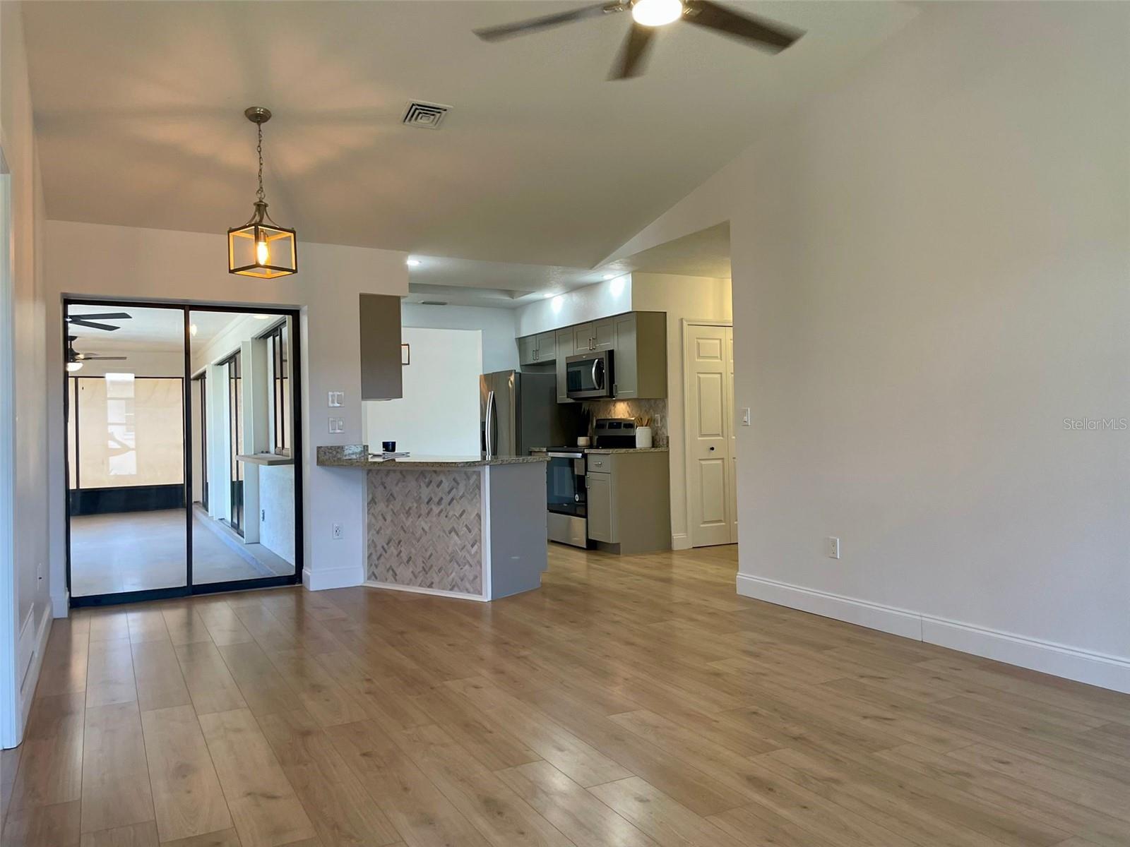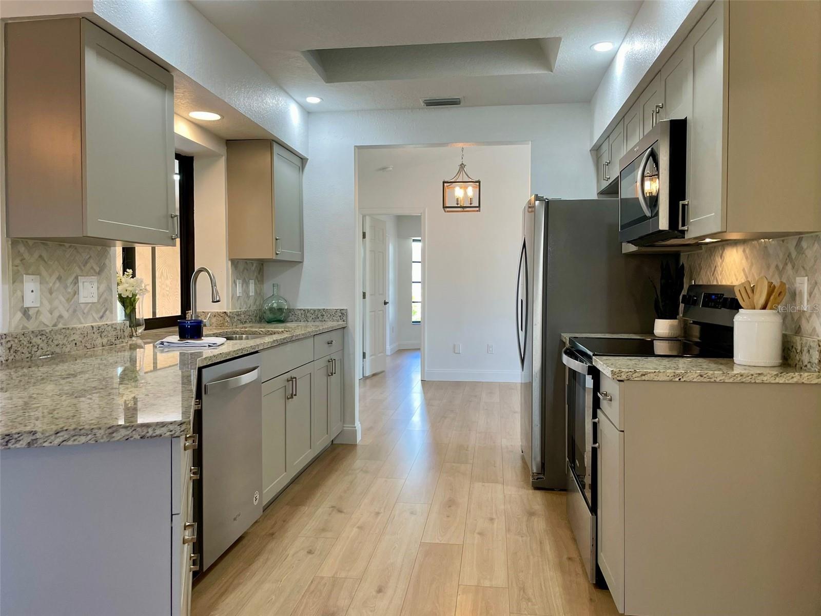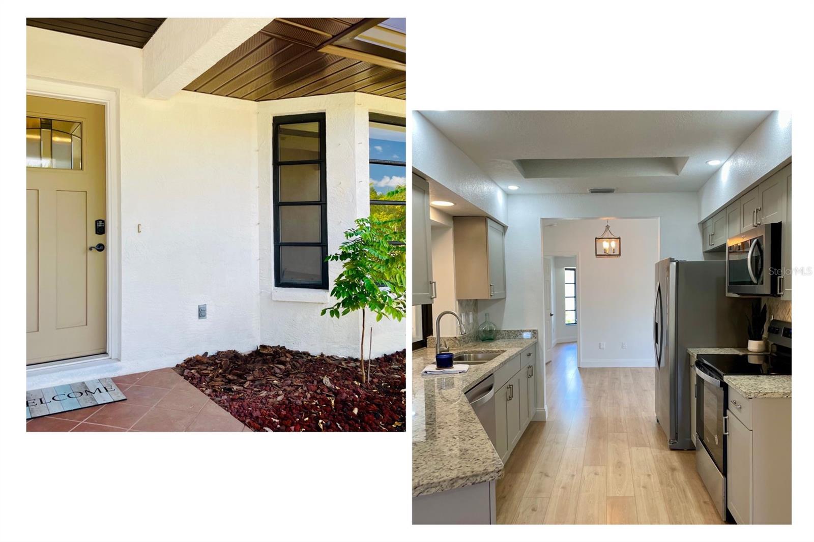 GORGEOUS RENOVATED HOME BY THE WATER!! This is the perfect House you have been Looking for! Your eyes will love the Sexy updates on the inside. And your pocket will love the updates on the outside including Newer Roof, AC and Garage Door. Just 15mins away is the Beautiful Gulf Beach and Just 1 mile to the Gulf Cove Boat Ramp Access into the Myakka River, which leads to the Gulf. The Updated Kitchen and Bathroom Vanities are Luxurious and Beautiful! Laminate Floors have been installed throughout the entire house and every room has been given a fresh coat of paint. Outside You will find Florida's beautiful Palm trees surrounding the property. An extended shell driveway provides extra parking. The open-concept Kitchen has Gorgeous Cabinets with a Granite Countertop, Plenty of Self-Closing Drawer Space, A Stackable Sliding Pass Through Window to the Lanai, a Skylight for extra lighting, Herringbone Backsplash that extends on the Breakfast Bar AND Newer Stainless Steel Appliances. The spacious Living Areas have vaulted ceilings and an abundance of natural light. The Master in this split floor plan home provides His and Her walk-in Closets, access to the Lanai and a beautifully Updated Bathroom with double sinks, Custom Lighting, a linen closet and a walk-in shower with seat and towel bar. The guest Bedrooms off of the Family Room have Spacious Walk in Closets. The Guest Bathroom compliments the Master with a Gorgeous Vanity, Custom Lighting, Storage Closet, Bath/Shower combo and Door access to the Lanai. The Large 30ft Lanai features 3 Very Valuable Stackable Sliding Glass Doors in addition to the pass-through window from the kitchen and Door to the Guest Bathroom. The Lanai is also equipped with 2 fans with lighting. Outdoor Living will be wonderful on the wood grilling deck and paver and crushed shell Patio. The Large Shed contains the Weather Shades for the House and Lanai. Indoor Laundry Room is Just off the kitchen with a Utility Sink, Cabinets, Linen closet and built in Ironing Board. A 2-Car Garage Provides even more space for your Cars and Storage. Roof was done in 2023 permit number 20230211998 AC was done in 2020 permit number 20200823602 And the garage door was done in 2020 permit number 20200616743