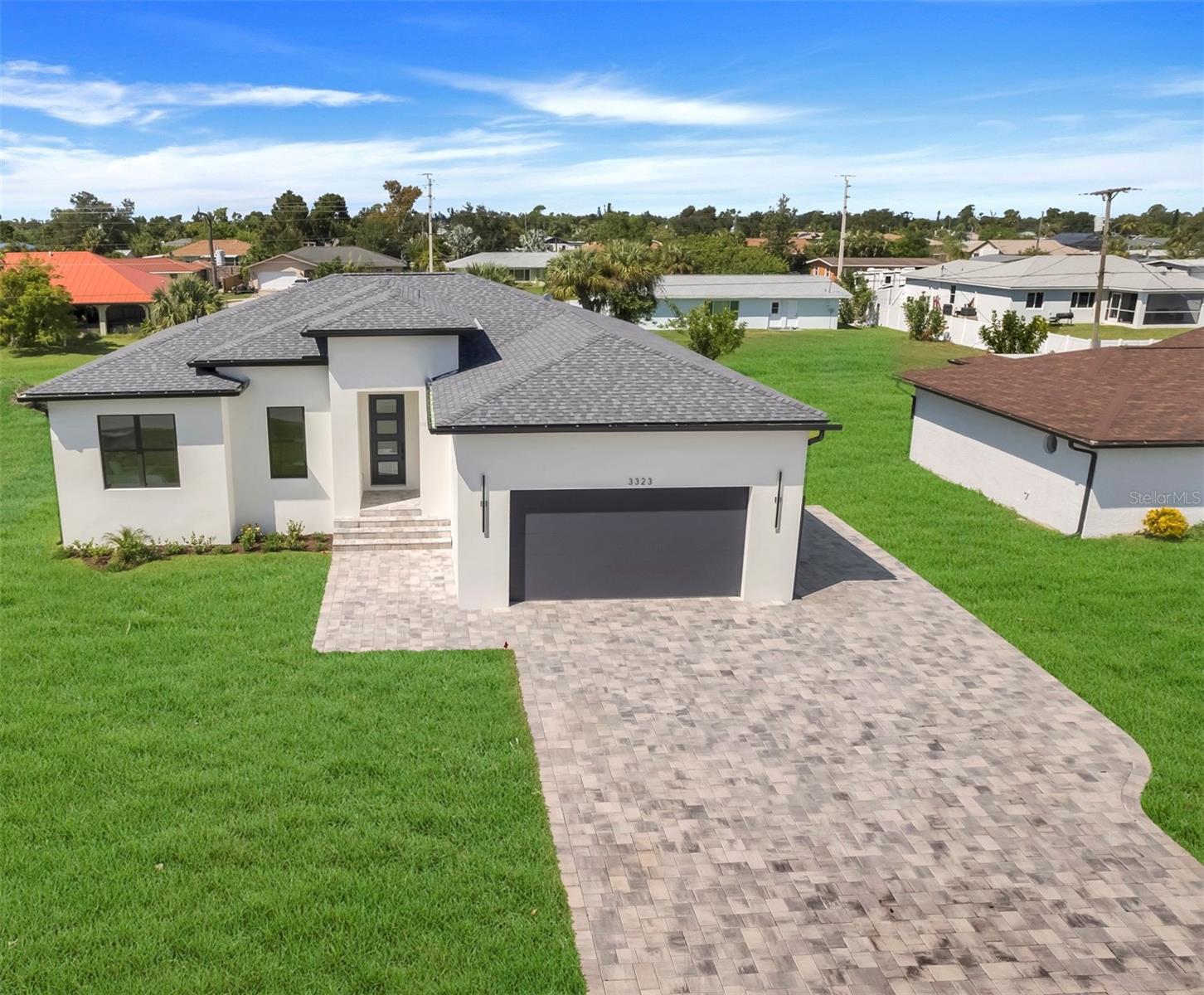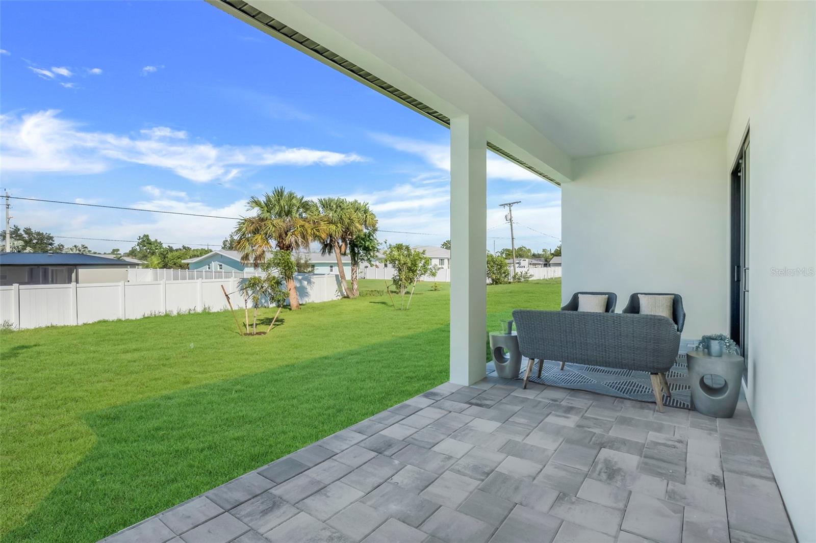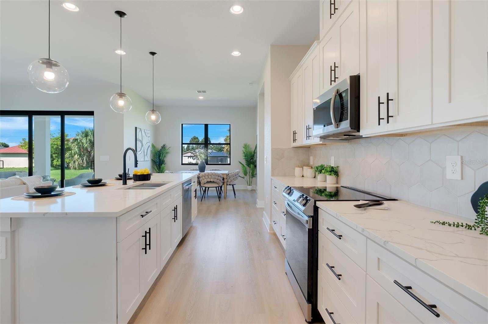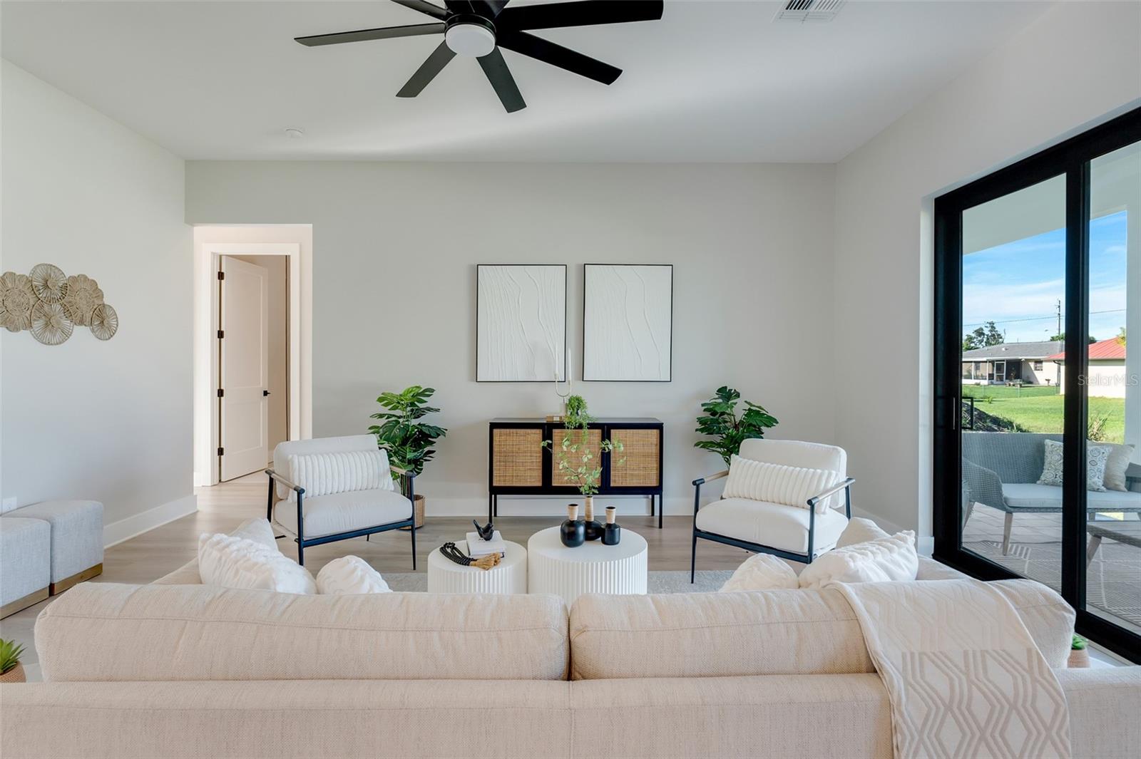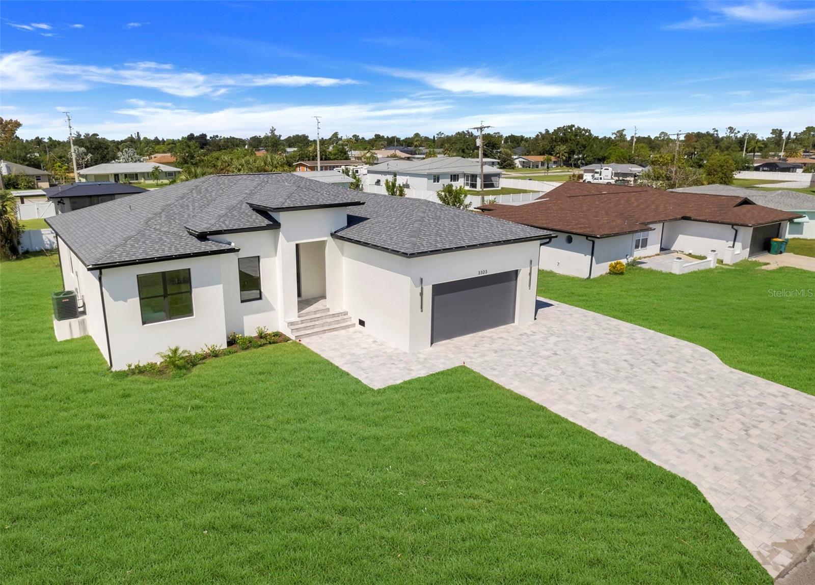 Welcome to this stunning custom-built home, nestled in a community with no HOA fees. With nearly 1,900 square feet of living space, this residence offers abundant room for family and friends. As you enter, you'll be captivated by the open-concept main living area, seamlessly connecting the living room, kitchen, and dining space—ideal for entertaining guests. A beautiful three-panel sliding door opens to the lanai, inviting natural light and enhancing the harmonious indoor-outdoor flow. The kitchen is a chef's dream, featuring upgraded soft-close cabinets, top-of-the-line stainless steel appliances, an exterior vented hood range, elegant tile backsplash, soaring 10-foot ceilings, and stylish 8-foot doors. Adjacent to the garage, the private laundry room provides extra countertop space for your convenience. The primary bedroom, thoughtfully situated on one side of the home, boasts dual sinks, an oversized shower, a private toilet room, and a spacious walk-in closet. On the opposite side, you'll find three additional bedrooms and a full bathroom, ensuring comfort and privacy for everyone. As you explore, you’ll appreciate the meticulous craftsmanship reflected in every detail. The outdoor area is pre-wired and plumbed for a summer kitchen, making it perfect for entertaining or unwinding in your spacious backyard oasis. The two-car garage includes an extra-wide driveway for additional side parking for a boat, trailer, or RV, complemented by a fully paved walkway leading from the driveway to the lanai. Located just 4 minutes from Edgewater's Public Boat Ramp, you'll have easy access to delightful days on the water or peaceful fishing trips. Don’t miss the chance to own this extraordinary oasis—schedule your private showing today and start living your best life in this vibrant town of Port Charlotte, Florida! Lot size is including vacant lot next door 3331 Elkcam Blvd. that can be purchased with the house for an additional $45,000.