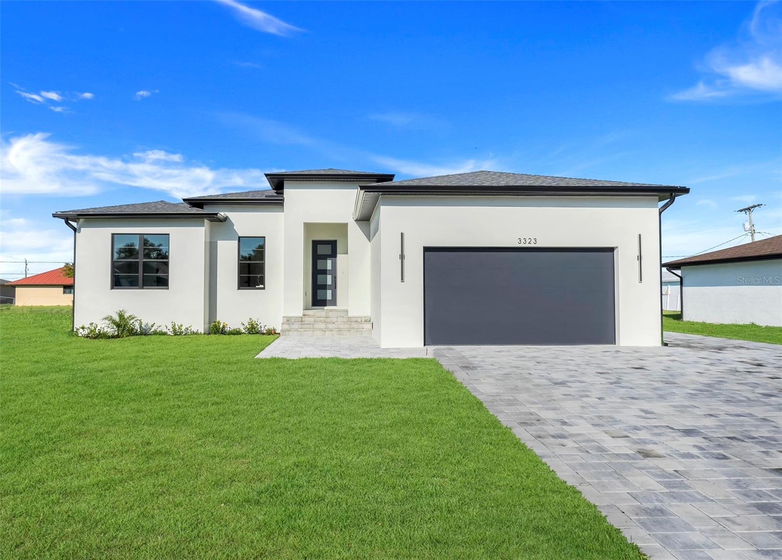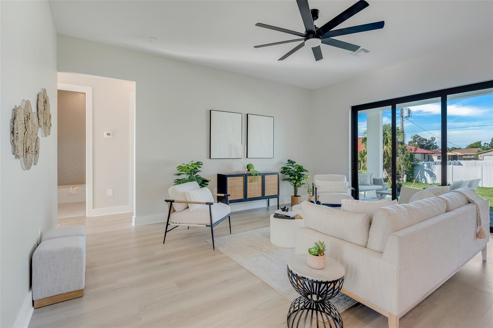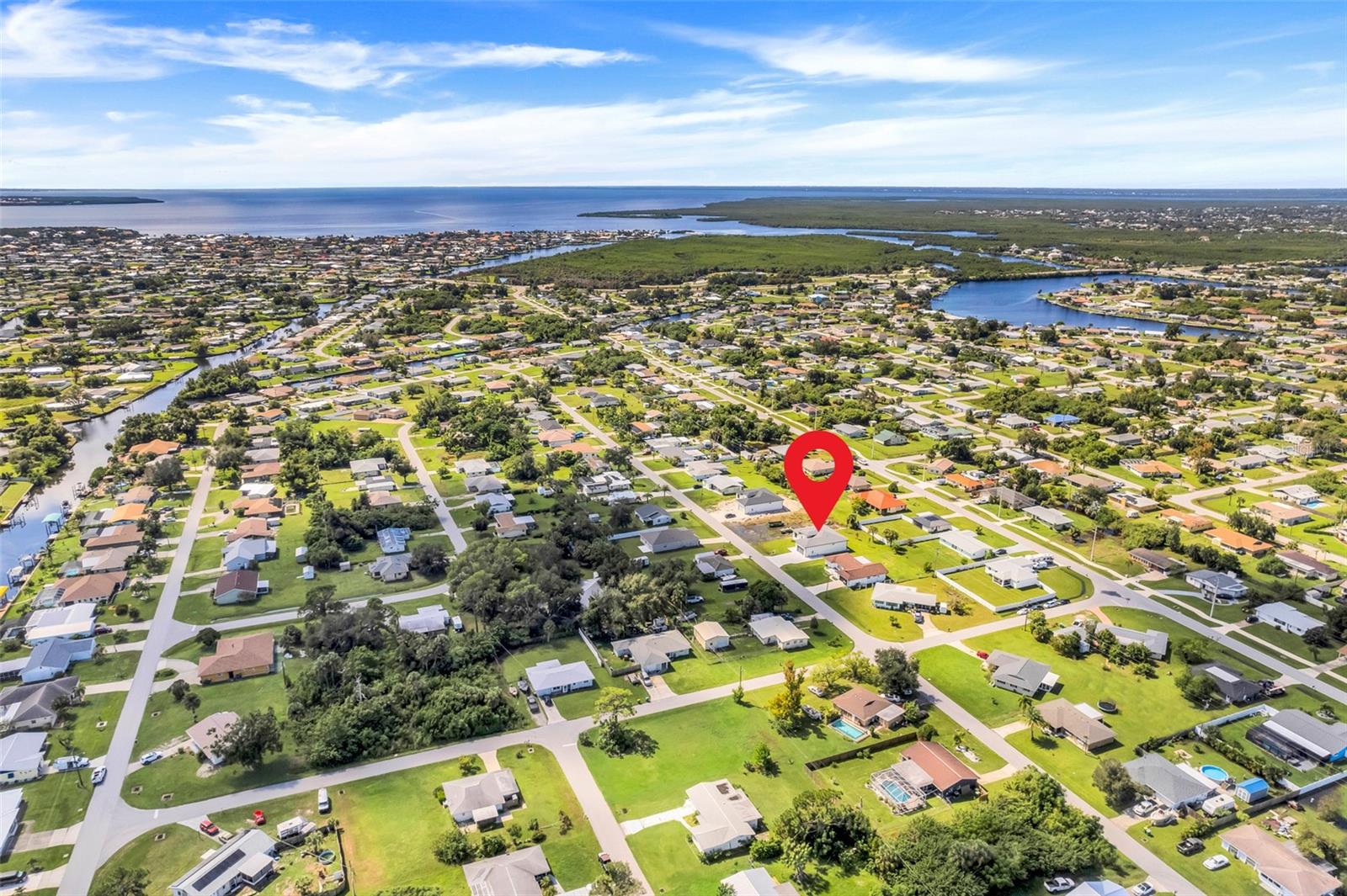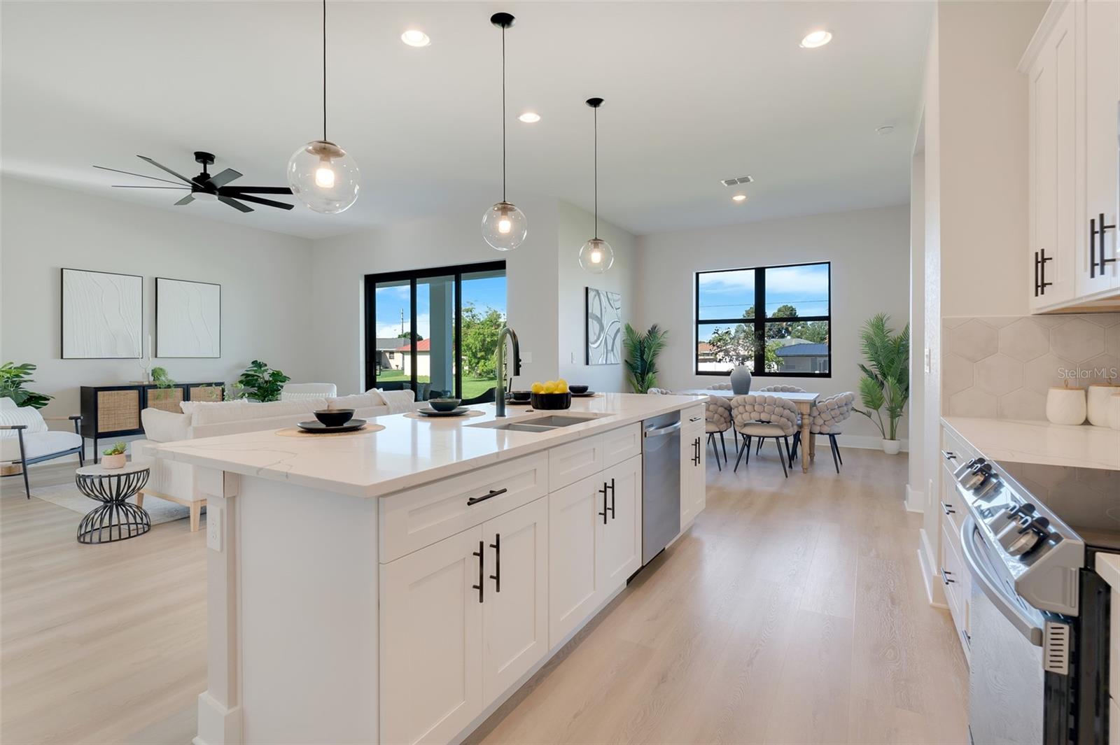 Welcome to this stunning custom-built home, nestled in a community with no HOA fees. With nearly 1,900 square feet of living space, this residence offers abundant room for family and friends. As you enter, you'll be captivated by the open-concept main living area, seamlessly connecting the living room, kitchen, and dining space—ideal for entertaining guests. A beautiful three-panel sliding door opens to the lanai, inviting natural light and enhancing the harmonious indoor-outdoor flow. The kitchen is a chef's dream, featuring upgraded soft-close cabinets, top-of-the-line stainless steel appliances, an exterior vented hood range, elegant tile backsplash, soaring 10-foot ceilings, and stylish 8-foot doors. Adjacent to the garage, the private laundry room provides extra countertop space for your convenience. The primary bedroom, thoughtfully situated on one side of the home, boasts dual sinks, an oversized shower, a private toilet room, and a spacious walk-in closet. On the opposite side, you'll find three additional bedrooms and a full bathroom, ensuring comfort and privacy for everyone. As you explore, you’ll appreciate the meticulous craftsmanship reflected in every detail. The outdoor area is pre-wired and plumbed for a summer kitchen, making it perfect for entertaining or unwinding in your spacious backyard oasis. The two-car garage includes an extra-wide driveway for additional side parking for a boat, trailer, or RV, complemented by a fully paved walkway leading from the driveway to the lanai. Located just 4 minutes from Edgewater's Public Boat Ramp, you'll have easy access to delightful days on the water or peaceful fishing trips. Don’t miss the chance to own this extraordinary oasis—schedule your private showing today and start living your best life in this vibrant town of Port Charlotte, Florida! Lot size is including vacant lot next door 3331 Elkcam Blvd. that can be purchased with the house for an additional $45,000.