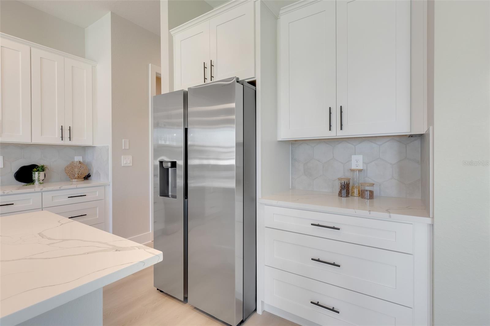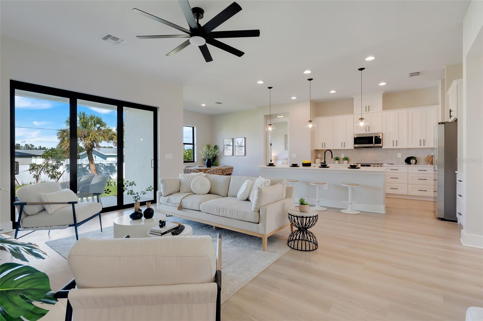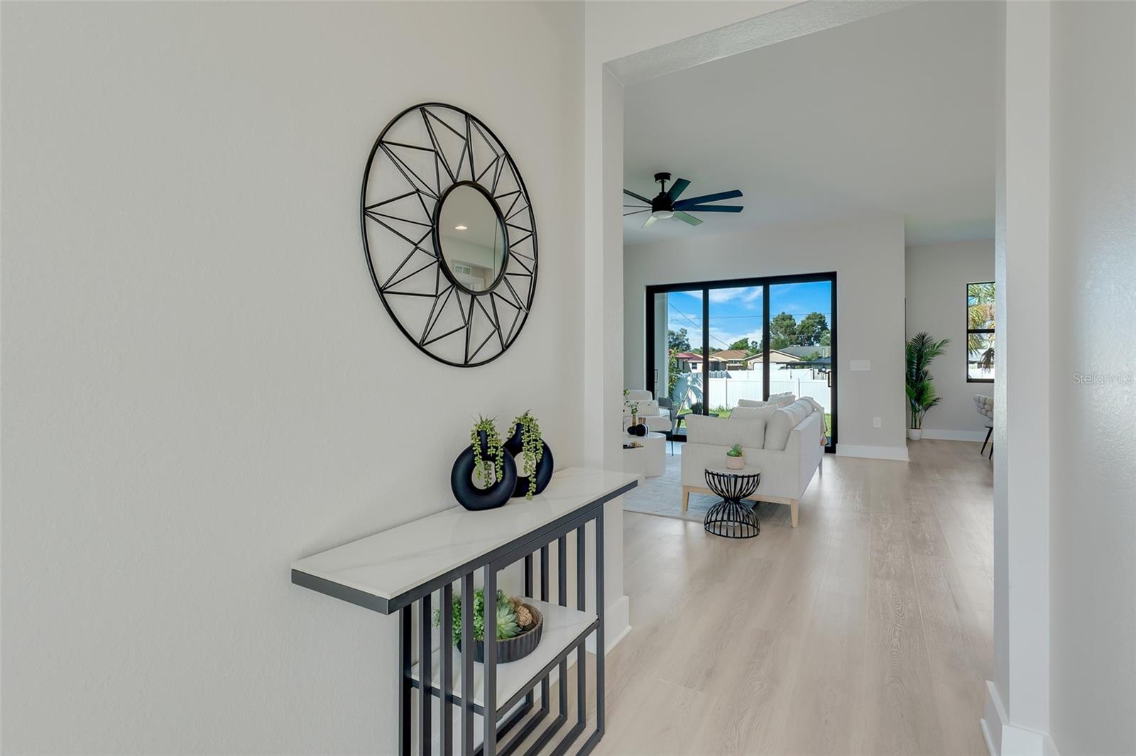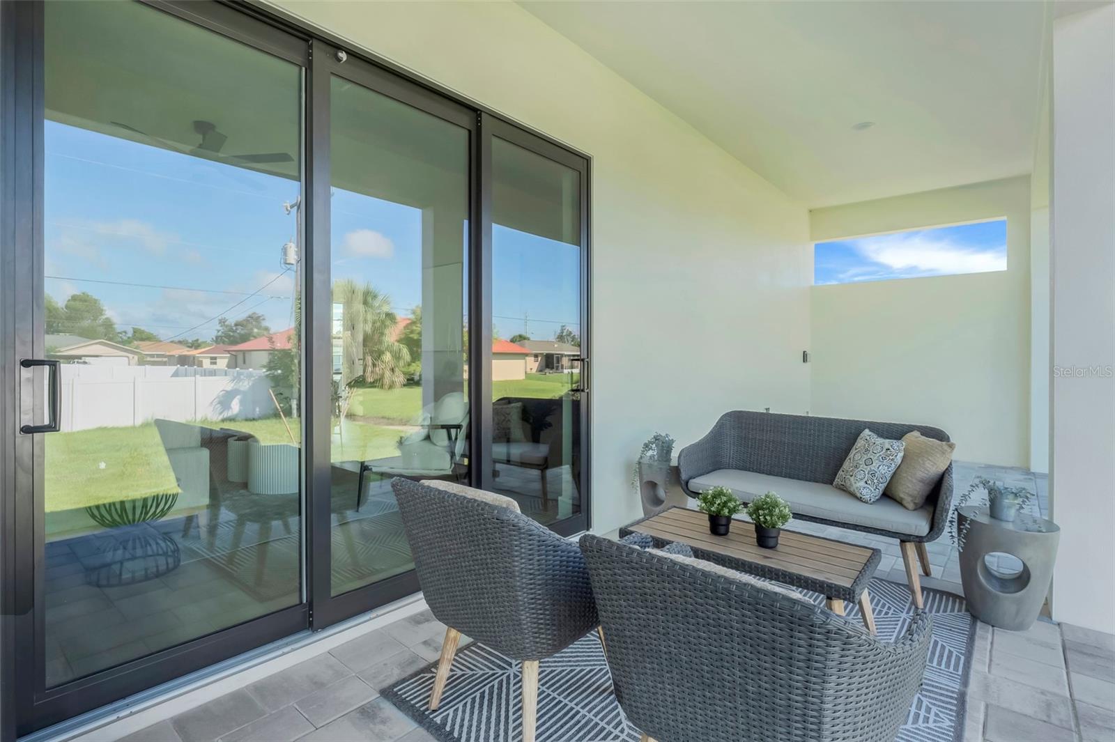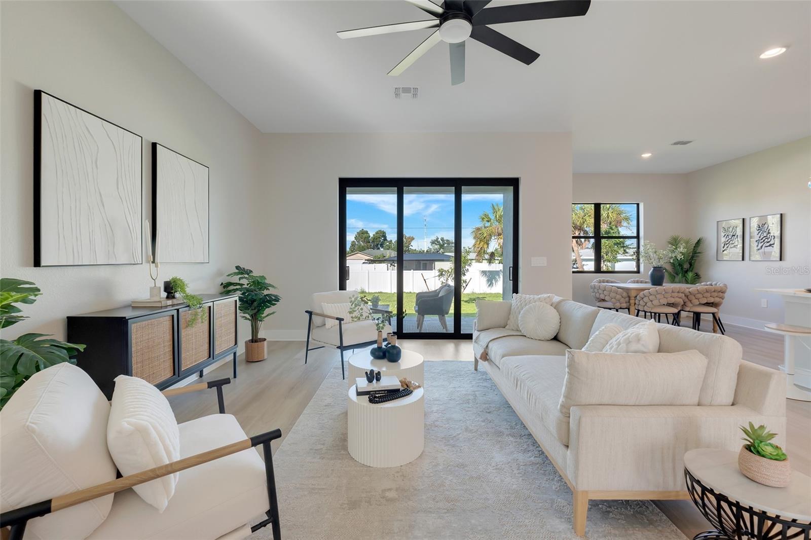 Welcome to this stunning custom-built home, nestled in a community with no HOA fees. With nearly 1,900 square feet of living space, this residence offers abundant room for family and friends. As you enter, you'll be captivated by the open-concept main living area, seamlessly connecting the living room, kitchen, and dining space—ideal for entertaining guests. A beautiful three-panel sliding door opens to the lanai, inviting natural light and enhancing the harmonious indoor-outdoor flow. The kitchen is a chef's dream, featuring upgraded soft-close cabinets, top-of-the-line stainless steel appliances, an exterior vented hood range, elegant tile backsplash, soaring 10-foot ceilings, and stylish 8-foot doors. Adjacent to the garage, the private laundry room provides extra countertop space for your convenience. The primary bedroom, thoughtfully situated on one side of the home, boasts dual sinks, an oversized shower, a private toilet room, and a spacious walk-in closet. On the opposite side, you'll find three additional bedrooms and a full bathroom, ensuring comfort and privacy for everyone. As you explore, you’ll appreciate the meticulous craftsmanship reflected in every detail. The outdoor area is pre-wired and plumbed for a summer kitchen, making it perfect for entertaining or unwinding in your spacious backyard oasis. The two-car garage includes an extra-wide driveway for additional side parking for a boat, trailer, or RV, complemented by a fully paved walkway leading from the driveway to the lanai. Located just 4 minutes from Edgewater's Public Boat Ramp, you'll have easy access to delightful days on the water or peaceful fishing trips. Don’t miss the chance to own this extraordinary oasis—schedule your private showing today and start living your best life in this vibrant town of Port Charlotte, Florida! Lot size is including vacant lot next door 3331 Elkcam Blvd. that can be purchased with the house for an additional $45,000.
