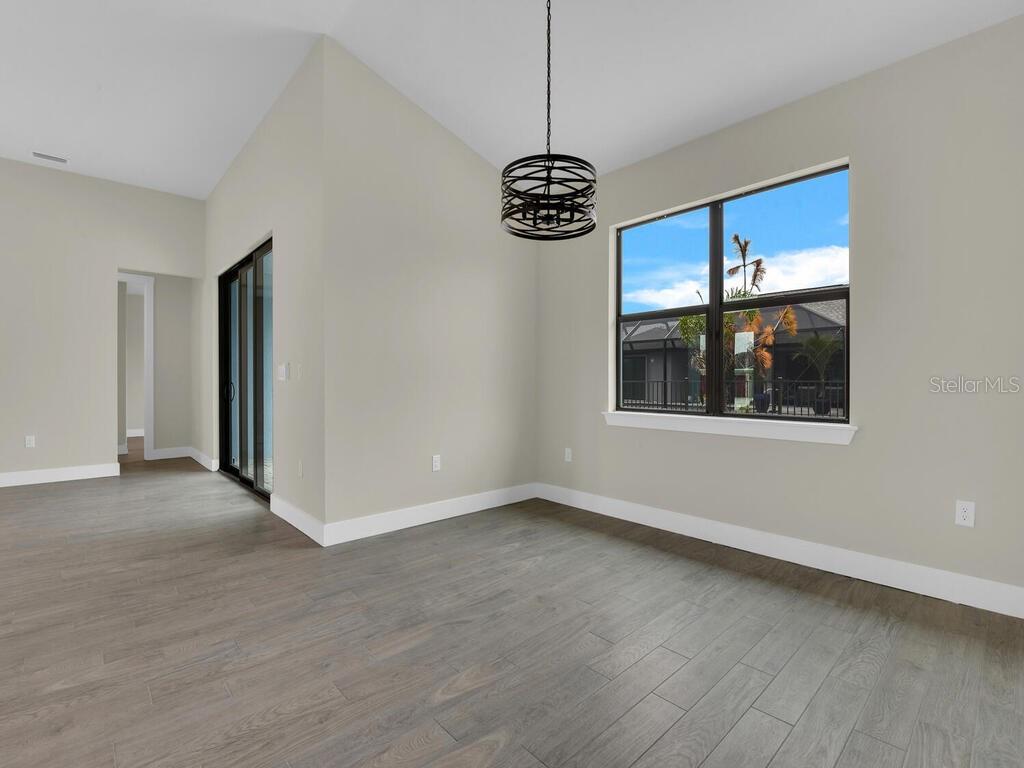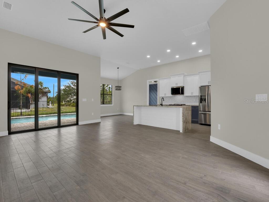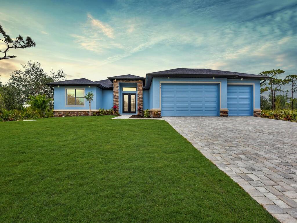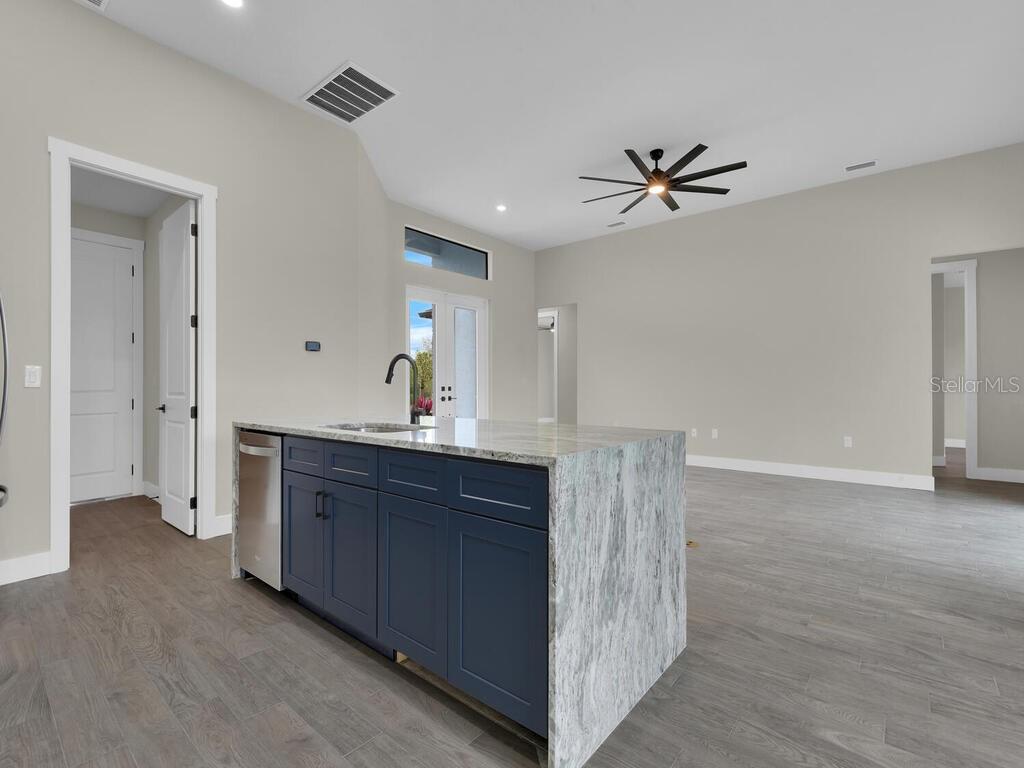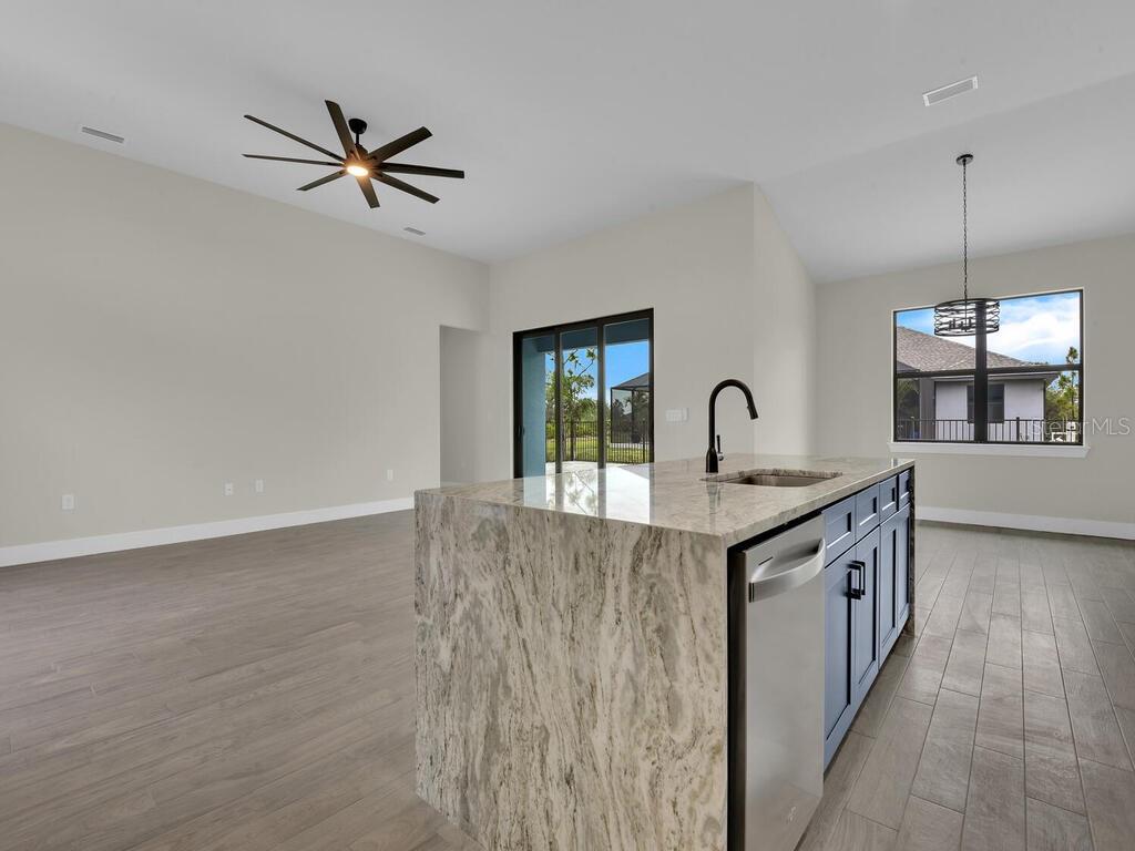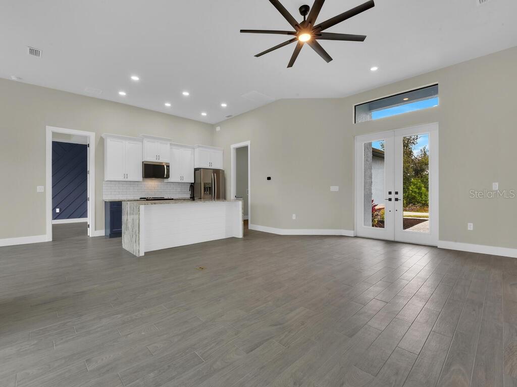 One or more photo(s) has been virtually staged. Under Construction. Discover the brand-new Custom Douglas Brooke Home featuring 4 bedrooms, 2 bathrooms, and a 3-car garage, complete with impact-resistant windows and doors. Spanning over 2000 square feet, this home is adorned with high-end finishes. Step through the impact-resistant glass double doors and into a spacious great room showcasing elegant dark wood-look tile, soaring ceilings, and sliding doors that lead to an expansive pool area. The kitchen boasts crisp white upper cabinets, striking navy lower cabinets, quartz countertops, and stainless-steel appliances. A large island separates the kitchen from the living space. Adjacent to the kitchen is a huge walk-in pantry and a sizable laundry room with a sink. The dining area, set behind the kitchen, features a vaulted ceiling. The master suite is a true retreat with walk-in closets and an ensuite bathroom with dual vanities and a walk-in glass shower. The home's guest wing offers three additional large bedrooms and a full bathroom. Completing this residence is a generous 3-car garage and a pool equipped with an alarm system. Additional features include in-wall pest control, pre-wiring for cable in the master and living rooms, smart home capabilities, and impact-rated windows and doors. Close to shopping, nightlife, boat ramps, hospitals, major airports and so much more! Photos are of Model Home and finishings may differ. Please see attachments. Rates as low as 3.99% for well qualified buyers with DBL Home Mortgage.