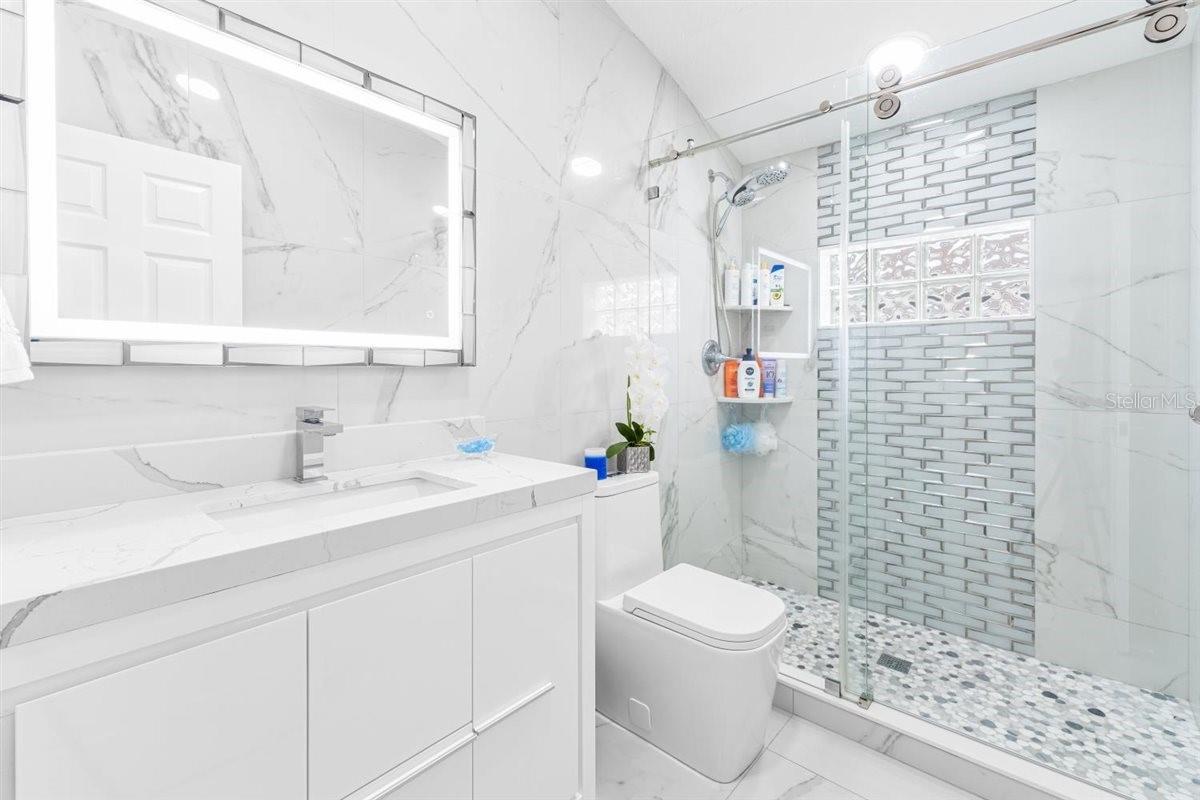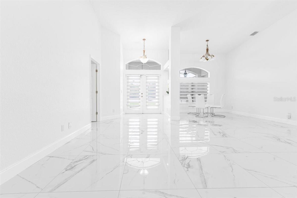 Spacious home on a DOUBLE LOT (approx. ½ acre) in Port Charlotte. Recently renovated 3bd/3ba with a saltwater, heated, screened pool (12×24), screened patio, new roof, updated lighting, pool heater/pump, and fresh interior paint. Open layout with vaulted ceilings, triple sliders to the patio, and a kitchen with stainless steel appliances, breakfast bar, and pantry. The master suite features dual walk-in closets, a garden tub, a walk-in shower, and access to the pool. Two guest rooms, inside laundry with deep sink, A/C-equipped 2-car garage that can be converted to a game or media room, security system, hurricane protection, shed, and a clean fenced yard. The property has dual road access, with a convenient rear entry that makes it perfect for added accessibility and flexibility.