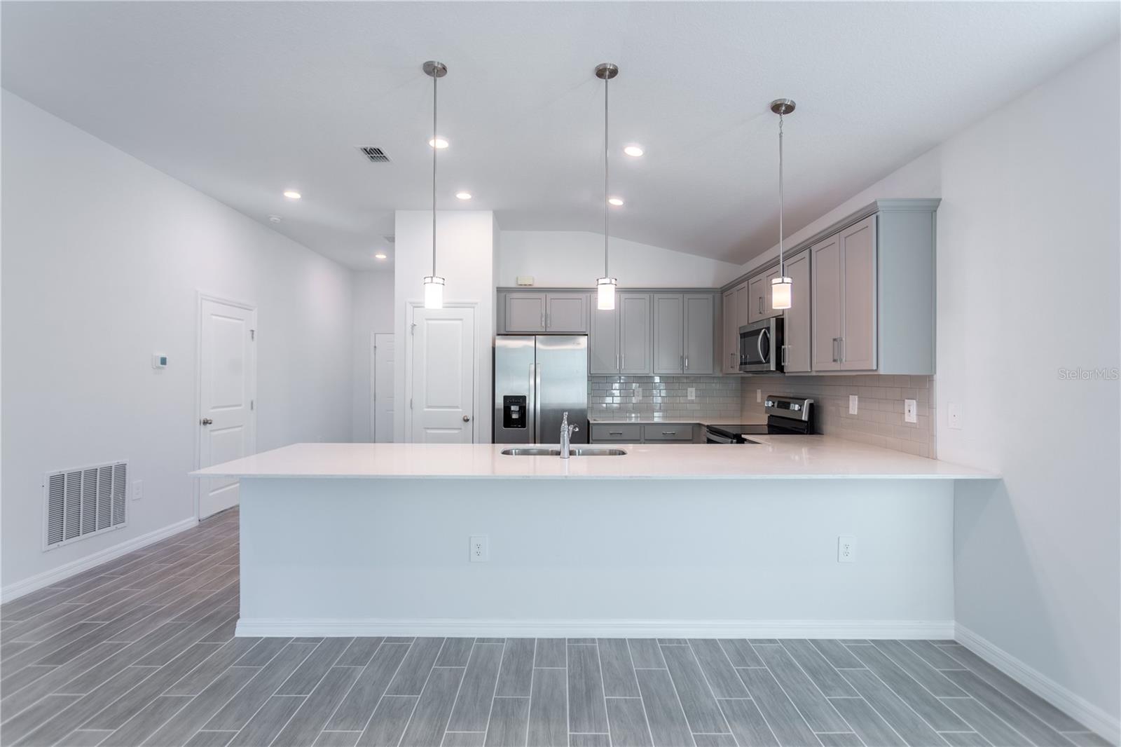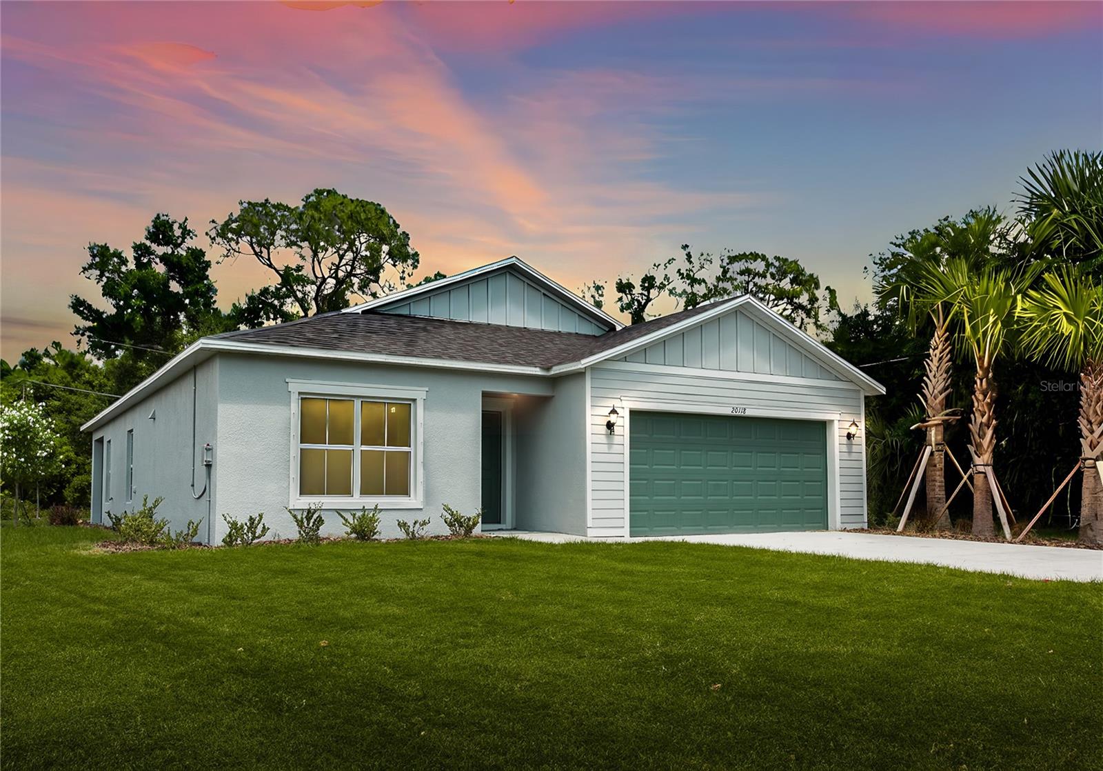 *NEW CONSTRUCTION, NO WAIT, MOVE-IN-READY!* Elevate your lifestyle with the opulence of the Sanibel floorplan presented by Carpenter Homes—a masterpiece within the Florida Living Series, certified by the Florida Green Building Coalition (FGBC). This residence features 4 bedrooms and 2 full bathrooms. This dream home is designed and built to immerse you in luxury! As you enter, a beautiful kitchen welcomes you, with an expansive, oversized bar that seamlessly flows into the living/dining area. The finesse of soft-close, Painted Shale 36" cabinets, SoHo 3x6 Halo Grey subway tile backsplash, and upgraded Blanco Matrix quartz countertops add a functional touch of luxury to the kitchen. Kitchen upgrades include a Moen Integra chrome kitchen faucet, garbage disposal, and sleek stainless steel energy efficient appliances. This home exudes sophistication with a vaulted ceiling that unveils a spacious lanai, creating an indoor-outdoor haven. Additionally, Carpenter Homes provides an upgraded brushed nickel lighting package including pendants over the kitchen bar, and vanity fixtures in both bathrooms, accenting the overall lighting design. Brushed pewter finish ceiling fans in each bedroom, as well as the great room, helps to circulate air flow and keep you cool in the Florida weather. Complimenting the expansive living area is Glen Arbor 6x26 ceramic plank flooring. The Owner's suite is a sanctuary of indulgence, showcasing dual sinks, tiled Magnisi 8x12 grey walls in the shower, and a generously sized walk-in closet! The home boasts Magnisi 8x12 grey upgraded tiled walls in in the second bath/shower, a Blanco Matrix quartz vanity top, and Moen Chateau chrome faucets and shower/tub trim kits. The ampleness of this home continues with a utility room, and additions such as energy-efficient R-4.1 insulation on concrete exterior walls, Taexx tubes for pest control, and fabric hurricane shutters for every window. The Florida friendly landscaped yard is complemented by an irrigation system with a rain sensor to help maximize efficiency! The expansive 2-car garage, complete with garage door opener and two remotes, not only provides ample space for your everyday needs but also ensures the utmost convenience and versatility for all your storage and parking requirements. Step into a world where extravagance meets eco-conscious living—your forever home awaits, a testament to timeless elegance and modern sustainability! Available to view any time!
