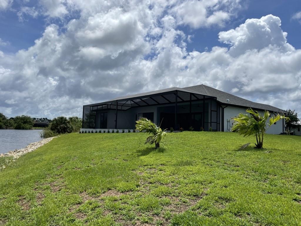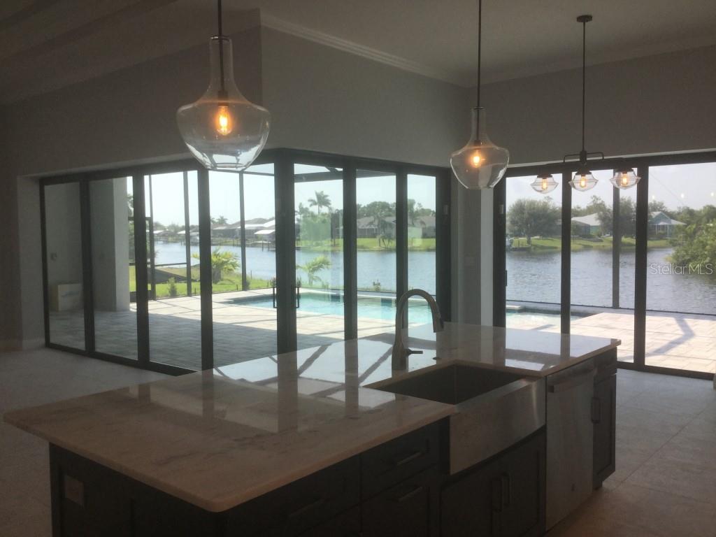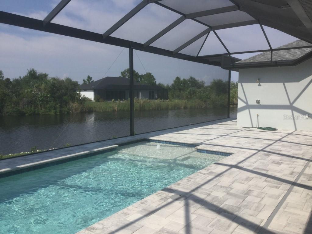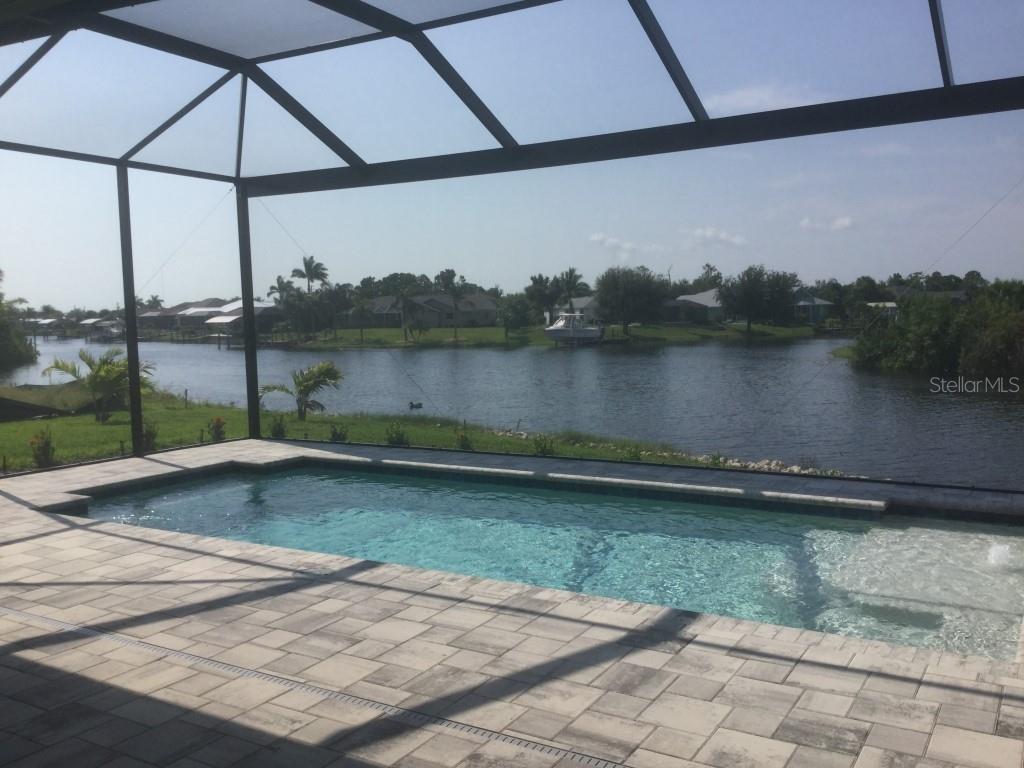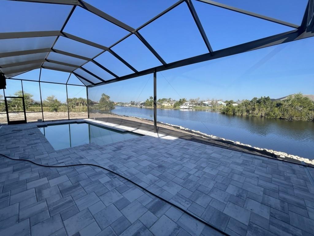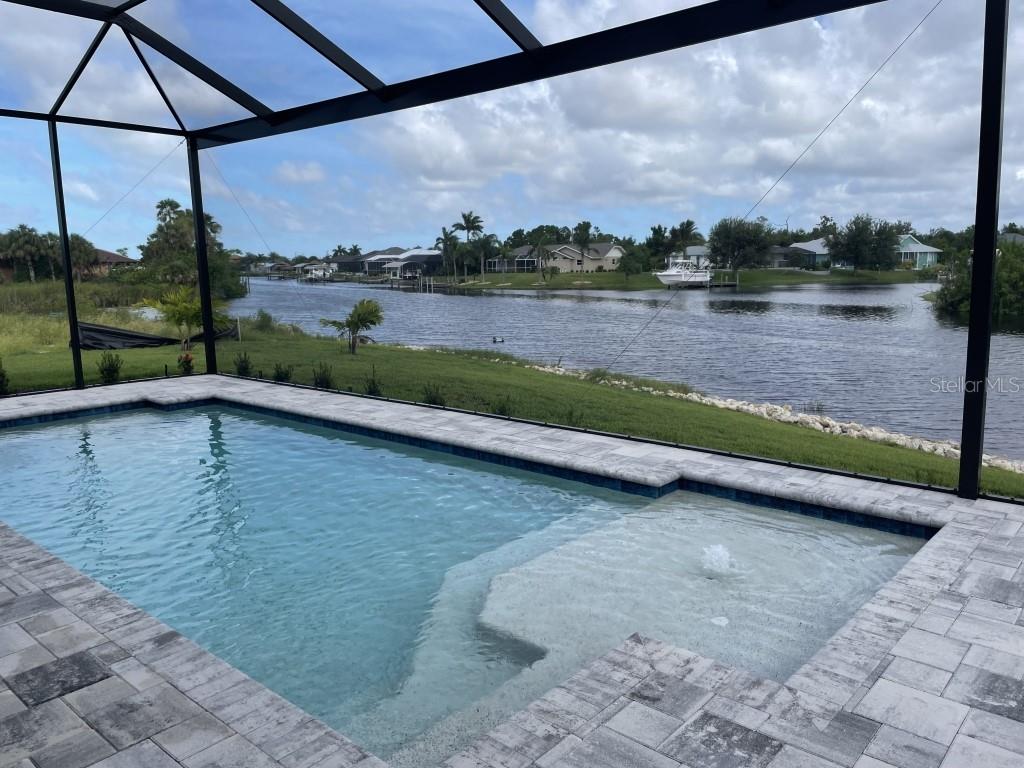 **NEW CONSTRUCTION **WATERFRONT** POOL HOME ** Custom built home with 3 bedrooms, den/office, 2 bathrooms and a 3 car garage with epoxy floor finish. The home is built on a oversized tip lot with magnificent water views of 4 intersecting canals and northwest exposure for great sunset viewing without blinding sun glare. The home is located in the upscale boating community of South Gulf Cove with access to Charlotte Harbor, Gulf of Mexico, Boca Grande and surrounding islands. Enjoy boating and fishing right from your very own backyard. This gorgeous home is for the distinguished buyer and features an open design floor plan with many upgrades. The gourmet kitchen is tastefully appointed with beautiful upgraded Dolomite countertops, (has the appearance of Marble, but harder and more durable) extra large island with breakfast bar, 42-inch upper cabinets with under cabinet lighting, stainless steel appliances, stunning cabinet hood vent, 36-inch cook top, built in oven/microwave unit, stainless steel farm sink, oversized pantry, large breakfast nook and more. Beautiful 24"X 24" Porcelain tile throughout the house with tray ceilings and crown molding in the living room, master bedroom, guest bedroom and den/office. The laundry room features a sink, wall cabinets, separate Dolomite folding counter and linen closet. Ceiling height in living room and kitchen is 11' 4", den/office 12'-4", bedrooms and laundry room area 9'-4". The home features Low E hurricane impact windows and doors, 0-degree sliders in the living room giving you an unobstructed view over the pool and waterway along with pocket sliders in the breakfast area, guest bedroom and master bedroom. All interior doors are 8' height swing doors or pocket doors (no bi-fold doors). Master suite features two large walk-in closets, linen closet, large vanity with double sink, six-foot free-standing tub, Dolomite countertops, a beautiful tiled walk-in shower with bench seat, a rain head and wall/handheld shower head. The home features energy efficient upgraded open cell foam insulation in the attic area, conditioned space for the air handler above the garage and foam insulation in the block walls. The home has upgraded wiring which includes interlock receptacle for generator,(just need to plug your generator in) receptacle for electric car, whole house surge protector, living room surround sound and lanai speakers. The lanai is very spacious featuring beautiful concrete pavers, outdoor shower, oversized pool with sun shelf, water bubbler feature, various color lighting schemes, bench seating and pool cage with picture frame viewing windows. Lanai area has been mechanically roughed for a summer kitchen including plumbing, electric, cable and venting for a grill. The home is professionally landscaped with St Augustine/floratam grass, planting beds, irrigation, riprap coral stone border along the water's edge, installed water and electric ready for future dock and a concrete paver driveway and walkways. South Gulf Cove community offers a public boat ramp, several parks and a nearby marina. Golf courses and world-class fishing are right out your back door. South Gulf Cove is only minutes to beautiful Southwest Florida beaches in Boca Grande and Manasota Key.