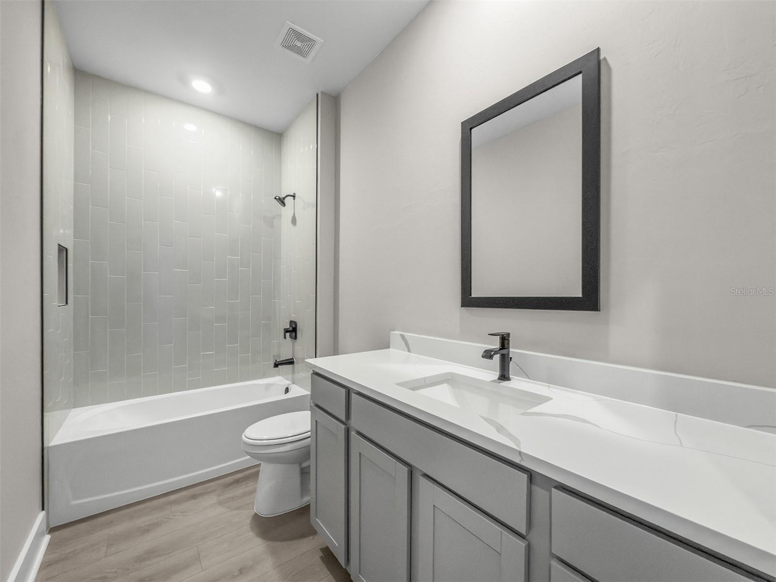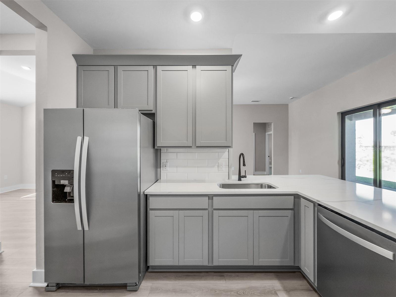 PRICE REDUCED. NO FLOOD PREMIUM REQUIRED!! MOVE IN READY! This new construction home boasts 4 spacious bedrooms, 2 full bathrooms, and an abundance of living space, complemented by tens of thousands of dollars in luxurious upgrades throughout. Experience peace of mind with low-emissivity hurricane impact windows and doors, and enjoy a suite of premium stainless-steel Whirlpool® appliances, including a refrigerator with an ice maker. The chef-inspired kitchen with adjacent breakfast nook, is highlighted by expansive quartz countertops, 42” upper solid wood cabinets with crown molding, an undermount sink, and Moen® faucets, blending style and functionality seamlessly. Additional features include a two-car garage with a Wi-Fi-enabled garage door opener for ultimate convenience. The master suite serves as a private retreat, complete with a spacious walk-in closet and a double-sink vanity. Outside, the generous covered back porch offers the perfect space for making lasting memories while enjoying Florida's outdoor lifestyle.