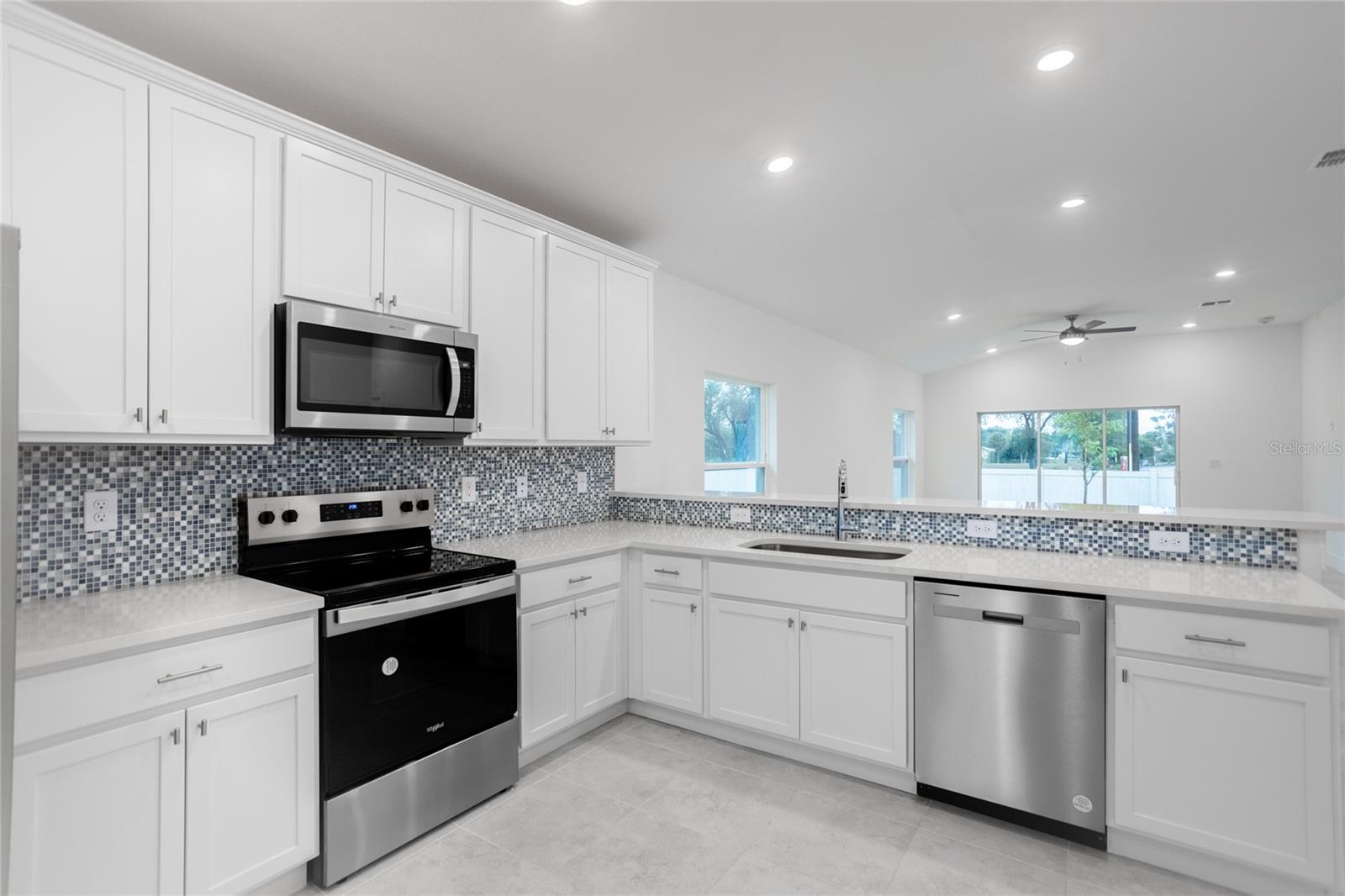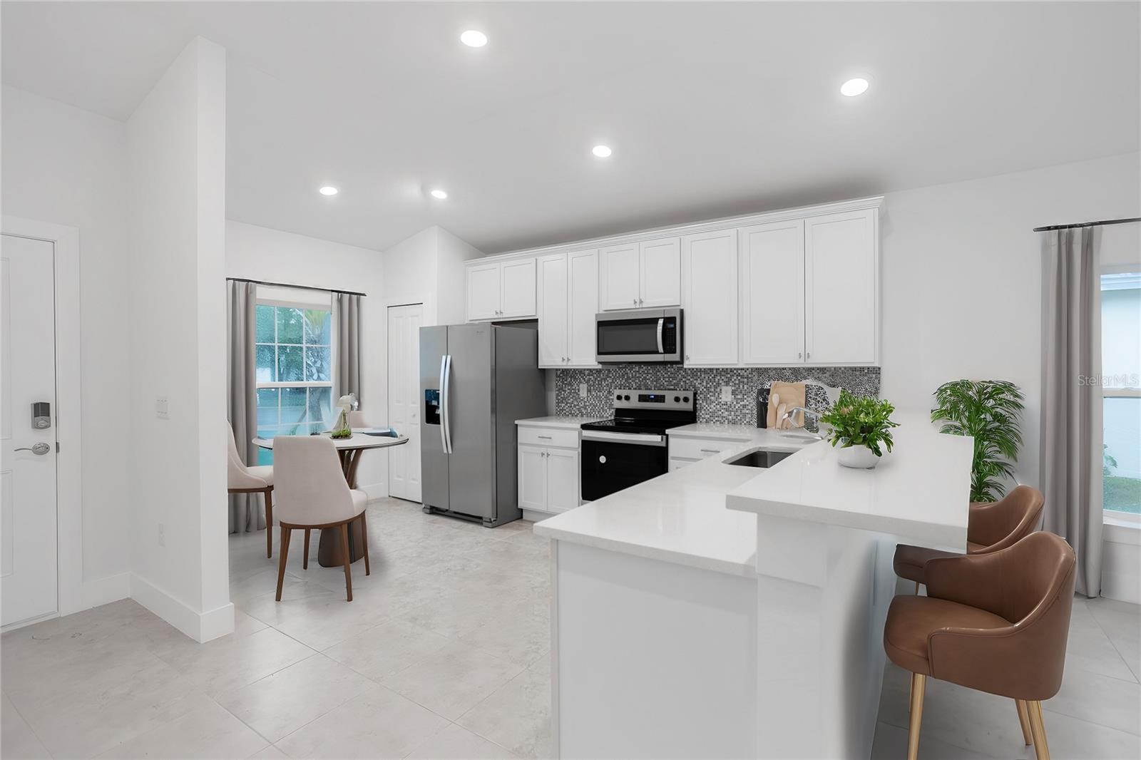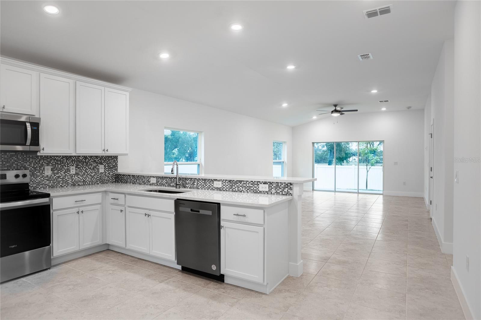***NEW CONSTRUCTION, MOVE-IN READY!*** Elevate your lifestyle with the opulence of the Anna Maria floorplan presented by Carpenter Homes—a masterpiece within the Florida Living Series, certified by the Florida Green Building Coalition (FGBC). This home features 3 bedrooms and 2 full bathrooms. This dream home is designed and built to immerse you in luxury. As you enter, a beautiful kitchen welcomes you with an expansive, oversized island that seamlessly flows into the living and dining area. The finesse of soft-close, Shaker 42" cabinets, upgraded Fresh Linens 3CM quartz countertops, and Bliss Glass/Stone Mosaic Tile kitchen backsplash add a functional touch of luxury to the kitchen. Kitchen upgrades include a Moen Sleek chrome kitchen faucet, garbage disposal, and sleek stainless steel energy efficient appliances. This home exudes sophistication with a vaulted ceiling and 3 panel 9 foot sliding glass doors! Additionally, Carpenter Homes provides an upgraded brushed nickel lighting package and a vanity fixture in 2nd bathroom, accenting the overall lighting design. Each bedroom and the great room feature 52" brushed nickel ceiling fans, complemented by an upgraded SEER2 HVAC system to keep you cool and comfortable in the Florida weather. Complimenting the expansive living area is Magnisi 18"x18" white ceramic tile flooring. The Owner's suite offers a luxurious retreat, featuring a shower adorned with 4x16” Anatolia Soho white tiles, complemented by Anatolia Zen Flat Pebble vertical listello accents, and a spacious walk-in closet. The Owner's bathroom features a striking 72x36” contemporary mirror with front and back LED lighting, anti-fog technology, and customizable color settings with a dimmer for the ultimate in modern sophistication. The home boasts Magnisi white 8x12” upgraded tiled walls in the second bath/shower, 3CM quartz vanity tops, and Moen Genta LX chrome faucets. The ampleness of this home continues with a utility room, and thoughtful additions such as energy-efficient R-4.1 insulation on concrete exterior walls, Taexx tubes for pest control, and fabric hurricane shutters for every window. The Florida friendly landscaped yard is complemented by an irrigation system with rain sensor to help maximize efficiency. This secure community not only enhances the outdoor space's sophistication but also creates an ideal setting for a range of family activities, turning the backyard into a retreat for intimate family gatherings and treasured moments. The expansive 2-car garage, complete with garage door opener and two remotes, not only provides ample space for your everyday needs but also ensures the utmost convenience and versatility for all your storage and parking requirements. Step into a world where extravagance meets eco-conscious living—your forever home awaits, a testament to timeless elegance and modern sustainability. COMMUNITY: Residents enjoy members-only access to the Oak Hollow Recreation Center which includes an exercise room, table tennis, heated swimming pool (no lifeguard), children's playground, tennis court, pickleball, bocce ball court, horseshoes, corn-hole, billiards room, basketball court, picnic tables shaded by beautiful old oak trees, and a lending library. Residents also enjoy a vibrant social calendar filled with community events year-round! Available to view anytime!