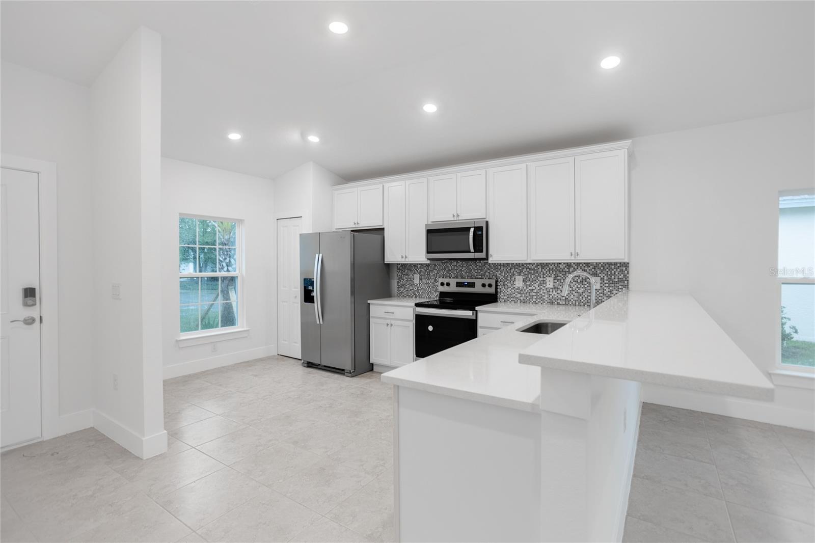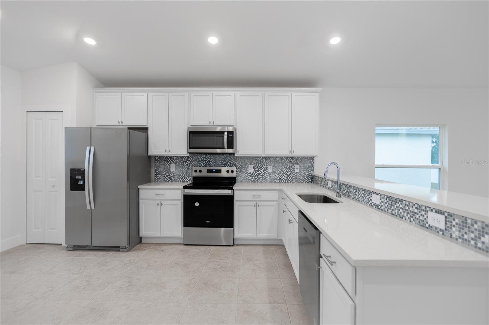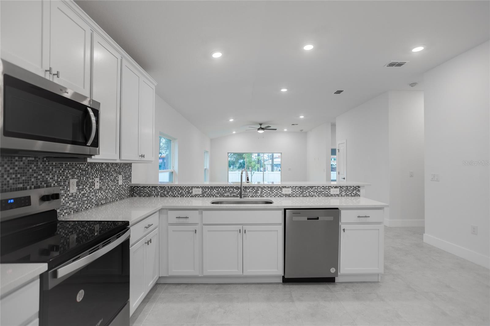 ***NEW CONSTRUCTION, MOVE-IN READY!*** Elevate your lifestyle with the opulence of the Anna Maria floorplan presented by Carpenter Homes—a masterpiece within the Florida Living Series, certified by the Florida Green Building Coalition (FGBC). This home features 3 bedrooms and 2 full bathrooms. This dream home is designed and built to immerse you in luxury. As you enter, a beautiful kitchen welcomes you with an expansive, oversized island that seamlessly flows into the living and dining area. The finesse of soft-close, Shaker 42" cabinets, upgraded Fresh Linens 3CM quartz countertops, and Bliss Glass/Stone Mosaic Tile kitchen backsplash add a functional touch of luxury to the kitchen. Kitchen upgrades include a Moen Sleek chrome kitchen faucet, garbage disposal, and sleek stainless steel energy efficient appliances. This home exudes sophistication with a vaulted ceiling and 3 panel 9 foot sliding glass doors! Additionally, Carpenter Homes provides an upgraded brushed nickel lighting package and a vanity fixture in 2nd bathroom, accenting the overall lighting design. Each bedroom and the great room feature 52" brushed nickel ceiling fans, complemented by an upgraded SEER2 HVAC system to keep you cool and comfortable in the Florida weather. Complimenting the expansive living area is Magnisi 18"x18" white ceramic tile flooring. The Owner's suite offers a luxurious retreat, featuring a shower adorned with 4x16” Anatolia Soho white tiles, complemented by Anatolia Zen Flat Pebble vertical listello accents, and a spacious walk-in closet. The Owner's bathroom features a striking 72x36” contemporary mirror with front and back LED lighting, anti-fog technology, and customizable color settings with a dimmer for the ultimate in modern sophistication. The home boasts Magnisi white 8x12” upgraded tiled walls in the second bath/shower, 3CM quartz vanity tops, and Moen Genta LX chrome faucets. The ampleness of this home continues with a utility room, and thoughtful additions such as energy-efficient R-4.1 insulation on concrete exterior walls, Taexx tubes for pest control, and fabric hurricane shutters for every window. The Florida friendly landscaped yard is complemented by an irrigation system with rain sensor to help maximize efficiency. This secure community not only enhances the outdoor space's sophistication but also creates an ideal setting for a range of family activities, turning the backyard into a retreat for intimate family gatherings and treasured moments. The expansive 2-car garage, complete with garage door opener and two remotes, not only provides ample space for your everyday needs but also ensures the utmost convenience and versatility for all your storage and parking requirements. Step into a world where extravagance meets eco-conscious living—your forever home awaits, a testament to timeless elegance and modern sustainability. COMMUNITY: Residents enjoy members-only access to the Oak Hollow Recreation Center which includes an exercise room, table tennis, heated swimming pool (no lifeguard), children's playground, tennis court, pickleball, bocce ball court, horseshoes, corn-hole, billiards room, basketball court, picnic tables shaded by beautiful old oak trees, and a lending library. Residents also enjoy a vibrant social calendar filled with community events year-round! Available to view anytime!