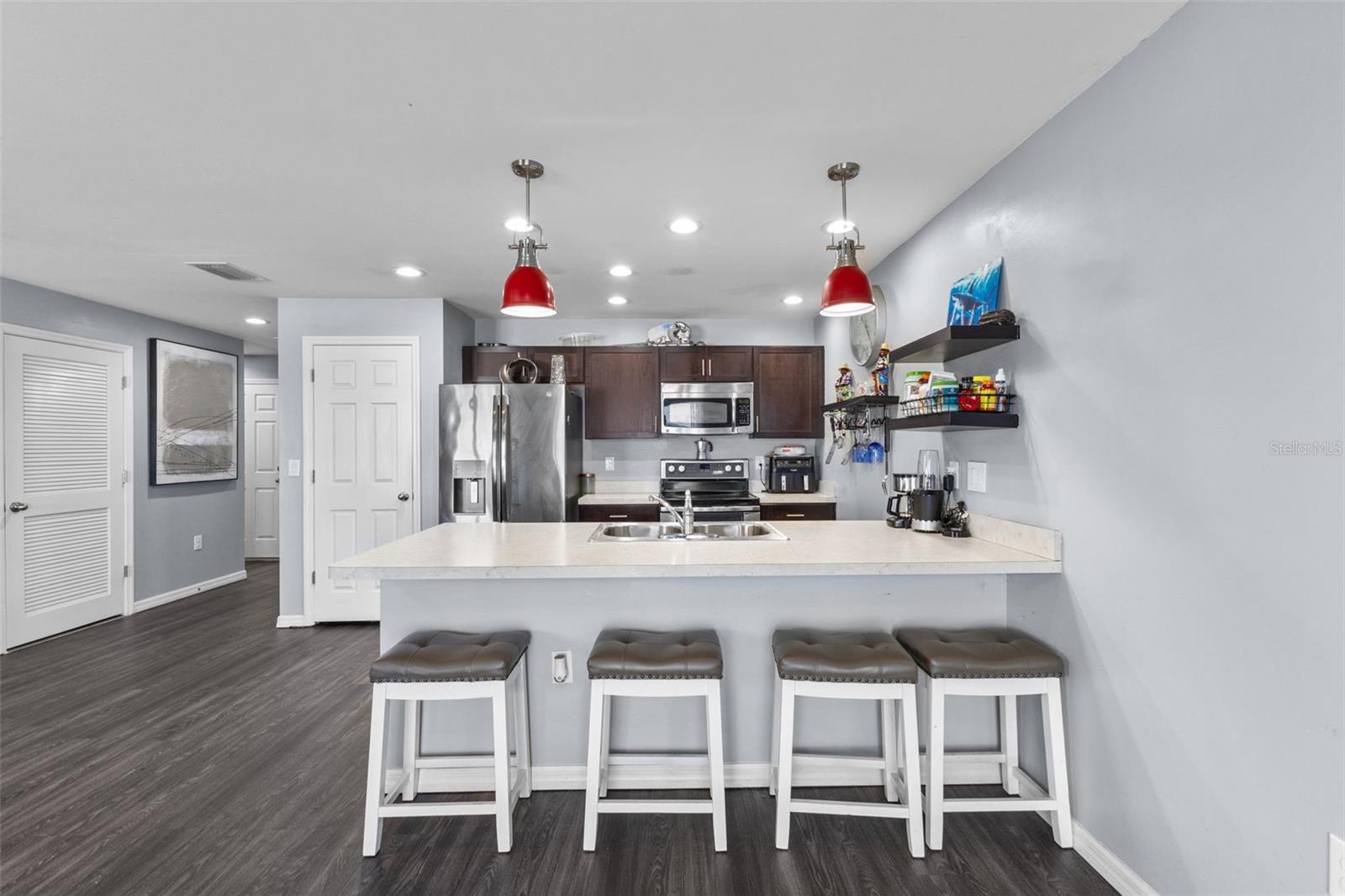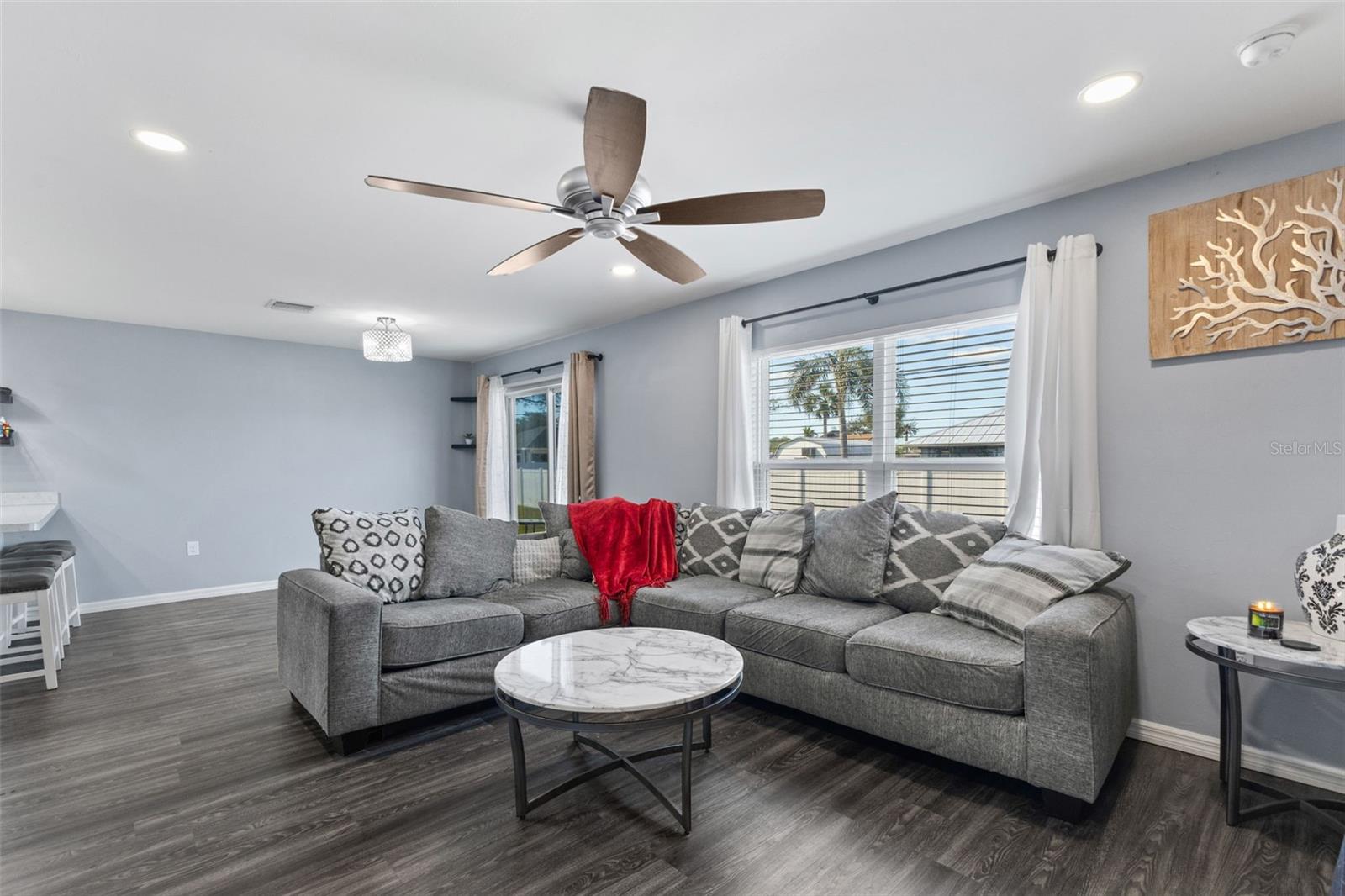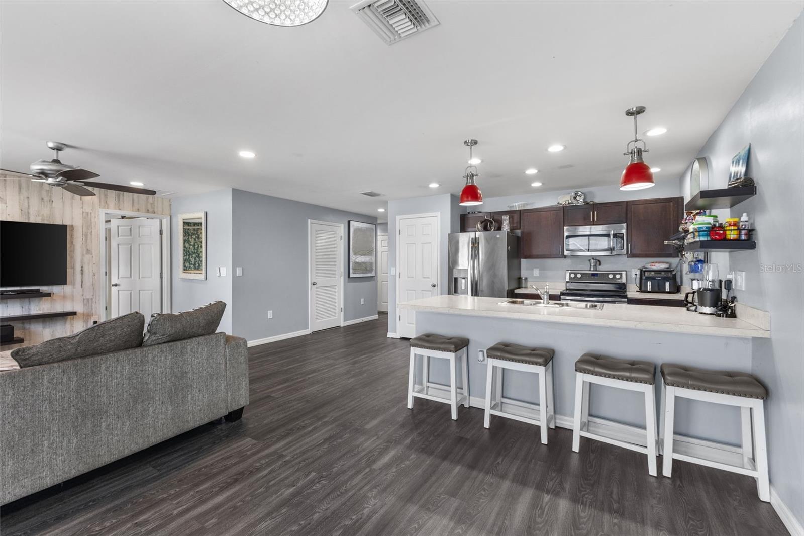 The Peachland area of Port Charlotte combines convenience, affordability and access to the best parts of Southwest Florida living! And that's where you'll find this gem in a laid back, peaceful and highly sought after neighborhood. The home was designed with an open floor plan. The master bedroom features a private ensuite, through a modernized sliding barn door, with walk-in shower and large walk-in closet. There are 2 additional bedrooms and separate full bath. The fourth bedroom can be utilized as a den, office, playroom or its current use, mancave! Indoor laundry. The kitchen features stainless steel appliances, large breakfast bar and pantry. Flooring is newer luxury vinyl throughout, except guest bath, which is tile. The living area has an attractive accent wall. All furniture is negotiable. NOT IN FLOOD ZONE!!