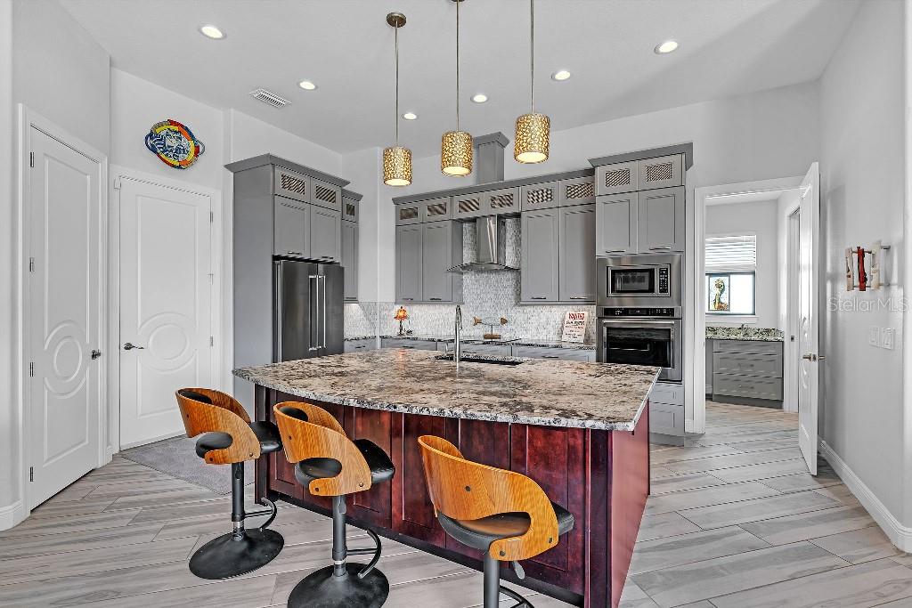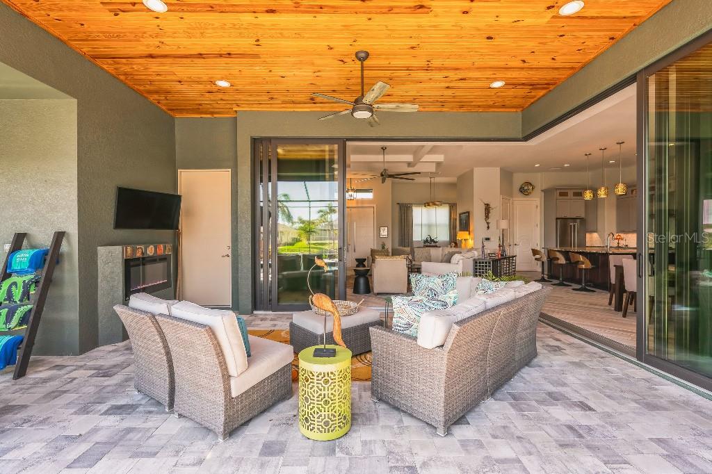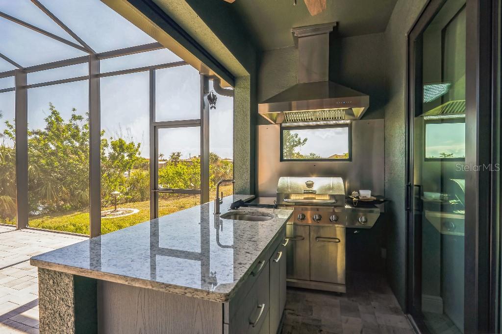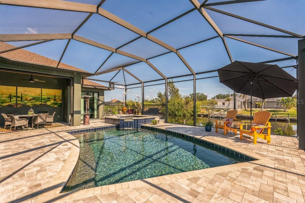 Experience the epitome of luxury living in this exceptional, custom built 2019 waterfront pool home in South Gulf Cove. This contemporary 3-bedroom, 2- bathroom plus a bonus room home seamlessly blends indoor and outdoor living. Upon entering the house, the open-plan living space boasts 12’ coffered ceilings with two walls of 10’, zero-corner glass sliders that open to the 20’x12’ covered lanai and 13’x10’ covered dining space. It features an outdoor fireplace, tongue and groove ceiling finish and soffit lighting. The chef’s kitchen is enhanced with 58” custom cabinetry, an oversized granite island, upgraded tile backsplash and Bosch induction cooktop. The master suite is a sanctuary with lighted 10’ coffered ceilings and large sliding doors leading to the pool area. The master bath has large double vanities and walk-thru shower. The 13’x9’ walk-in closet has custom closet organizers with doors to provide ample storage and organization. The enclosed pool space includes a 19’x16’ heated salt water pool with upgraded pool finish and waterfall spa. The outdoor kitchen allows for easy entertaining with grill, marine grade cabinet with granite countertop, sink and grill hood. The lanai area has been extended 5’ with an approved lot variance putting you that much closer to the waterway. The backyard features a 30’x10’ composite dock with water and electric on site and an 80’ concrete seawall. The house is storm protected with roll down Kevelar screening that provides protection for your furnishings from inclement weather and allows for privacy. The garage features a mini-split air conditioned 11’x13’ workspace that can be used as a workshop or art studio. The InReach brand power lifts allow for ceiling storage without the need to climb a ladder and the ADA compliant ramp provides for effortless access to the home. The beautiful landscaping includes an enclosed canal irrigation pump with the option to use city water. With no detail overlooked, this move-in ready home has the perfect balance of luxury, entertaining space and security in an unbeatable location. Call today to schedule your private showing and start living the Florida lifestyle you have been looking for.
