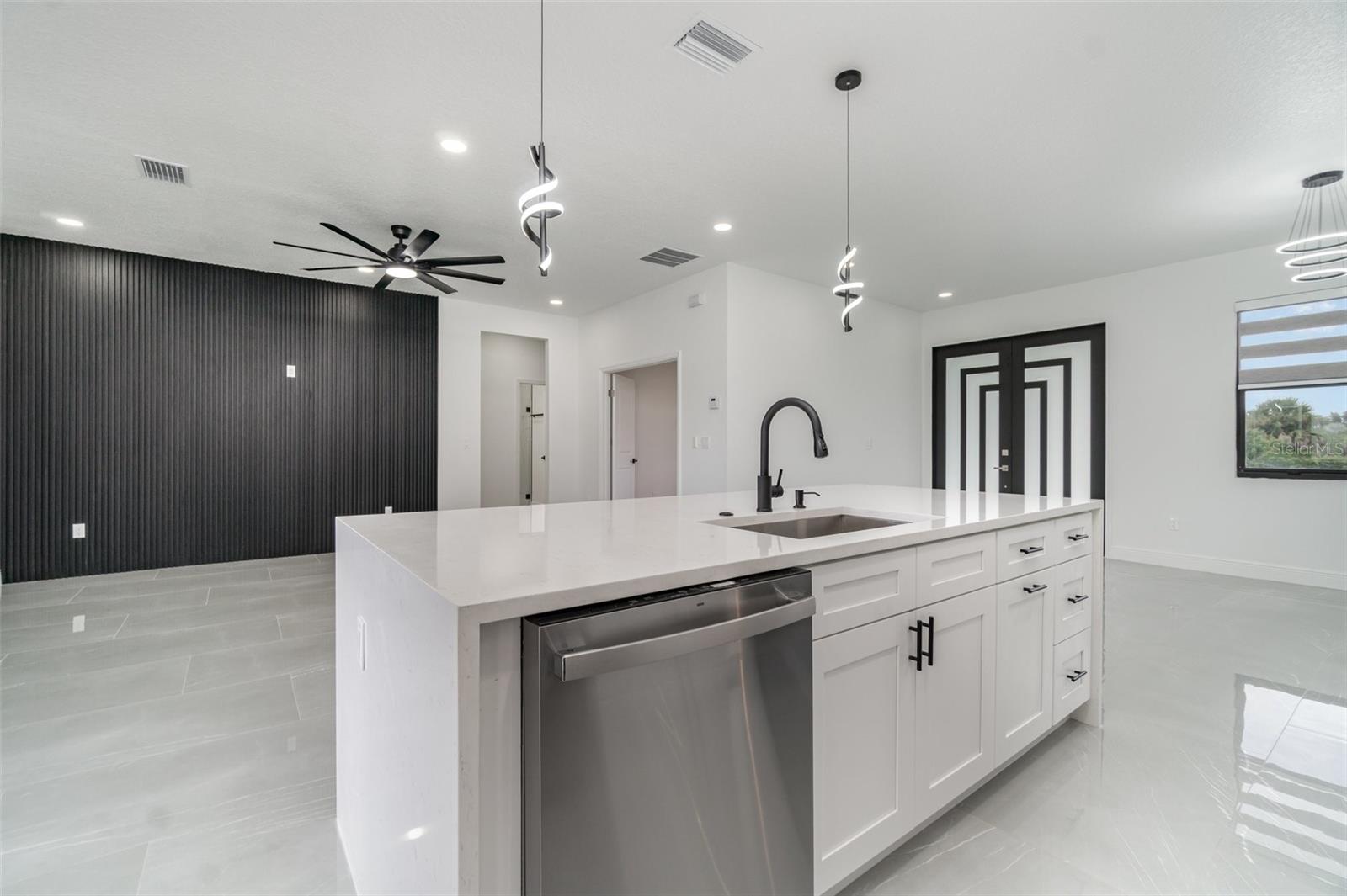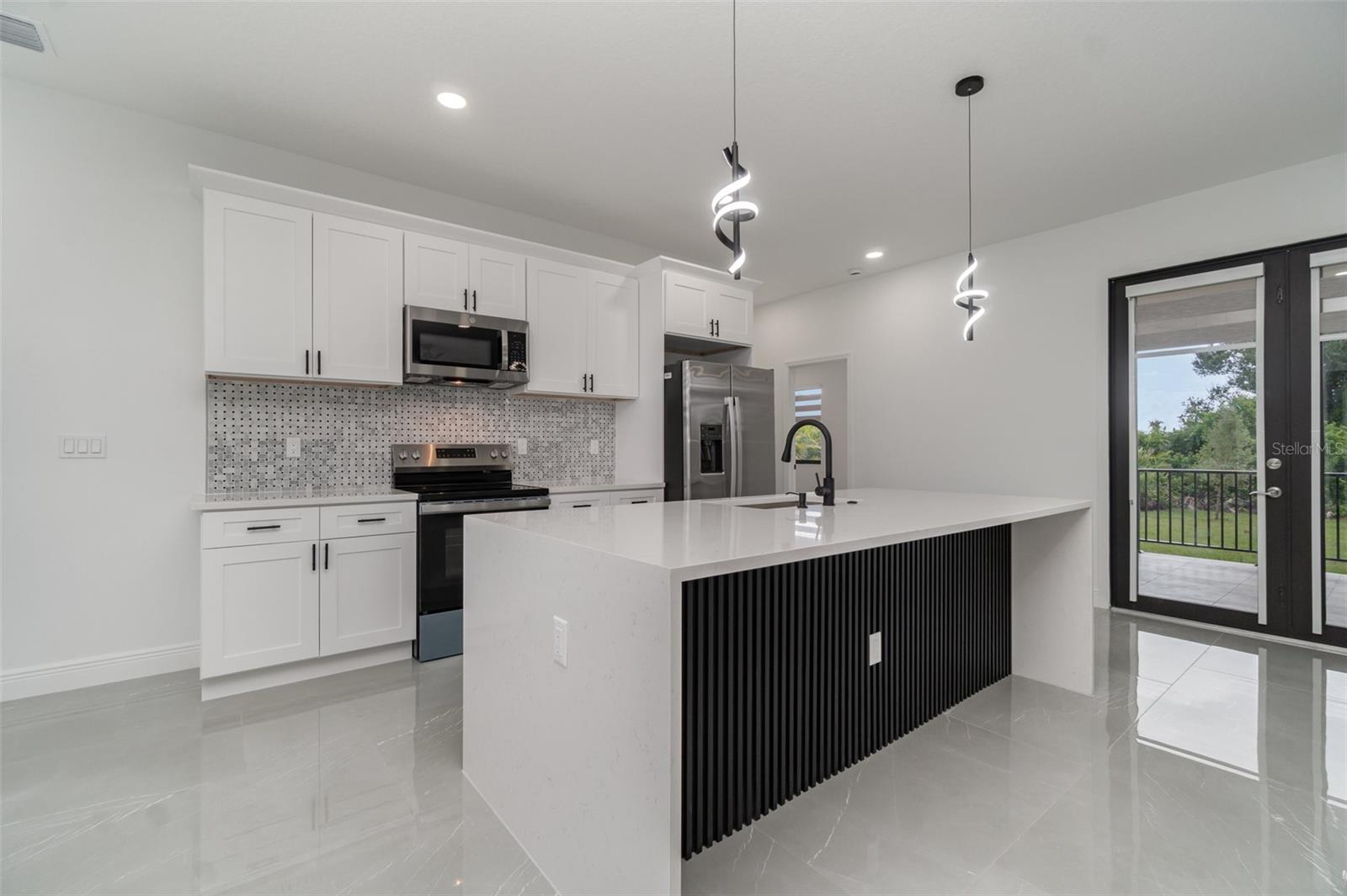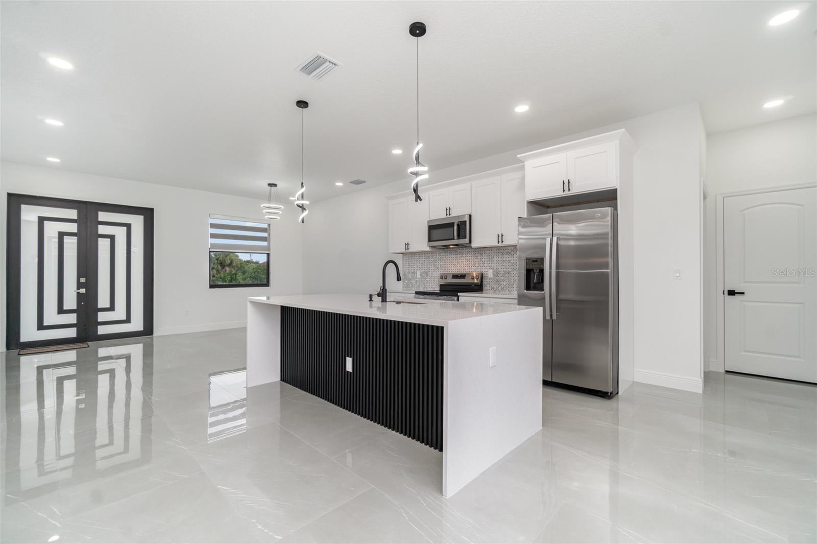 PRICE REDUCED! Owner Will Assist with Buyer's Closing Costs. New construction in South Gulf Cove with clean, modern lines and seamless indoor-outdoor living. Single-story 3BR + office / 2BA / 2-car garage. Open concept with large-format porcelain tile throughout, striking frosted-glass double entry, slat accent wall and designer lighting. Show-stopping kitchen features an XL waterfall quartz island, shaker cabinetry, mosaic backsplash, stainless appliances and fixtures. Owner’s suite has dual vanities, frameless glass shower and a freestanding soaking tub. Bright secondary bedrooms with modern fans and zebra shades. Generous laundry room with sink and cabinets. Relax on the covered lanai with wet bar overlooking the backyard—perfect for grilling and entertaining. Minutes to Gasparilla Rd/FL-776, marinas, beaches and golf. Move-in ready and easy to show.