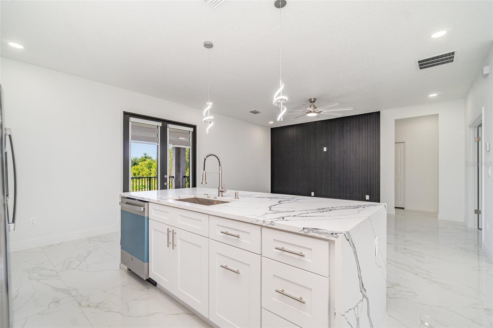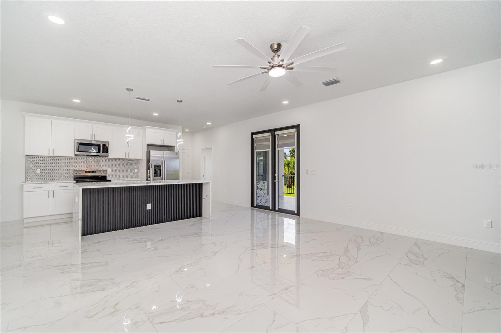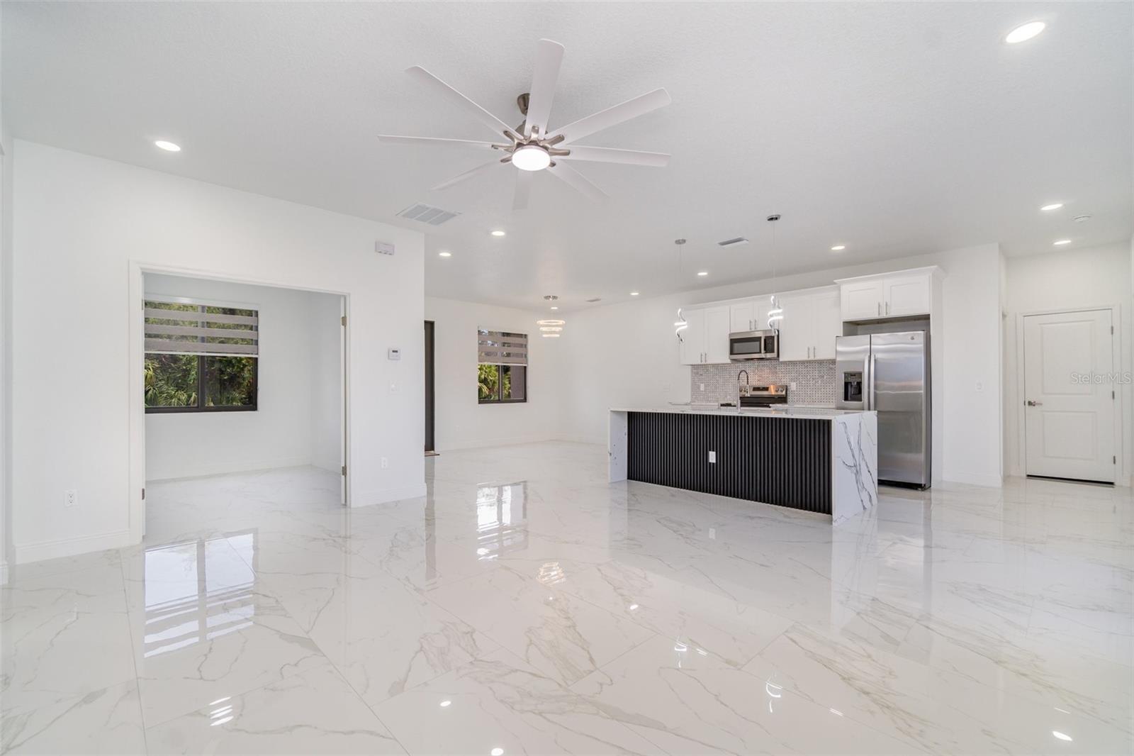 PRICE REDUCED! Owner Will Assist with Buyer's Closing Costs. New construction in South Gulf Cove with clean, modern lines and seamless indoor-outdoor living. Single-story 3BR + office / 2BA / 2-car garage. Open concept with large-format porcelain tile throughout, striking frosted-glass double entry, slat accent wall and designer lighting. Show-stopping kitchen features an XL waterfall quartz island, shaker cabinetry, mosaic backsplash, stainless appliances and fixtures. Owner’s suite has dual vanities, frameless glass shower and a freestanding soaking tub. Bright secondary bedrooms with modern fans and zebra shades. Generous laundry room with sink and cabinets. Relax on the covered lanai with wet bar overlooking the backyard, perfect for grilling and entertaining. Minutes to Gasparilla Rd/FL-776, marinas, beaches and golf. Move-in ready and easy to show.