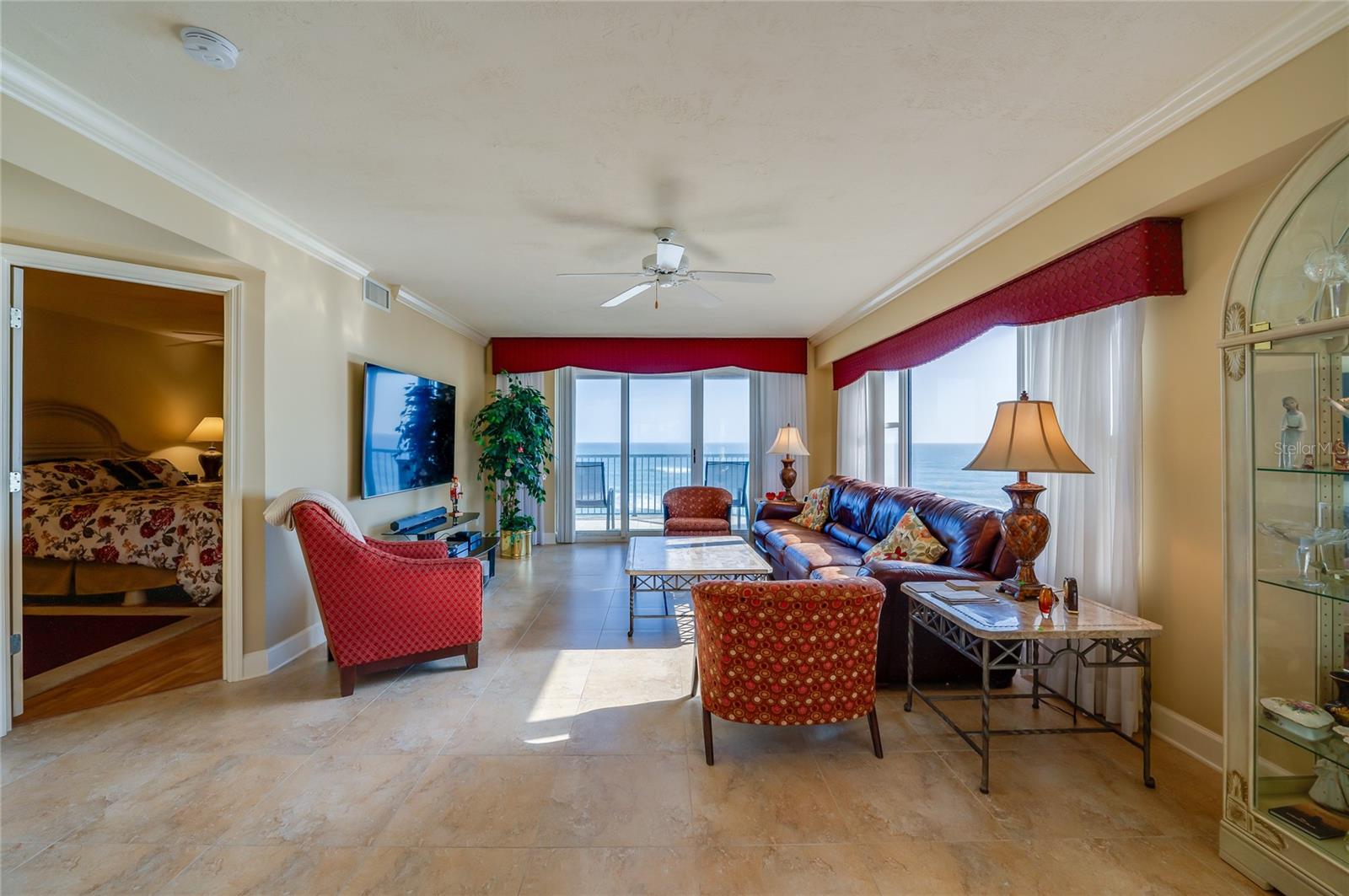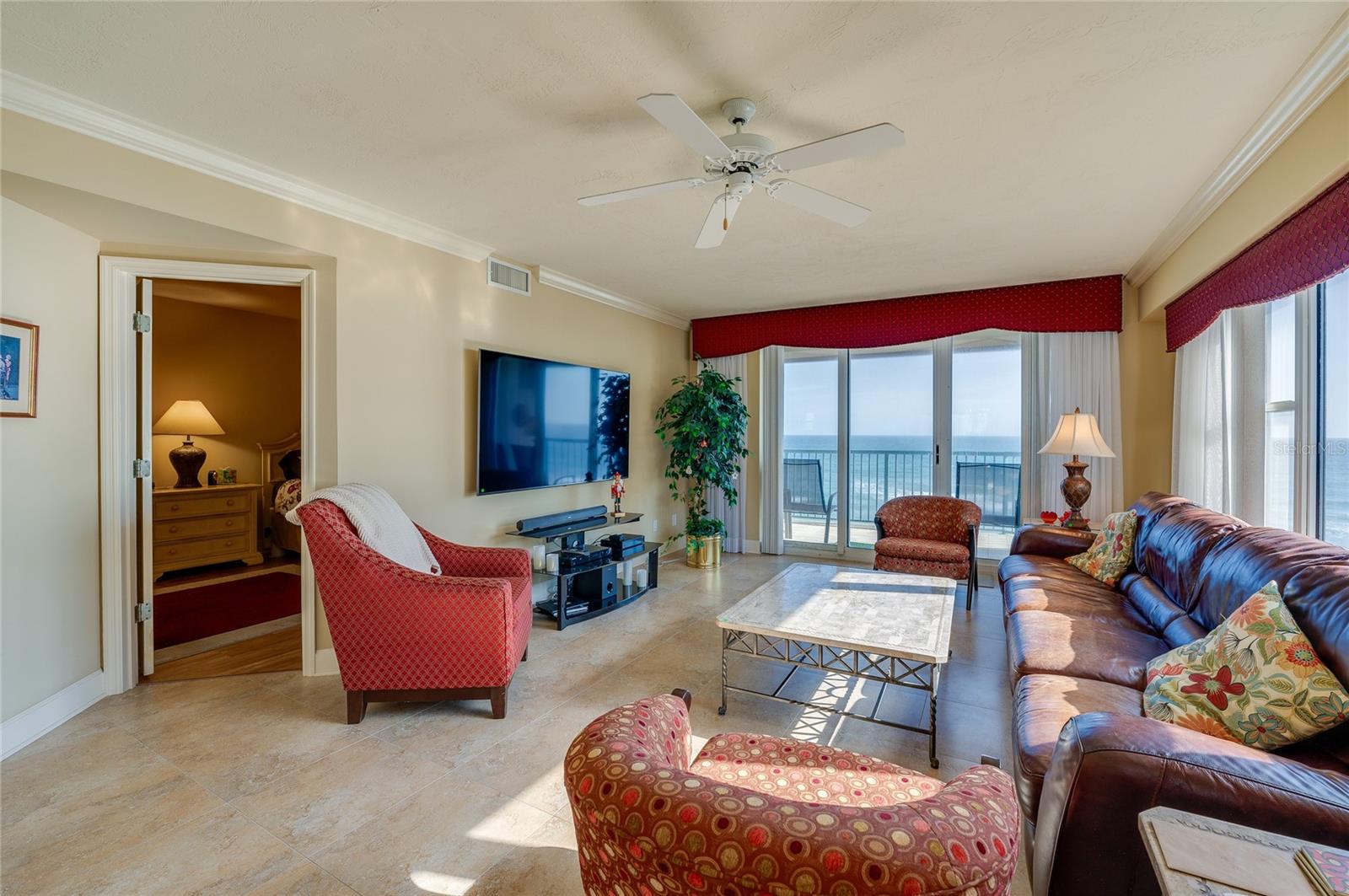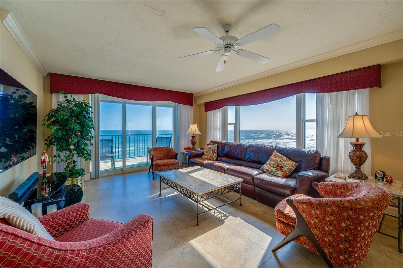 One or more photo(s) has been virtually staged. Seize this incredible opportunity with a highly sought-after 3-bedroom, 3-bathroom direct oceanfront corner unit in Ponce Inlet, FL. Nestled on the exclusive No Drive Beach, this home offers breathtaking views and unmatched luxury. Recently remodeled, this condo showcases tasteful upgrades throughout. Porcelain floors ensure both elegance and ease of maintenance, complemented by hurricane shutters on all windows and sliders for added peace of mind. The glass-enclosed lanai-bar area is perfect for entertaining or simply enjoying the serene surroundings. The kitchen and bar feature GE Profile stainless appliances, including a wine fridge, catering to every chef's needs. Large windows in the living, dining, and guest bedrooms with panoramic ocean views, while the living room and master suite open onto an expansive oceanfront balcony ideal for soaking in the sun and sea breeze. Plus, witness spectacular rocket launches from Cape Canaveral right from your balcony. The master suite boasts a spacious walk-in closet and an updated master bath with a luxurious walk-in shower and jacuzzi tub. Enjoy resort-style amenities such as three heated pools with jacuzzies, a fitness center, clubroom, tennis/pickleball courts, secure underground parking with EV charging, and 24/7 security. With direct beach access, indulge in endless days of sun, sand, and surf. Don't let this unparalleled coastal paradise slip away!"