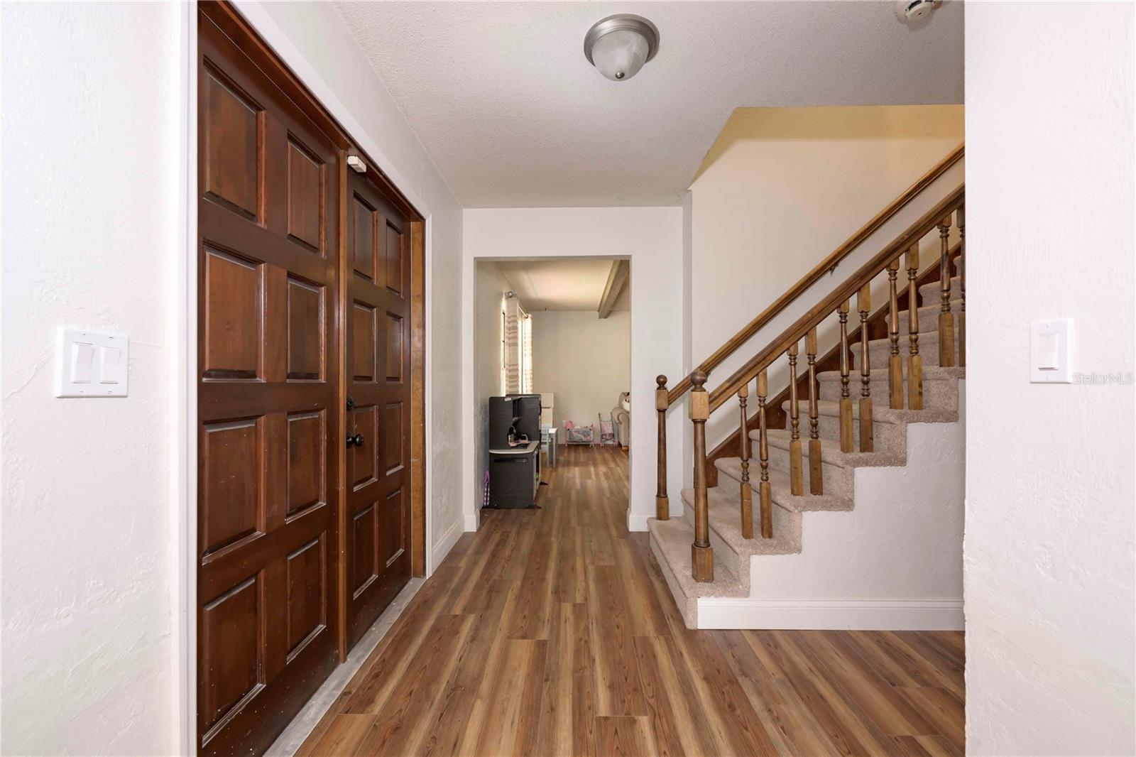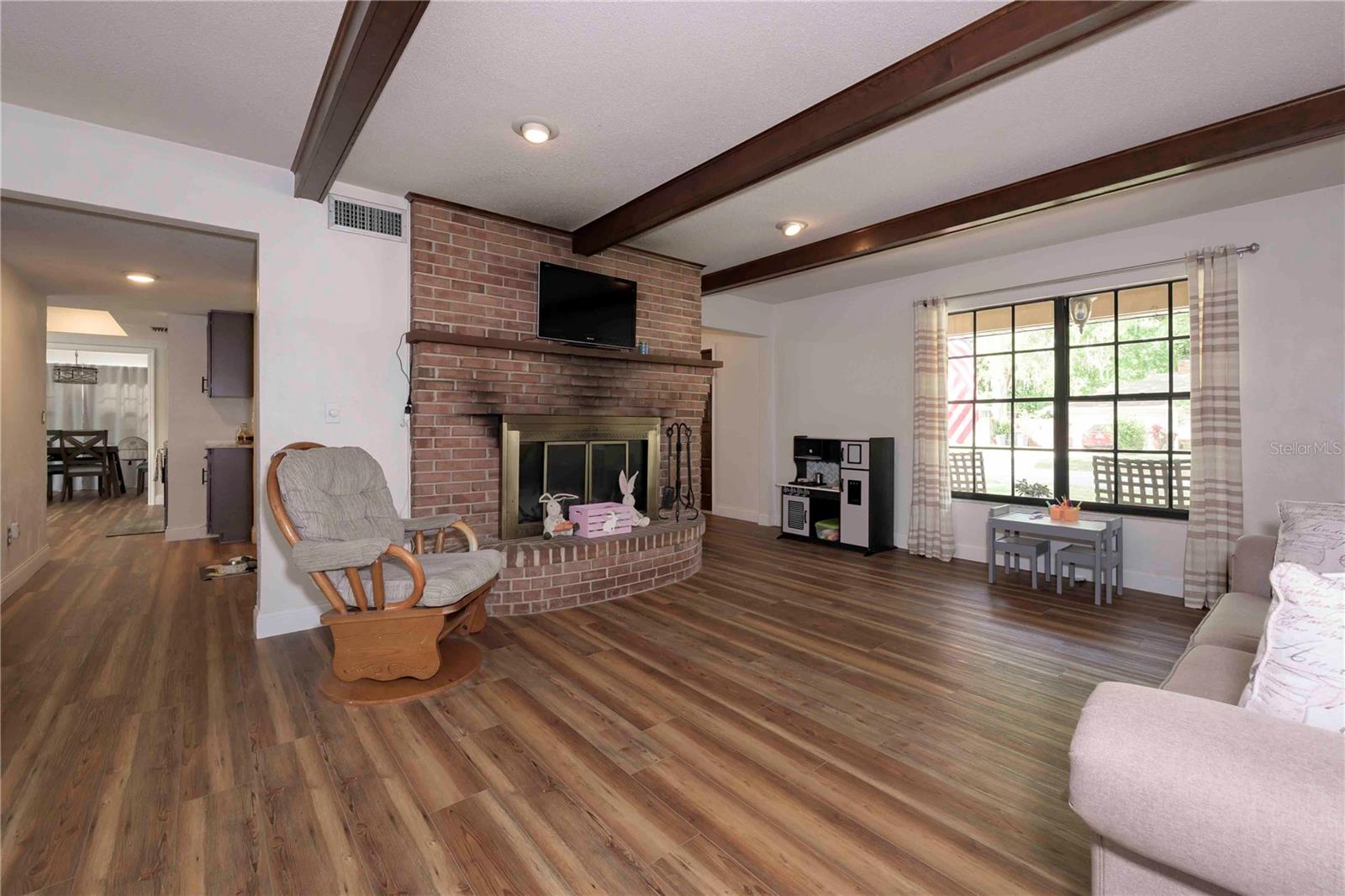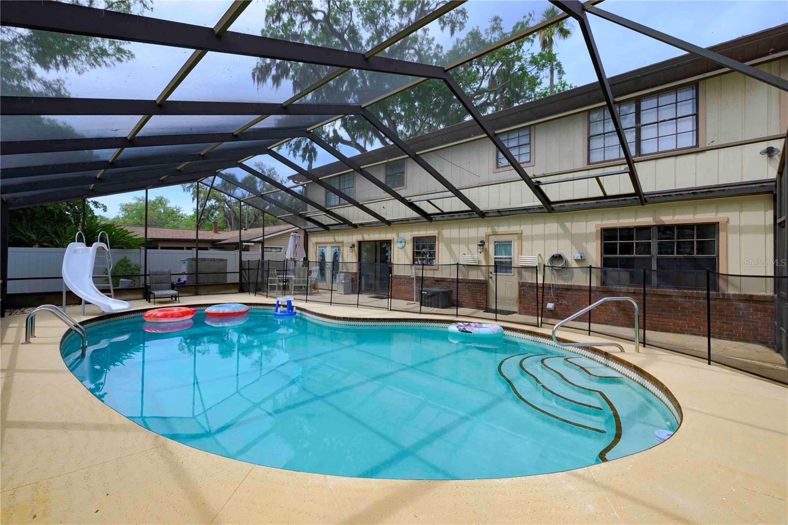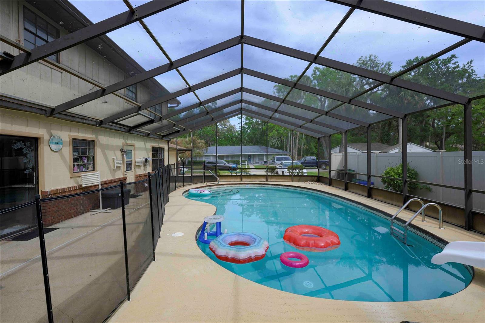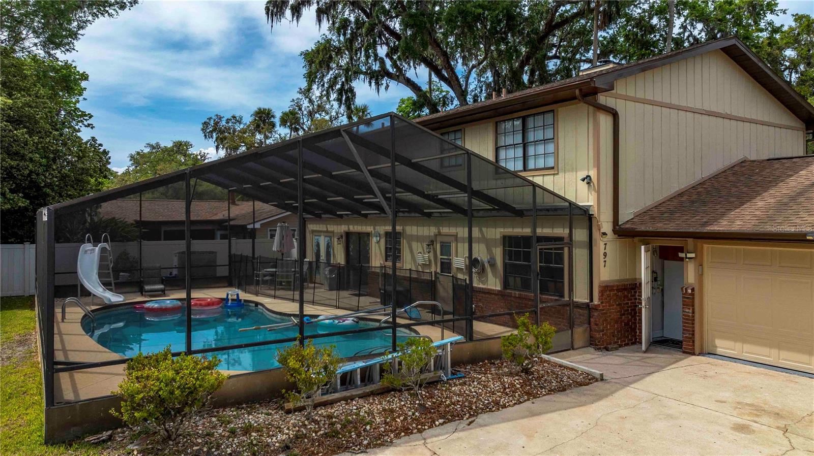 Elegant Custom-Built home in Coveted Port Orange Neighborhood. Timeless charm and modern convenience in this beautifully maintained center hall colonial, custom-built by its original owner. This spacious home offers a perfect blend of comfort, functionality, and style. Step through grand double wood doors into a welcoming foyer. The sunken living room is filled with natural light, while the cozy den features a stunning masonry brick wood-burning fireplace. Newly renovated kitchen boasts granite countertops, stainless steel appliances, and a brand-new range with a built-in air fryer. The formal dining room, with its elegant etched French doors, opens to a private patio and an enclosed pool complete with a slide, making it perfect for entertaining. Bonus room on the first floor is ideal for a home office or flex space. Upstairs, the primary en-suite is oversized, complete with sitting area. Three additional bedrooms, all with brand-new carpeting, and a full bathroom. lots of storage. Pool has access to guest bathroom. Mature Landscaping. Key Features & Updates: Freshly painted interior & exterior. Brand-new hot water heater. Newer 2 zoned A/C units (2023 & 2019) Newer roof (2018). Large 17,590-gallon pool with a new filter pump (2024) Rescreened CFI pool cage. Oversized garage with new epoxy-coated flooring and plenty of built in storage. This stunning home is move-in ready and waiting for its next owner! All information in the MLS is intended to be accurate but cannot be guaranteed. Chandelier in dining room does not convey.
